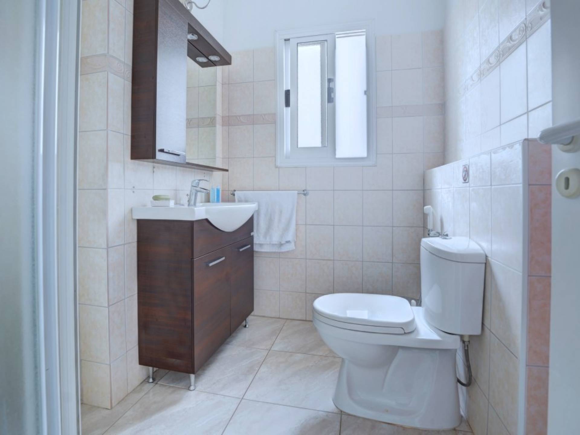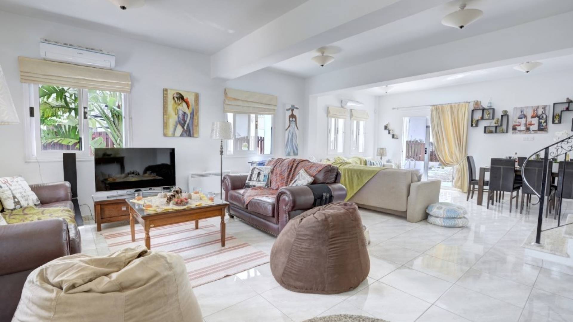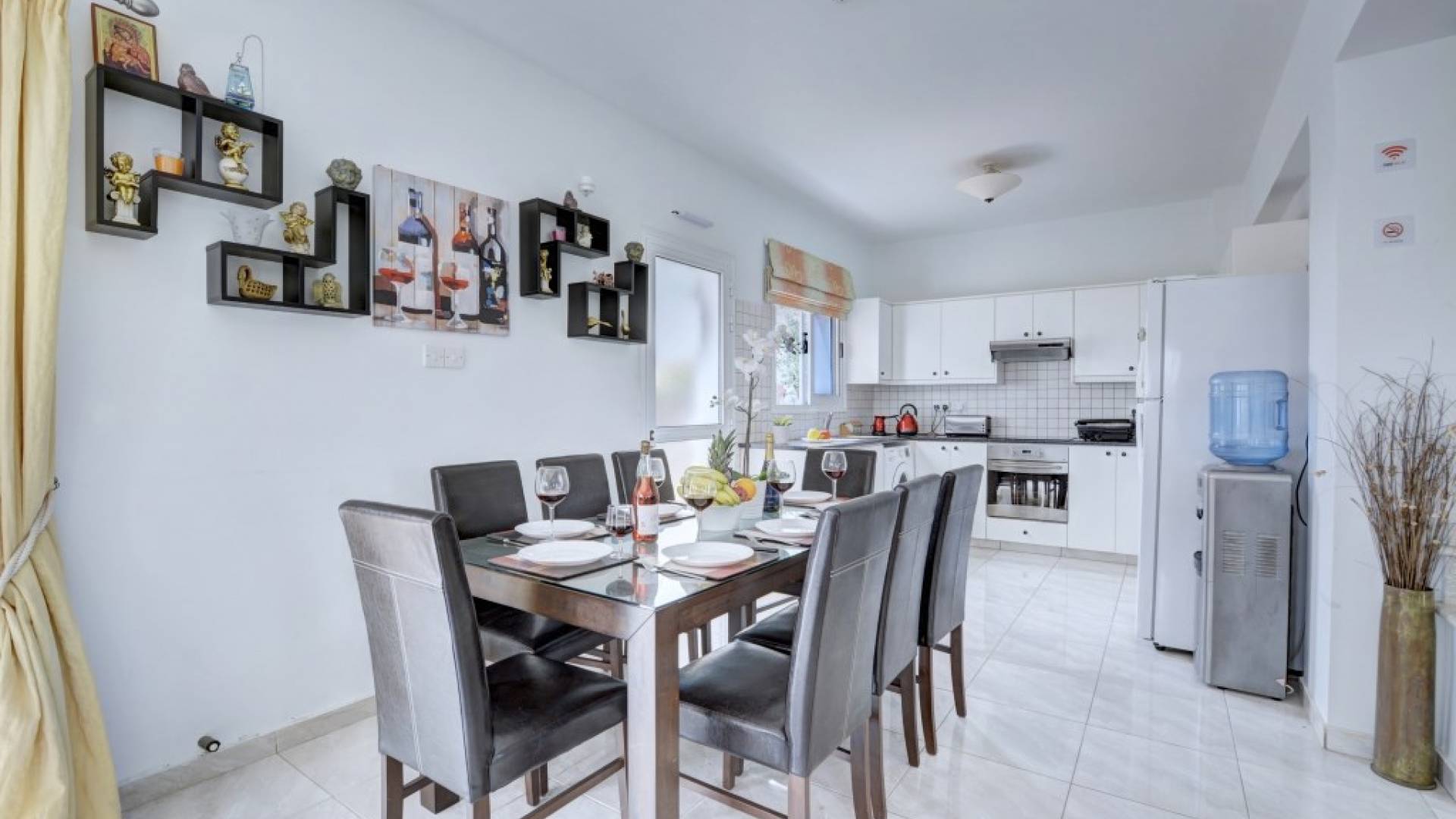 Στον κάτω όροφο, η βίλα διαθέτει ένα ευρύχωρο σαλόνι και τραπεζαρία με μπαλκονόπορτες που οδηγούν στον κήπο. Το σαλόνι διαθέτει άνετους καναπέδες και τηλεόραση ευρείας οθόνης με άφθονο καθιστικό. Από το σαλόνι ξεκινά η μεγάλη κουζίνα με ένα επιπλέον τραπέζι φαγητού με καθίσματα για 8 άτομα, η κουζίνα είναι πλήρως εξοπλισμένη με όλα τα απαραίτητα για μια άνετη διαμονή με δυνατότητα προετοιμασίας γευμάτων. Θα βρείτε επίσης ένα από τα δίκλινα υπνοδωμάτια με 2 μονά κρεβάτια και ένα ξεχωριστό WC σε αυτόν τον όροφο.