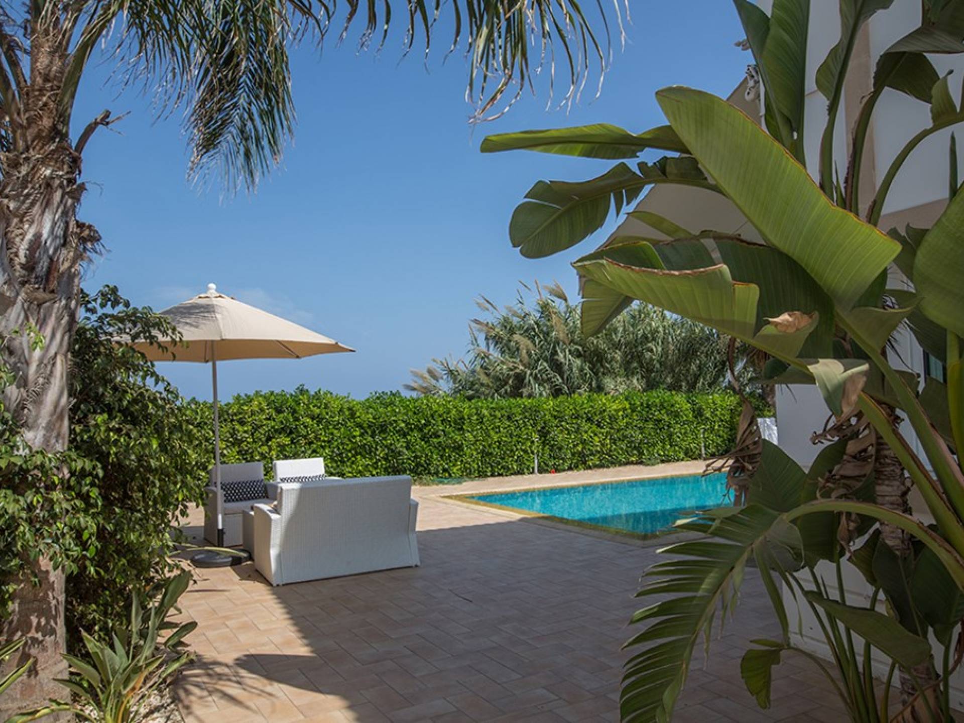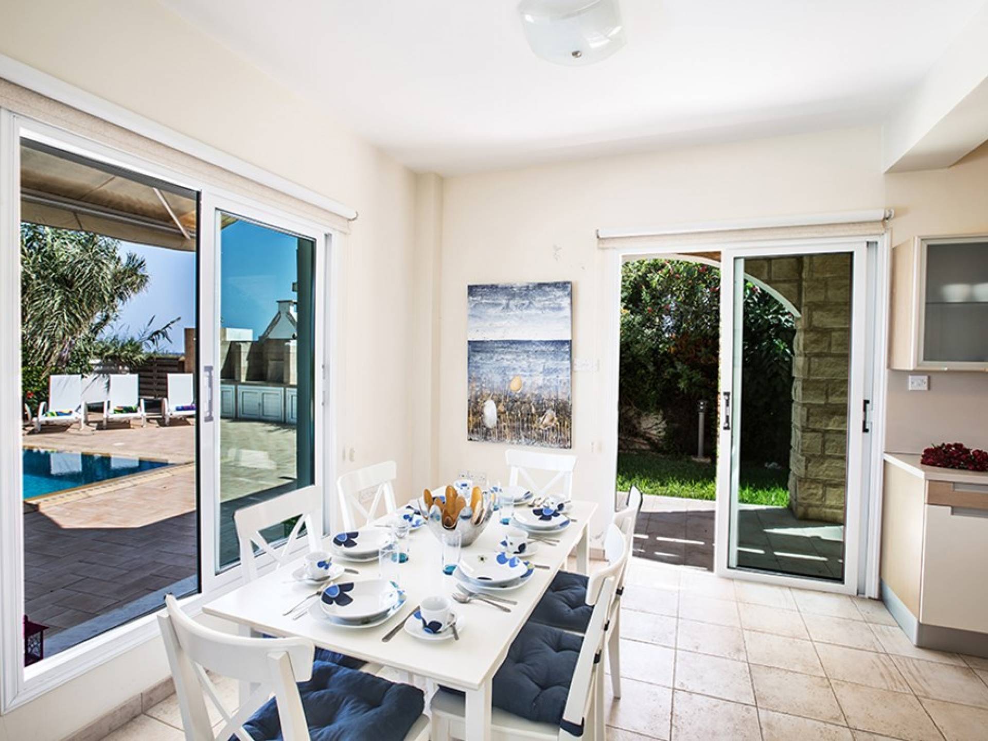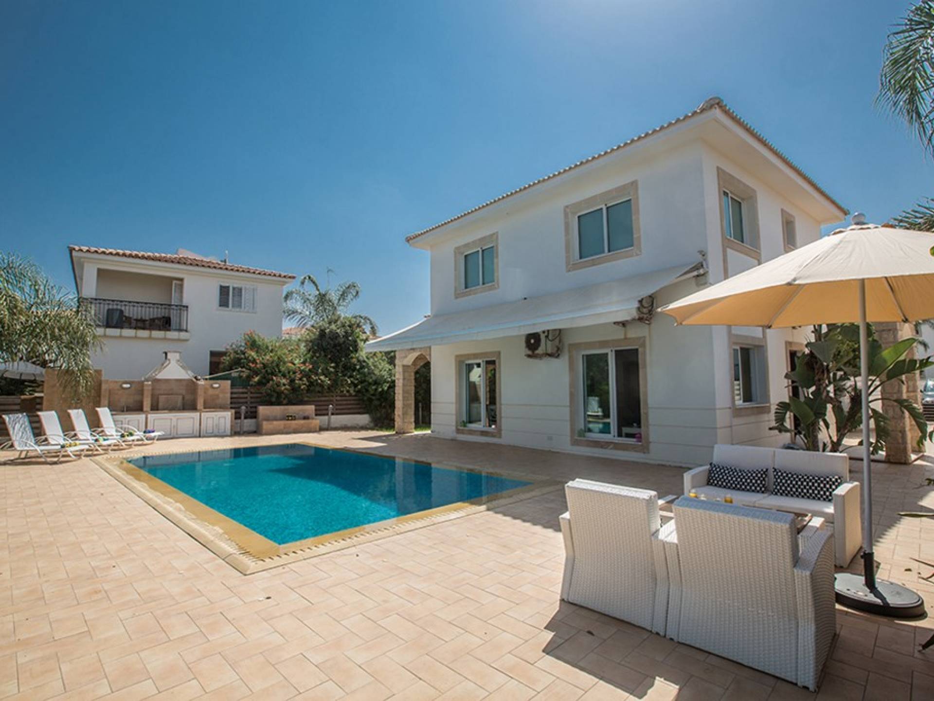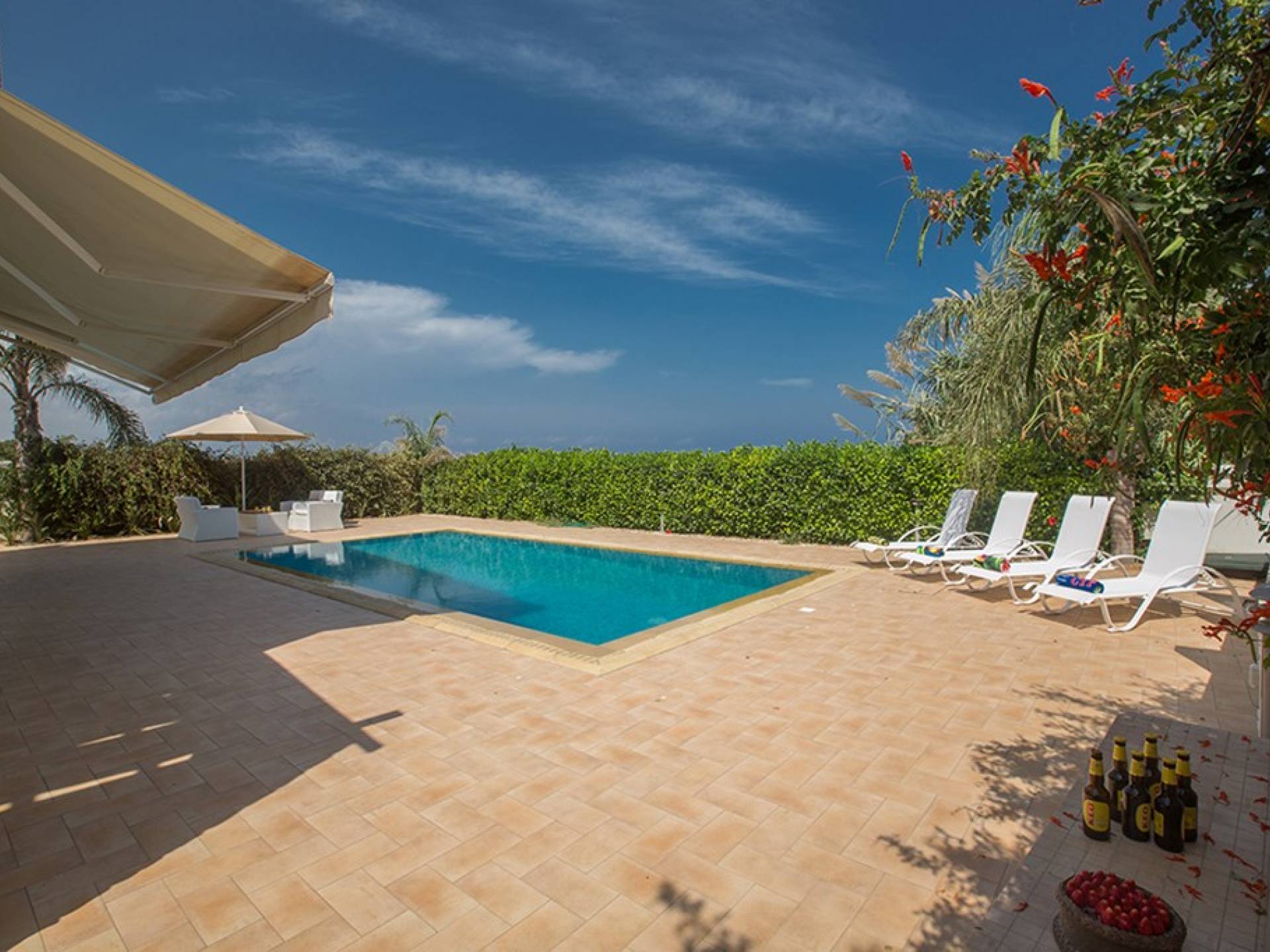 Εξωτερικά, ο μεγάλος ηλιόλουστος κήπος και ο χώρος της πισίνας είναι ιδανικοί για πολύ χαλαρές μέρες ηλιοθεραπείας και χαλάρωσης. Παρέχονται ξαπλώστρες, ενώ υπάρχει επίσης καθιστικό για φαγητό στο εξωτερικό. Η βίλα είναι πλήρως κλιματιζόμενη και υπάρχει δωρεάν Wi-Fi.