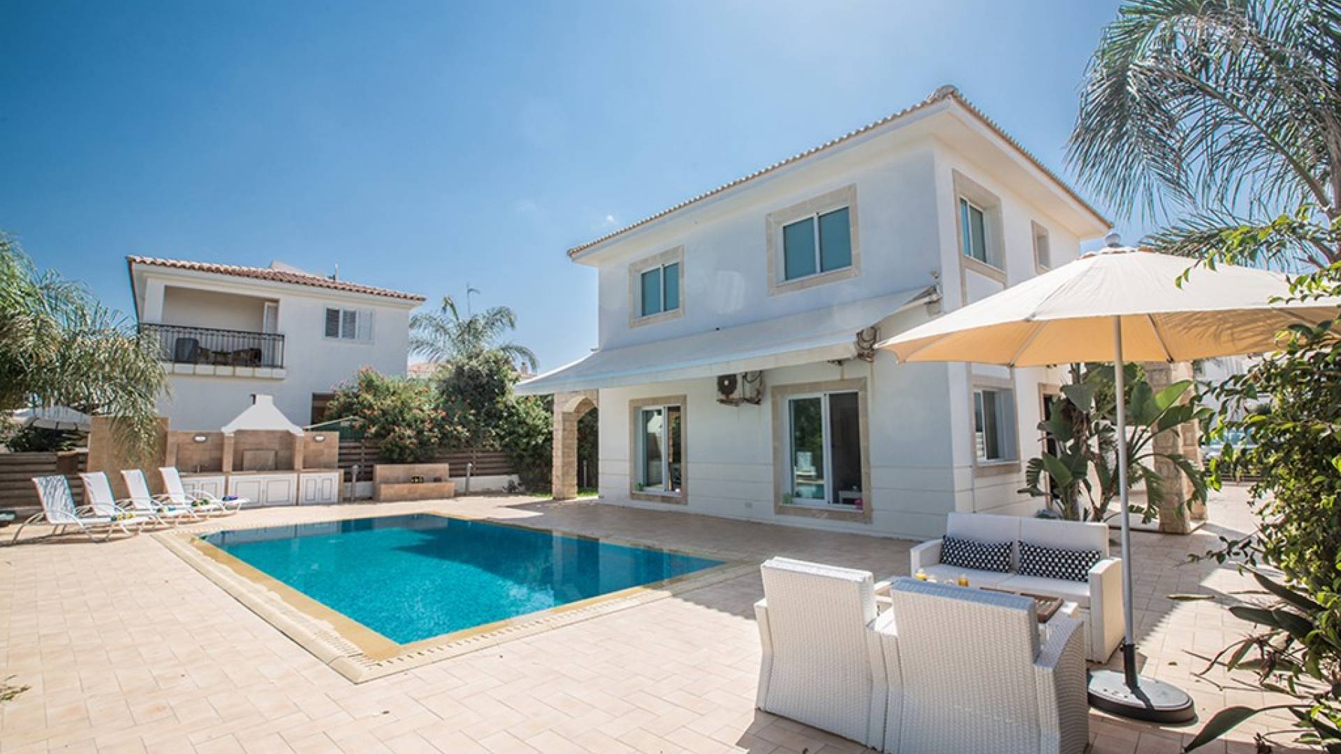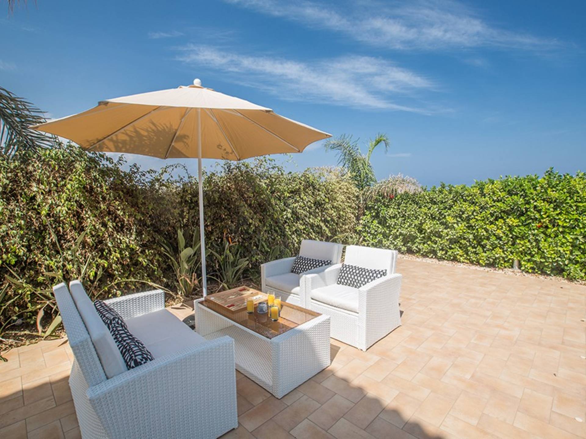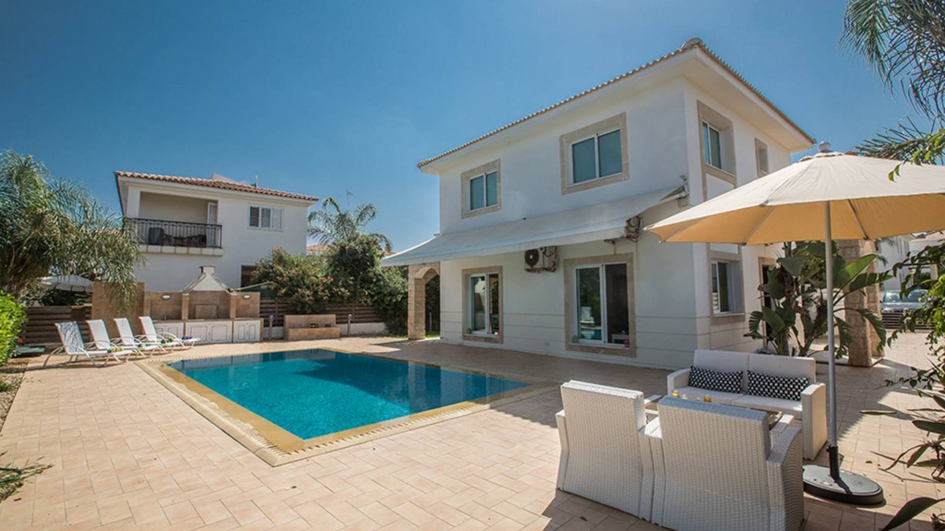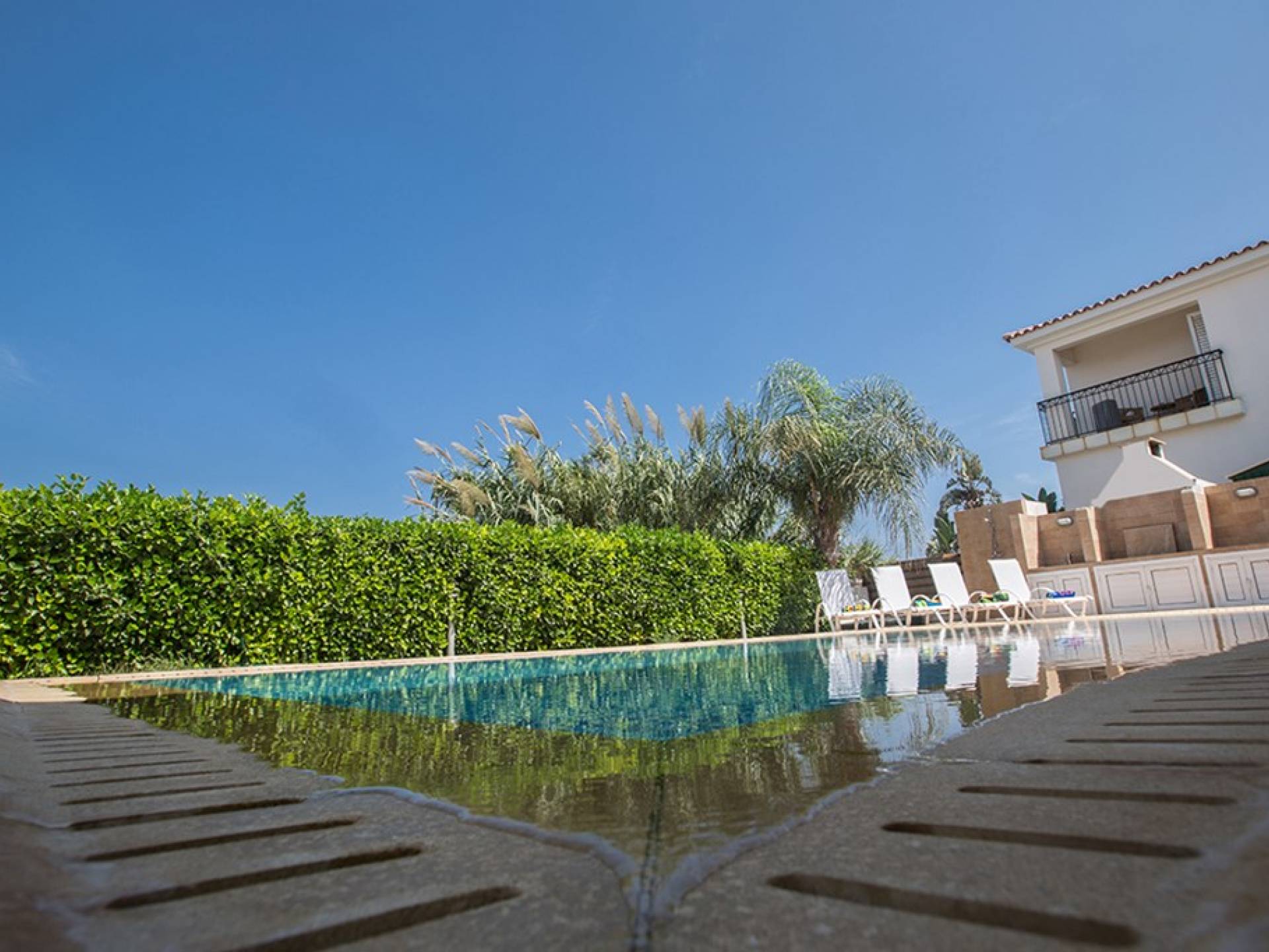 Εξωτερικά, ο μεγάλος ηλιόλουστος κήπος και ο χώρος της πισίνας είναι ιδανικοί για πολύ χαλαρές μέρες ηλιοθεραπείας και χαλάρωσης. Παρέχονται ξαπλώστρες, ενώ υπάρχει επίσης καθιστικό για φαγητό στο εξωτερικό. Η βίλα είναι πλήρως κλιματιζόμενη και υπάρχει δωρεάν Wi-Fi.