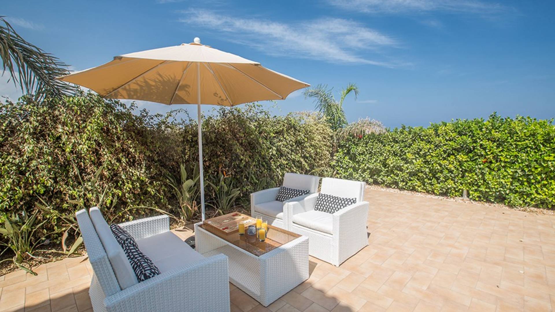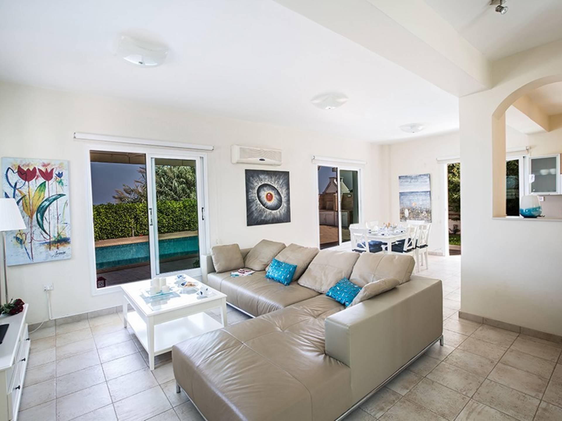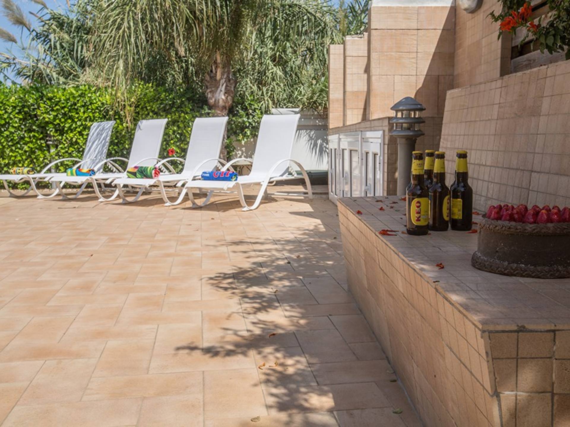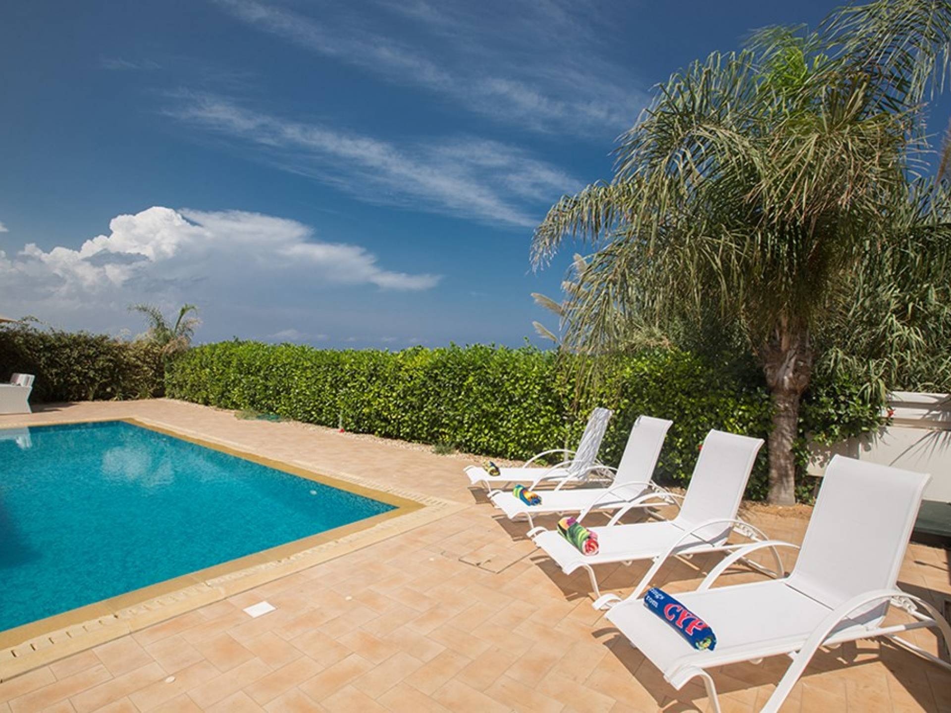 Εξωτερικά, ο μεγάλος ηλιόλουστος κήπος και ο χώρος της πισίνας είναι ιδανικοί για πολύ χαλαρές μέρες ηλιοθεραπείας και χαλάρωσης. Παρέχονται ξαπλώστρες, ενώ υπάρχει επίσης καθιστικό για φαγητό στο εξωτερικό. Η βίλα είναι πλήρως κλιματιζόμενη και υπάρχει δωρεάν Wi-Fi.