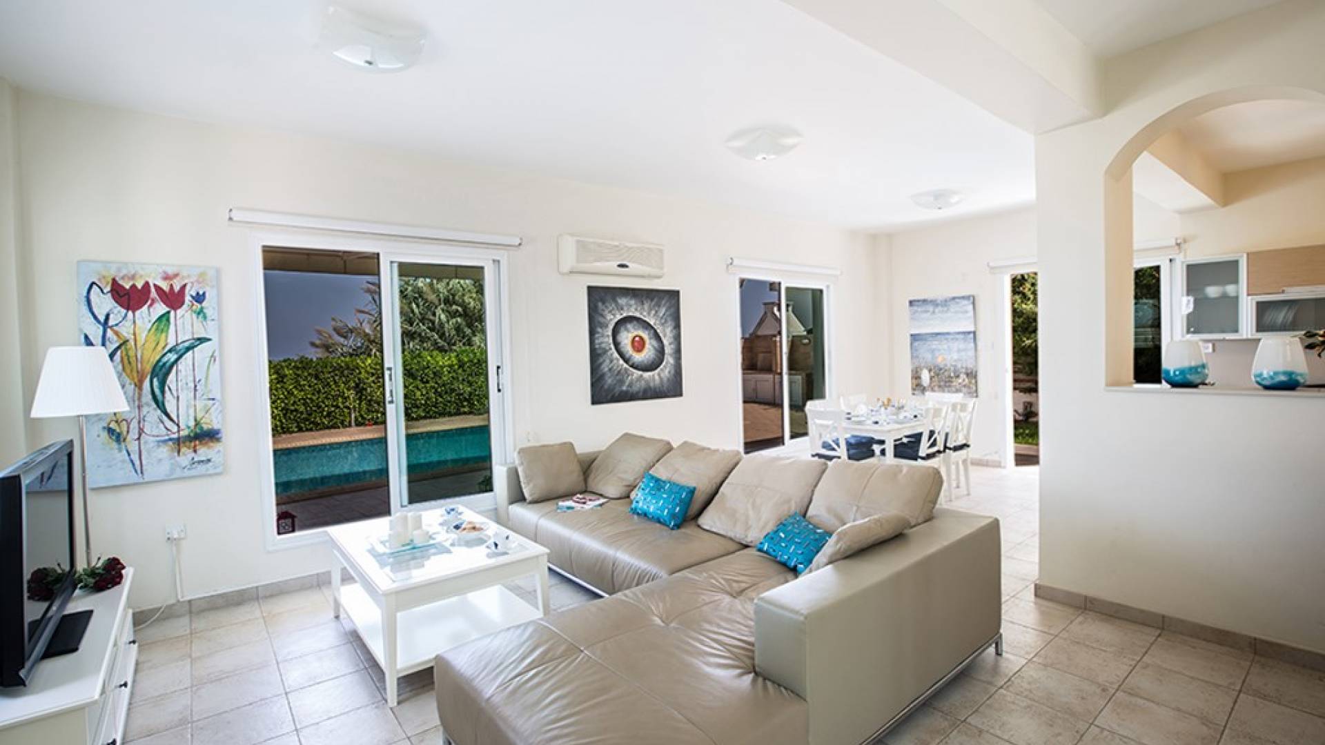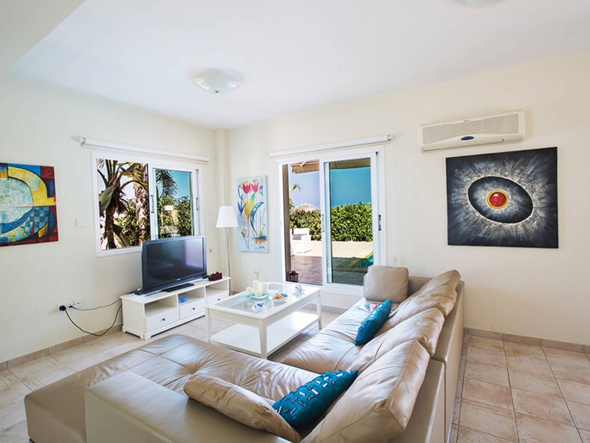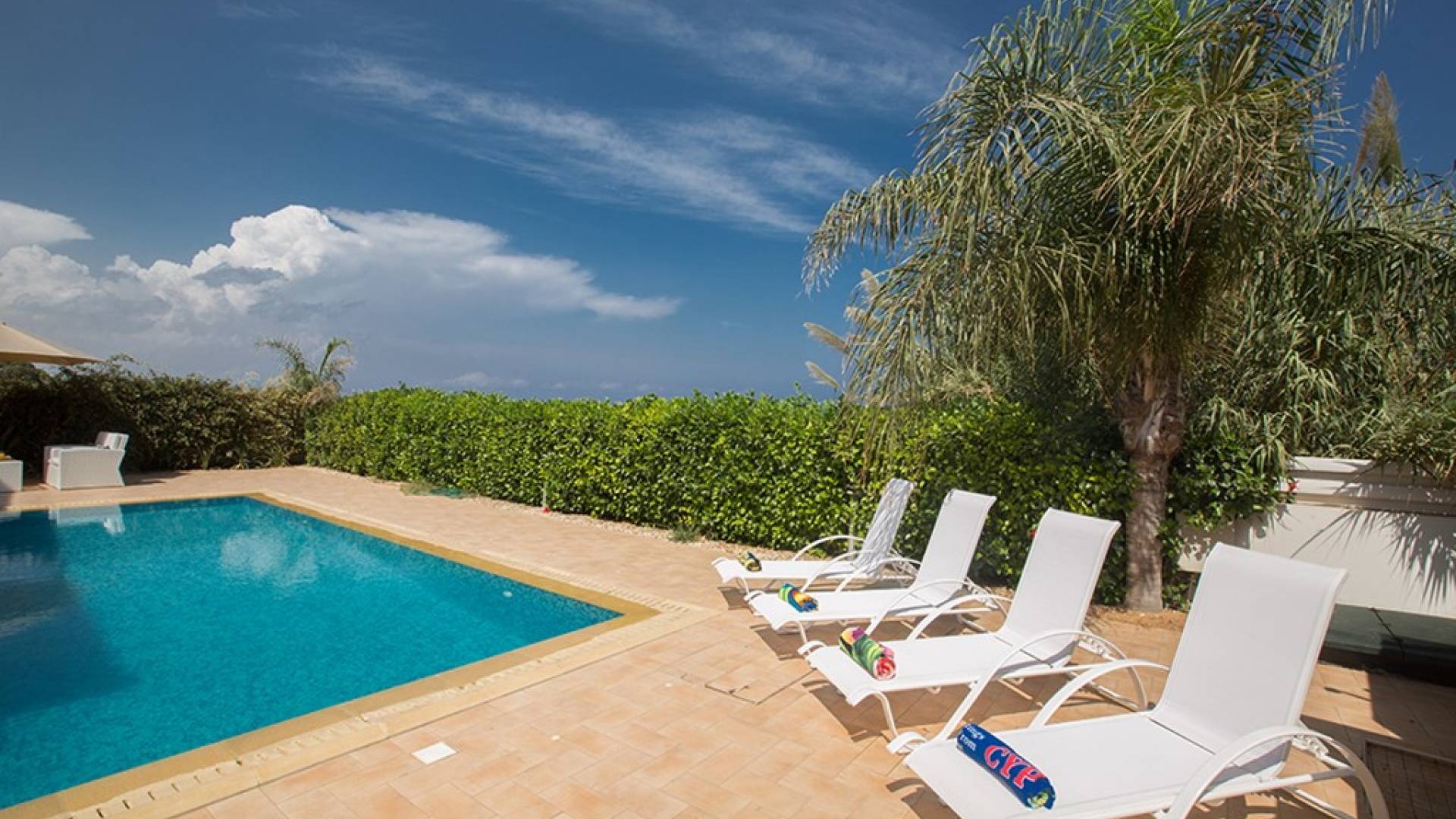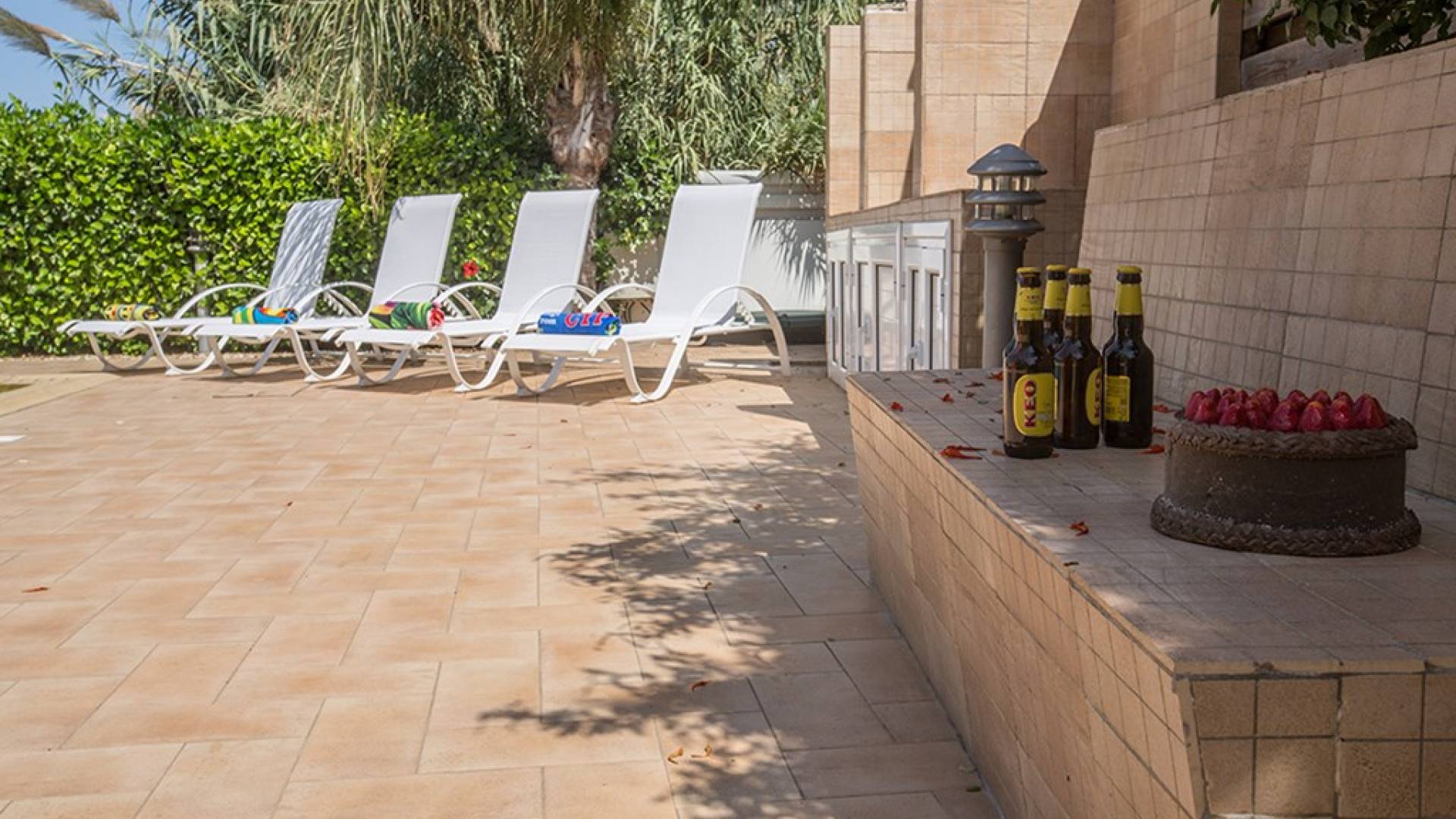Εξωτερικά, ο μεγάλος ηλιόλουστος κήπος και ο χώρος της πισίνας είναι ιδανικοί για πολύ χαλαρές μέρες ηλιοθεραπείας και χαλάρωσης. Παρέχονται ξαπλώστρες, ενώ υπάρχει επίσης καθιστικό για φαγητό στο εξωτερικό. Η βίλα είναι πλήρως κλιματιζόμενη και υπάρχει δωρεάν Wi-Fi.