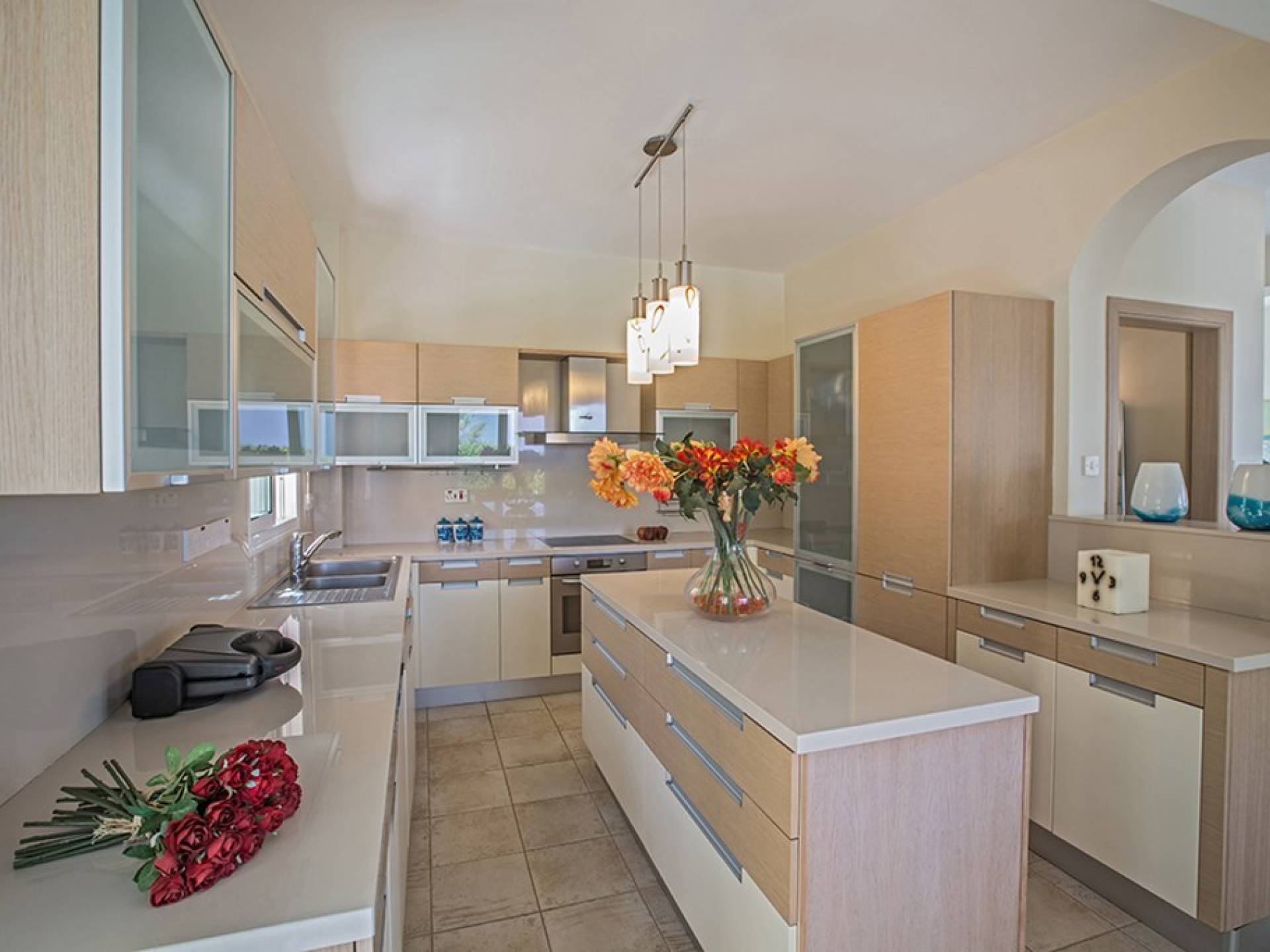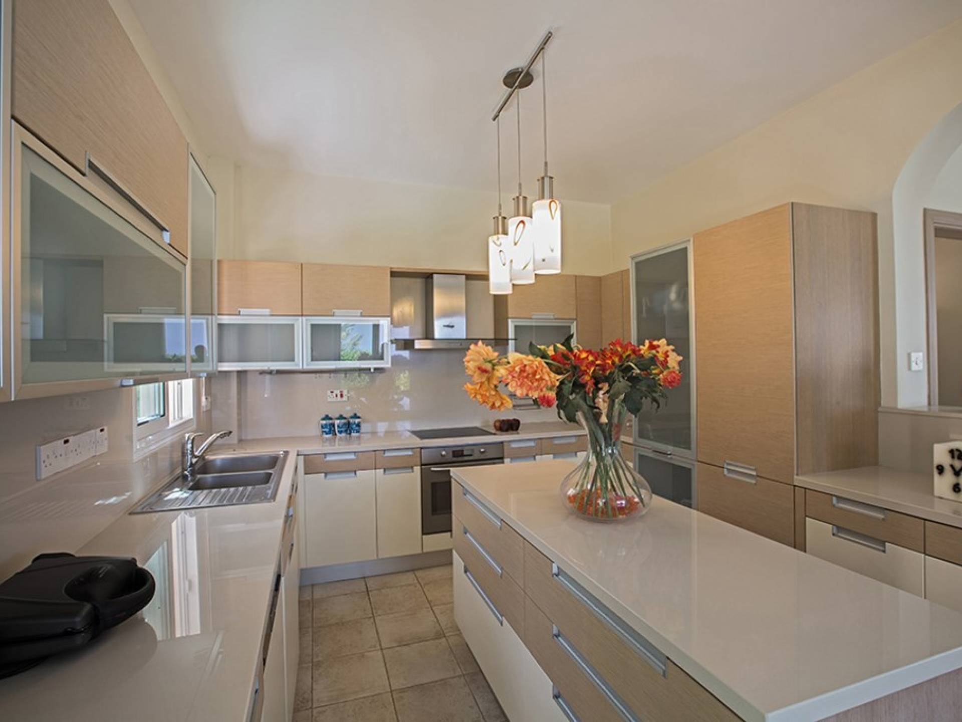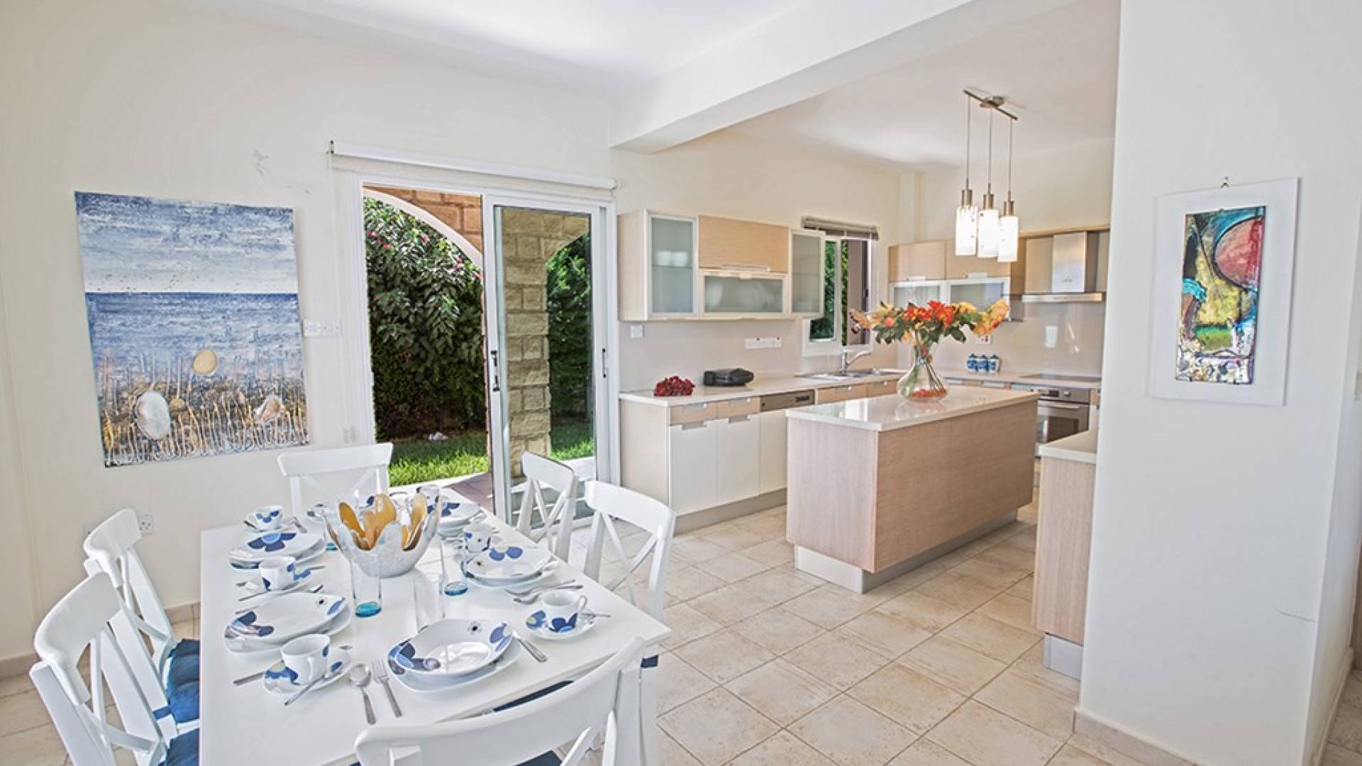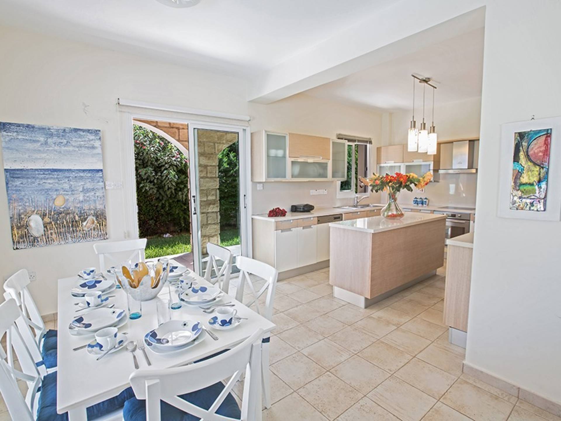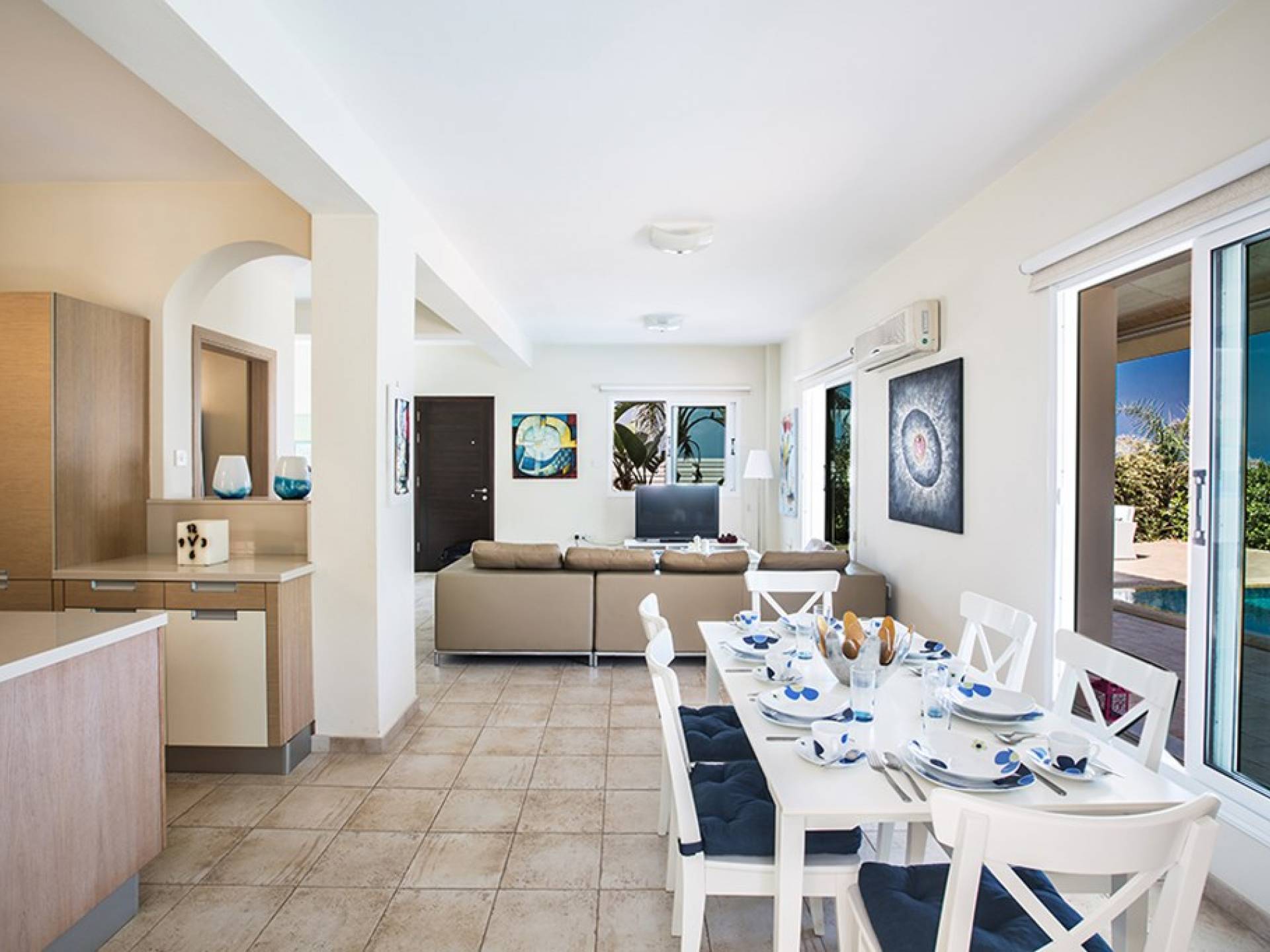 Στο ισόγειο, η βίλα διαθέτει ευρύχωρο σαλόνι, κουζίνα και τραπεζαρία, με υπέροχη θέα στην πισίνα και στον κήπο. Το σαλόνι είναι διακοσμημένο με γούστο και διαθέτει δορυφορική τηλεόραση και WIFI. Η τραπεζαρία μπορεί να φιλοξενήσει 6 άτομα και η κουζίνα διαθέτει ένα ευρύχωρο νησί, σύγχρονες συσκευές και όλα όσα χρειάζονται για μια άνετη διαμονή με δυνατότητα προετοιμασίας γευμάτων. Υπάρχει επίσης ένα WC στο ισόγειο.
