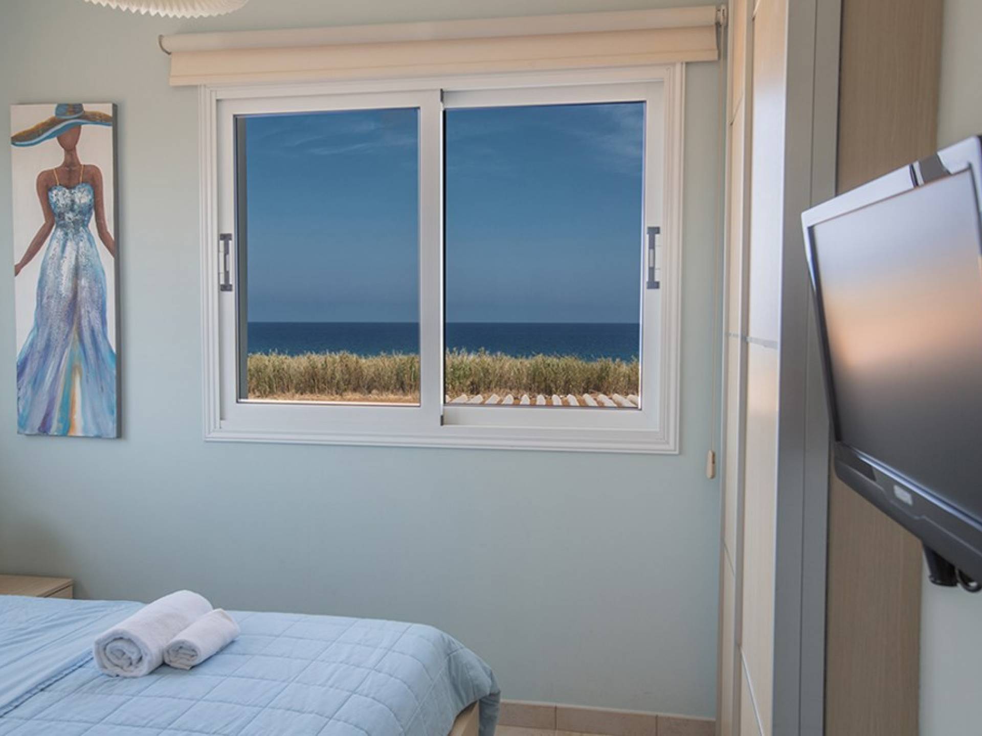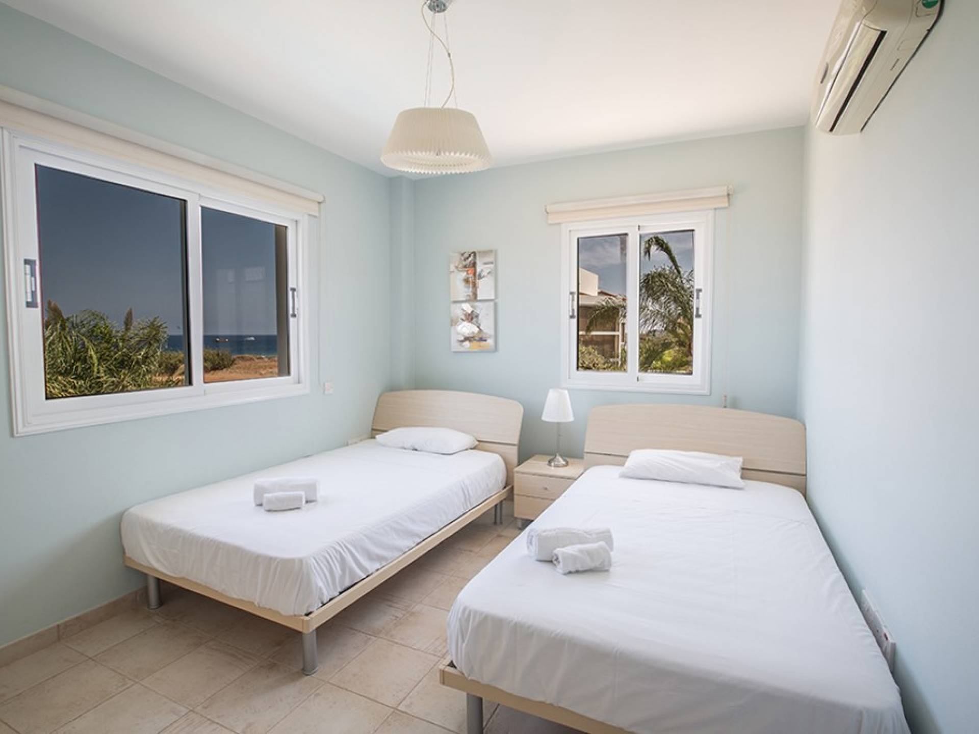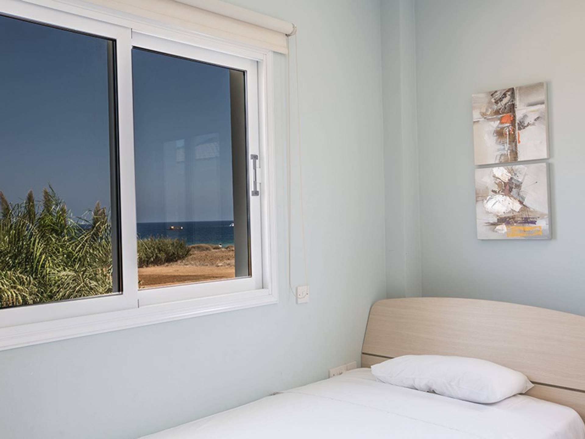 Στον επάνω όροφο, θα βρείτε το κυρίως υπνοδωμάτιο που διαθέτει διπλό κρεβάτι και ιδιωτικό μπάνιο με ντους. Υπάρχει ένα άλλο υπνοδωμάτιο με διπλό κρεβάτι και ένα δίκλινο δωμάτιο με 2 μονά κρεβάτια. Στον όροφο υπάρχει επίσης οικογενειακό μπάνιο με μπανιέρα και ντους. Δύο από τα τρία υπνοδωμάτια έχουν υπέροχη θέα στη θάλασσα.
