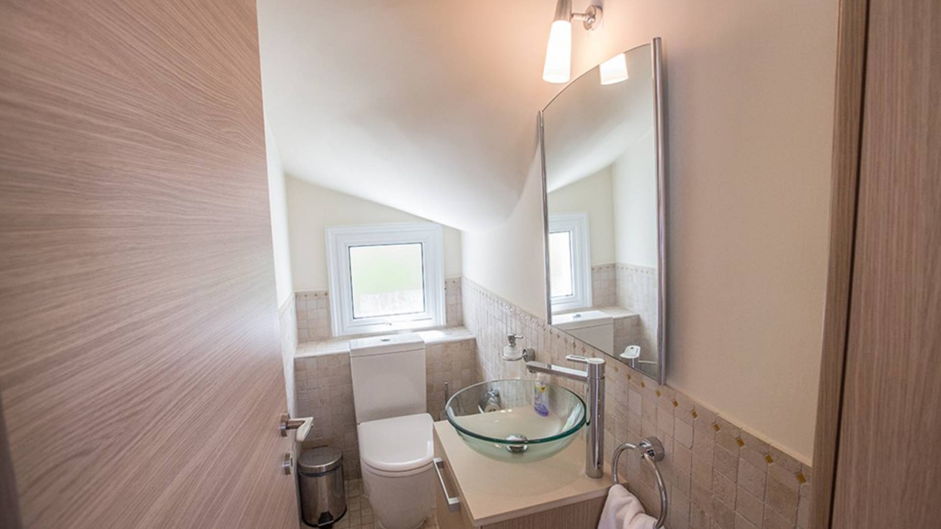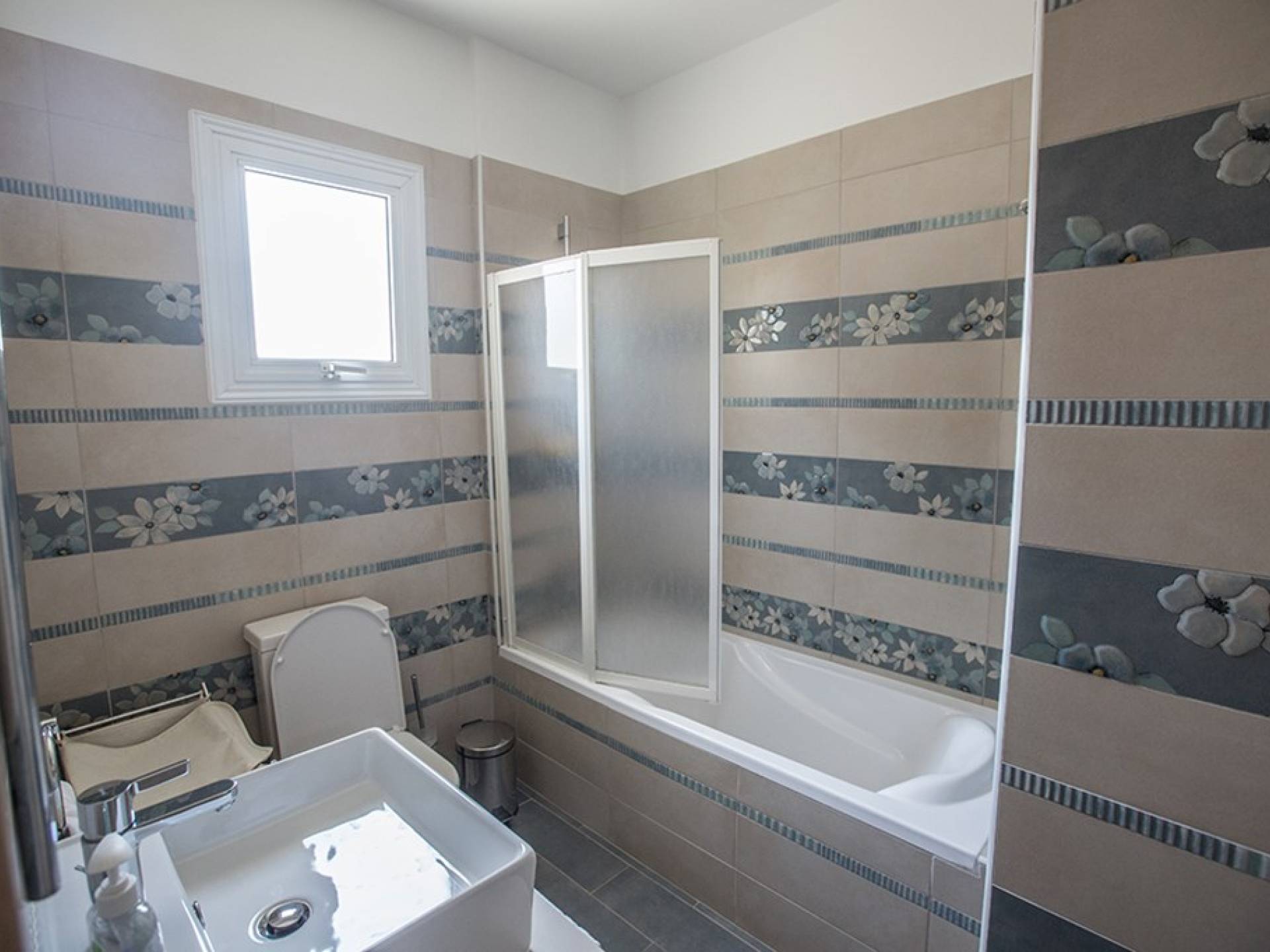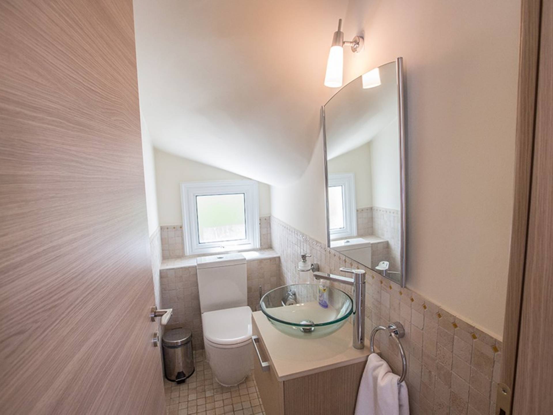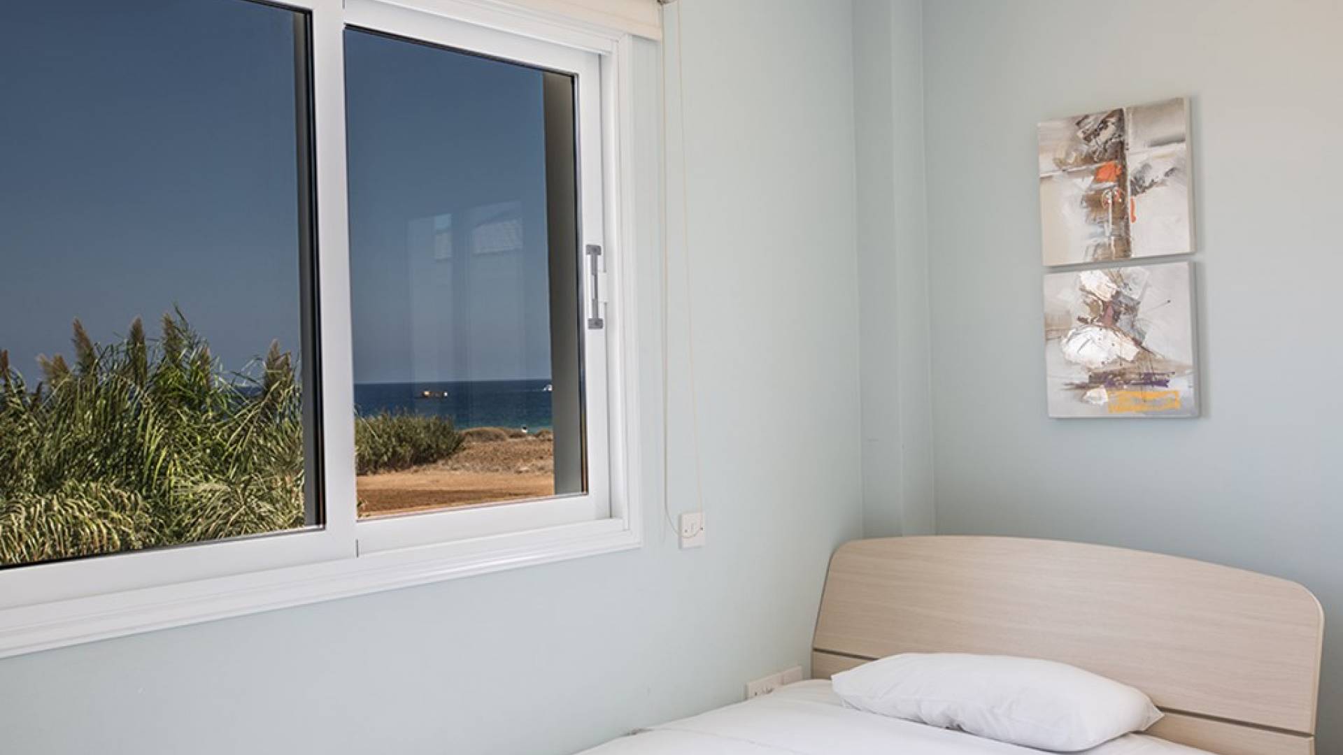 Στον επάνω όροφο, θα βρείτε το κυρίως υπνοδωμάτιο που διαθέτει διπλό κρεβάτι και ιδιωτικό μπάνιο με ντους. Υπάρχει ένα άλλο υπνοδωμάτιο με διπλό κρεβάτι και ένα δίκλινο δωμάτιο με 2 μονά κρεβάτια. Στον όροφο υπάρχει επίσης οικογενειακό μπάνιο με μπανιέρα και ντους. Δύο από τα τρία υπνοδωμάτια έχουν υπέροχη θέα στη θάλασσα.