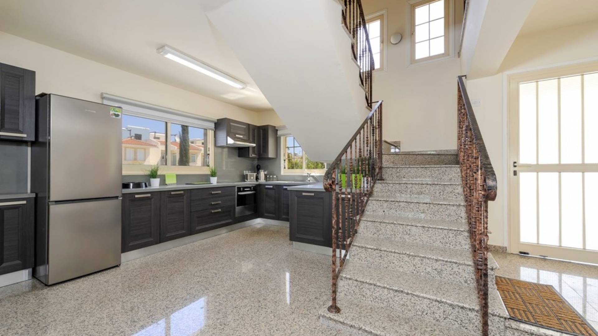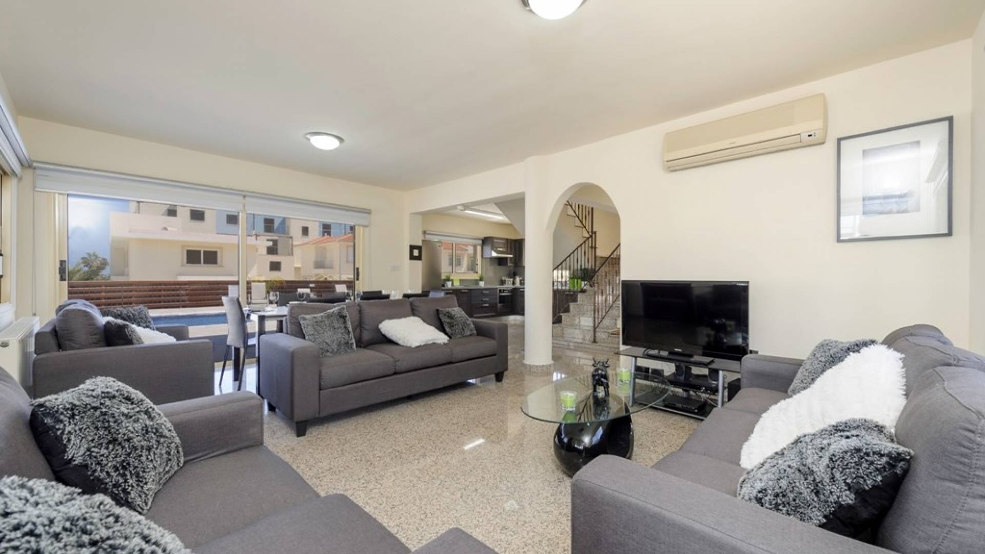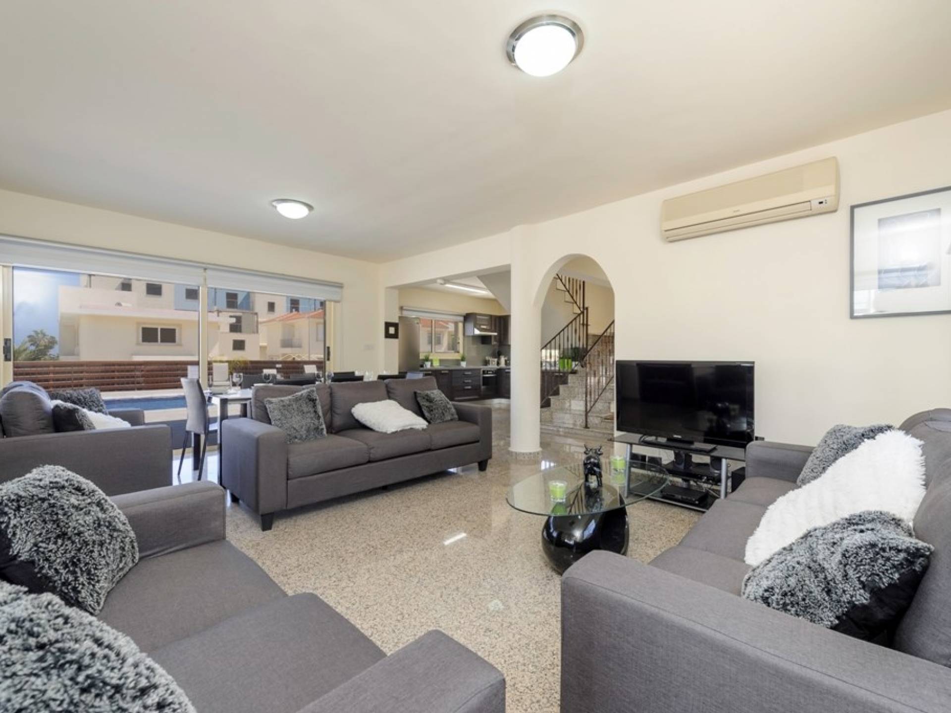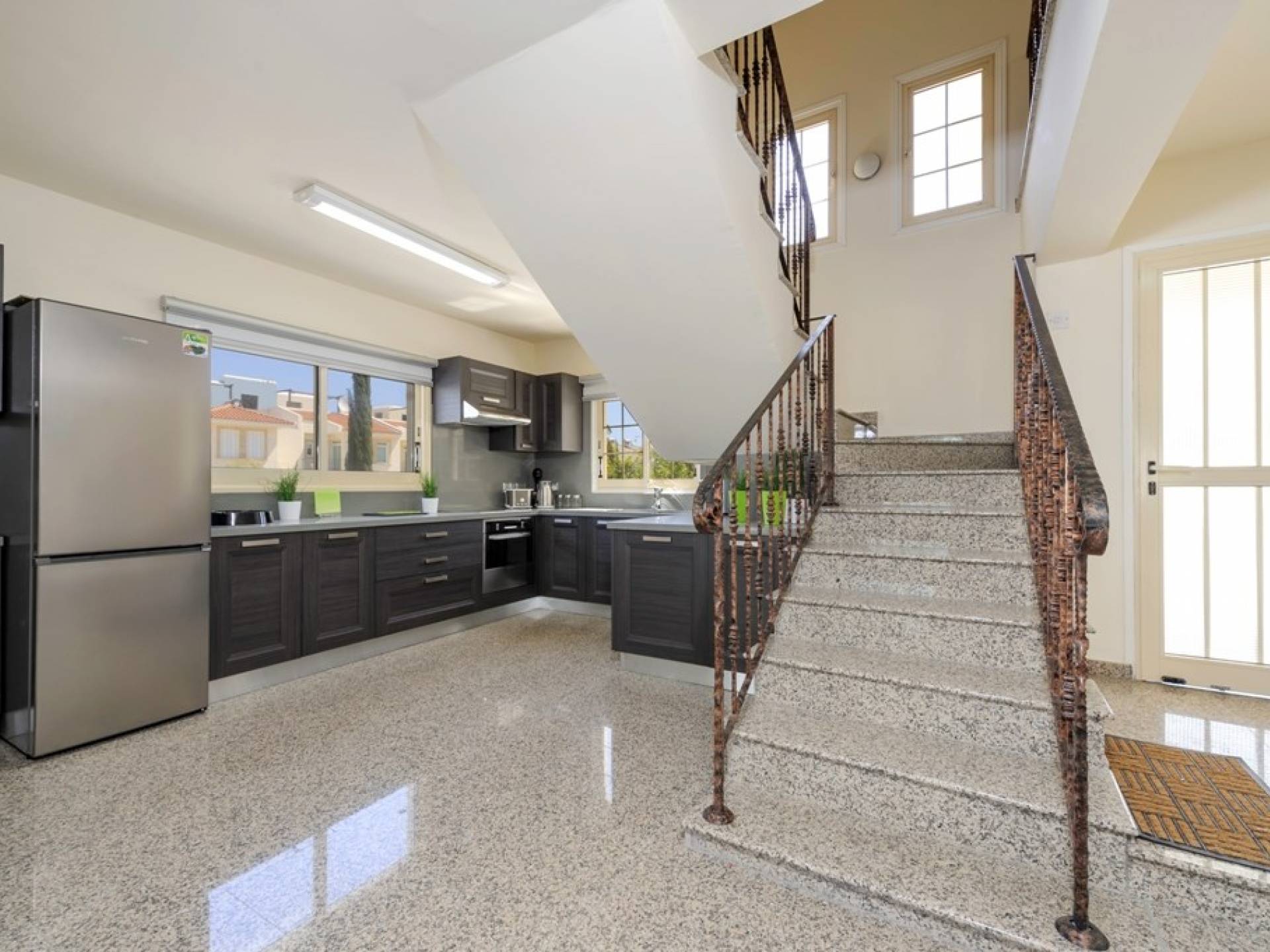 Στο εσωτερικό, η βίλα είναι όμορφα επιπλωμένη με μοντέρνα διακόσμηση. Στο ισόγειο υπάρχει καθιστικό με ενιαία διαρρύθμιση, τραπέζι φαγητού και καρέκλες και πλήρως εξοπλισμένη κουζίνα. Υπάρχει επίσης ένα W / C.