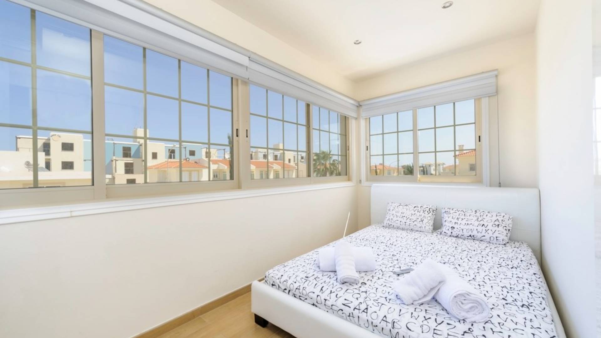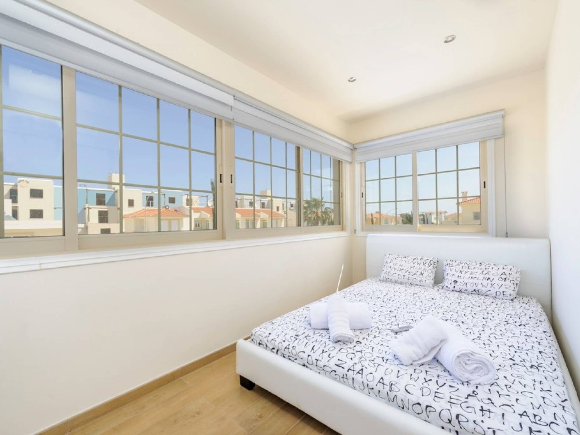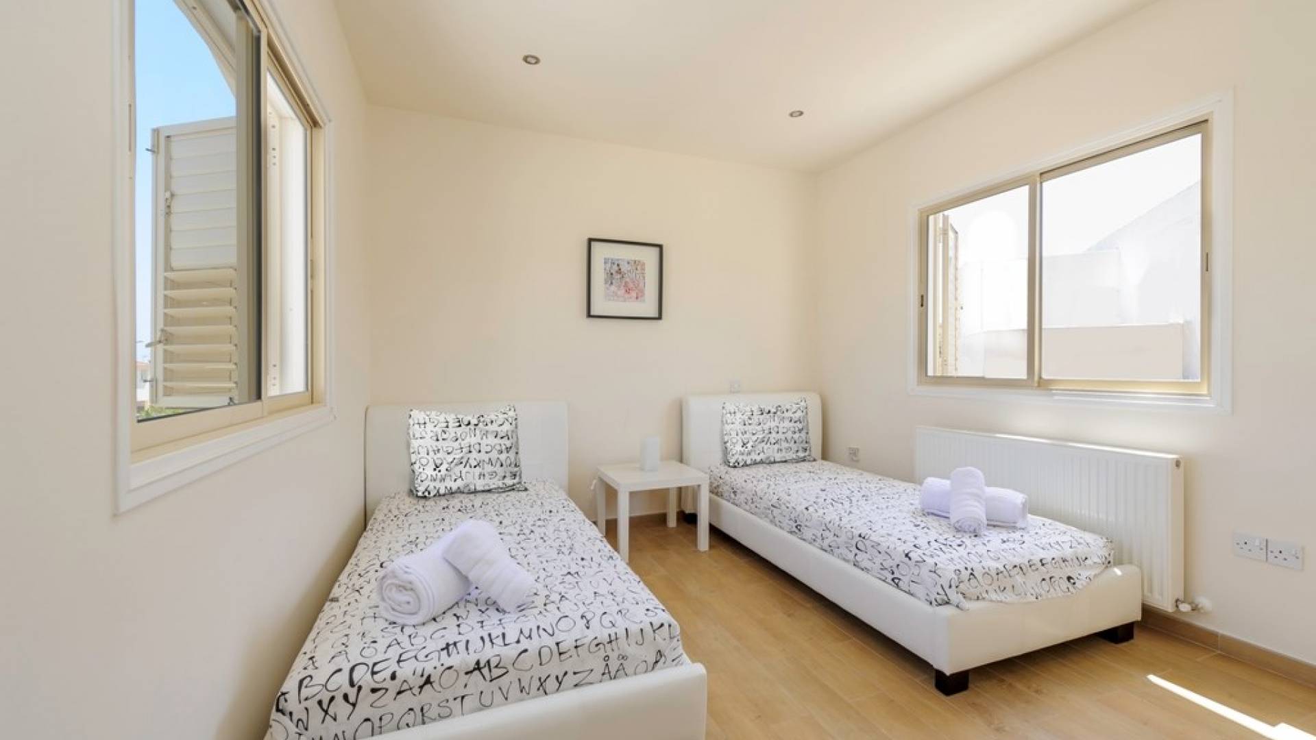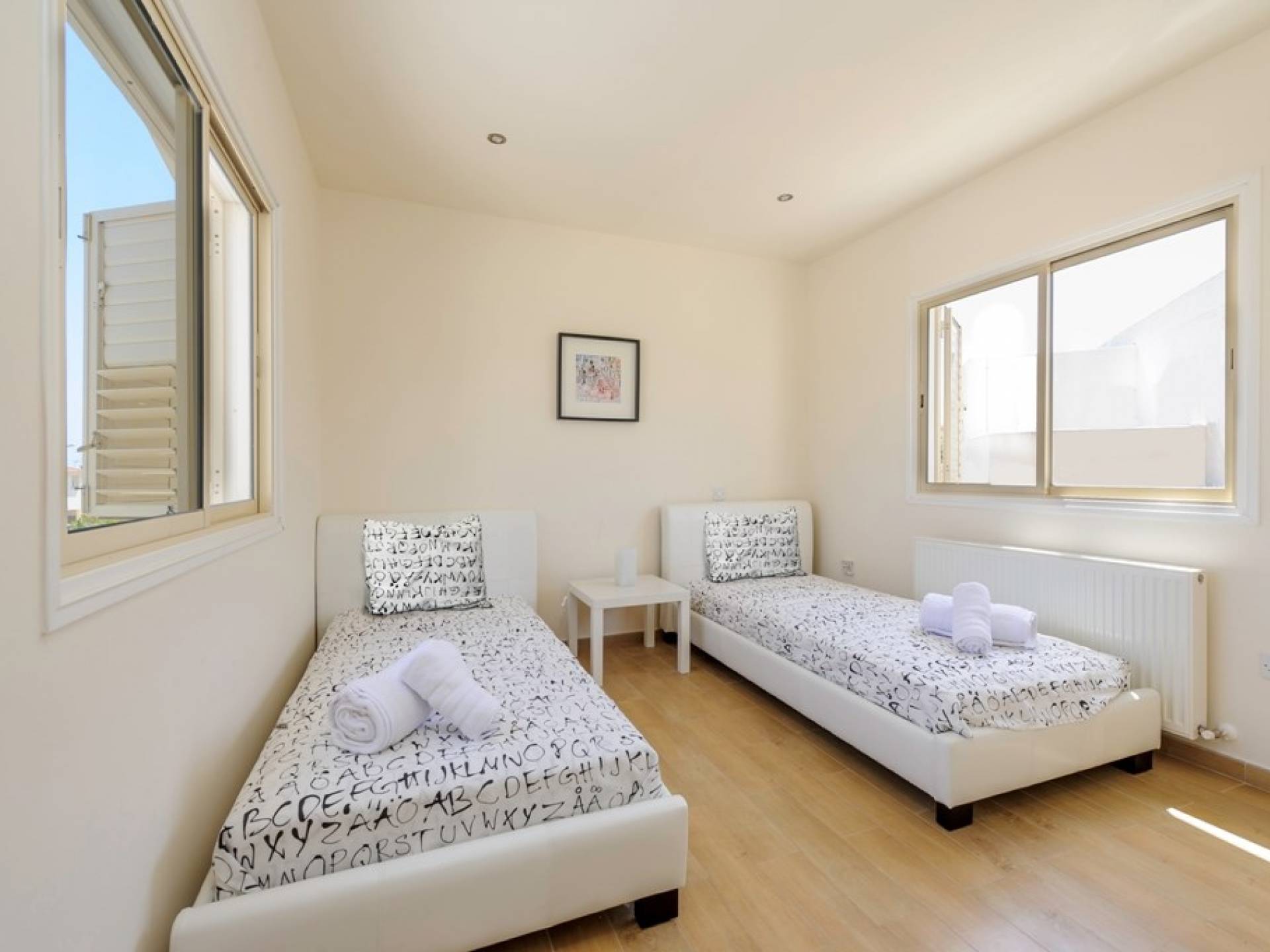 Στον επάνω όροφο, υπάρχουν 4 ευρύχωρα υπνοδωμάτια, 3 με διπλά κρεβάτια και 1 με δύο μονά κρεβάτια. Κάθε υπνοδωμάτιο έχει εντοιχισμένες ντουλάπες και κομοδίνα. Υπάρχει ένα οικογενειακό μπάνιο με μπανιέρα και ντους. Ένας ευρύχωρος εξωτερικός χώρος με μπαλκόνι προσφέρει θέα στη θάλασσα.