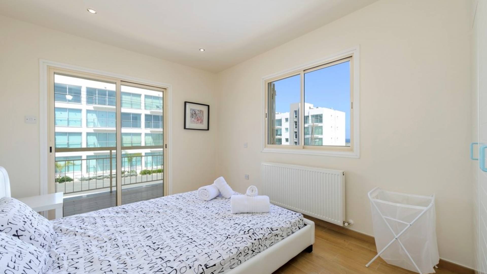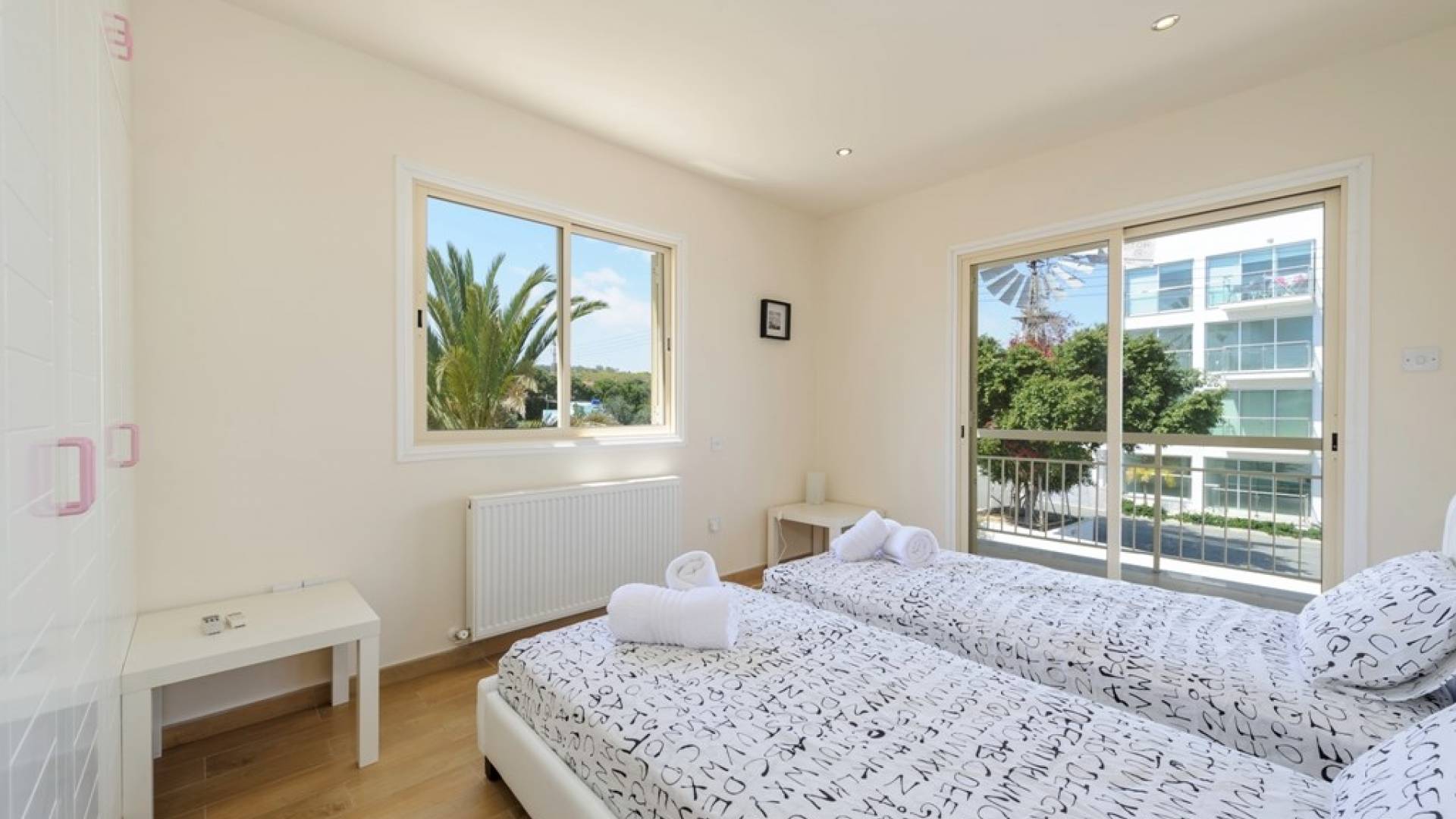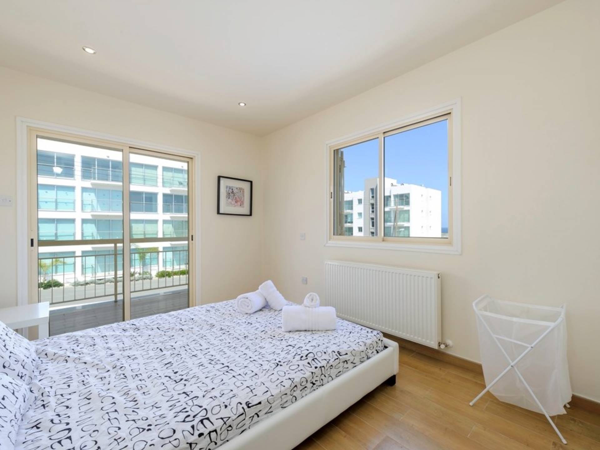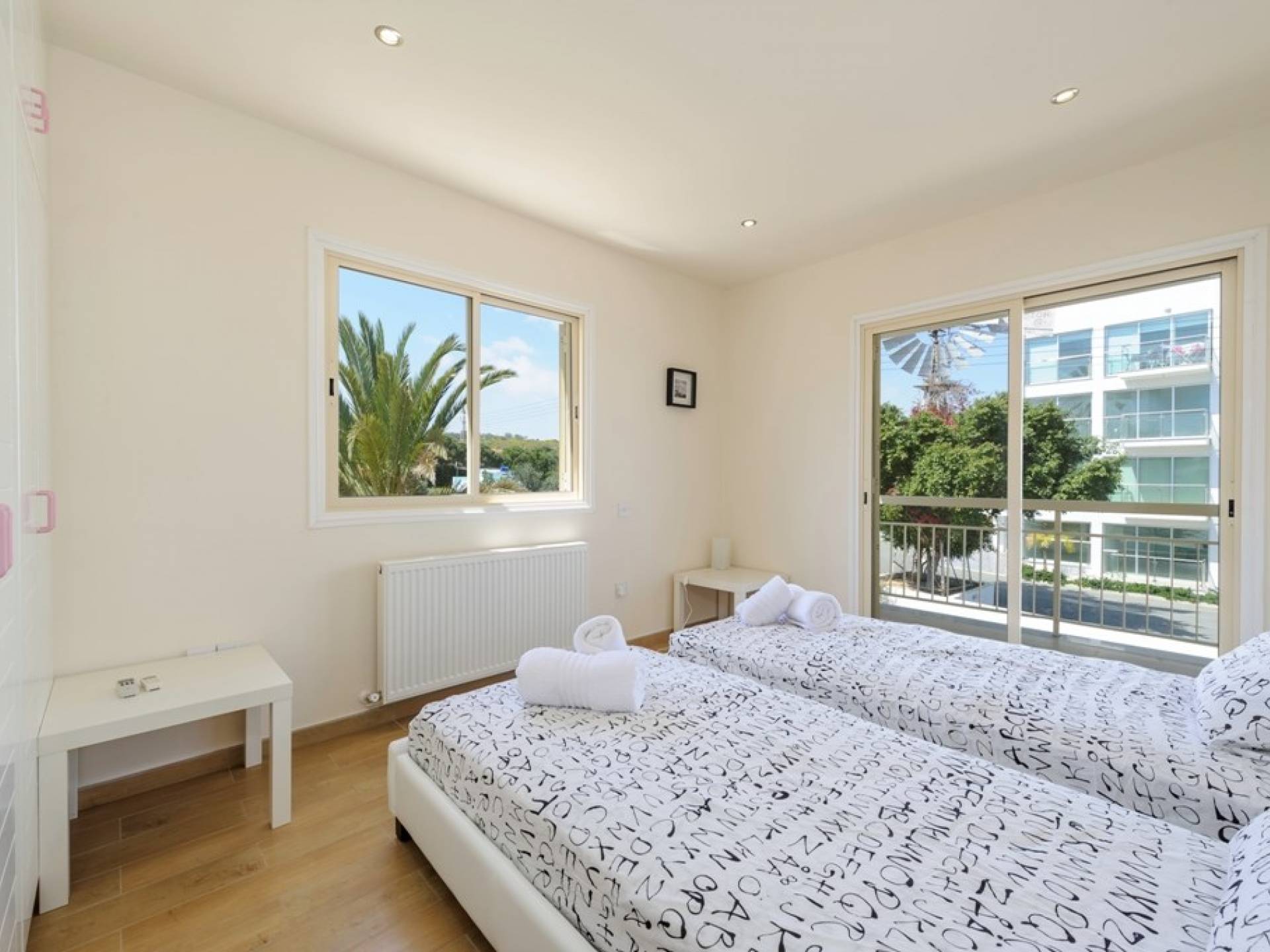 Στον επάνω όροφο, υπάρχουν 4 ευρύχωρα υπνοδωμάτια, 3 με διπλά κρεβάτια και 1 με δύο μονά κρεβάτια. Κάθε υπνοδωμάτιο έχει εντοιχισμένες ντουλάπες και κομοδίνα. Υπάρχει ένα οικογενειακό μπάνιο με μπανιέρα και ντους. Ένας ευρύχωρος εξωτερικός χώρος με μπαλκόνι προσφέρει θέα στη θάλασσα.