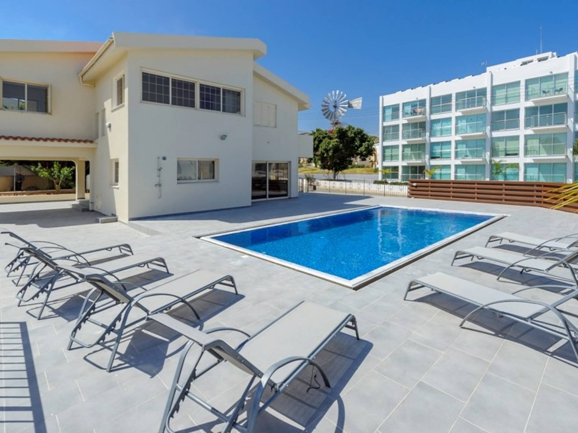 Εξωτερικά, ο μεγάλος κήπος και η πισίνα προσφέρουν άφθονο χώρο για ηλιοθεραπεία, χαλάρωση και φαγητό έξω.