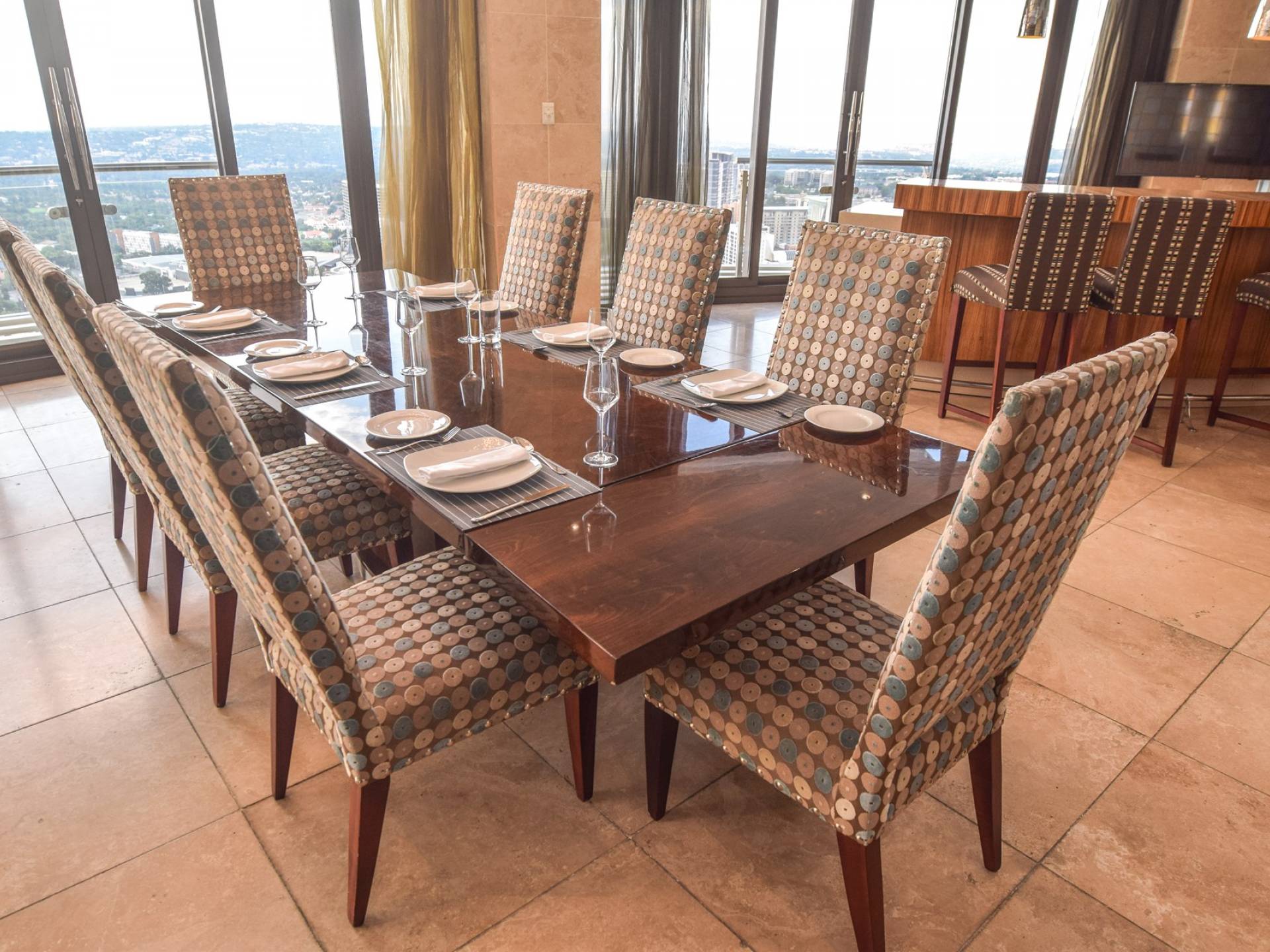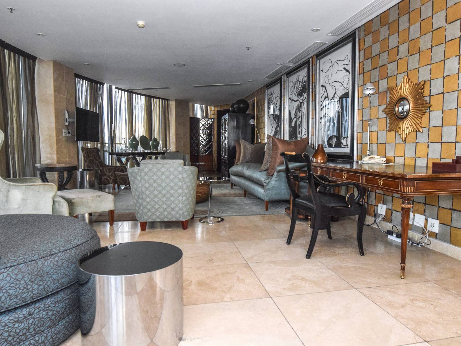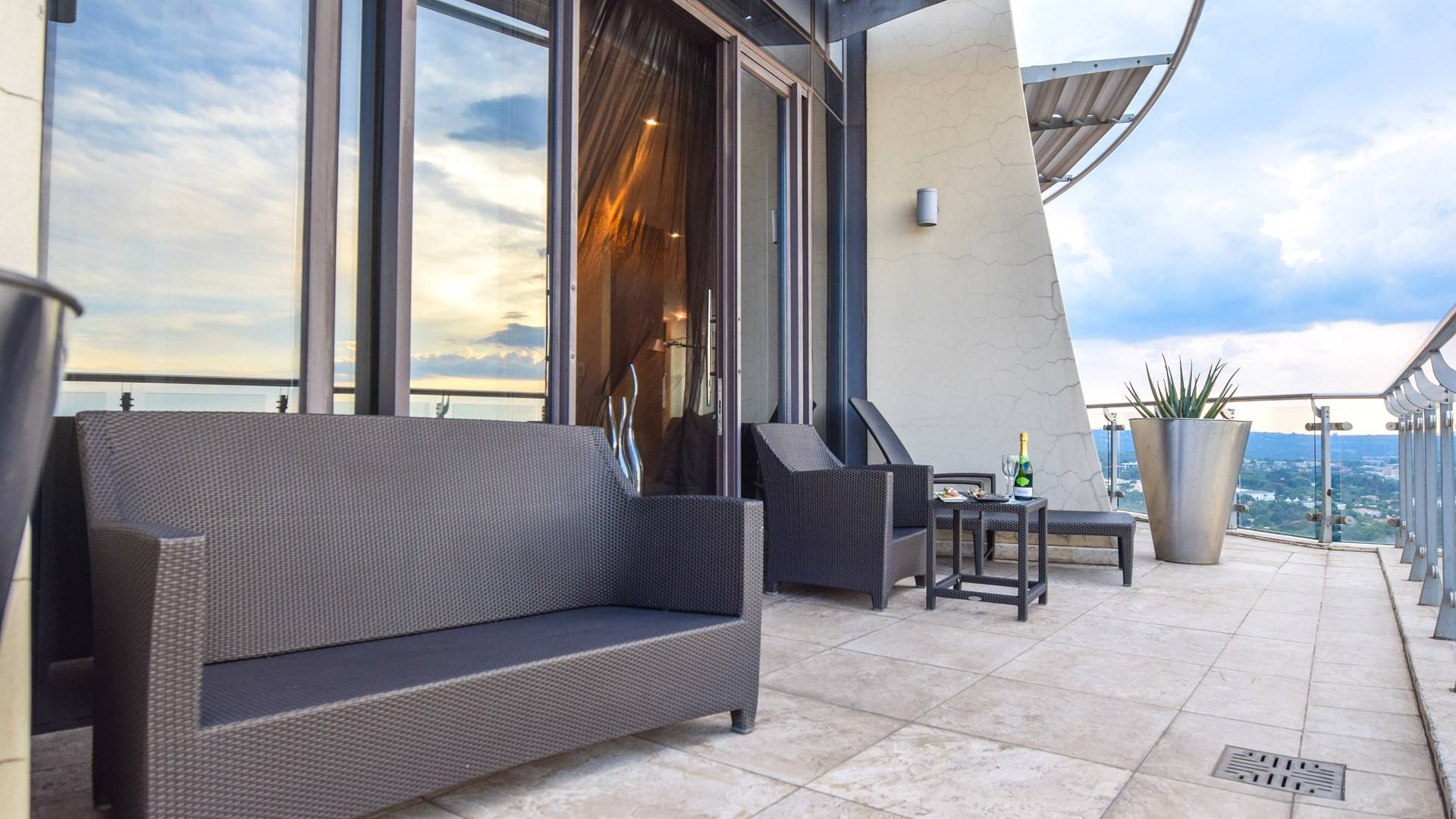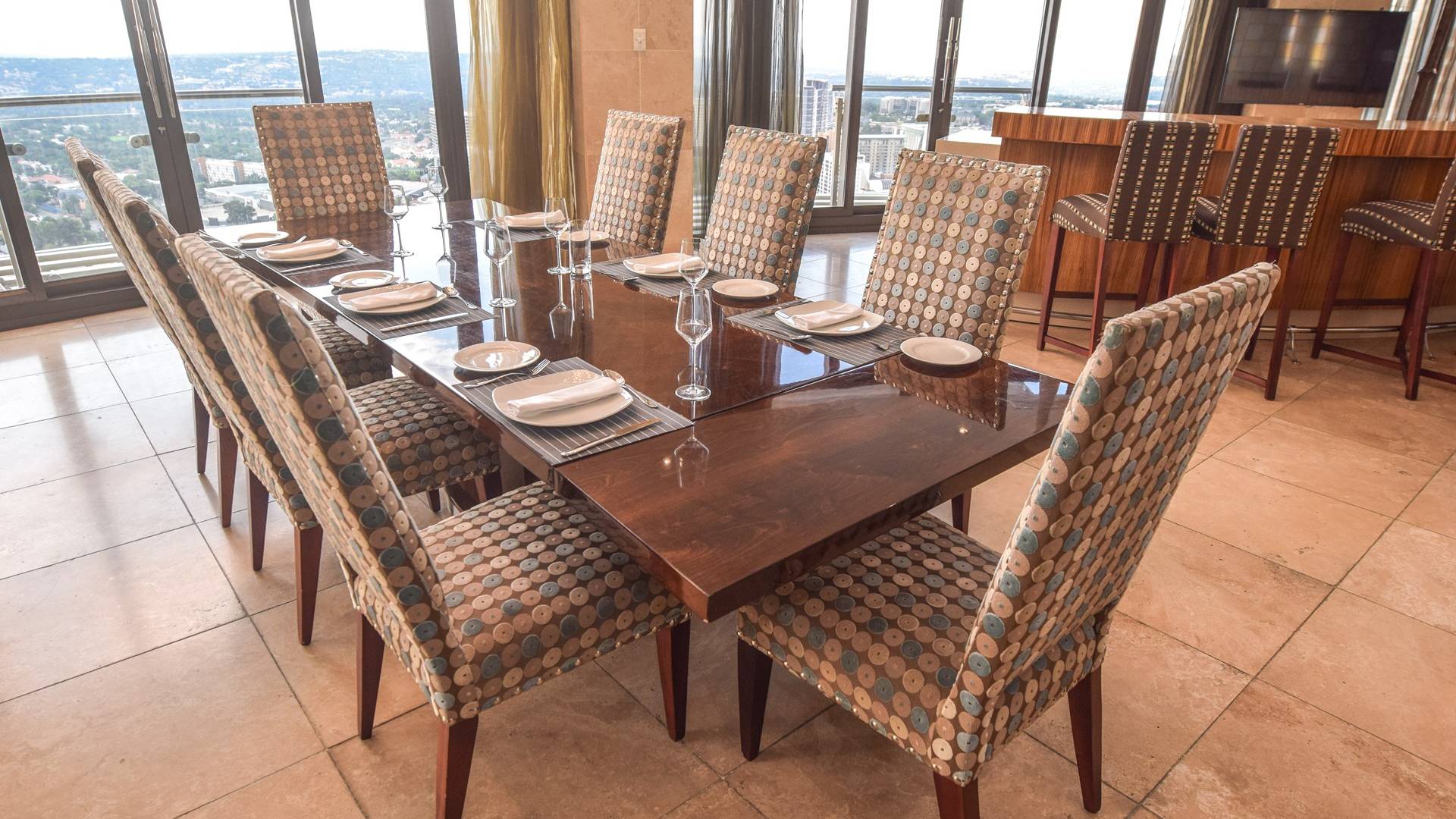 Με πανοραμική θέα στο Magaliesberg, το Γιοχάνεσμπουργκ CBD και το αστικό τοπίο Sandton παρακάτω. Η σουίτα 600τμ είναι ένας χώρος σε αντίθεση με οποιονδήποτε άλλο στο Sandton και προσφέρει στον αρμόδιο για τη διοργάνωση εκδήλωση μια μοναδική παλέτα από την οποία μπορείτε να φανταστείτε το αδιανόητο. Προσφέροντας την απόλυτη άνεση και κομψότητα, αυτή η τριώροφη πολυτελής σουίτα διαθέτει τρία υπνοδωμάτια με ιδιωτικό μπάνιο, τραπέζι φαγητού για 13 άτομα, lounge και sky bar, 13 καθιστική αίθουσα συνεδριάσεων, πλήρως εξοπλισμένη κουζίνα με εγκαταστάσεις πλυντηρίων, γυάλινο ασανσέρ , ιδιωτική εσωτερική πισίνα και γυμναστήριο.