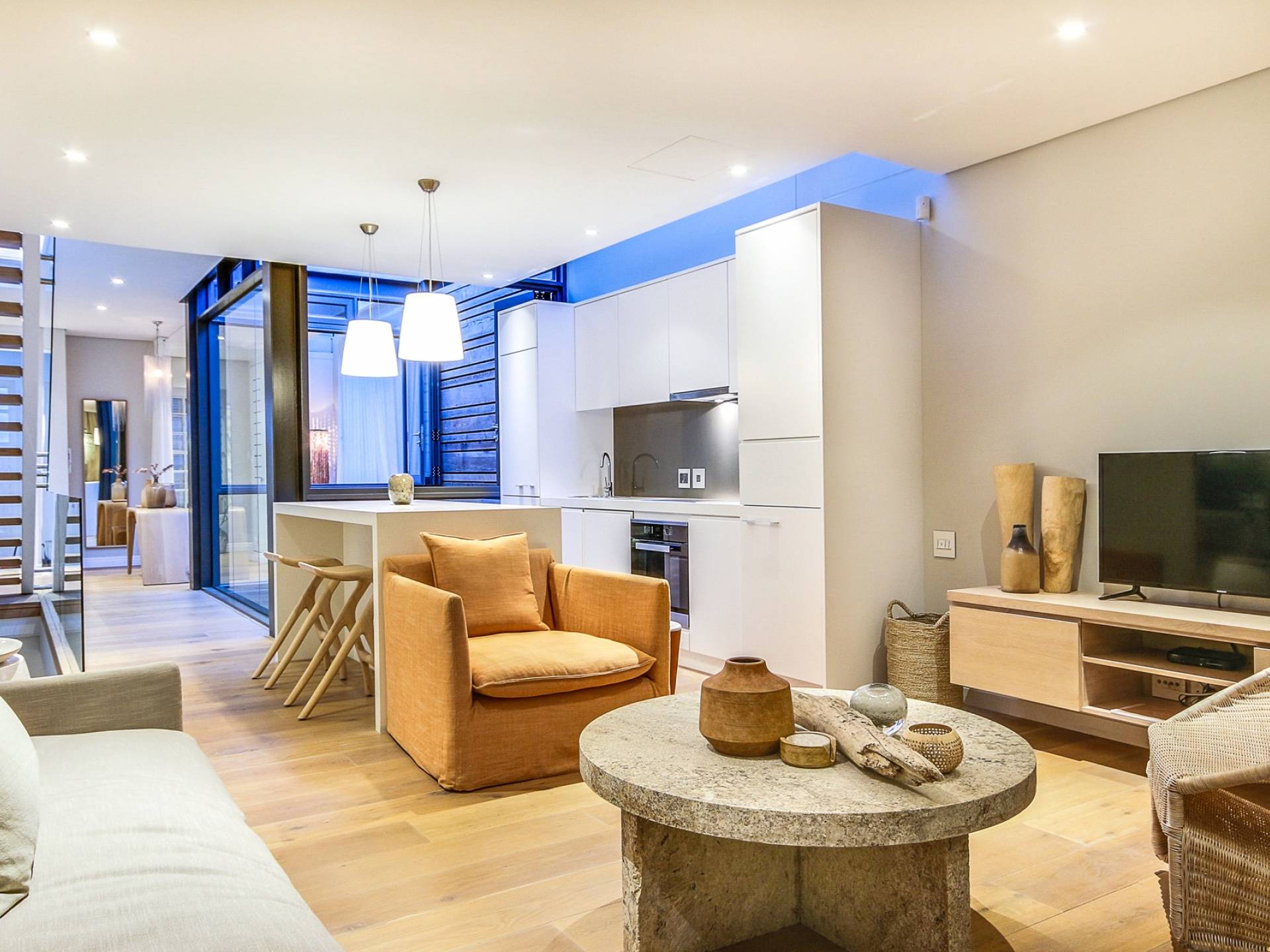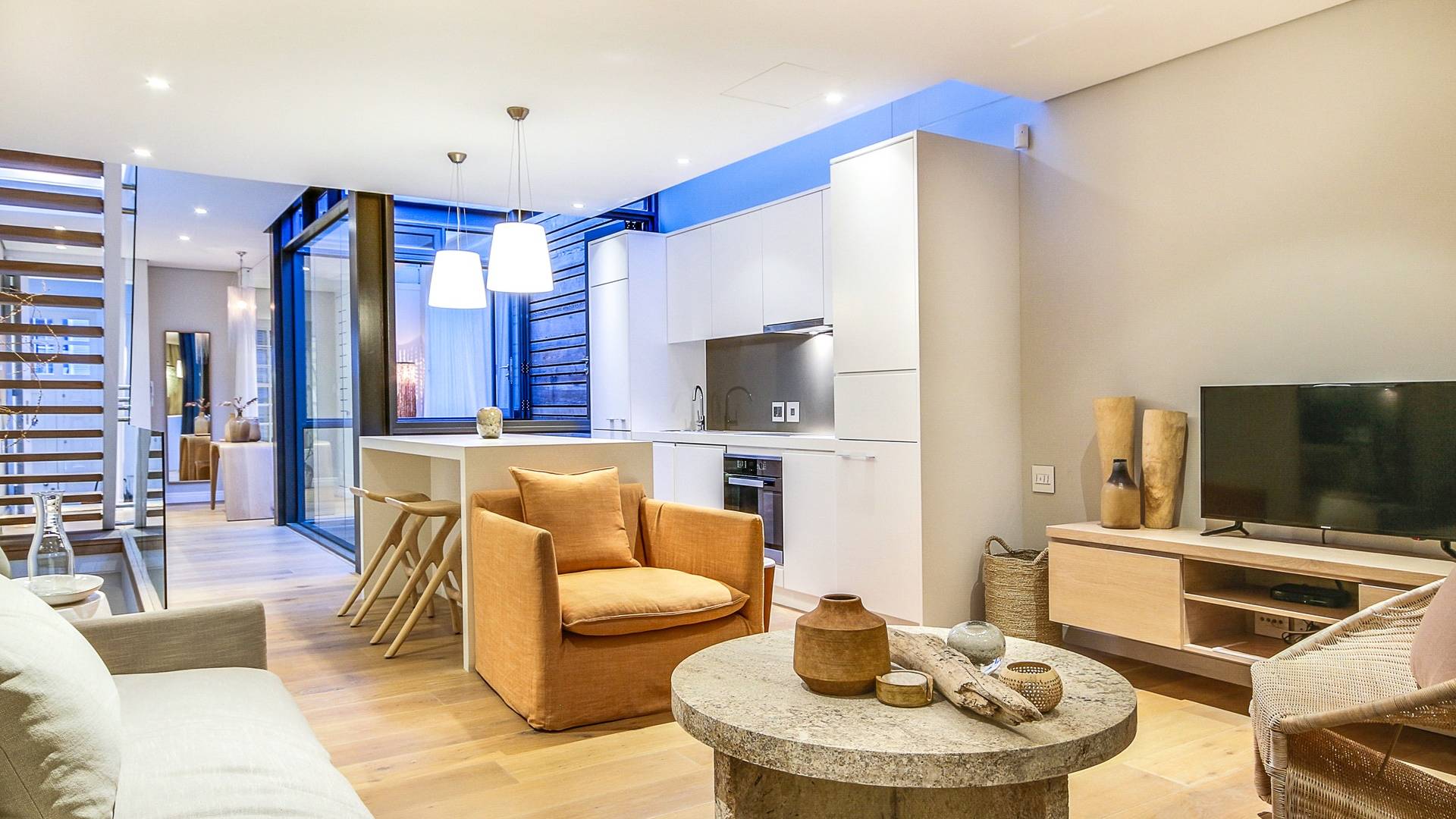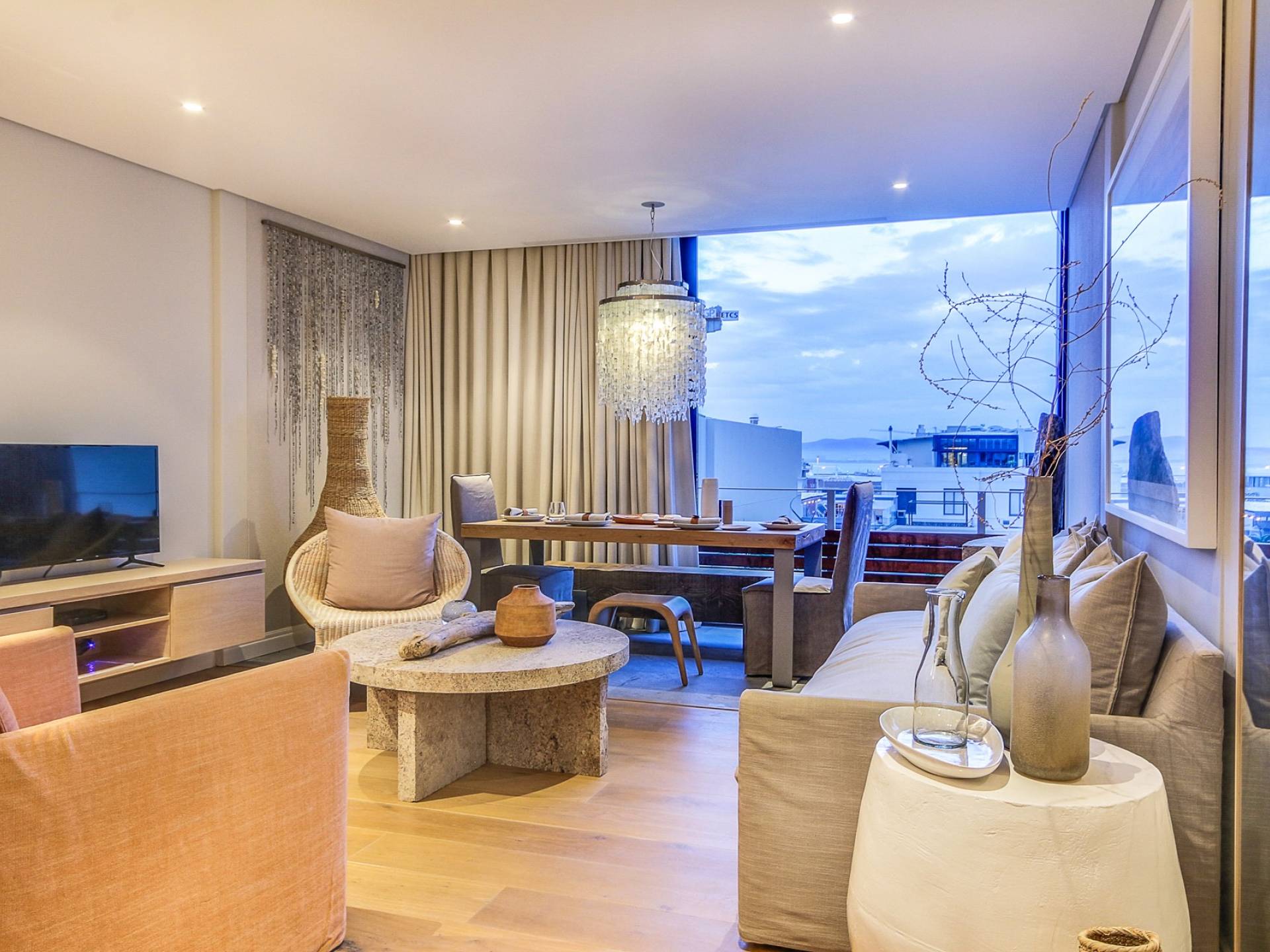 Μέσα στο σαλόνι και την τραπεζαρία υπάρχει ενιαία διαρρύθμιση, προσφέροντας δείπνο για 6 άτομα, πλήρως εξοπλισμένη κουζίνα με μπαρ πρωινού και άνετο σαλόνι τηλεόρασης με δορυφορικά κανάλια. Τα δύο υπνοδωμάτια προσφέρουν και τα δύο κρεβάτια king-size και ιδιωτικό μπάνιο. Το De Waterkant διαθέτει πολλά μπαρ και εστιατόρια, παντοπωλεία και ένα στούντιο γιόγκα. Το V and A Waterfront απέχει μόλις 5 λεπτά και το τελεφερίκ Table Mountain είναι 10 λεπτά μακριά με το αυτοκίνητο.