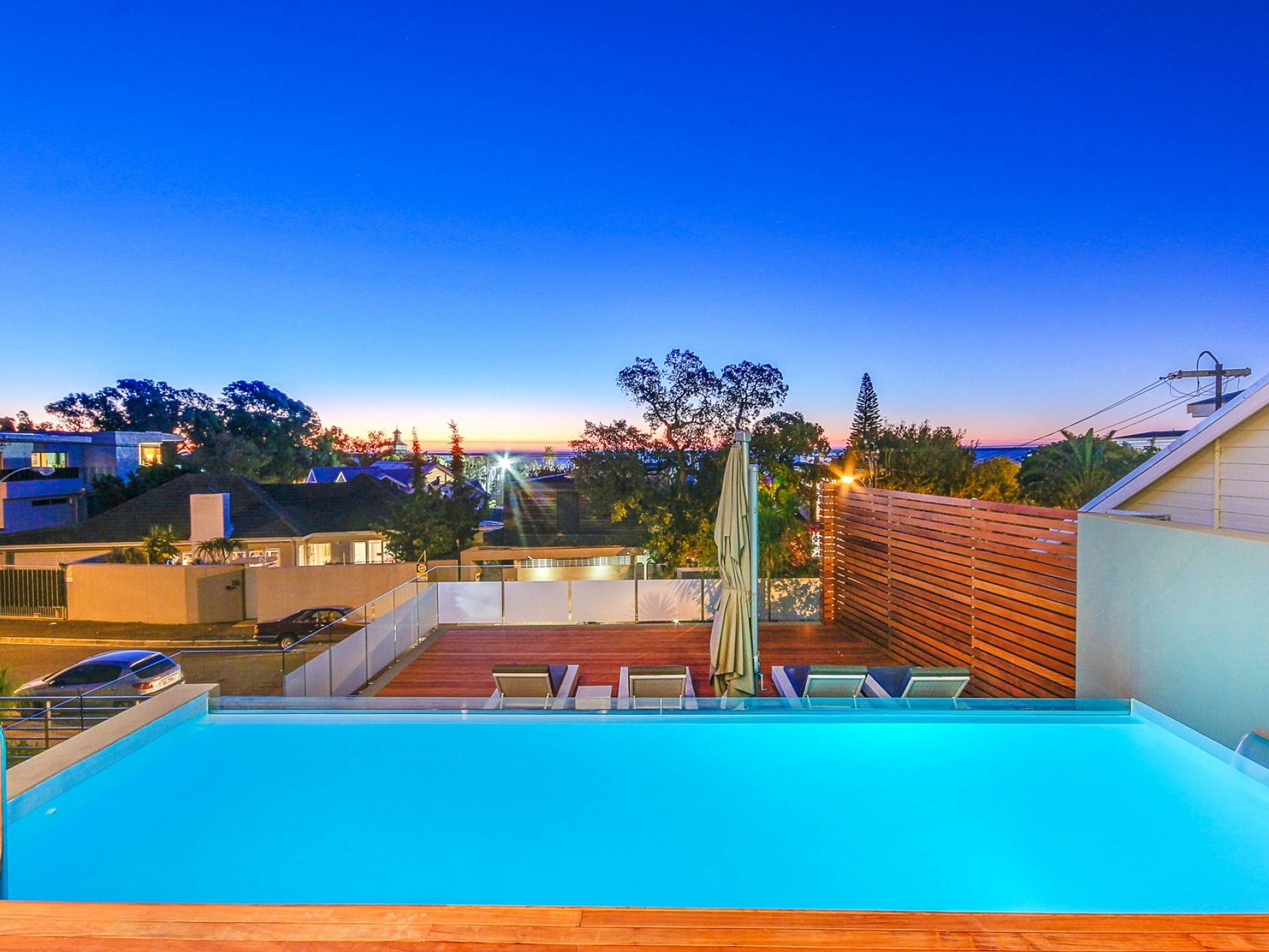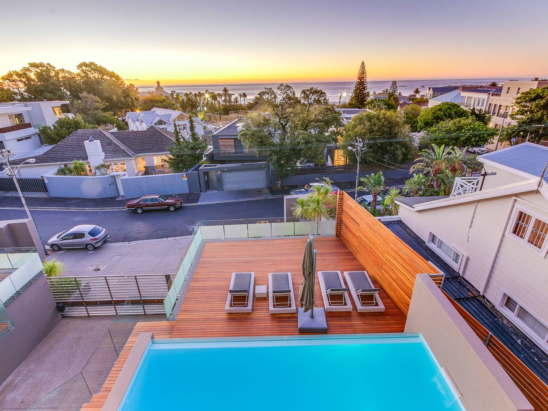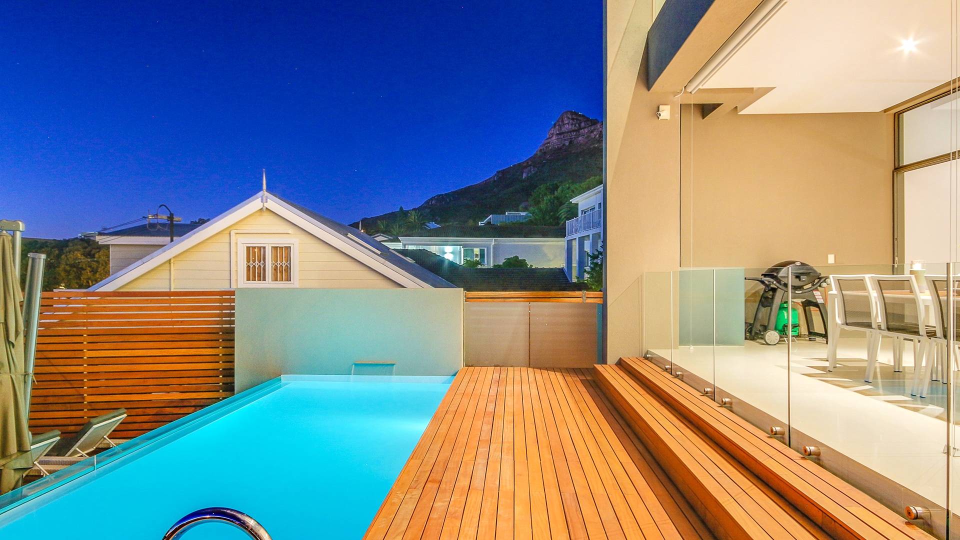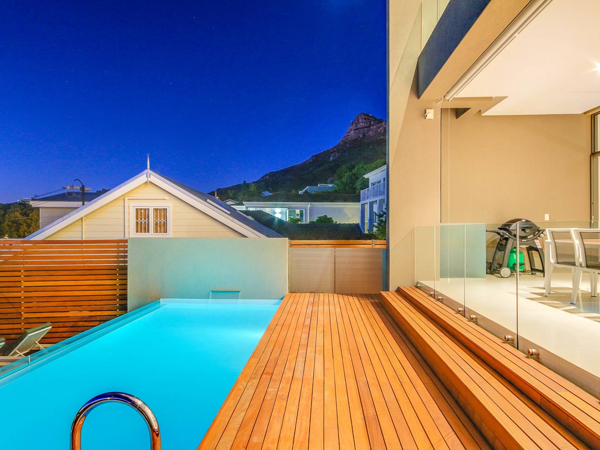 Το κύριο σαλόνι και τραπεζαρία αποτελείται από κουζίνα με δυνατότητα προετοιμασίας γευμάτων, επίσημη τραπεζαρία με χώρο για 10 άτομα, επίσημο σαλόνι και αίθουσα τηλεόρασης. Από το σαλόνι τηλεόρασης, μπορείτε να έχετε πρόσβαση στο αίθριο και στην πισίνα. Βγείτε έξω στο αίθριο όπου μπορείτε να απολαύσετε εκπληκτική θέα στον Ατλαντικό, να κολυμπήσετε στην αφρώδη πισίνα ή απλά να σηκώσετε τα πόδια σας και να χαλαρώσετε σε μια από τις ξαπλώστρες. Υπάρχει επίσης μπάρμπεκιου αερίου στο αίθριο και μπορεί να φιλοξενήσει 10 άτομα, ώστε να μπορείτε να δειπνήσετε στο ύπαιθρο. Το μεγάλο υπνοδωμάτιο διαθέτει κρεβάτι king size, ιδιωτικό μπάνιο, τηλεόραση με DSTV και συρόμενες πόρτες σε ιδιωτικό μπαλκόνι. Τα υπόλοιπα 3 υπνοδωμάτια έχουν διπλά κρεβάτια και ιδιωτικό μπάνιο. Αυτή η βίλα βρίσκεται σε μικρή απόσταση με τα πόδια από την παραλία Camps Bay, καθώς και από το διάσημο εστιατόριο Camps Bay.