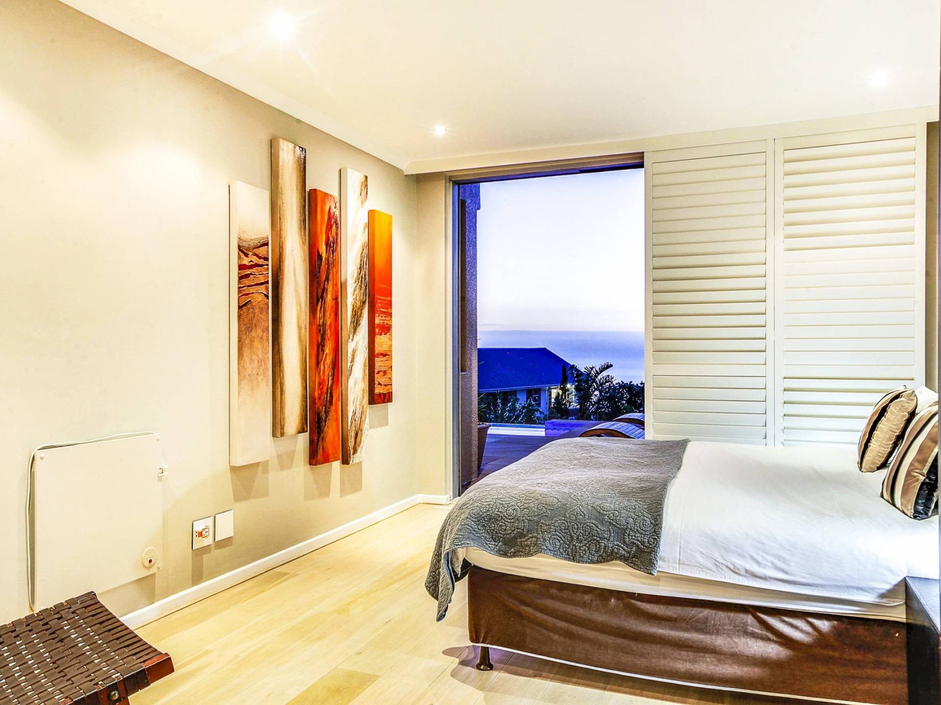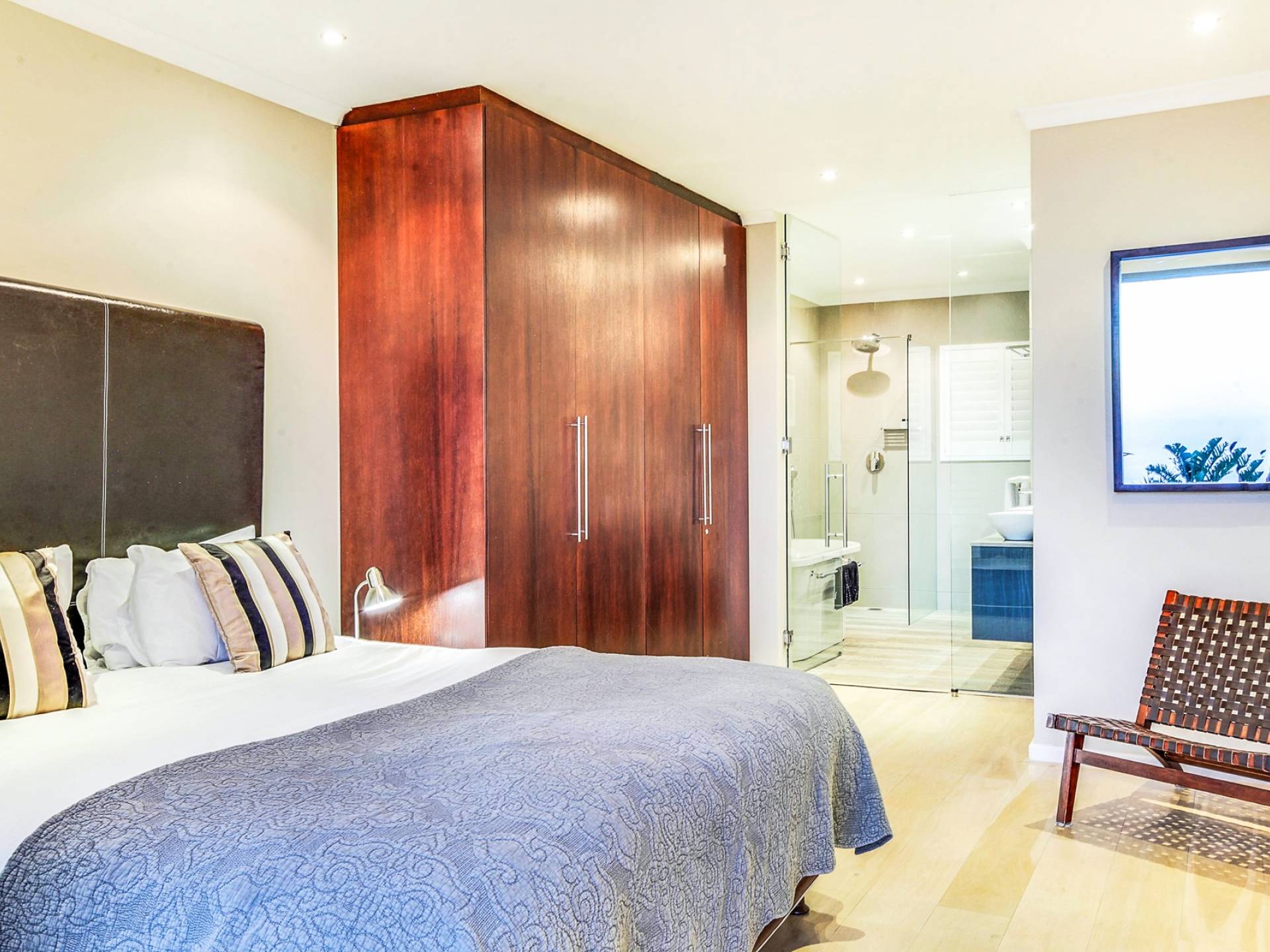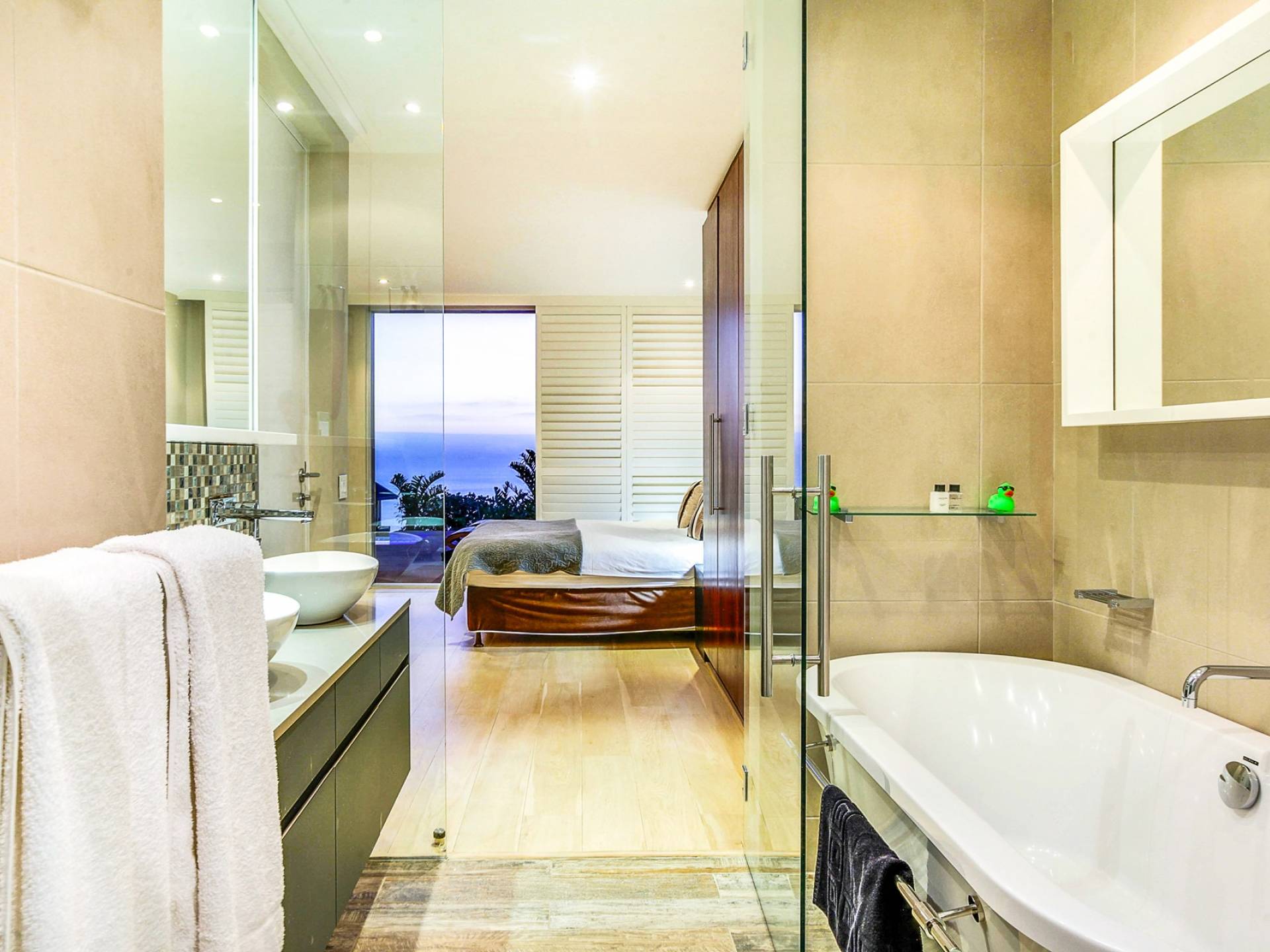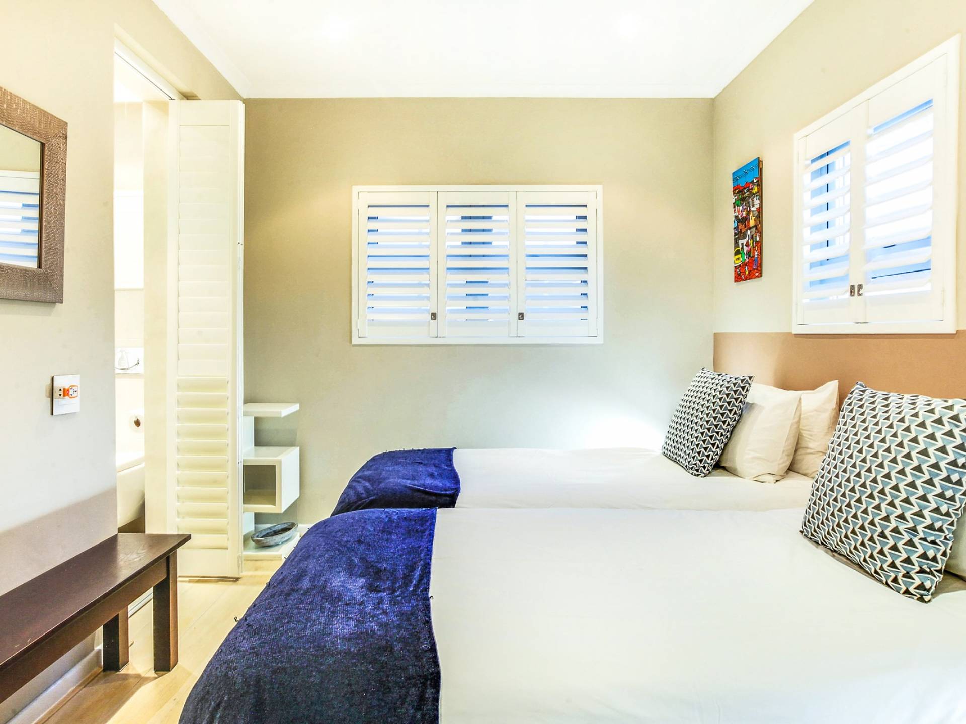 Το κυρίως υπνοδωμάτιο διαθέτει κρεβάτι king size, άφθονο ντουλάπι και ιδιωτικό μπάνιο. Το μπάνιο είναι εξοπλισμένο με ευρύχωρο ντους, μπανιέρα και δύο νιπτήρες. Το δεύτερο υπνοδωμάτιο έχει δύο μονά κρεβάτια, τα οποία μπορούν να μετατραπούν σε king και διαθέτει επίσης ιδιωτικό μπάνιο με ντους. Το σαλόνι και η κουζίνα είναι ενιαίας διαρρύθμισης και οδηγούν στο αίθριο. Η κουζίνα είναι εξοπλισμένη με όλα τα απαραίτητα αντικείμενα. Το σαλόνι διαθέτει τηλεόραση επίπεδης οθόνης και βάση σύνδεσης για iPod και τραπέζι φαγητού για 5.