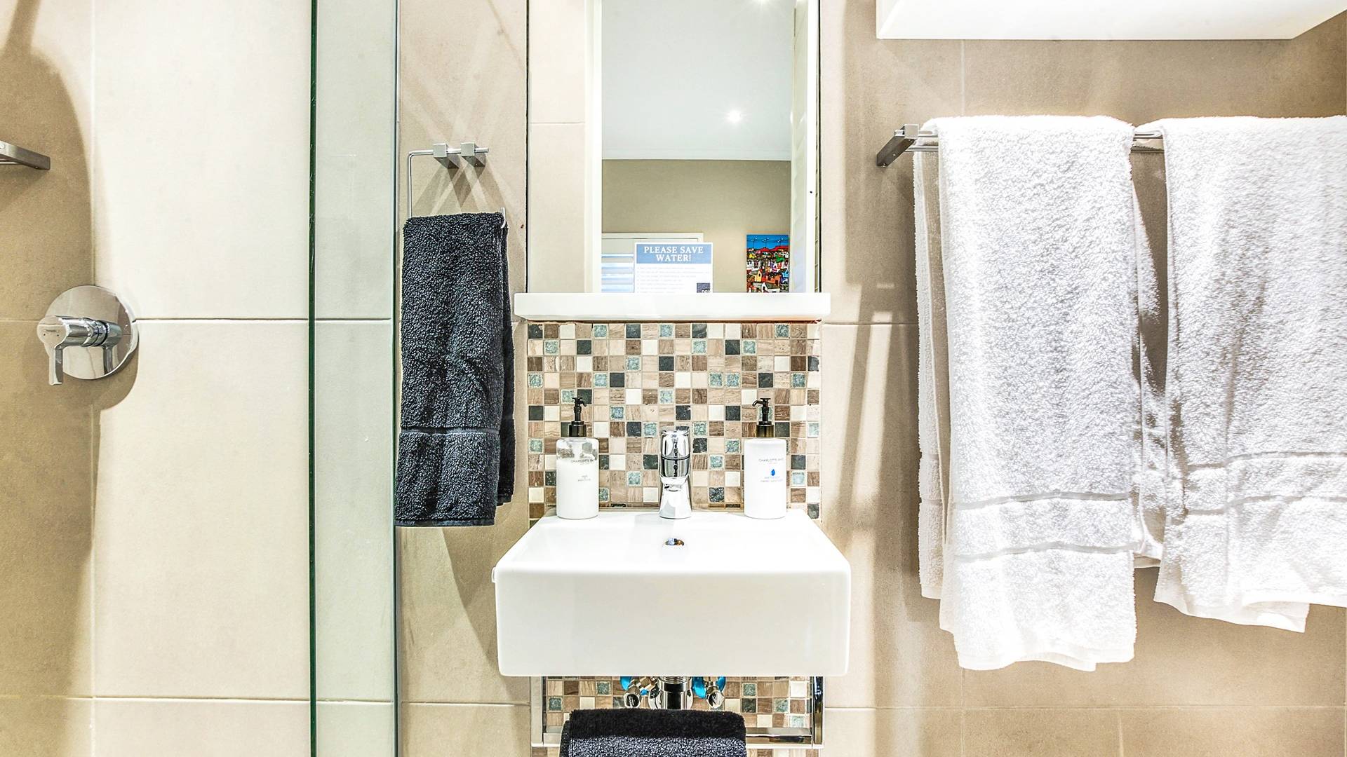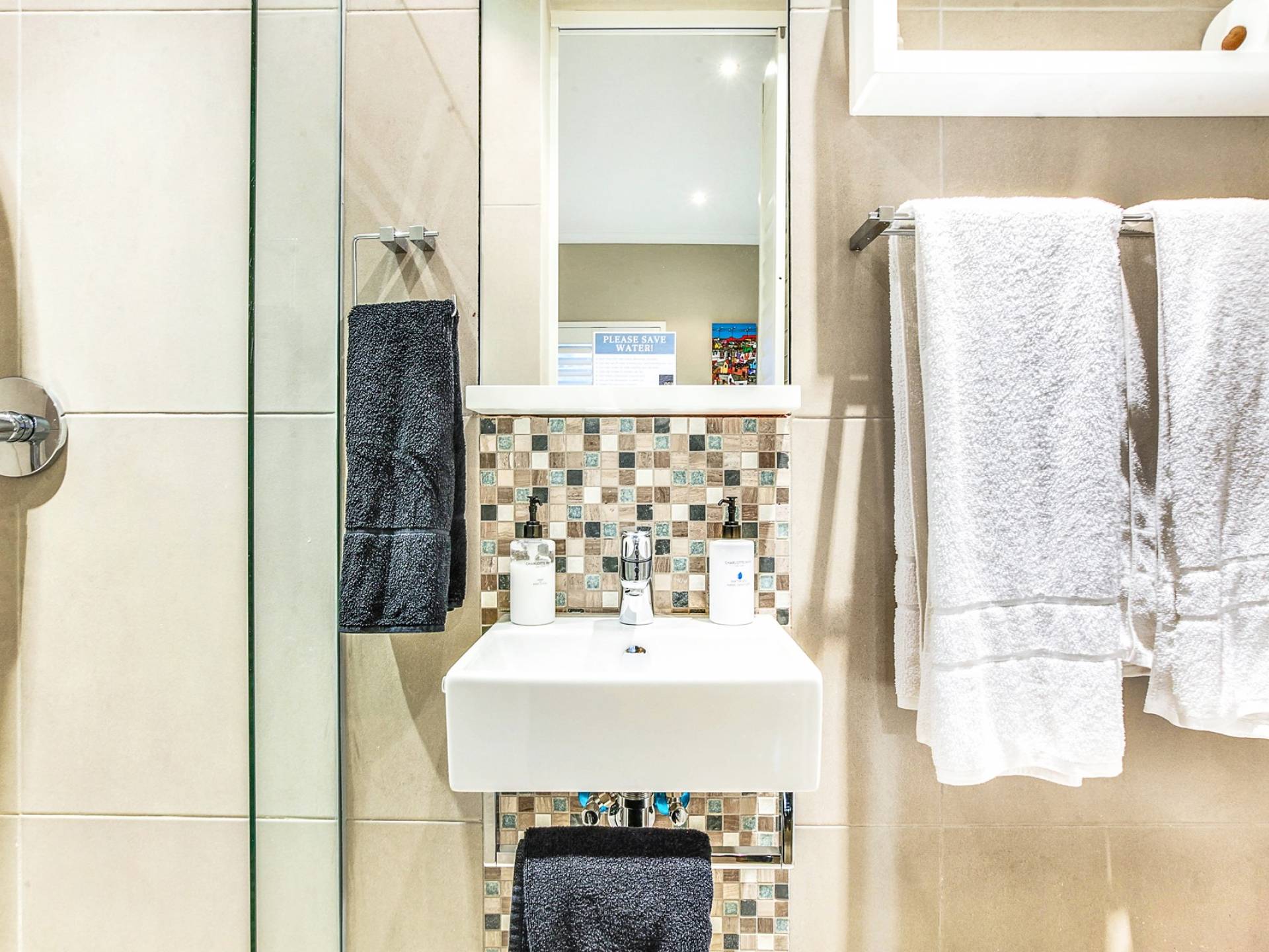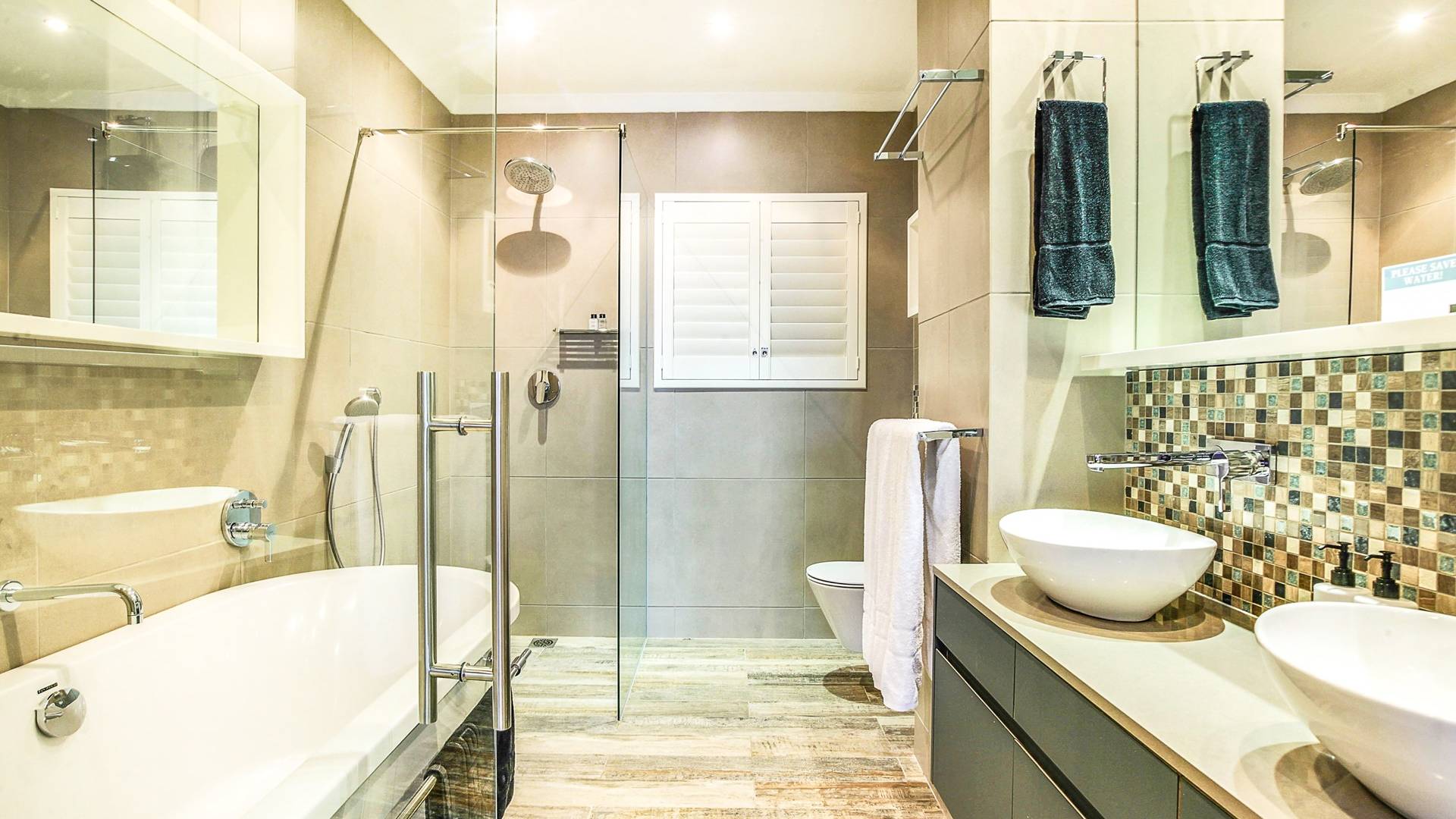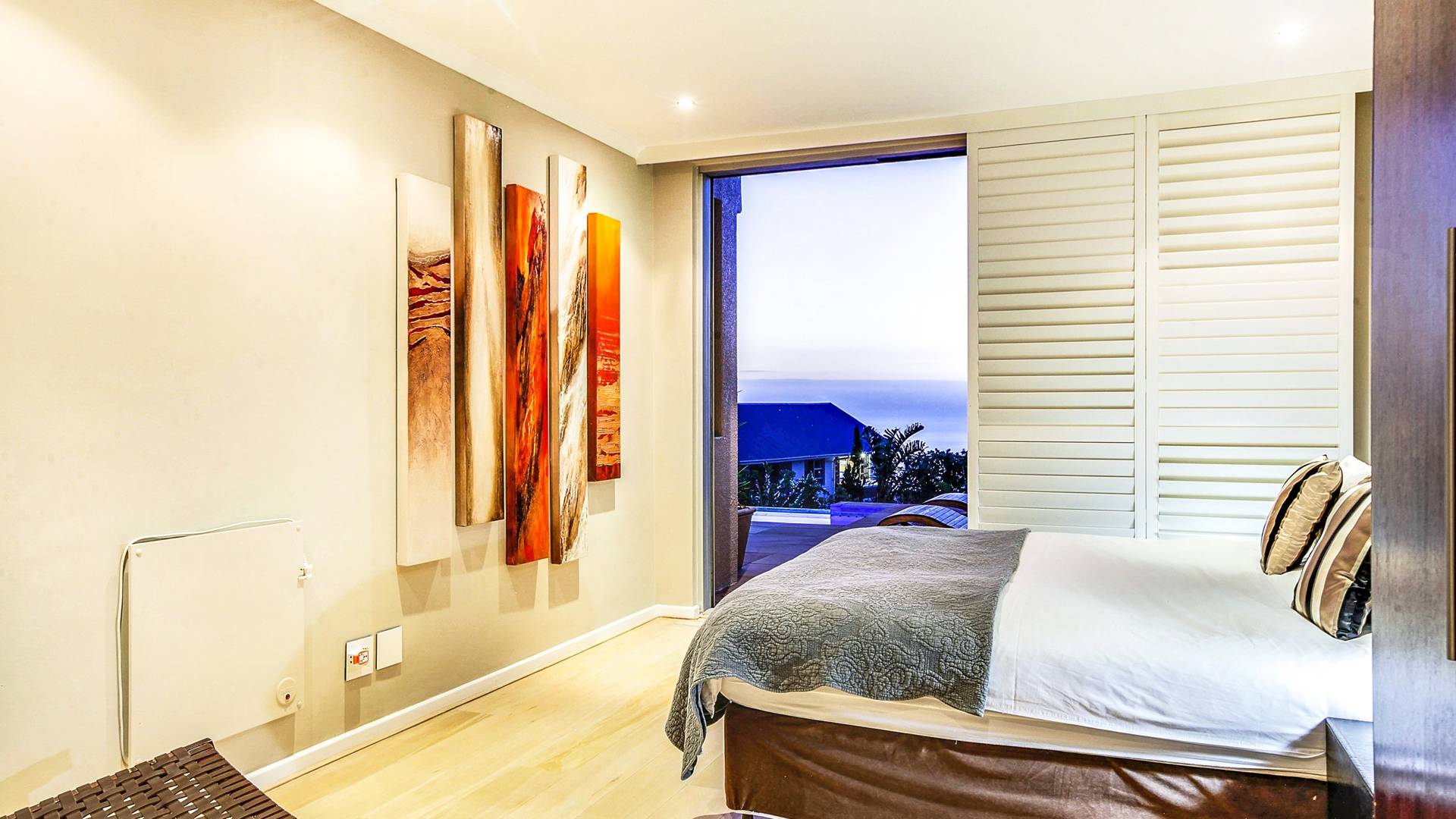 Το κυρίως υπνοδωμάτιο διαθέτει κρεβάτι king size, άφθονο ντουλάπι και ιδιωτικό μπάνιο. Το μπάνιο είναι εξοπλισμένο με ευρύχωρο ντους, μπανιέρα και δύο νιπτήρες. Το δεύτερο υπνοδωμάτιο έχει δύο μονά κρεβάτια, τα οποία μπορούν να μετατραπούν σε king και διαθέτει επίσης ιδιωτικό μπάνιο με ντους. Το σαλόνι και η κουζίνα είναι ενιαίας διαρρύθμισης και οδηγούν στο αίθριο. Η κουζίνα είναι εξοπλισμένη με όλα τα απαραίτητα αντικείμενα. Το σαλόνι διαθέτει τηλεόραση επίπεδης οθόνης και βάση σύνδεσης για iPod και τραπέζι φαγητού για 5.