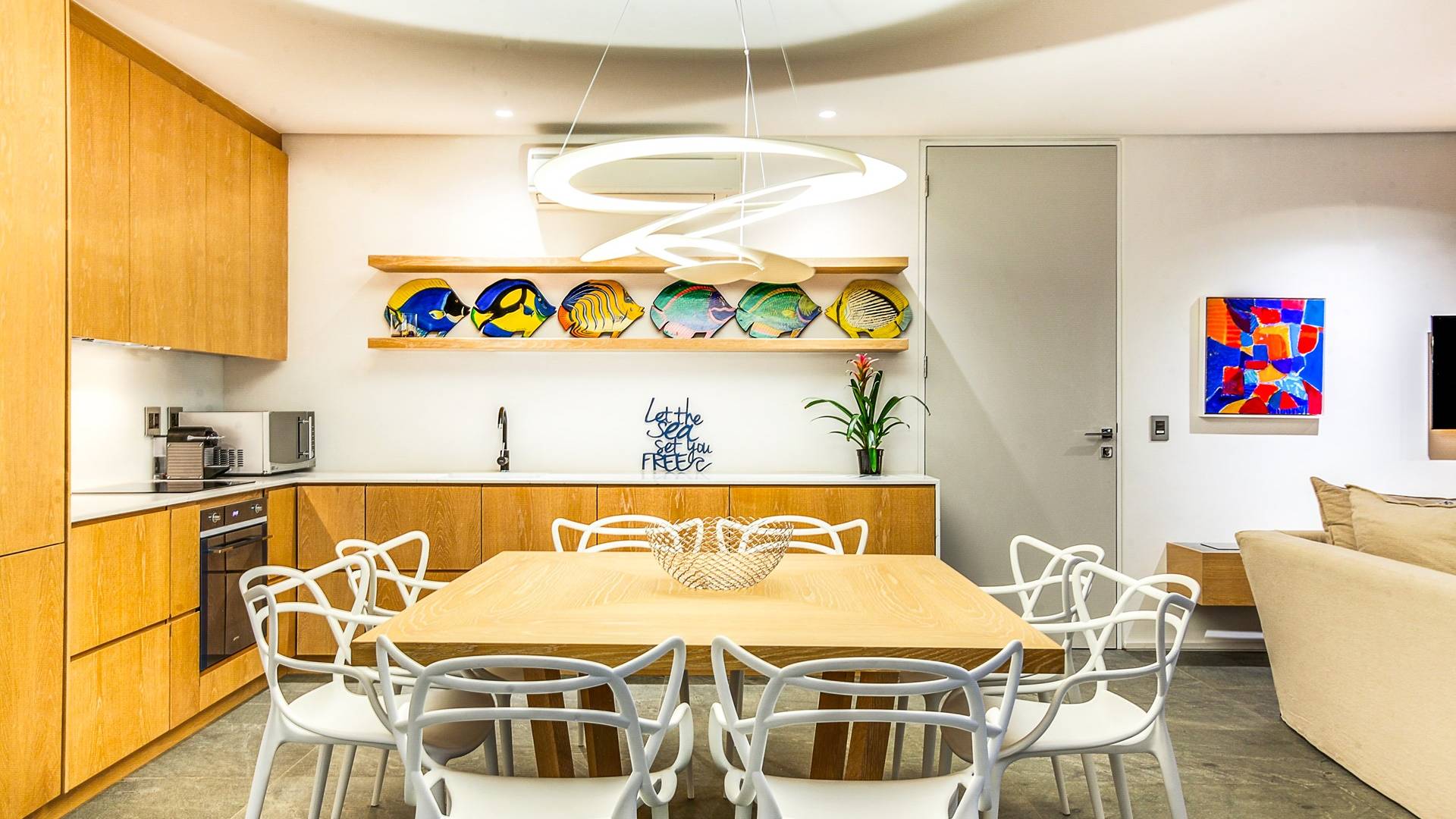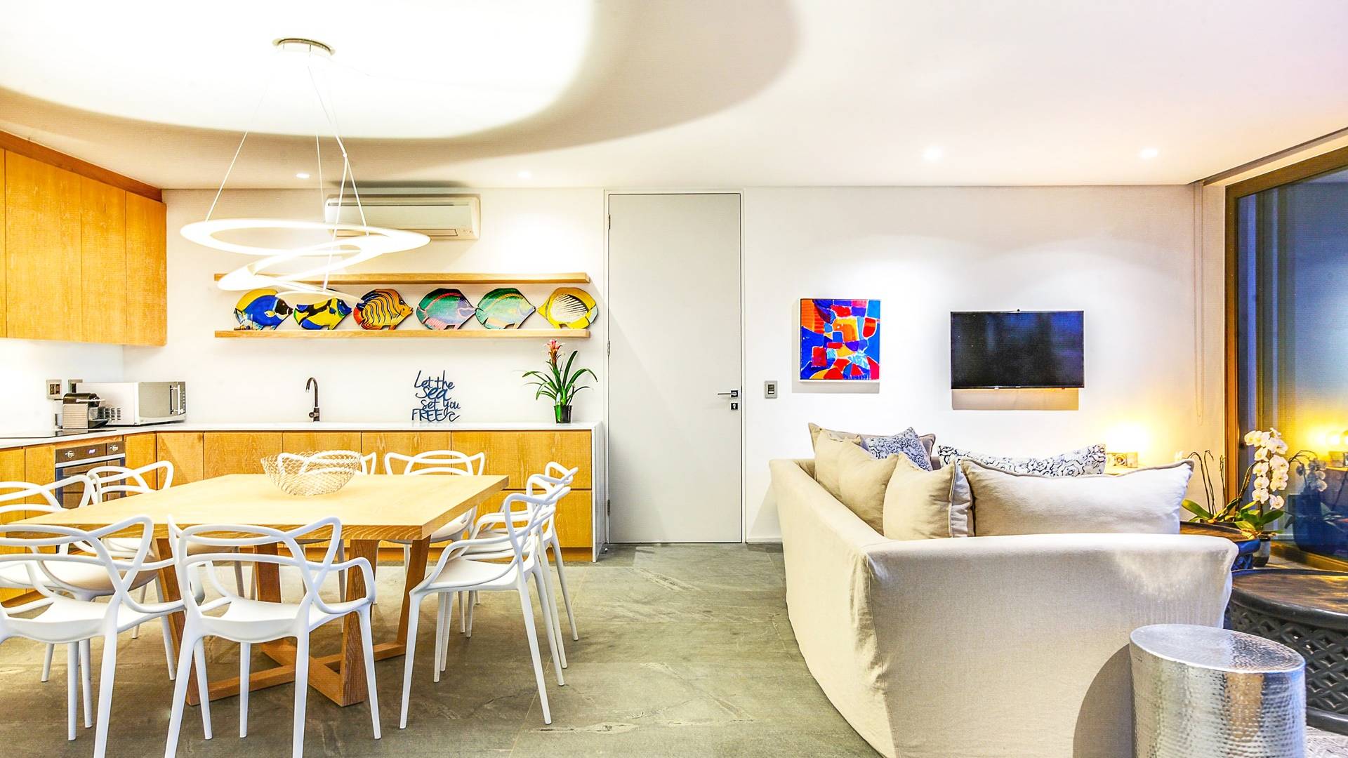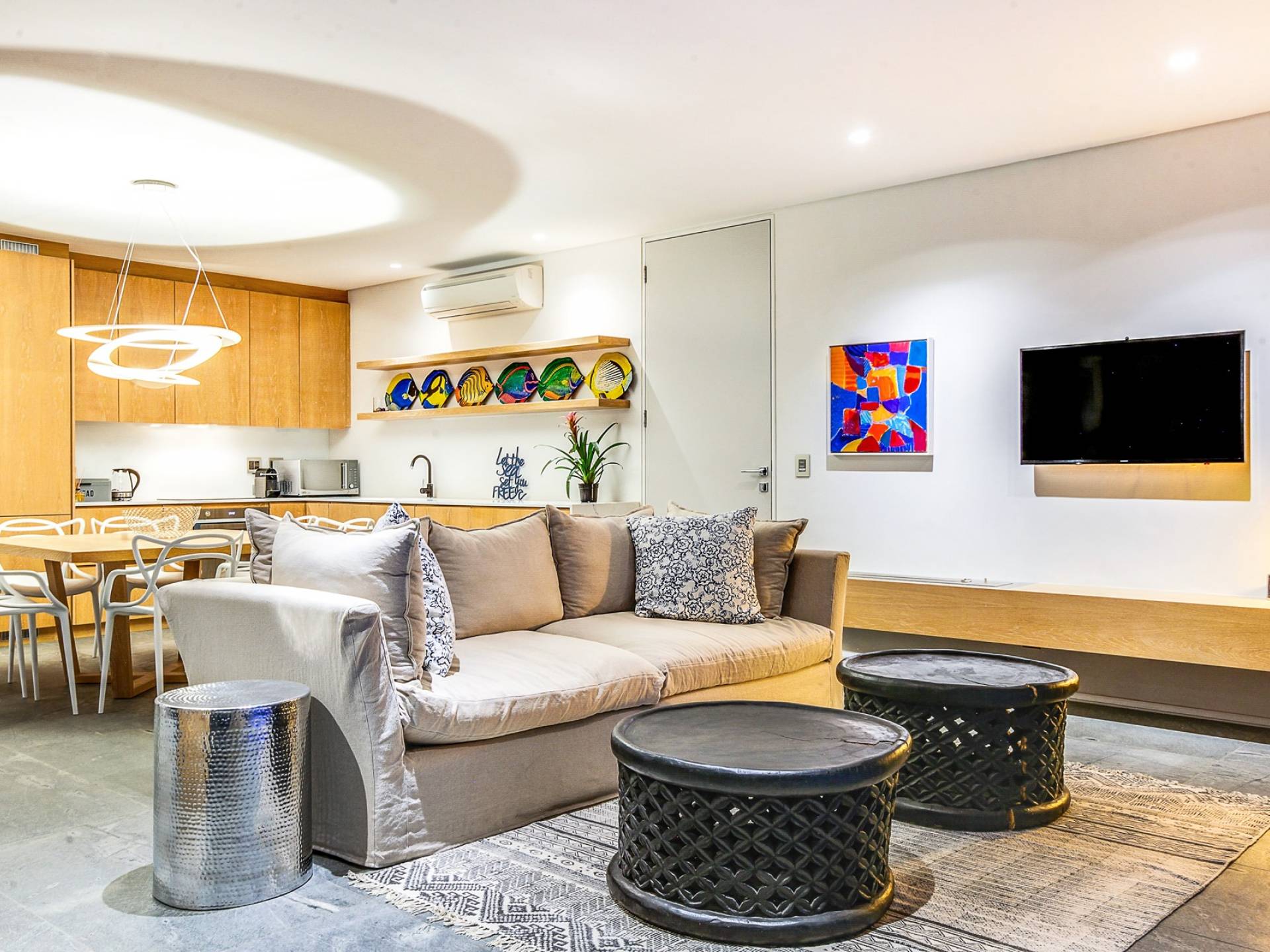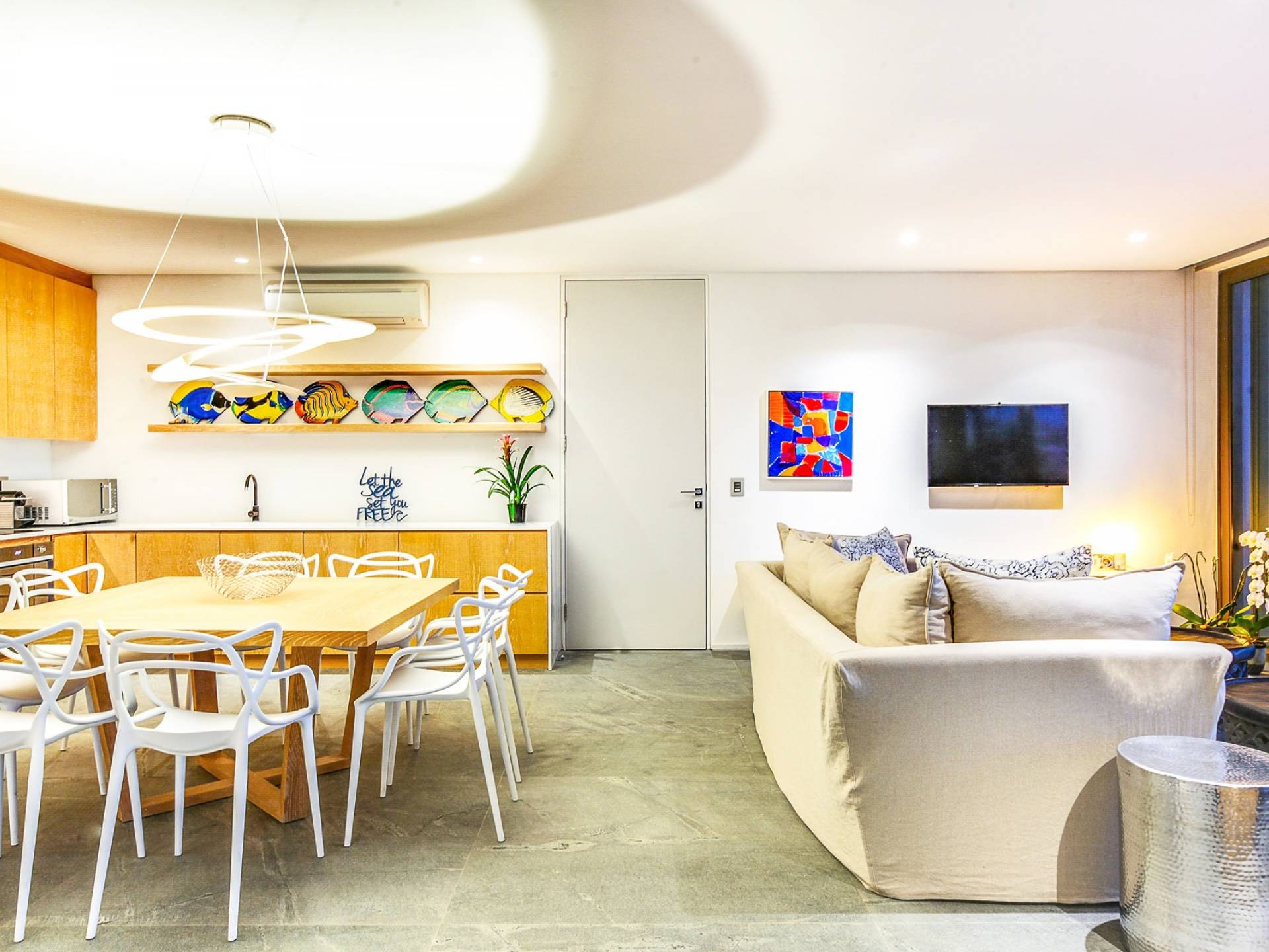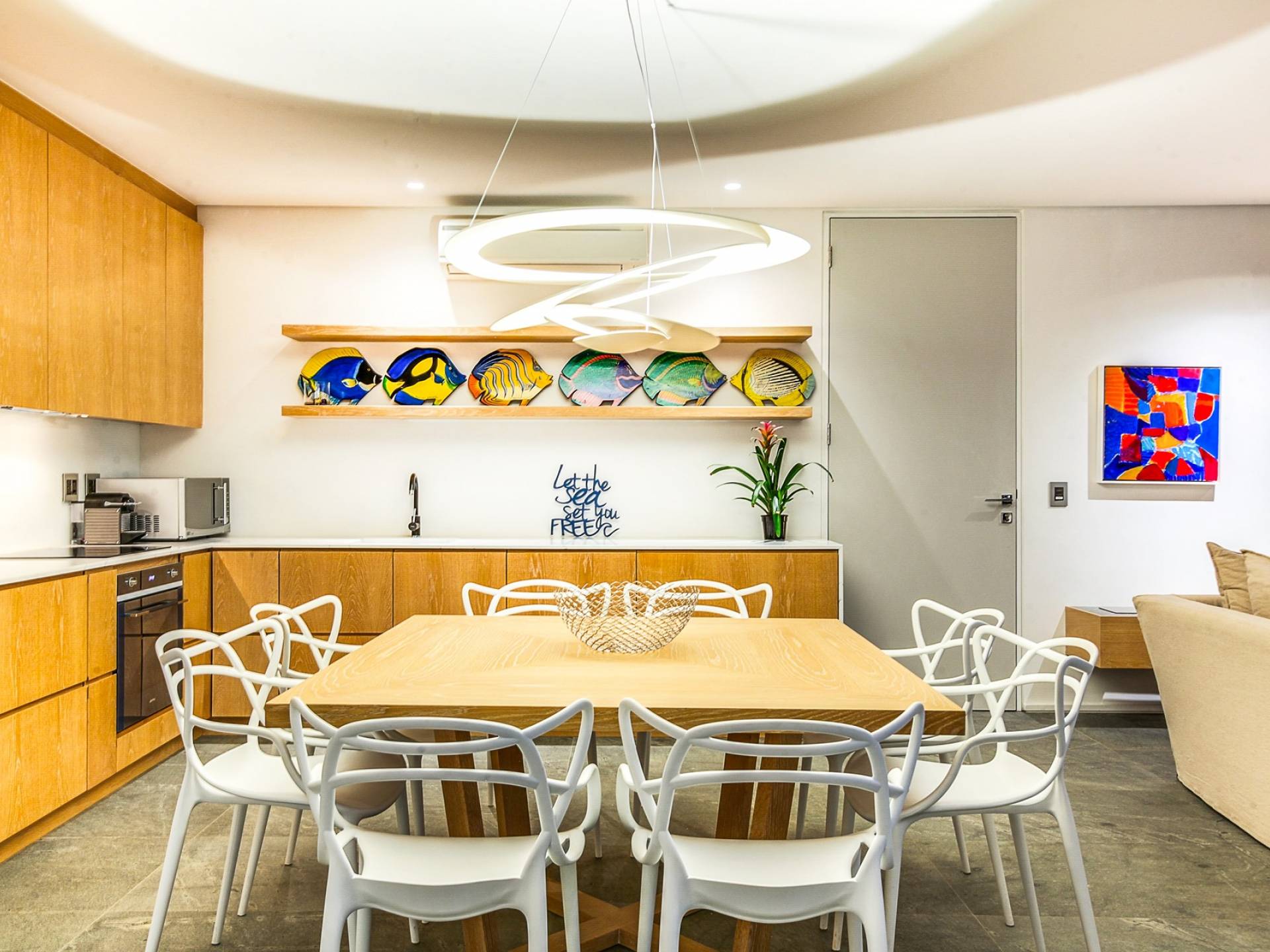 Καθώς μπαίνετε από την ηλεκτρική πύλη ασφαλείας υπάρχει χώρος στάθμευσης για 2 μικρά αυτοκίνητα. Η μπροστινή είσοδος στο ισόγειο ανοίγει στο φωτεινό ενιαίο σαλόνι/τραπεζαρία και κουζίνα που είναι πλήρως εξοπλισμένα. Η τραπεζαρία έχει καθίσματα για 8 άτομα και το άνετο καθιστικό του σαλονιού έχει χώρο για 3. Υπάρχουν γυάλινα παράθυρα και πόρτες από το δάπεδο μέχρι την οροφή που οδηγούν σε ένα μικρό κατάστρωμα με καθίσματα σαλονιού και πισίνα. Το δεύτερο υπνοδωμάτιο με ιδιωτικό μπάνιο βρίσκεται στο ισόγειο του σπιτιού και έχει πρόσβαση στο κοινόχρηστο κατάστρωμα με το σαλόνι.
