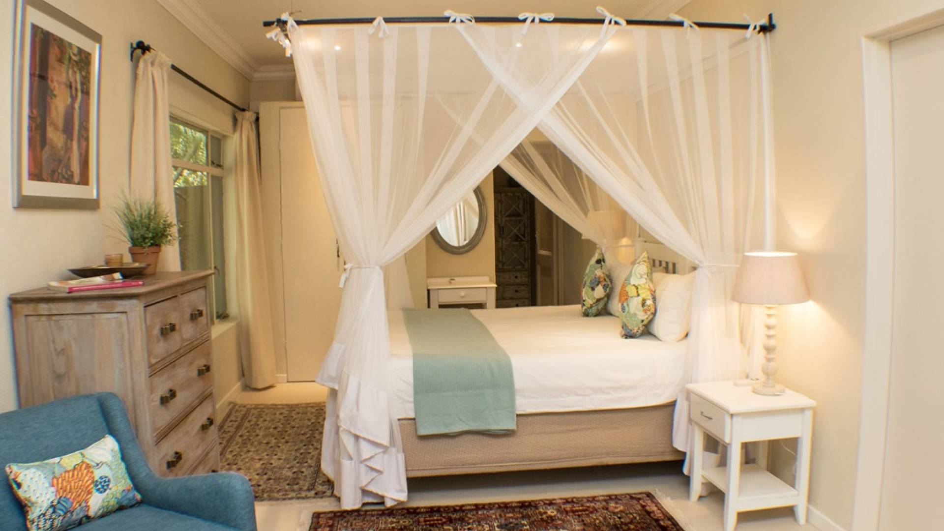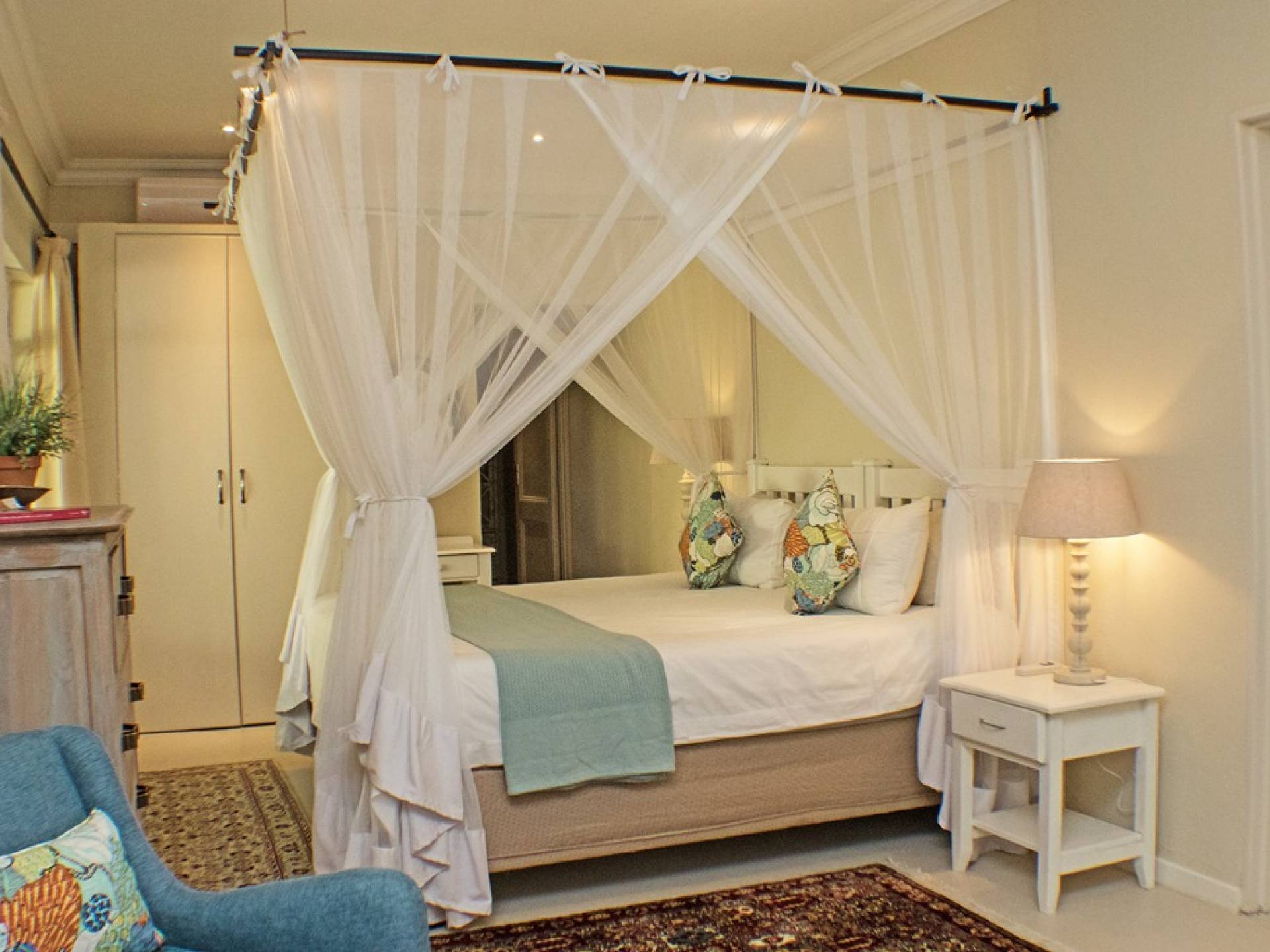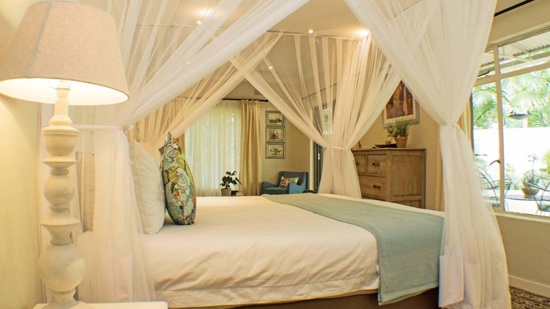 Το Garden Suite VI είναι μια όμορφη και ευρύχωρη σουίτα, μία από τις πιο πρόσφατες επιλογές διαμονής στο Khaya Ndlovu. Δροσερά μπλουζ και λουλούδια θέτουν την τάση σε αυτήν την κομψή νέα προσθήκη. Το υπνοδωμάτιο ανοίγει σε μια αυλή, ένα ιδιωτικό μπάνιο με όλες τις ανέσεις. Μια σουίτα είναι μια εξαιρετική επιλογή αν θέλετε να χαλαρώσετε με απόλυτη ιδιωτικότητα. Σελ