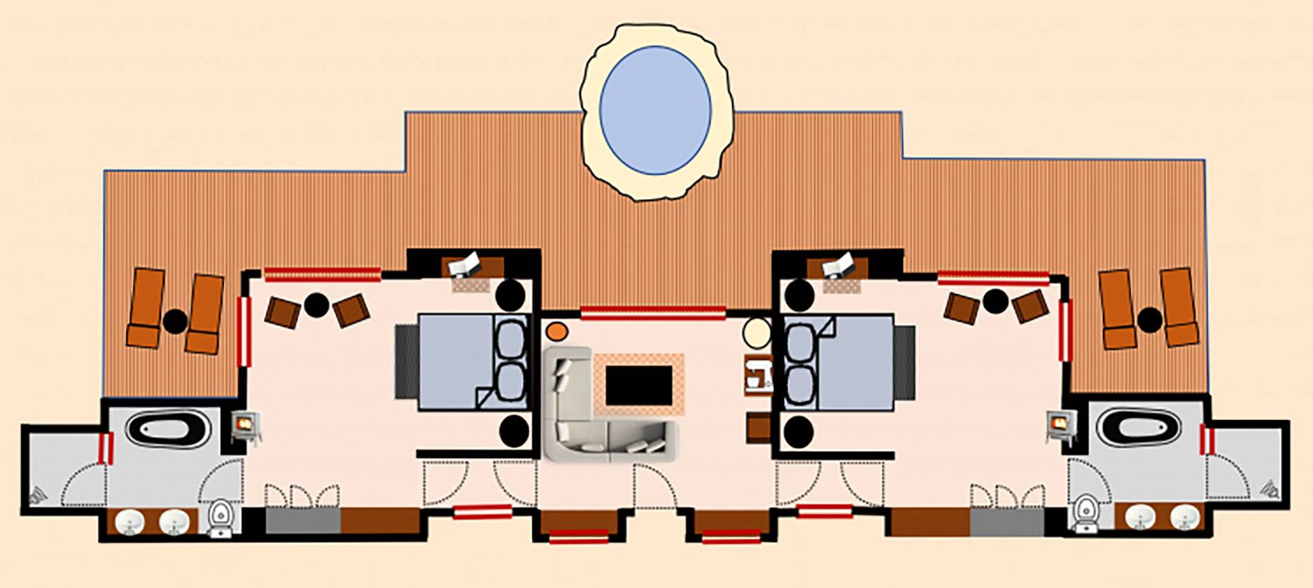 Η πολυτελής οικογενειακή σουίτα διαθέτει 2 ξεχωριστούς κοιτώνες που διαθέτουν κρεβάτι king size ή 2 μονά κρεβάτια με κουνουπιέρα (κουρτίνα), δυνατότητα προσθήκης κρεβατιού (κρεβατάκι) για ένα παιδί έως 15 ετών, πλήρες ιδιωτικό μπάνιο με εσωτερικό και εξωτερικό χώρο ντους και μπανιέρα, καφετιέρα Nespresso με τσάι και καφέ, μίνι μπαρ ψυγείο, μίνι χρηματοκιβώτιο, κρεμάστρες, στεγνωτήρα μαλλιών, κλιματισμός με κλιματισμό, τζάκι Morso, ιδιωτικό κατάστρωμα με 2 ξαπλώστρες, ιδιωτική μικρή πισίνα, σύνδεση Wi-Fi στο Internet, διεθνής πρίζα , και προσαρμογείς. Δυνατότητα προσθήκης κρεβατιών (κρεβατιών) για 2 παιδιά έως 15 ετών, πλήρες ιδιωτικό μπάνιο για κάθε κοιτώνα με εξωτερικό χώρο, ντους και μπανιέρα (χωρίς εσωτερικό ντους), κοινόχρηστο σαλόνι, ξεχωριστές πόρτες εισόδου σε κοιτώνες από το σαλόνι, κοινόχρηστο ιδιωτικό κατάστρωμα με 4 ξαπλώστρες και κοινόχρηστη ιδιωτική μικρή πισίνα.