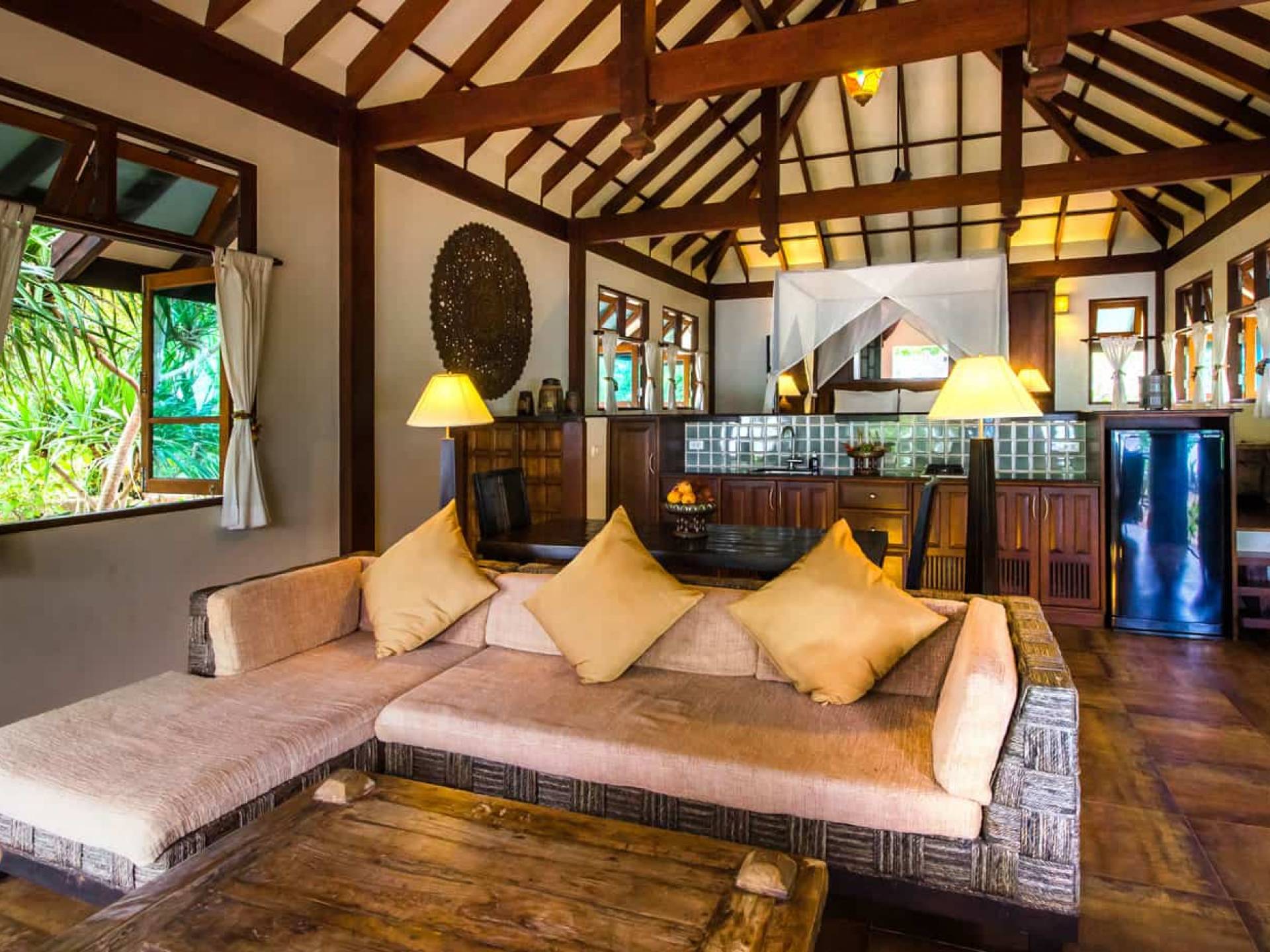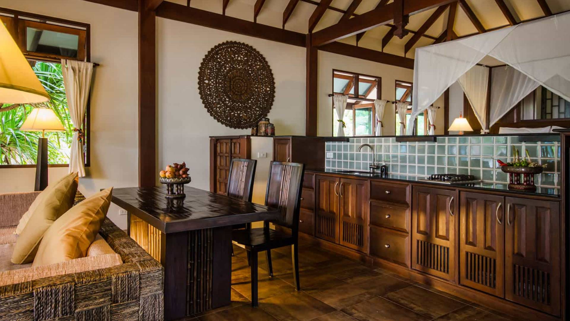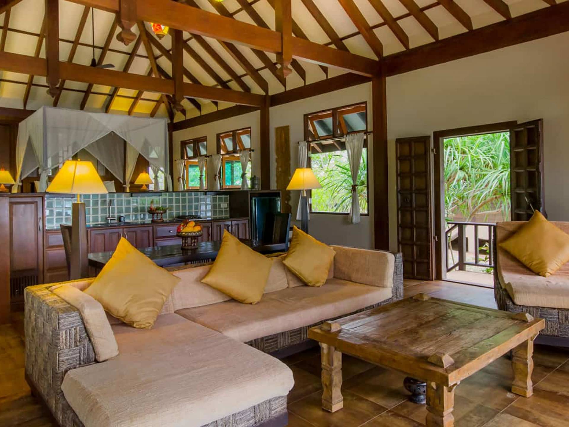 Ο κύριος χώρος καθιστικού διαθέτει επίσης πλήρως εξοπλισμένη κουζίνα με τραπέζι φαγητού και το σαλόνι βρίσκεται μπροστά από τη βίλα με θέα προς το Koh Phi Phi με εκπληκτικά ηλιοβασιλέματα, καθιστώντας το ιδανικό μέρος για δροσιστικά ποτά στο ηλιοβασίλεμα την ιδιωτική βεράντα.