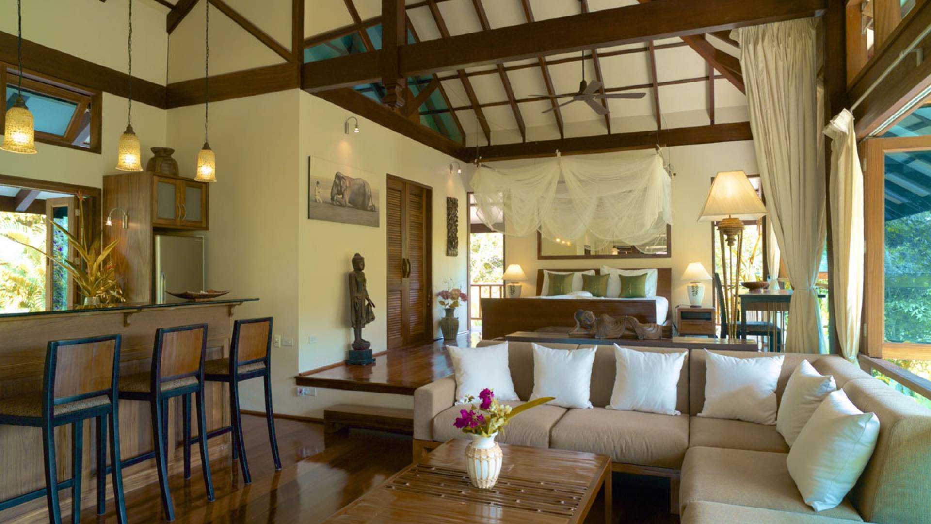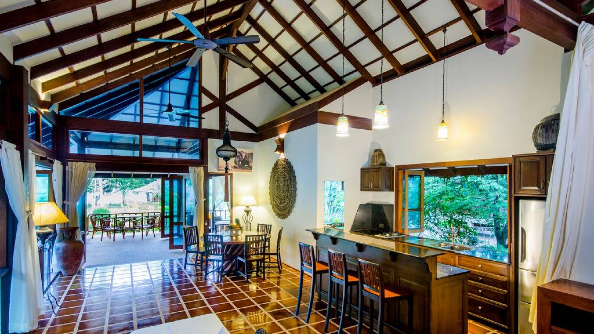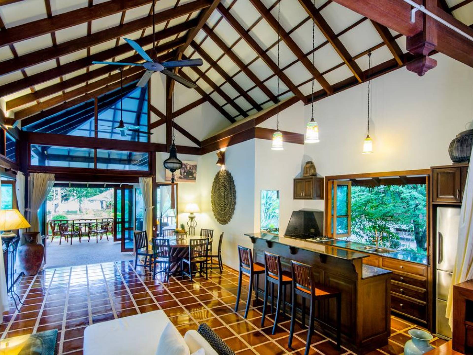 Το κύριο σαλόνι διαθέτει επίσης μια πλήρως εξοπλισμένη κουζίνα με τραπέζι φαγητού και ο χώρος διαβίωσης είναι δίπλα με υπέροχη θέα στον κήπο. Οι δύο ιδιωτικές βεράντες της βίλας προσφέρουν υπέροχη θέα στη φυσική χλωρίδα και πανίδα του θέρετρου, ενώ η μπροστινή βεράντα προσφέρει επίσης θέα στη θάλασσα.
