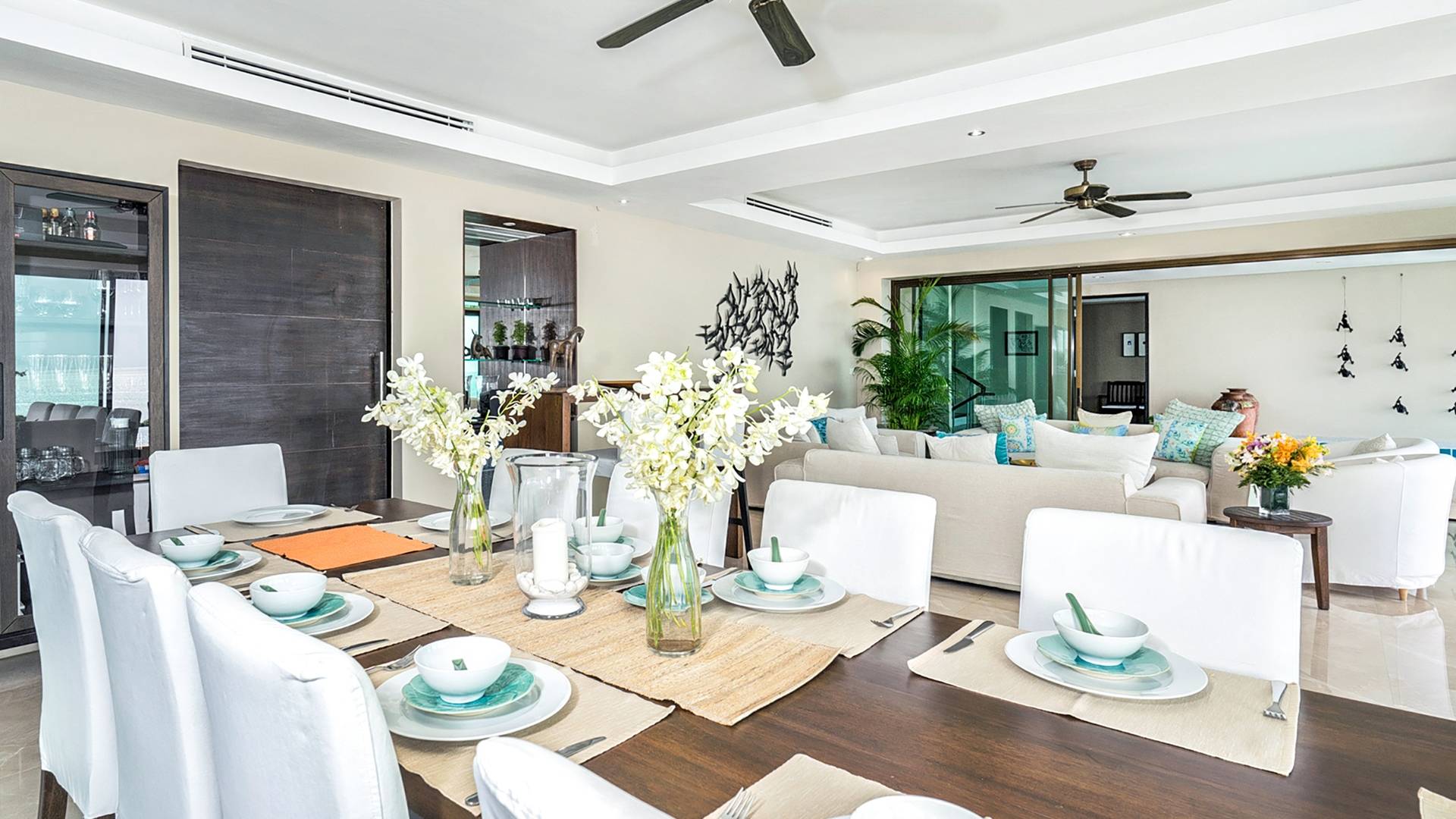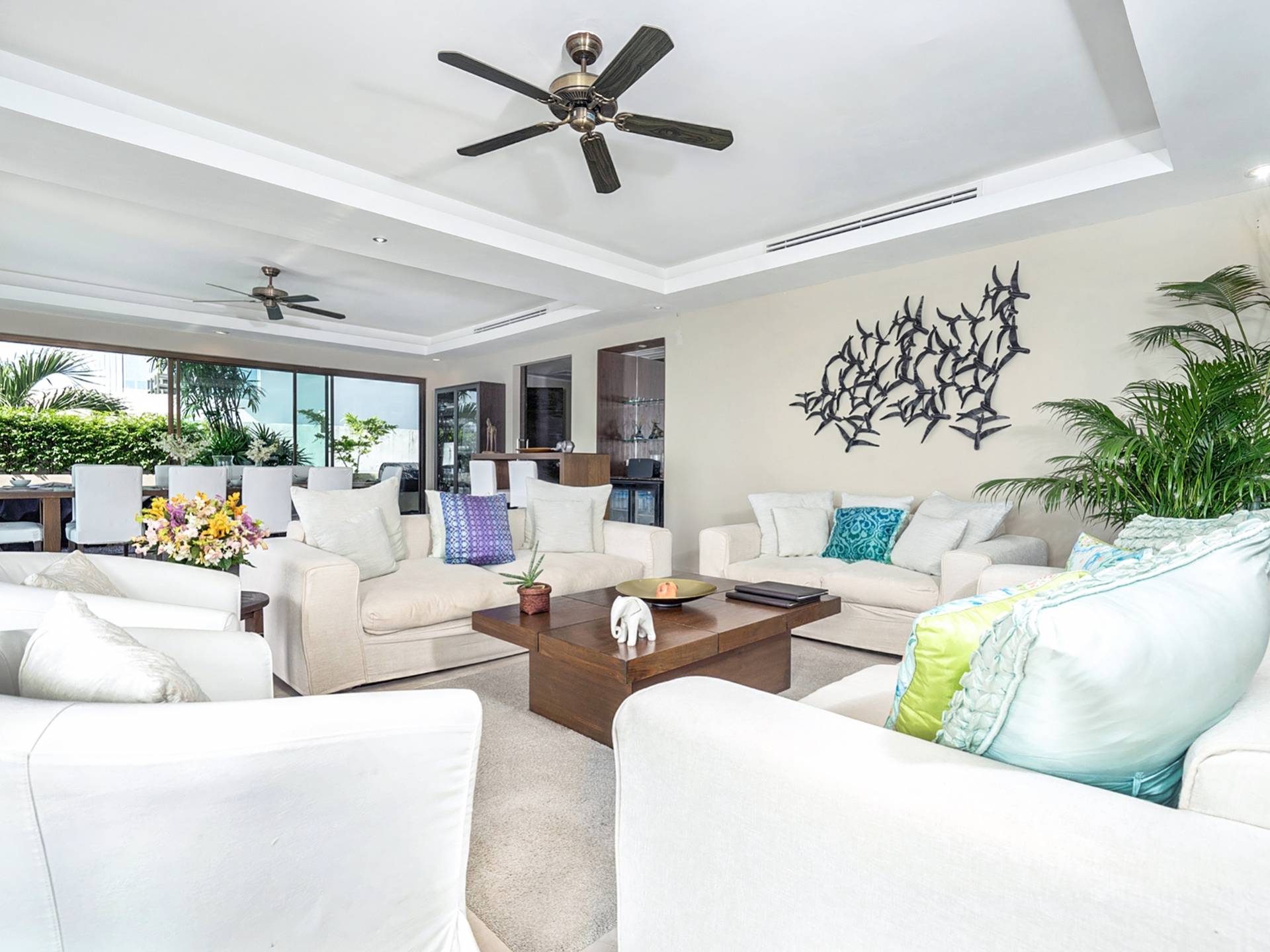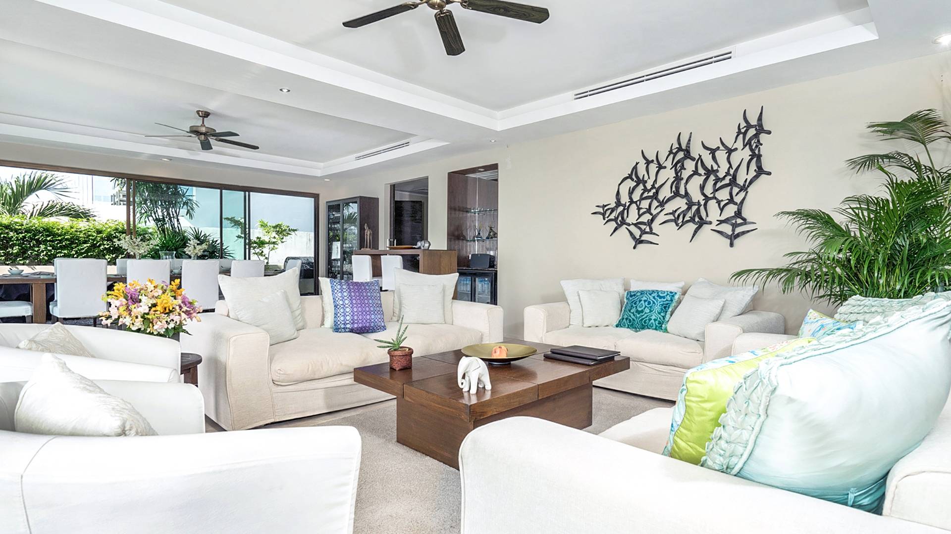 Η πρόσβαση στη βίλα γίνεται μέσω μιας υπέροχης λίμνης koi γεμάτη κρίνους και εξωτικά φυτά. Μόλις μπείτε μέσα, ξεδιπλώνεται μια εντυπωσιακή θέα της πισίνας υπερχείλισης και της ακτογραμμής. Εδώ, θα βρείτε ένα φωτεινό και ευρύχωρο σαλόνι με μαρμάρινο δάπεδο που ανοίγει στη βεράντα της πισίνας. Εδώ μπορείτε να περάσετε κοινωνικές βραδιές, χαλαρώνοντας σε άνετους λευκούς καναπέδες και αναπαυτικές καρέκλες. Και επιπλωμένο με μπαρ και κομψή τραπεζαρία για 10 άτομα, όλες οι ανάγκες σας για ποτό και φαγητό καλύπτονται με ευκολία.
