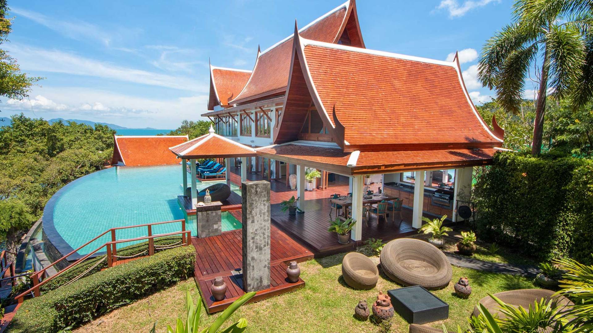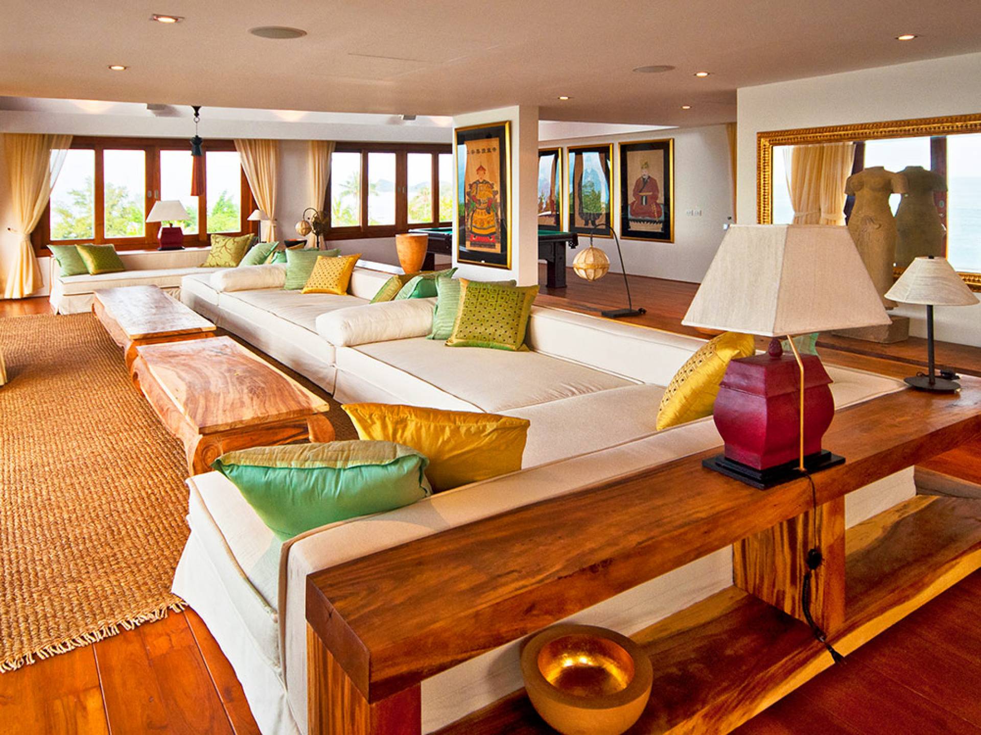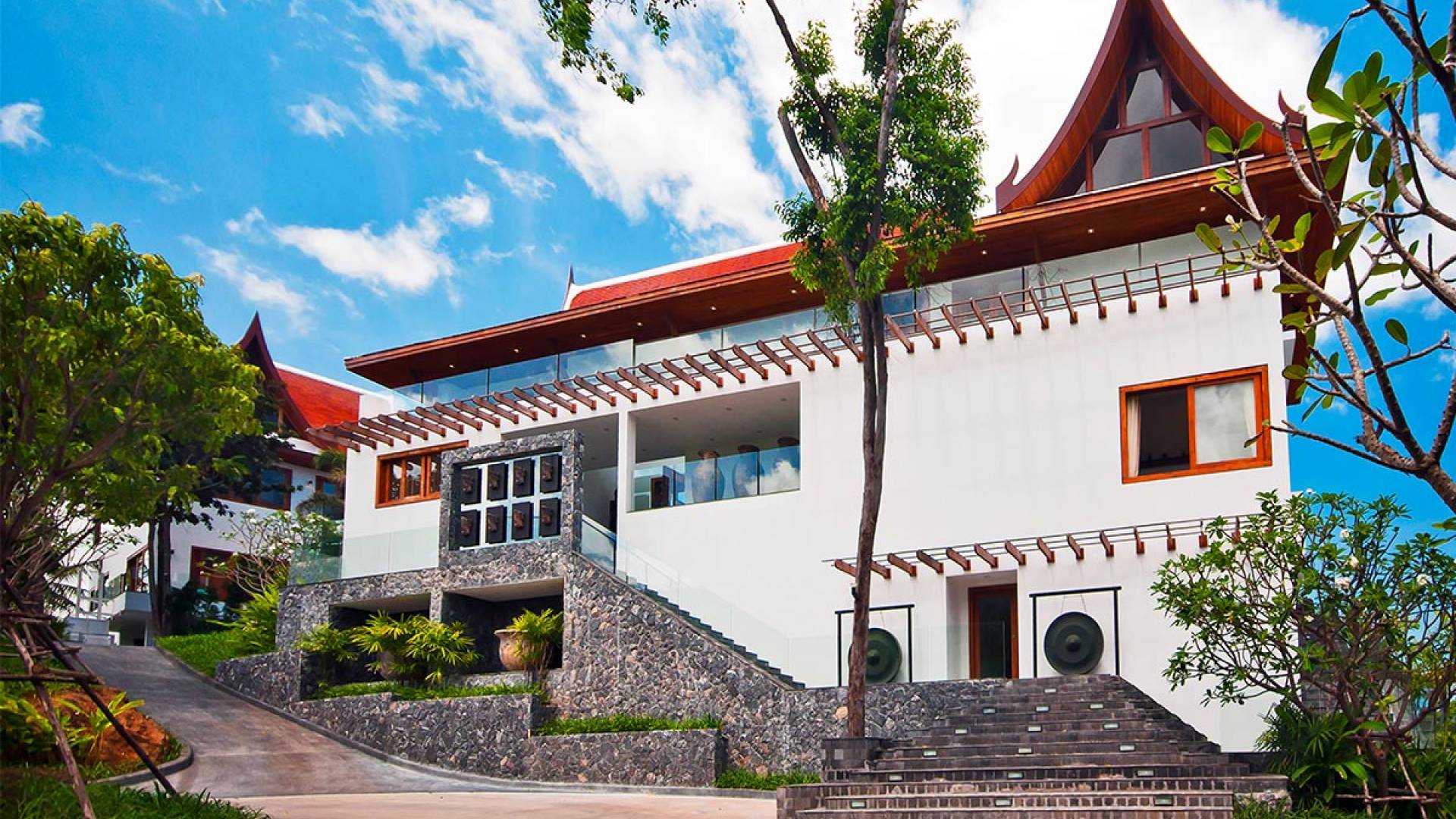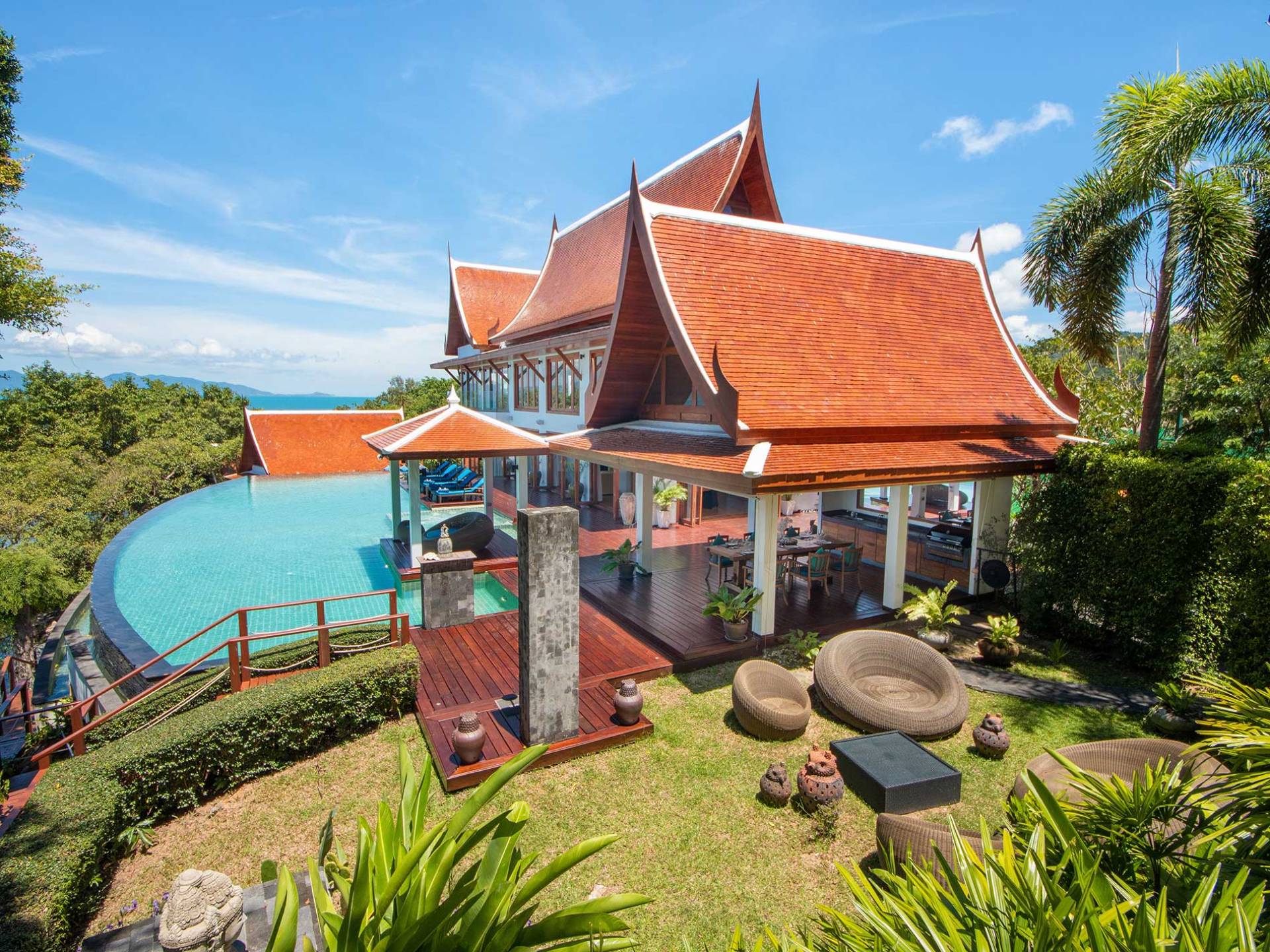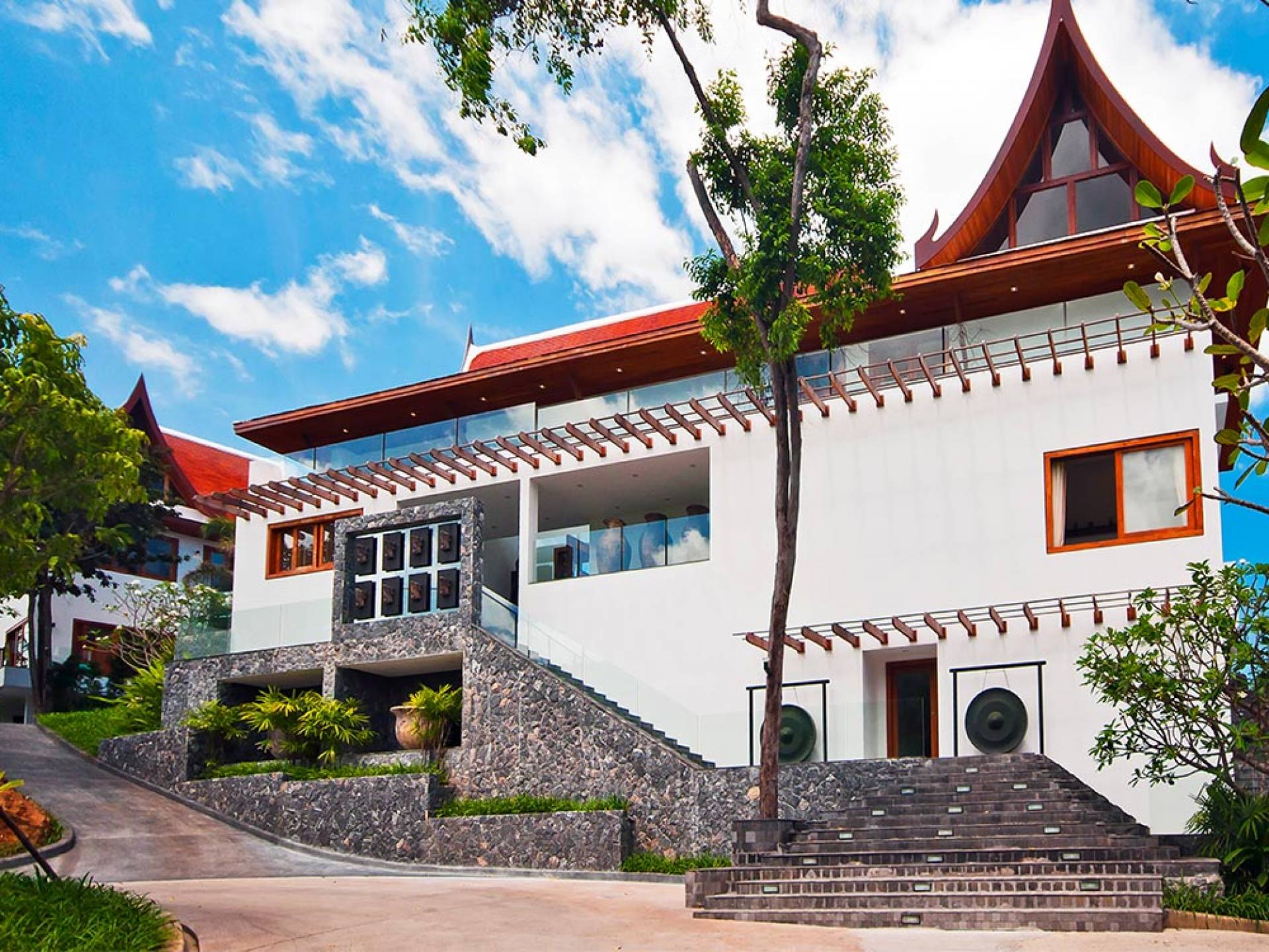 Clubhouse - Κεντρικό Επίπεδο - Μια μεγαλοπρεπής, πέτρινη είσοδος ανοίγει σε ένα θολωτό σαλόνι και τραπεζαρία επιπλωμένο με σύγχρονη ασιατική τέχνη και διακόσμηση με ξύλινες και γυάλινες πόρτες που ανοίγουν στο μεγάλο κατάστρωμα της πισίνας. Το σαλόνι εκτείνεται σε μια ευρύχωρη τραπεζαρία με ένα στρογγυλό συμπαγές τραπέζι Teak 16 θέσεων, που σερβίρεται από μια πλήρως εξοπλισμένη δυτική κουζίνα. Μια ξεχωριστή κουζίνα επιτρέπει στο προσωπικό να προετοιμάζει διακριτικά τα γεύματα για τους επισκέπτες. - Upper Mezzanine Level - Ο μεγάλος κεντρικός χώρος lounge είναι επιπλωμένος με έναν τεράστιο καναπέ 9 μέτρων, καθώς και ένα τραπέζι μπιλιάρδου, επιλογή βιβλίων και τραπέζι παιχνιδιών - Mid-Lower Level. Κατεβαίνοντας λίγα βήματα από τον κεντρικό όροφο, ο ειδικός χώρος υγείας και γυμναστικής περιλαμβάνει γυμναστήριο με τα πιο σύγχρονα μηχανήματα γυμναστικής, που οδηγεί στο κάτω κατάστρωμα της πισίνας με θέα στη θάλασσα - σάουνα, χαμάμ, μεγάλο τζακούζι και αίθουσα μασάζ για ιδιωτικές περιποιήσεις σπα - Κάτω Επίπεδο. 12 θέσεων, πλήρως αυτοματοποιημένη αίθουσα κινηματογράφου και βιντεοπαιχνιδιών. Οι ταινίες και ο φωτισμός ελέγχονται από ένα ειδικά προγραμματισμένο iPad και ο χώρος διαθέτει επίσης το δικό του μίνι μπαρ και φούρνο μικροκυμάτων. Ένα εντοιχισμένο κελάρι κρασιού καταλαμβάνει ένα διπλανό δωμάτιο, ένα ψυγείο κρασιού εφοδιασμένο με πάνω από 100 μπουκάλια που καλύπτουν τα καλύτερα vintage και σαμπάνια από όλο τον κόσμο. Αυτός ο όροφος διαθέτει επίσης αποδυτήρια και ντους για το γήπεδο τένις. - Pool & Sun Terrace - Το Clubhouse ανοίγει σε ένα φαρδύ ξύλινο κατάστρωμα πολλαπλών επιπέδων. Το κύριο κατάστρωμα συνορεύει με την πισίνα υπερχείλισης 32 μέτρων με ενσωματωμένο τζακούζι 8 ατόμων, ενώ το κάτω κατάστρωμα έχει αρκετούς καναπέδες και θέα στη θάλασσα. Η μία πλευρά του καταστρώματος διαθέτει επίσης μια σκεπαστή σάλα χαλάρωσης δίπλα στην πισίνα ή κιόσκι, ενώ μια δεύτερη επιπλωμένη σάλα βρίσκεται σε ιδανική τοποθεσία για μπάρμπεκιου για γεύματα και ποτά στο ύπαιθρο που παρασκευάζονται από τον ιδιωτικό σεφ και την ομάδα της βίλας.