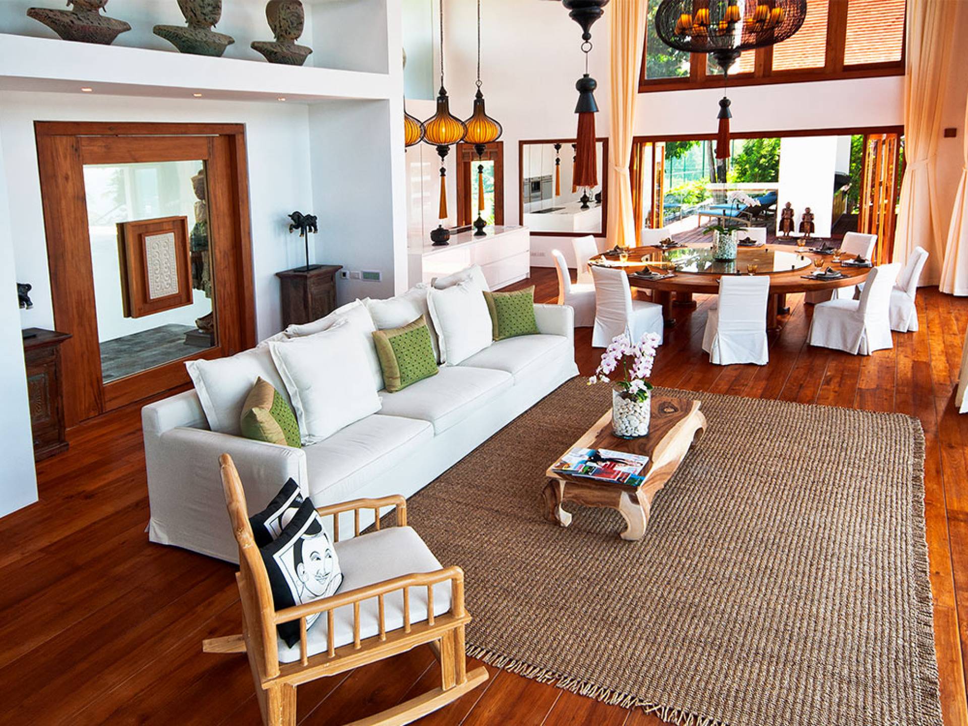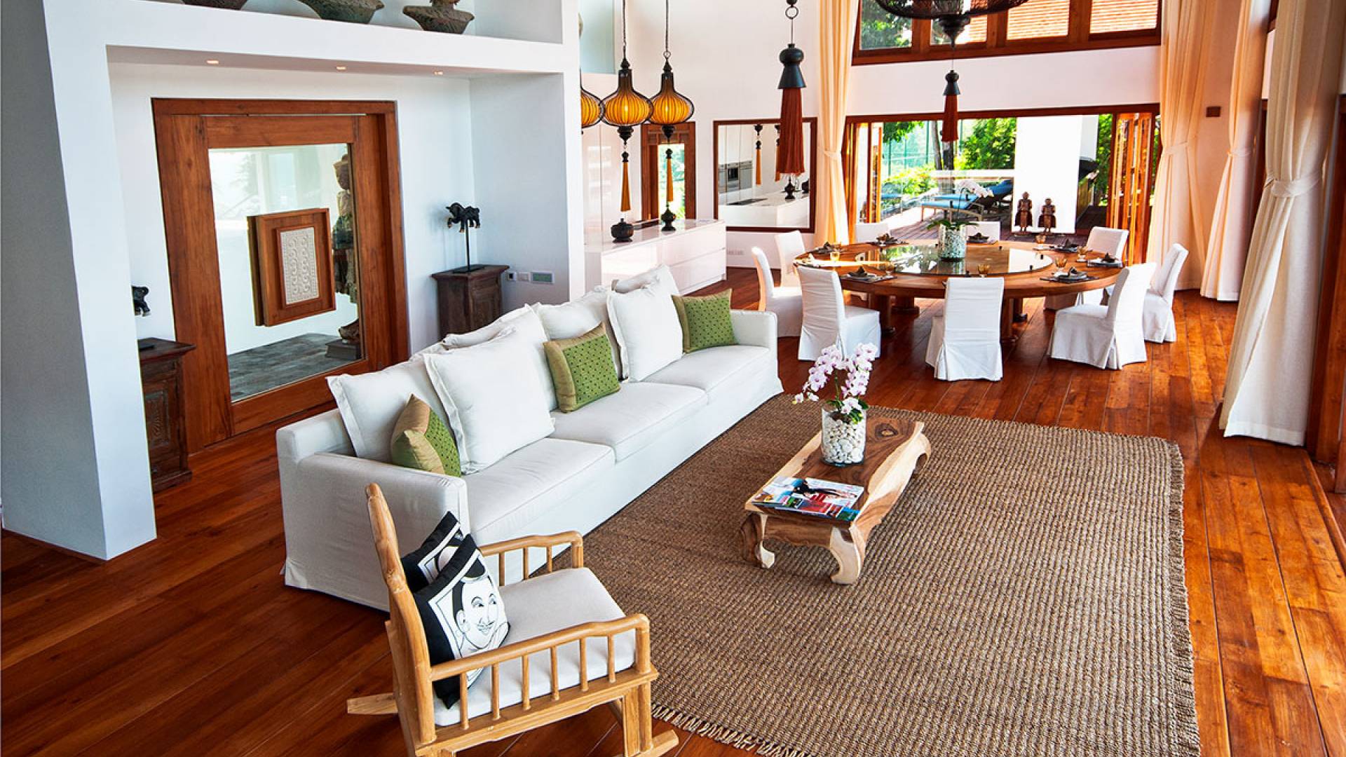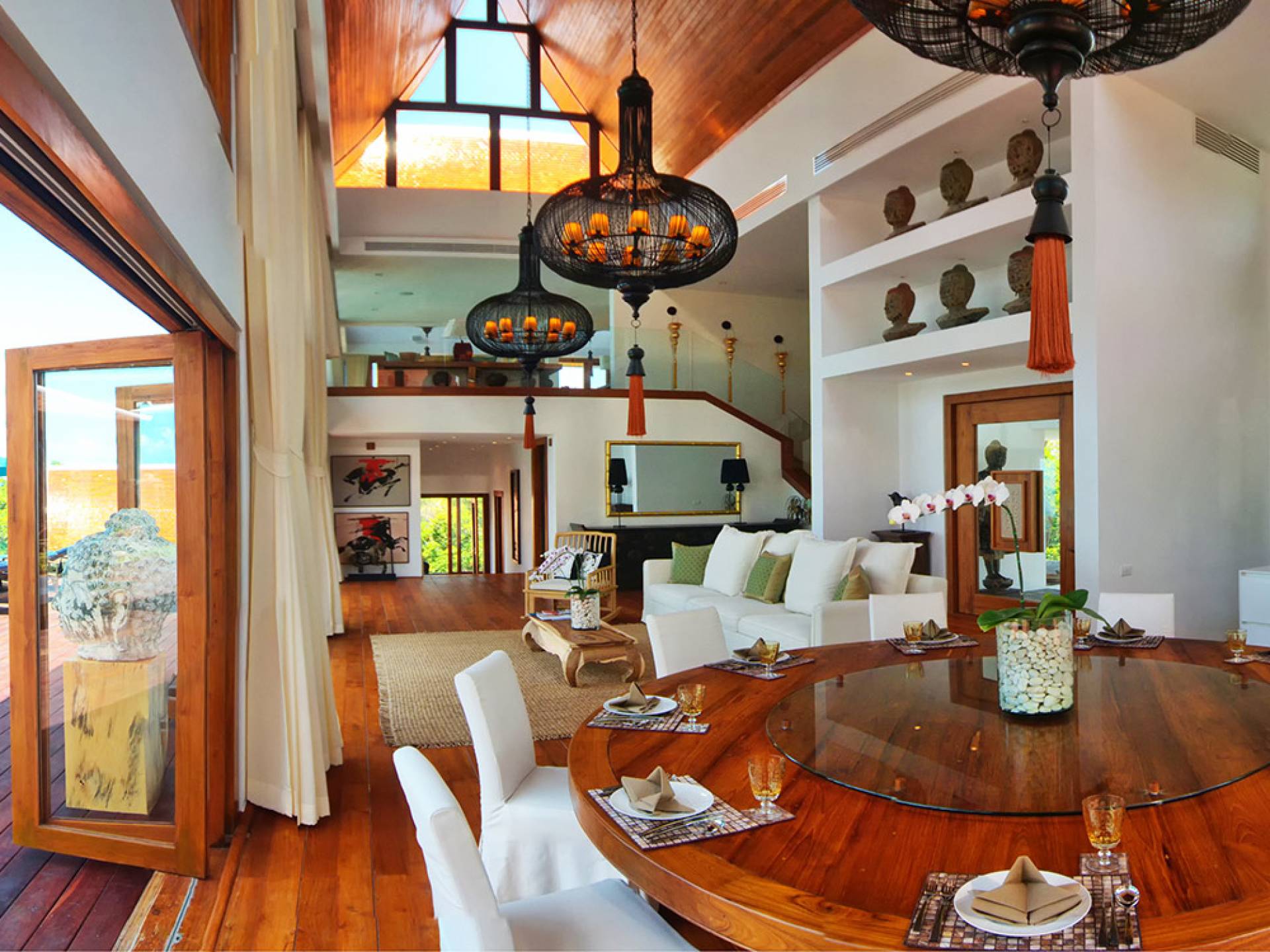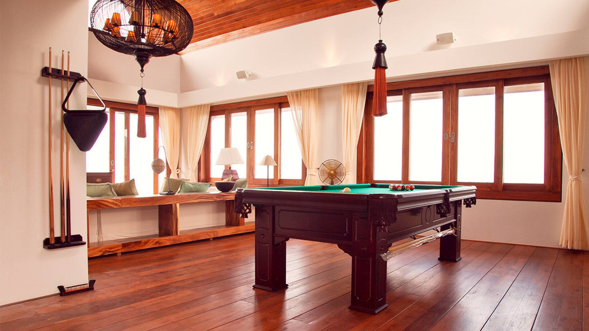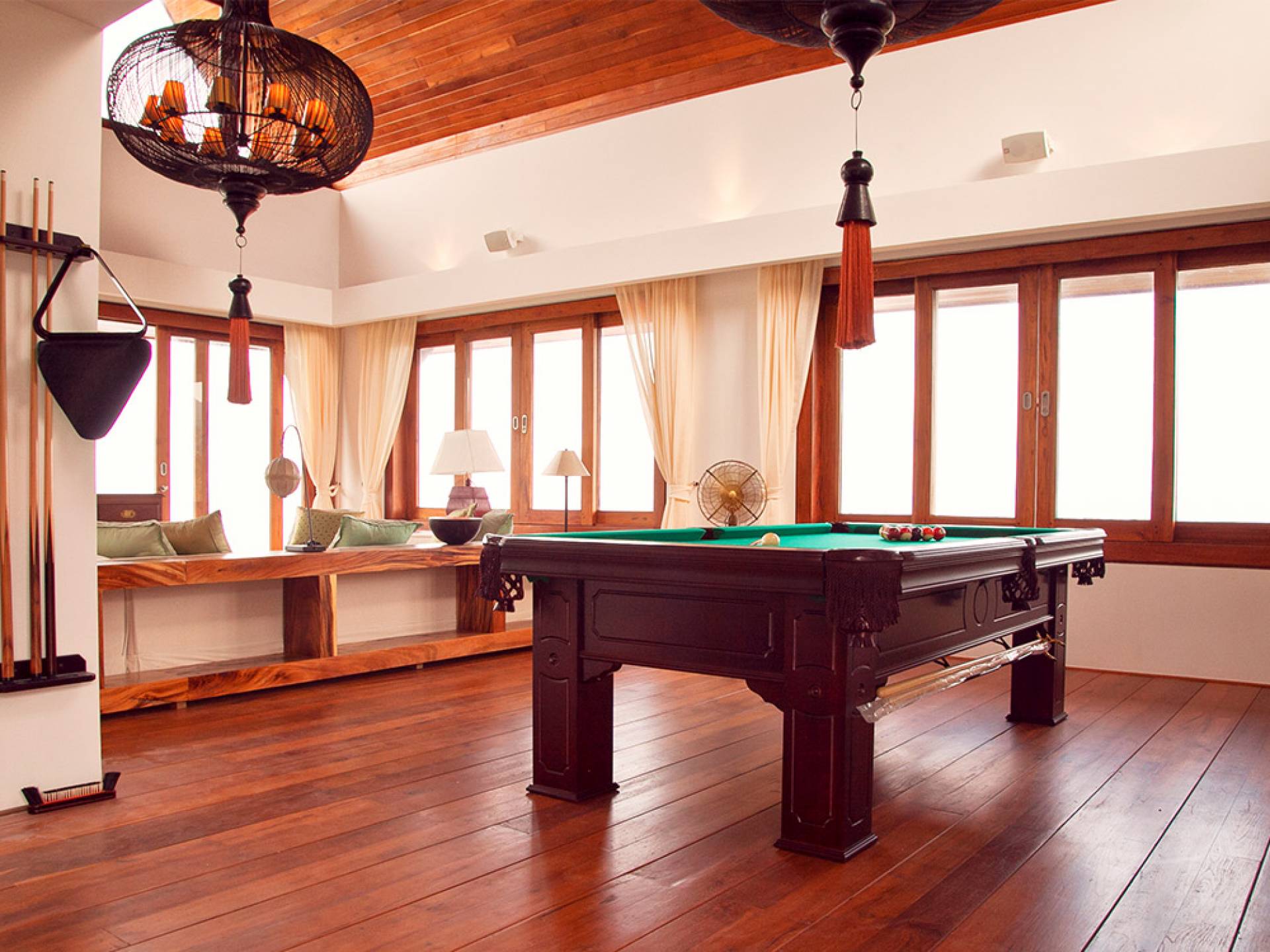 Clubhouse - Κεντρικό Επίπεδο - Μια μεγαλοπρεπής, πέτρινη είσοδος ανοίγει σε ένα θολωτό σαλόνι και τραπεζαρία επιπλωμένο με σύγχρονη ασιατική τέχνη και διακόσμηση με ξύλινες και γυάλινες πόρτες που ανοίγουν στο μεγάλο κατάστρωμα της πισίνας. Το σαλόνι εκτείνεται σε μια ευρύχωρη τραπεζαρία με ένα στρογγυλό συμπαγές τραπέζι Teak 16 θέσεων, που σερβίρεται από μια πλήρως εξοπλισμένη δυτική κουζίνα. Μια ξεχωριστή κουζίνα επιτρέπει στο προσωπικό να προετοιμάζει διακριτικά τα γεύματα για τους επισκέπτες. - Upper Mezzanine Level - Ο μεγάλος κεντρικός χώρος lounge είναι επιπλωμένος με έναν τεράστιο καναπέ 9 μέτρων, καθώς και ένα τραπέζι μπιλιάρδου, επιλογή βιβλίων και τραπέζι παιχνιδιών - Mid-Lower Level. Κατεβαίνοντας λίγα βήματα από τον κεντρικό όροφο, ο ειδικός χώρος υγείας και γυμναστικής περιλαμβάνει γυμναστήριο με τα πιο σύγχρονα μηχανήματα γυμναστικής, που οδηγεί στο κάτω κατάστρωμα της πισίνας με θέα στη θάλασσα - σάουνα, χαμάμ, μεγάλο τζακούζι και αίθουσα μασάζ για ιδιωτικές περιποιήσεις σπα - Κάτω Επίπεδο. 12 θέσεων, πλήρως αυτοματοποιημένη αίθουσα κινηματογράφου και βιντεοπαιχνιδιών. Οι ταινίες και ο φωτισμός ελέγχονται από ένα ειδικά προγραμματισμένο iPad και ο χώρος διαθέτει επίσης το δικό του μίνι μπαρ και φούρνο μικροκυμάτων. Ένα εντοιχισμένο κελάρι κρασιού καταλαμβάνει ένα διπλανό δωμάτιο, ένα ψυγείο κρασιού εφοδιασμένο με πάνω από 100 μπουκάλια που καλύπτουν τα καλύτερα vintage και σαμπάνια από όλο τον κόσμο. Αυτός ο όροφος διαθέτει επίσης αποδυτήρια και ντους για το γήπεδο τένις. - Pool & Sun Terrace - Το Clubhouse ανοίγει σε ένα φαρδύ ξύλινο κατάστρωμα πολλαπλών επιπέδων. Το κύριο κατάστρωμα συνορεύει με την πισίνα υπερχείλισης 32 μέτρων με ενσωματωμένο τζακούζι 8 ατόμων, ενώ το κάτω κατάστρωμα έχει αρκετούς καναπέδες και θέα στη θάλασσα. Η μία πλευρά του καταστρώματος διαθέτει επίσης μια σκεπαστή σάλα χαλάρωσης δίπλα στην πισίνα ή κιόσκι, ενώ μια δεύτερη επιπλωμένη σάλα βρίσκεται σε ιδανική τοποθεσία για μπάρμπεκιου για γεύματα και ποτά στο ύπαιθρο που παρασκευάζονται από τον ιδιωτικό σεφ και την ομάδα της βίλας.
