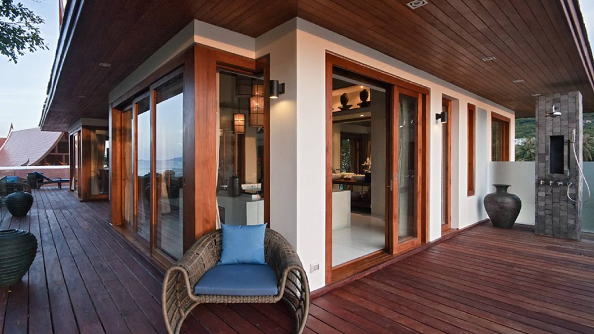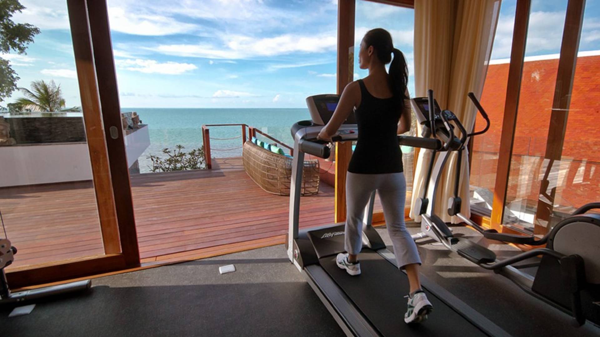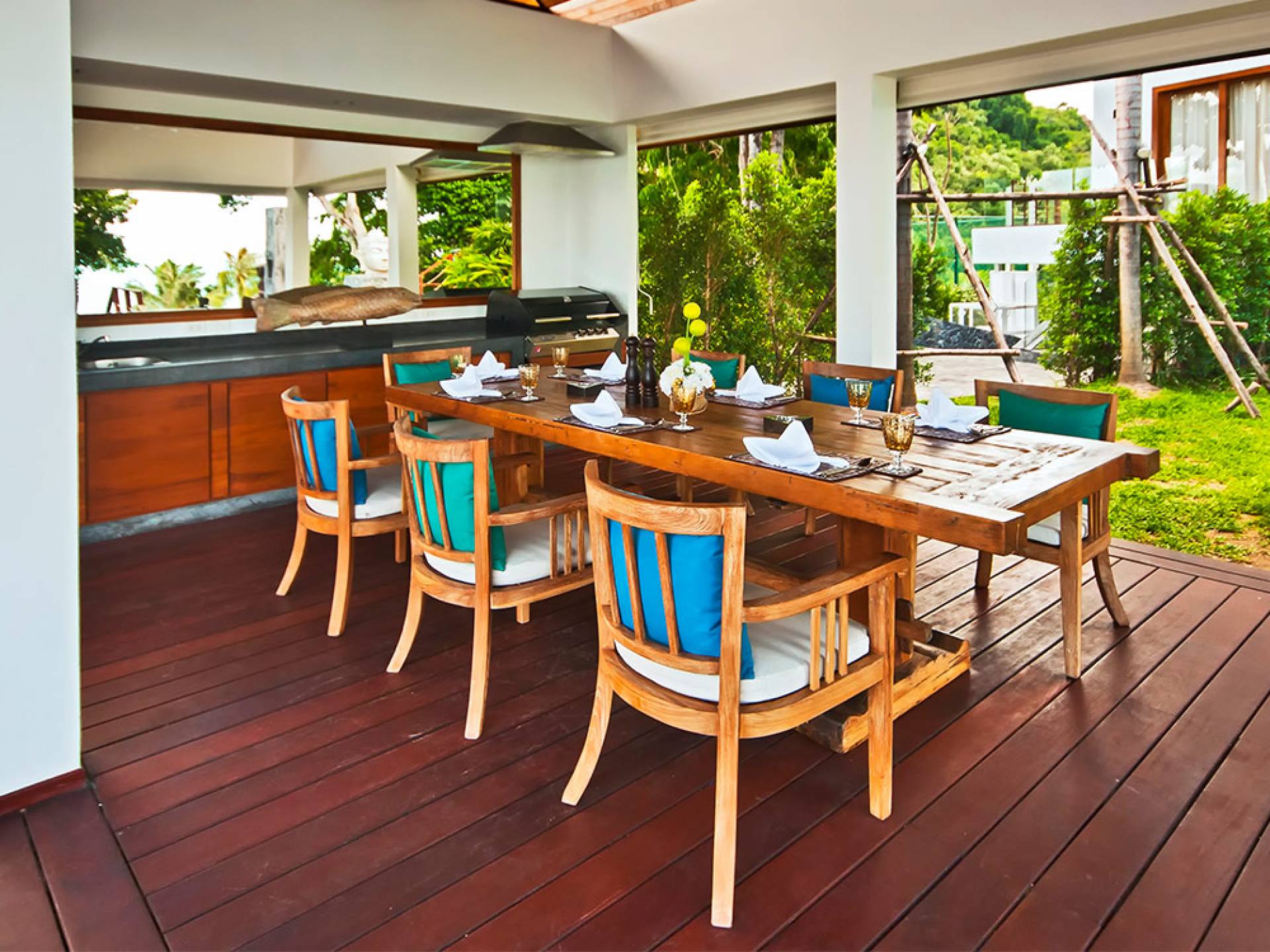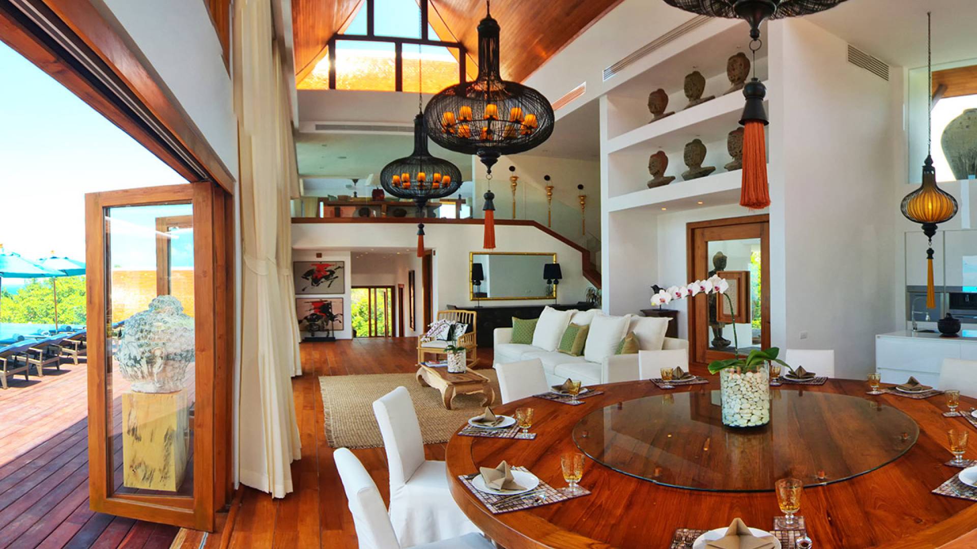 Clubhouse - Κεντρικό Επίπεδο - Μια μεγαλοπρεπής, πέτρινη είσοδος ανοίγει σε ένα θολωτό σαλόνι και τραπεζαρία επιπλωμένο με σύγχρονη ασιατική τέχνη και διακόσμηση με ξύλινες και γυάλινες πόρτες που ανοίγουν στο μεγάλο κατάστρωμα της πισίνας. Το σαλόνι εκτείνεται σε μια ευρύχωρη τραπεζαρία με ένα στρογγυλό συμπαγές τραπέζι Teak 16 θέσεων, που σερβίρεται από μια πλήρως εξοπλισμένη δυτική κουζίνα. Μια ξεχωριστή κουζίνα επιτρέπει στο προσωπικό να προετοιμάζει διακριτικά τα γεύματα για τους επισκέπτες. - Upper Mezzanine Level - Ο μεγάλος κεντρικός χώρος lounge είναι επιπλωμένος με έναν τεράστιο καναπέ 9 μέτρων, καθώς και ένα τραπέζι μπιλιάρδου, επιλογή βιβλίων και τραπέζι παιχνιδιών - Mid-Lower Level. Κατεβαίνοντας λίγα βήματα από τον κεντρικό όροφο, ο ειδικός χώρος υγείας και γυμναστικής περιλαμβάνει γυμναστήριο με τα πιο σύγχρονα μηχανήματα γυμναστικής, που οδηγεί στο κάτω κατάστρωμα της πισίνας με θέα στη θάλασσα - σάουνα, χαμάμ, μεγάλο τζακούζι και αίθουσα μασάζ για ιδιωτικές περιποιήσεις σπα - Κάτω Επίπεδο. 12 θέσεων, πλήρως αυτοματοποιημένη αίθουσα κινηματογράφου και βιντεοπαιχνιδιών. Οι ταινίες και ο φωτισμός ελέγχονται από ένα ειδικά προγραμματισμένο iPad και ο χώρος διαθέτει επίσης το δικό του μίνι μπαρ και φούρνο μικροκυμάτων. Ένα εντοιχισμένο κελάρι κρασιού καταλαμβάνει ένα διπλανό δωμάτιο, ένα ψυγείο κρασιού εφοδιασμένο με πάνω από 100 μπουκάλια που καλύπτουν τα καλύτερα vintage και σαμπάνια από όλο τον κόσμο. Αυτός ο όροφος διαθέτει επίσης αποδυτήρια και ντους για το γήπεδο τένις. - Pool & Sun Terrace - Το Clubhouse ανοίγει σε ένα φαρδύ ξύλινο κατάστρωμα πολλαπλών επιπέδων. Το κύριο κατάστρωμα συνορεύει με την πισίνα υπερχείλισης 32 μέτρων με ενσωματωμένο τζακούζι 8 ατόμων, ενώ το κάτω κατάστρωμα έχει αρκετούς καναπέδες και θέα στη θάλασσα. Η μία πλευρά του καταστρώματος διαθέτει επίσης μια σκεπαστή σάλα χαλάρωσης δίπλα στην πισίνα ή κιόσκι, ενώ μια δεύτερη επιπλωμένη σάλα βρίσκεται σε ιδανική τοποθεσία για μπάρμπεκιου για γεύματα και ποτά στο ύπαιθρο που παρασκευάζονται από τον ιδιωτικό σεφ και την ομάδα της βίλας.