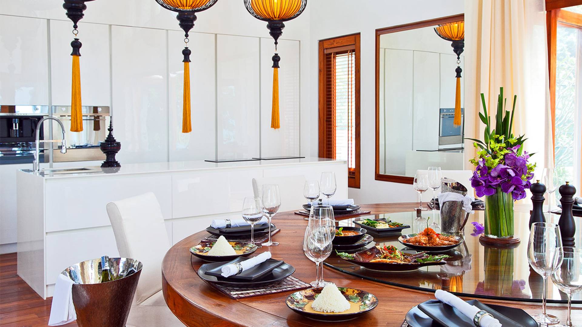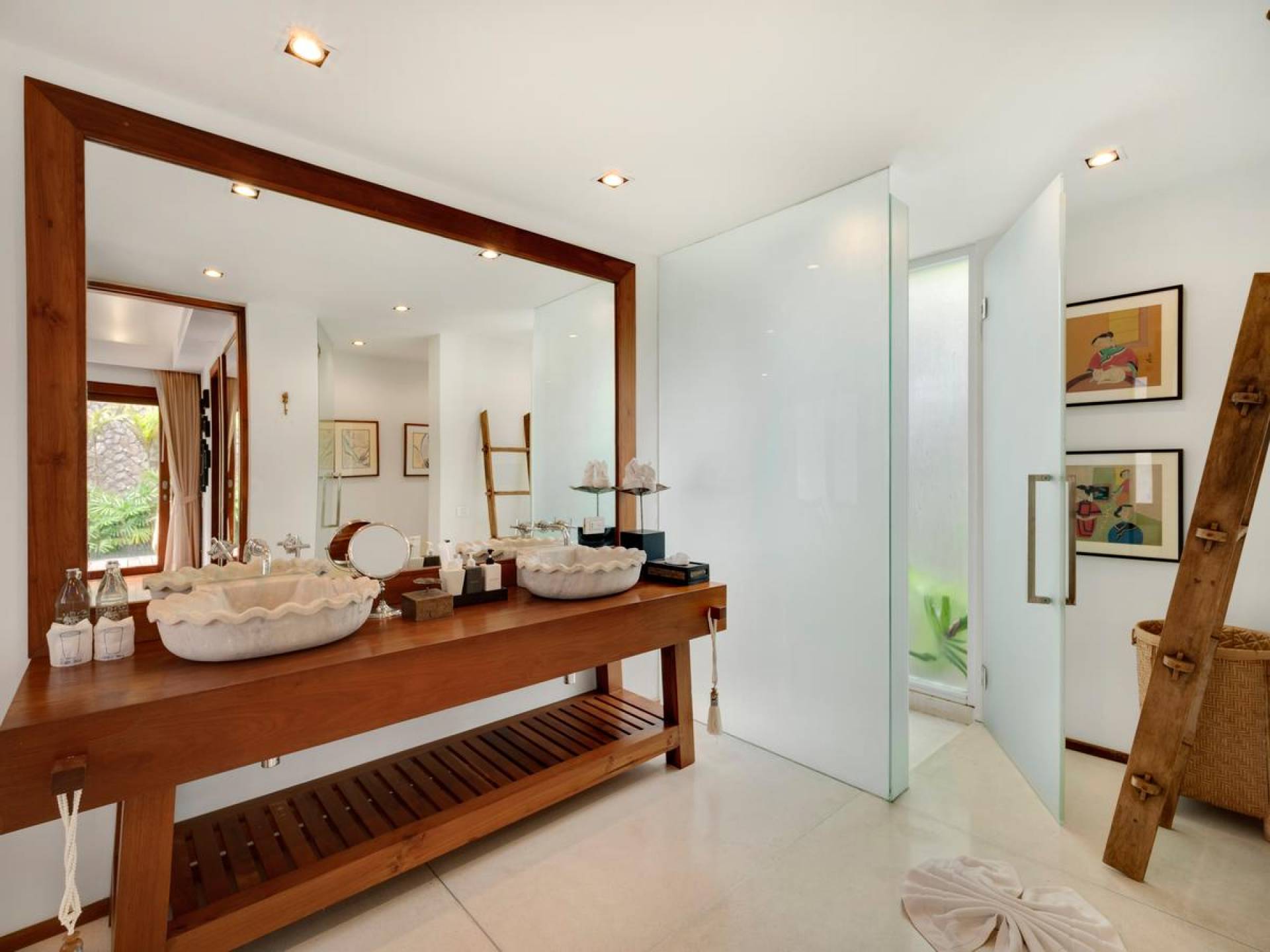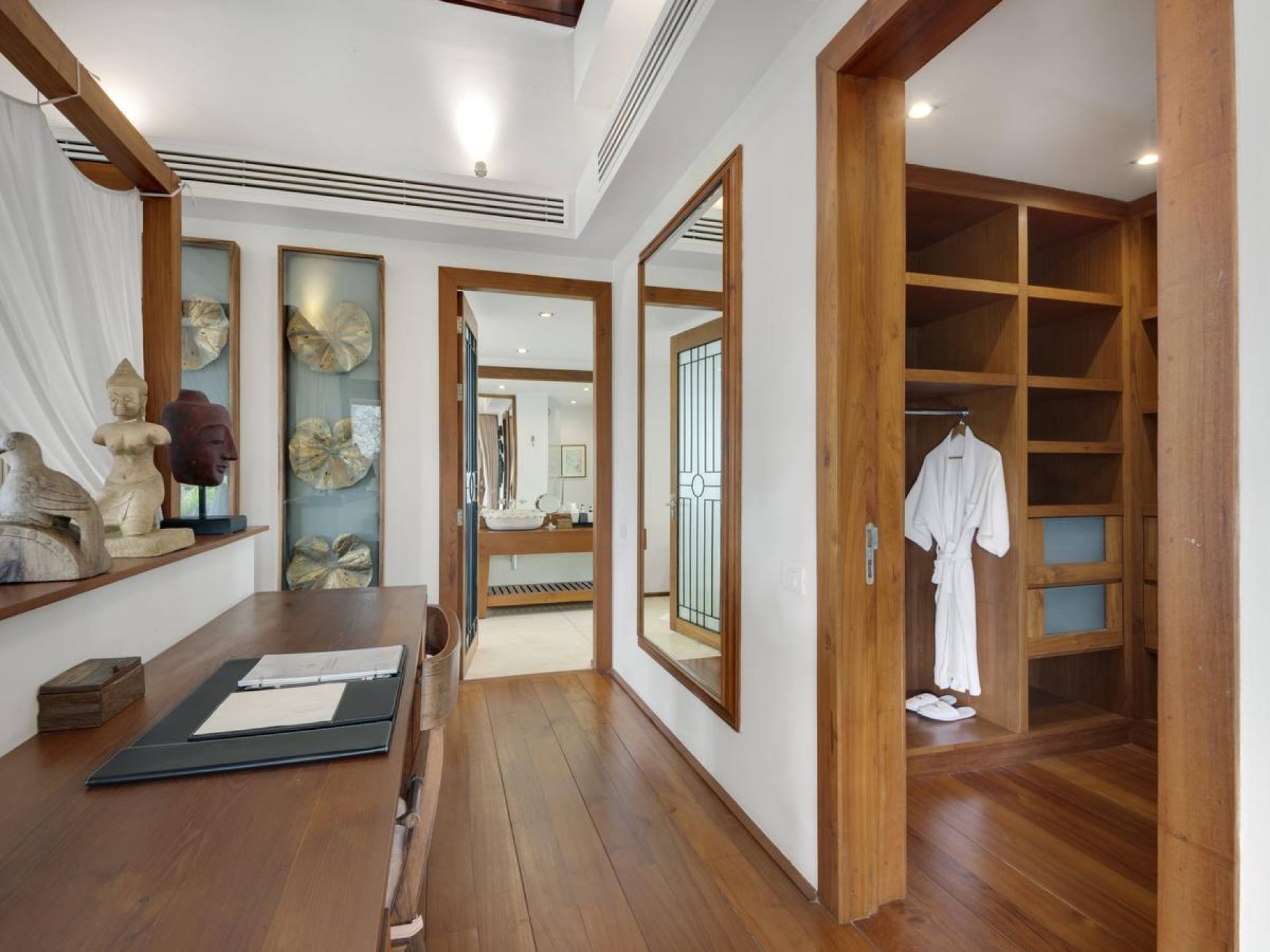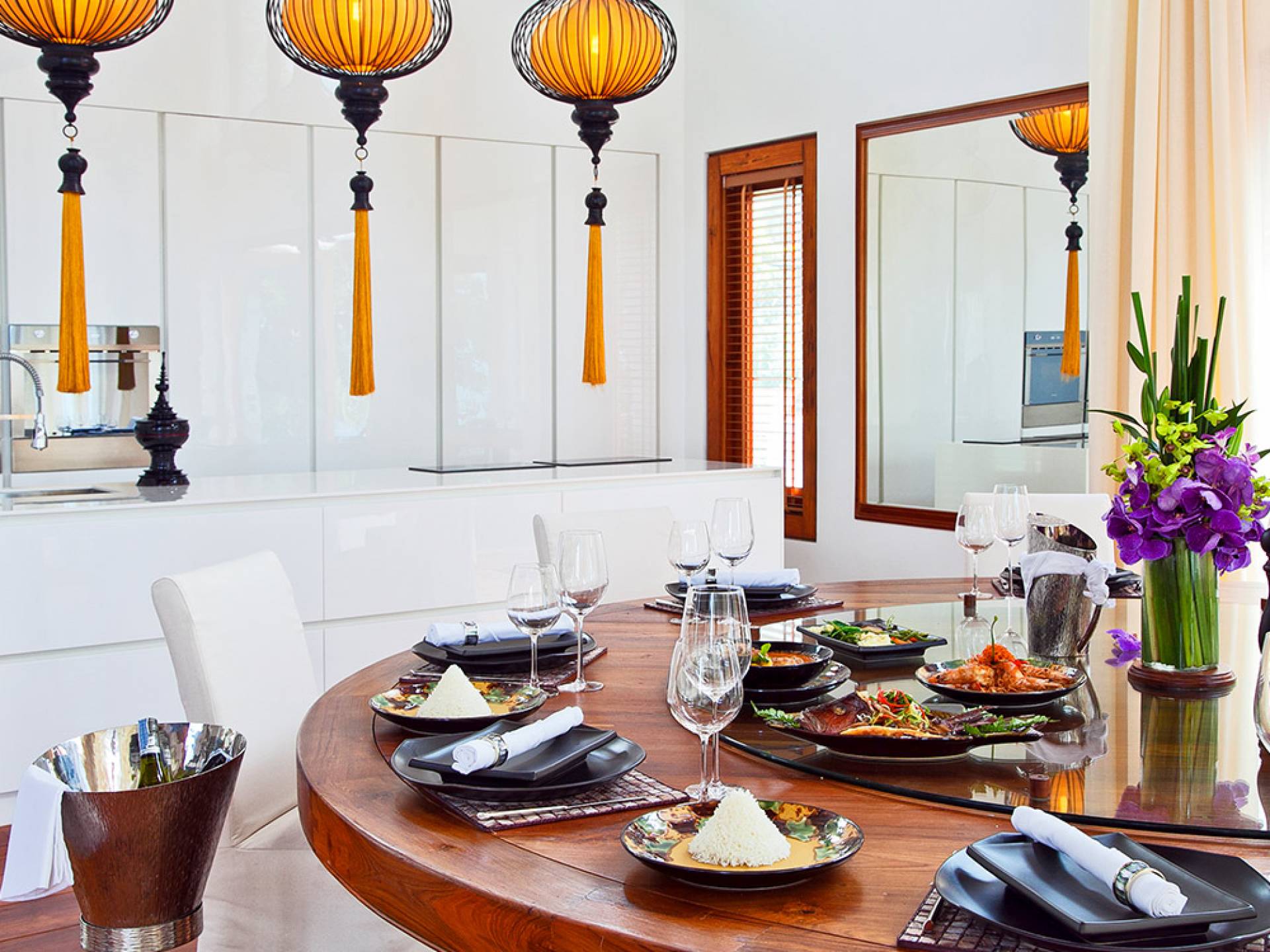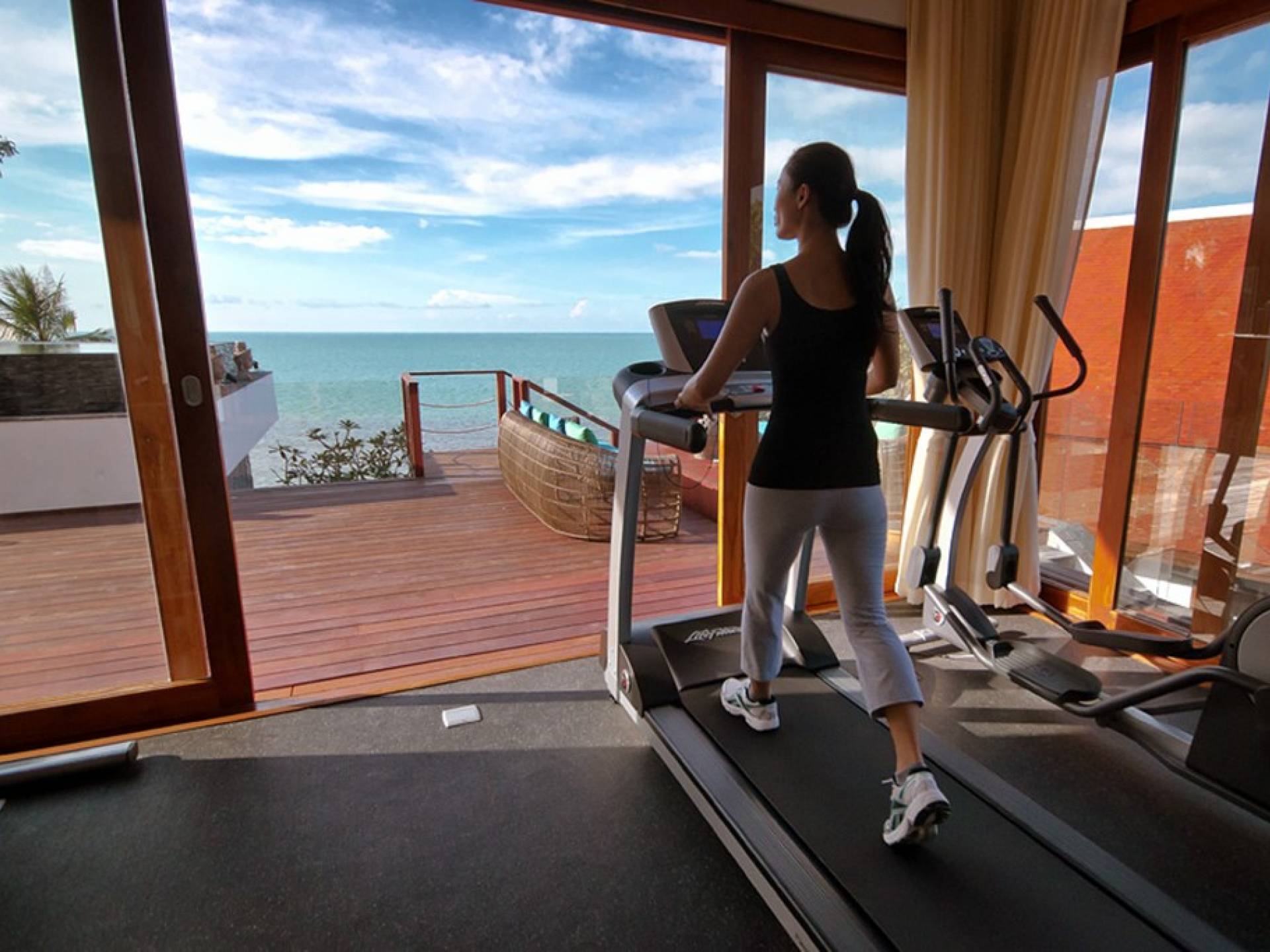 Clubhouse - Κεντρικό Επίπεδο - Μια μεγαλοπρεπής, πέτρινη είσοδος ανοίγει σε ένα θολωτό σαλόνι και τραπεζαρία επιπλωμένο με σύγχρονη ασιατική τέχνη και διακόσμηση με ξύλινες και γυάλινες πόρτες που ανοίγουν στο μεγάλο κατάστρωμα της πισίνας. Το σαλόνι εκτείνεται σε μια ευρύχωρη τραπεζαρία με ένα στρογγυλό συμπαγές τραπέζι Teak 16 θέσεων, που σερβίρεται από μια πλήρως εξοπλισμένη δυτική κουζίνα. Μια ξεχωριστή κουζίνα επιτρέπει στο προσωπικό να προετοιμάζει διακριτικά τα γεύματα για τους επισκέπτες. - Upper Mezzanine Level - Ο μεγάλος κεντρικός χώρος lounge είναι επιπλωμένος με έναν τεράστιο καναπέ 9 μέτρων, καθώς και ένα τραπέζι μπιλιάρδου, επιλογή βιβλίων και τραπέζι παιχνιδιών - Mid-Lower Level. Κατεβαίνοντας λίγα βήματα από τον κεντρικό όροφο, ο ειδικός χώρος υγείας και γυμναστικής περιλαμβάνει γυμναστήριο με τα πιο σύγχρονα μηχανήματα γυμναστικής, που οδηγεί στο κάτω κατάστρωμα της πισίνας με θέα στη θάλασσα - σάουνα, χαμάμ, μεγάλο τζακούζι και αίθουσα μασάζ για ιδιωτικές περιποιήσεις σπα - Κάτω Επίπεδο. 12 θέσεων, πλήρως αυτοματοποιημένη αίθουσα κινηματογράφου και βιντεοπαιχνιδιών. Οι ταινίες και ο φωτισμός ελέγχονται από ένα ειδικά προγραμματισμένο iPad και ο χώρος διαθέτει επίσης το δικό του μίνι μπαρ και φούρνο μικροκυμάτων. Ένα εντοιχισμένο κελάρι κρασιού καταλαμβάνει ένα διπλανό δωμάτιο, ένα ψυγείο κρασιού εφοδιασμένο με πάνω από 100 μπουκάλια που καλύπτουν τα καλύτερα vintage και σαμπάνια από όλο τον κόσμο. Αυτός ο όροφος διαθέτει επίσης αποδυτήρια και ντους για το γήπεδο τένις. - Pool & Sun Terrace - Το Clubhouse ανοίγει σε ένα φαρδύ ξύλινο κατάστρωμα πολλαπλών επιπέδων. Το κύριο κατάστρωμα συνορεύει με την πισίνα υπερχείλισης 32 μέτρων με ενσωματωμένο τζακούζι 8 ατόμων, ενώ το κάτω κατάστρωμα έχει αρκετούς καναπέδες και θέα στη θάλασσα. Η μία πλευρά του καταστρώματος διαθέτει επίσης μια σκεπαστή σάλα χαλάρωσης δίπλα στην πισίνα ή κιόσκι, ενώ μια δεύτερη επιπλωμένη σάλα βρίσκεται σε ιδανική τοποθεσία για μπάρμπεκιου για γεύματα και ποτά στο ύπαιθρο που παρασκευάζονται από τον ιδιωτικό σεφ και την ομάδα της βίλας.