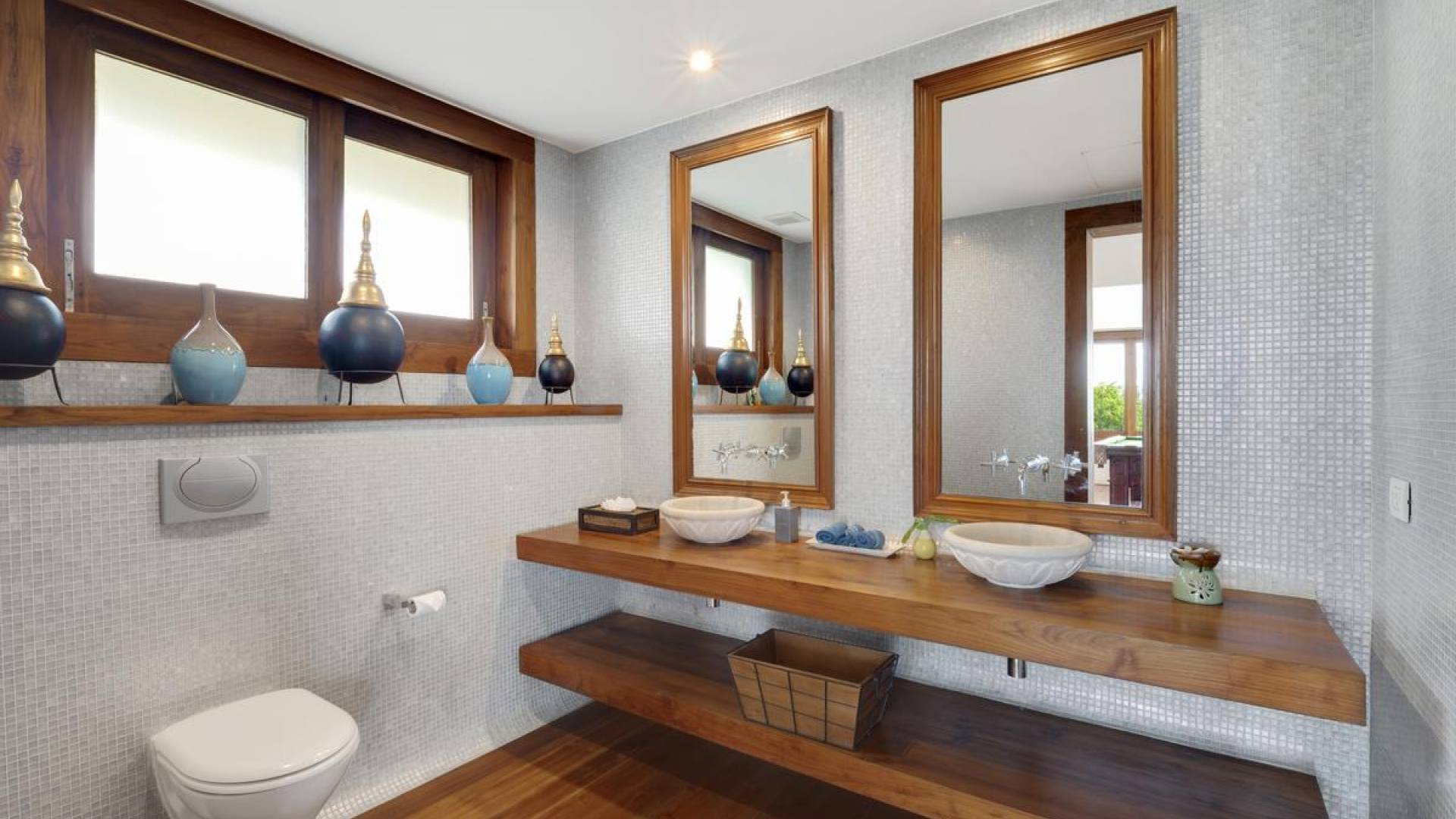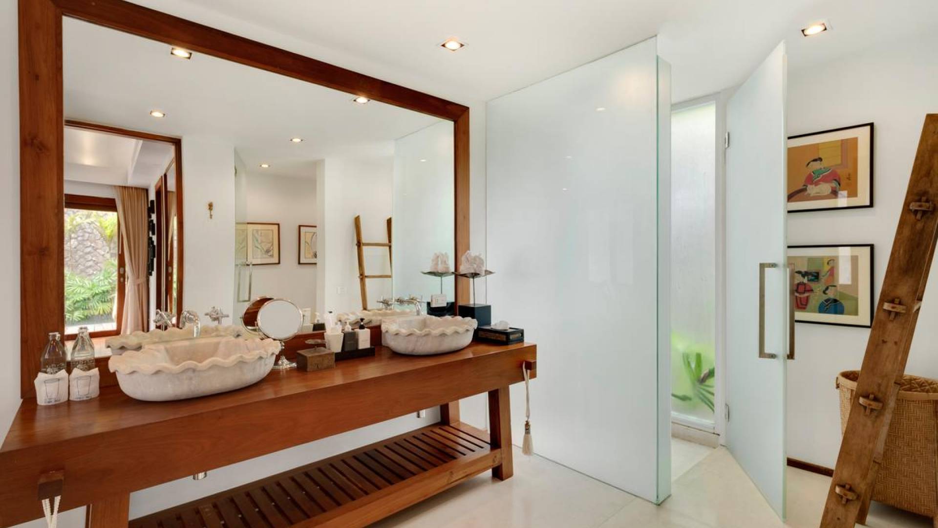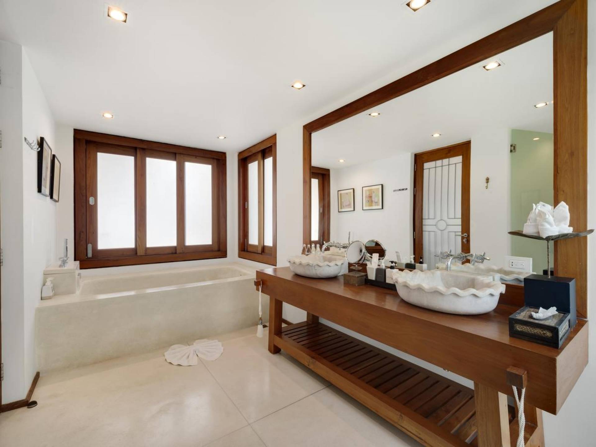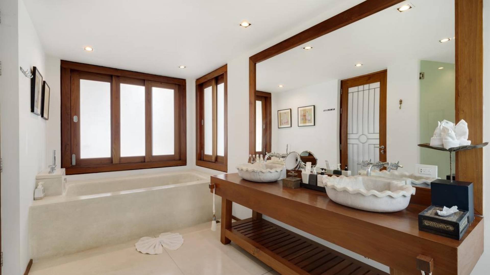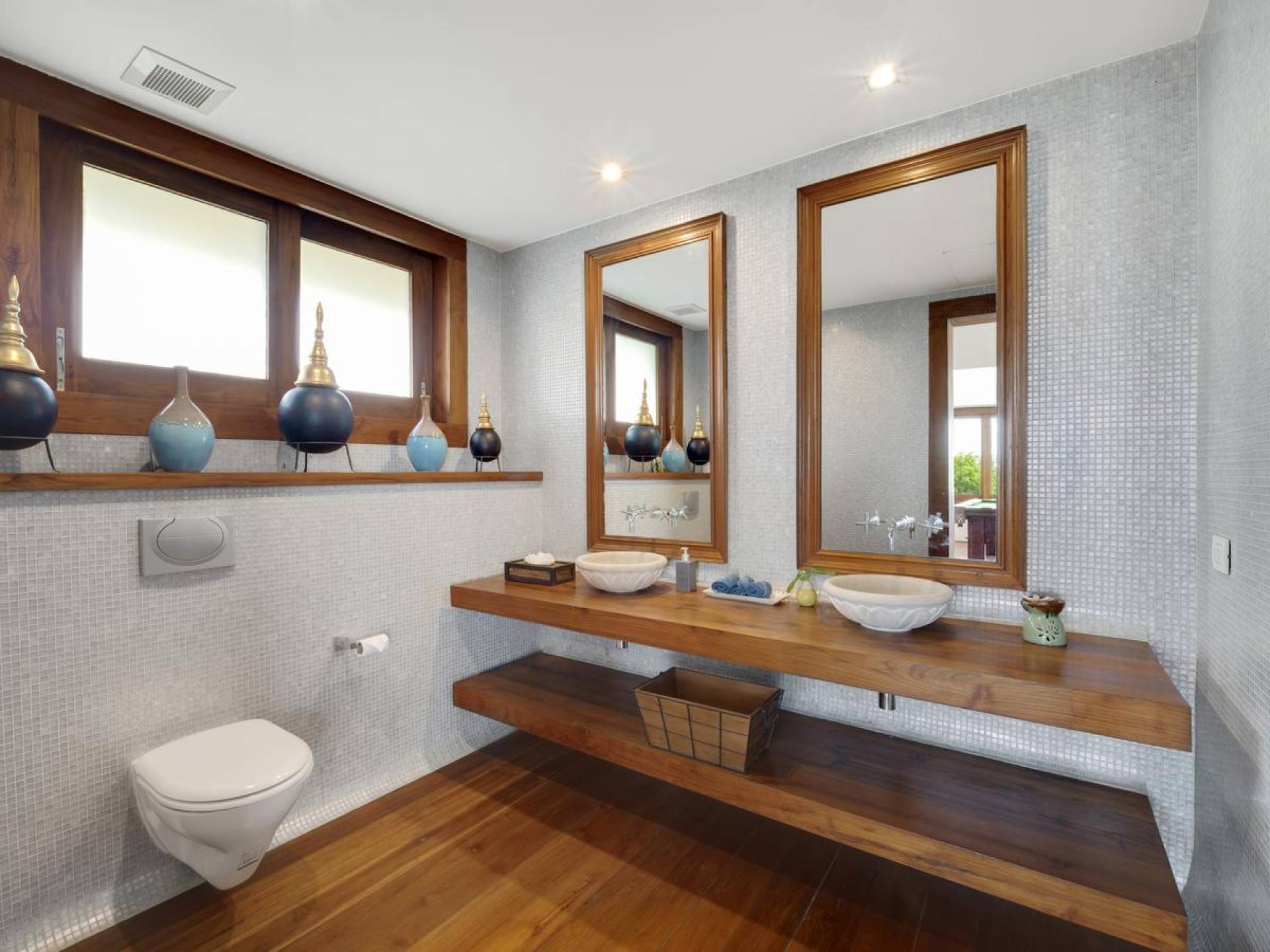 Clubhouse - Κεντρικό Επίπεδο - Μια μεγαλοπρεπής, πέτρινη είσοδος ανοίγει σε ένα θολωτό σαλόνι και τραπεζαρία επιπλωμένο με σύγχρονη ασιατική τέχνη και διακόσμηση με ξύλινες και γυάλινες πόρτες που ανοίγουν στο μεγάλο κατάστρωμα της πισίνας. Το σαλόνι εκτείνεται σε μια ευρύχωρη τραπεζαρία με ένα στρογγυλό συμπαγές τραπέζι Teak 16 θέσεων, που σερβίρεται από μια πλήρως εξοπλισμένη δυτική κουζίνα. Μια ξεχωριστή κουζίνα επιτρέπει στο προσωπικό να προετοιμάζει διακριτικά τα γεύματα για τους επισκέπτες. - Upper Mezzanine Level - Ο μεγάλος κεντρικός χώρος lounge είναι επιπλωμένος με έναν τεράστιο καναπέ 9 μέτρων, καθώς και ένα τραπέζι μπιλιάρδου, επιλογή βιβλίων και τραπέζι παιχνιδιών - Mid-Lower Level. Κατεβαίνοντας λίγα βήματα από τον κεντρικό όροφο, ο ειδικός χώρος υγείας και γυμναστικής περιλαμβάνει γυμναστήριο με τα πιο σύγχρονα μηχανήματα γυμναστικής, που οδηγεί στο κάτω κατάστρωμα της πισίνας με θέα στη θάλασσα - σάουνα, χαμάμ, μεγάλο τζακούζι και αίθουσα μασάζ για ιδιωτικές περιποιήσεις σπα - Κάτω Επίπεδο. 12 θέσεων, πλήρως αυτοματοποιημένη αίθουσα κινηματογράφου και βιντεοπαιχνιδιών. Οι ταινίες και ο φωτισμός ελέγχονται από ένα ειδικά προγραμματισμένο iPad και ο χώρος διαθέτει επίσης το δικό του μίνι μπαρ και φούρνο μικροκυμάτων. Ένα εντοιχισμένο κελάρι κρασιού καταλαμβάνει ένα διπλανό δωμάτιο, ένα ψυγείο κρασιού εφοδιασμένο με πάνω από 100 μπουκάλια που καλύπτουν τα καλύτερα vintage και σαμπάνια από όλο τον κόσμο. Αυτός ο όροφος διαθέτει επίσης αποδυτήρια και ντους για το γήπεδο τένις. - Pool & Sun Terrace - Το Clubhouse ανοίγει σε ένα φαρδύ ξύλινο κατάστρωμα πολλαπλών επιπέδων. Το κύριο κατάστρωμα συνορεύει με την πισίνα υπερχείλισης 32 μέτρων με ενσωματωμένο τζακούζι 8 ατόμων, ενώ το κάτω κατάστρωμα έχει αρκετούς καναπέδες και θέα στη θάλασσα. Η μία πλευρά του καταστρώματος διαθέτει επίσης μια σκεπαστή σάλα χαλάρωσης δίπλα στην πισίνα ή κιόσκι, ενώ μια δεύτερη επιπλωμένη σάλα βρίσκεται σε ιδανική τοποθεσία για μπάρμπεκιου για γεύματα και ποτά στο ύπαιθρο που παρασκευάζονται από τον ιδιωτικό σεφ και την ομάδα της βίλας.