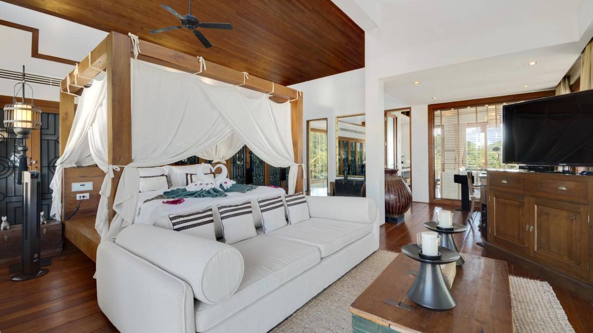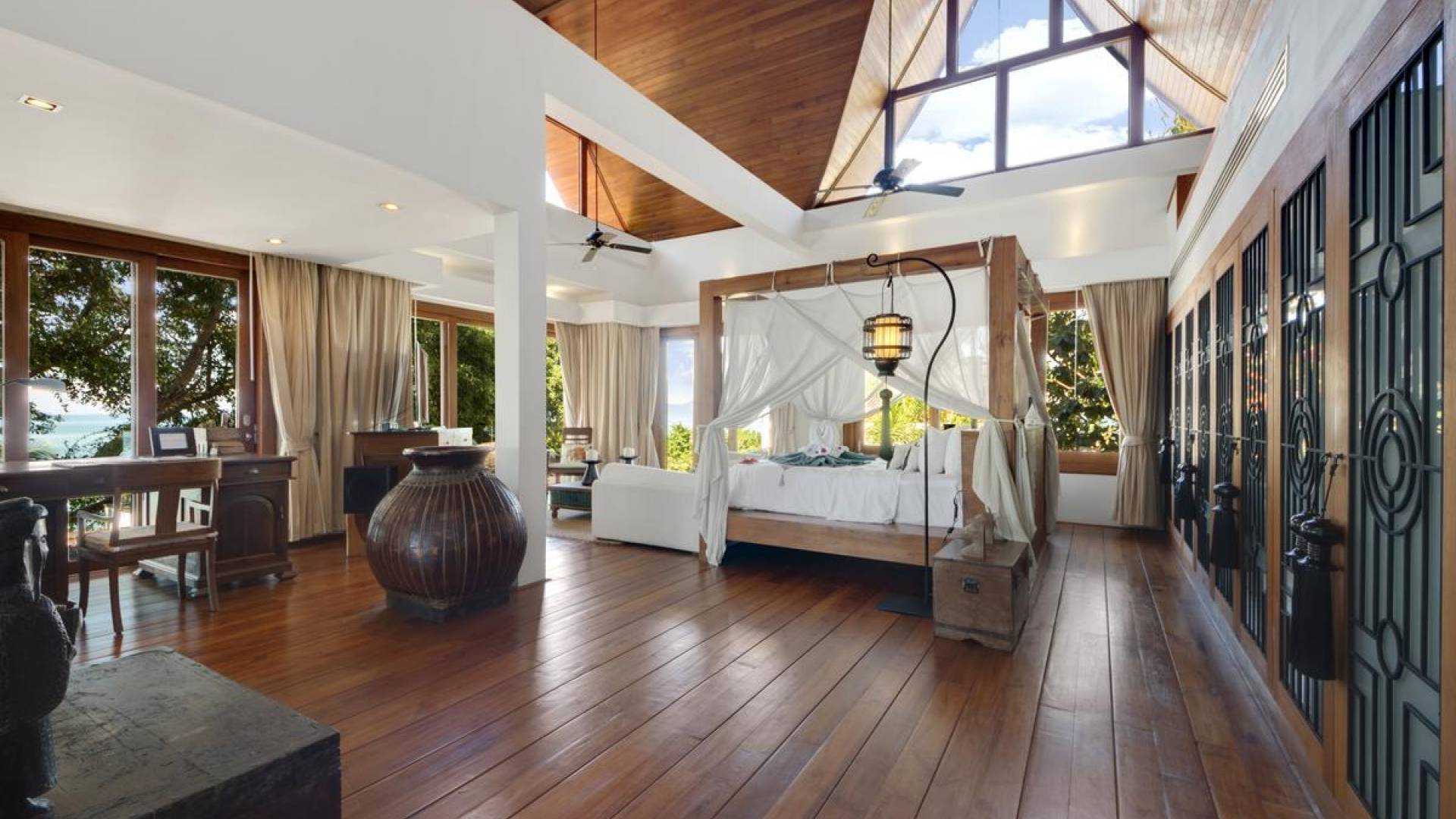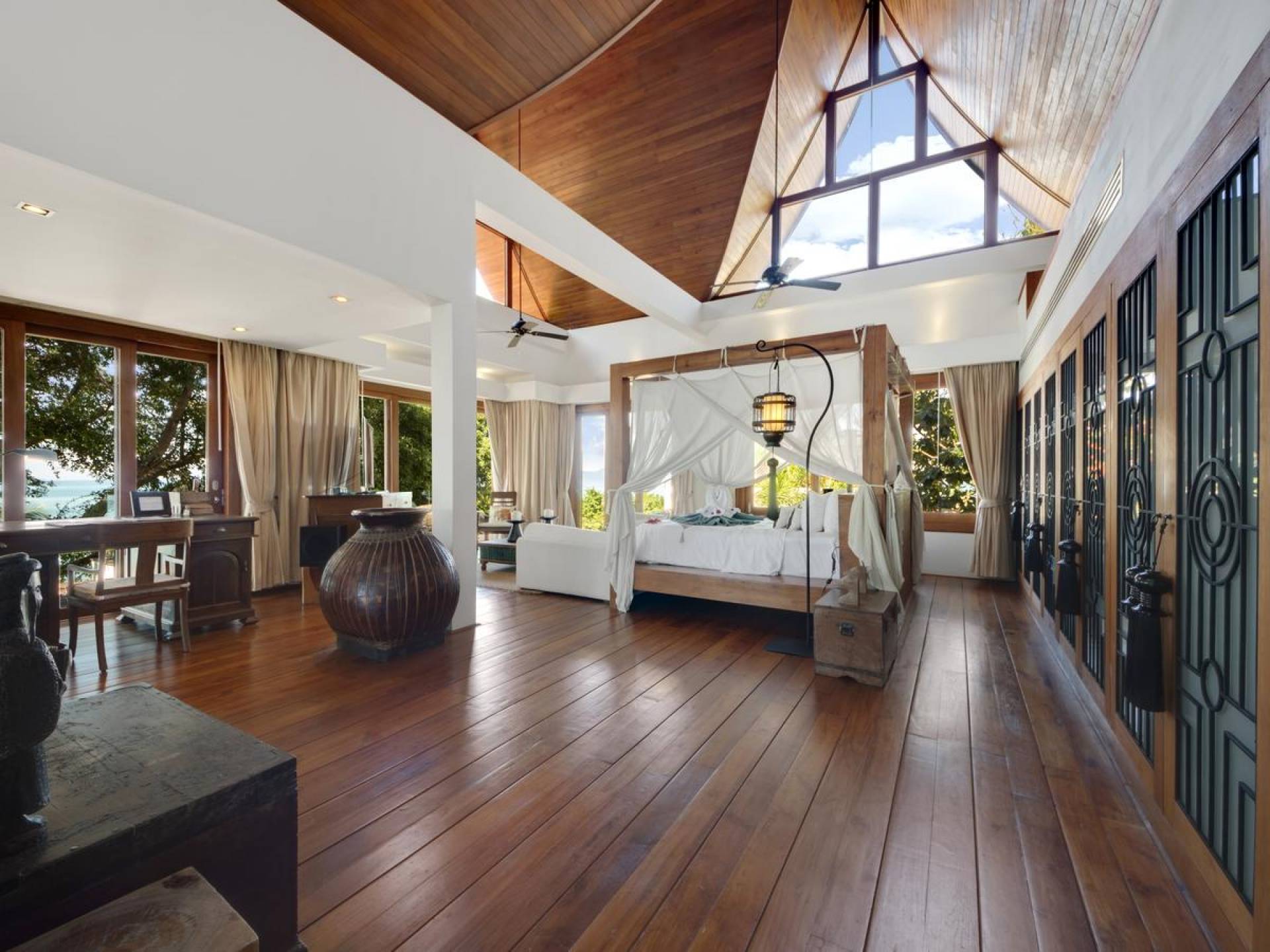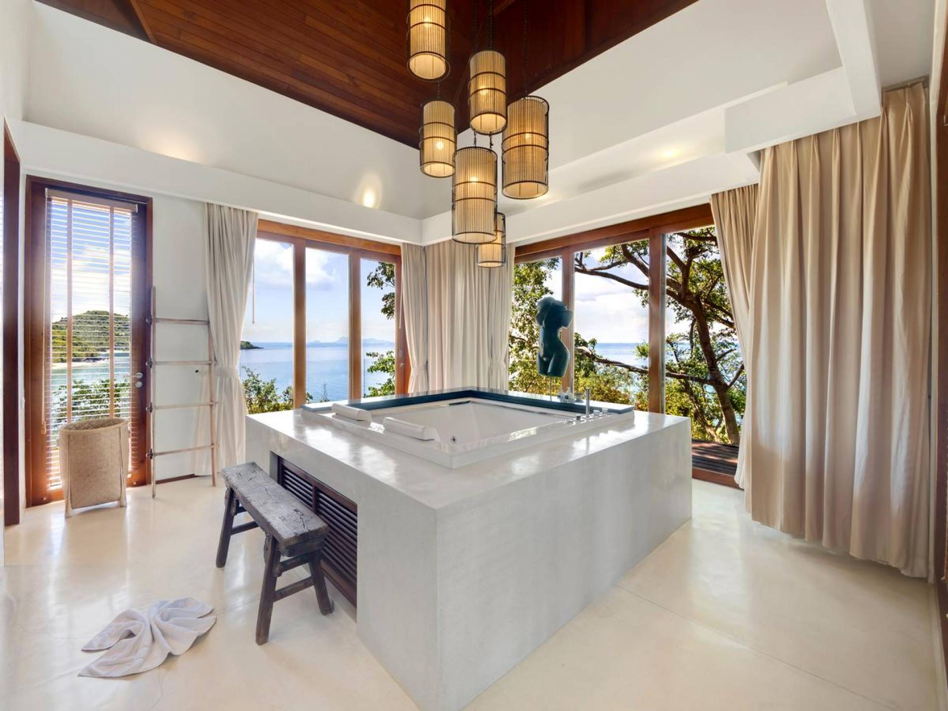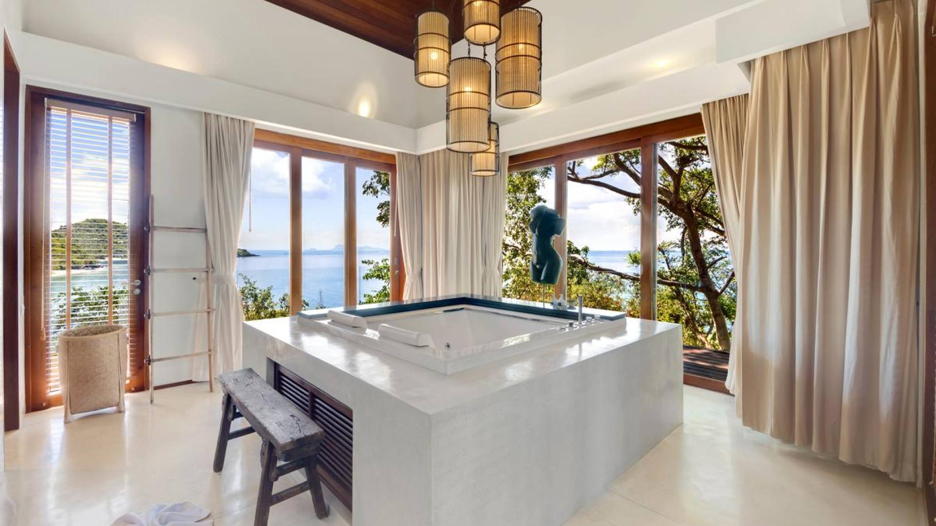 Η Master Villa περιλαμβάνει ένα σαλόνι, μια Grandmaster σουίτα, δύο ευρύχωρες σουίτες επισκεπτών και ένα δωμάτιο για εφήβους ή νταντάδες με δύο μονά κρεβάτια και μπάνιο - Οι τρεις κομψές σουίτες που καταλαμβάνουν τη Master Villa είναι όλες ευρύχωρες, πολυτελείς και διακοσμημένο με εντυπωσιακή σύγχρονη ασιατική τέχνη και συλλεκτικά αντικείμενα. - Καθώς περνάτε από το σαλόνι, οι δύο σουίτες στον πρώτο όροφο προσφέρουν ένα ευρύχωρο υπνοδωμάτιο και χώρους καθιστικού, καθώς και απολαυστικά μπάνια με μεγάλες μπανιέρες. Μία από αυτές τις σουίτες και το δικό της μπάνιο έχει σχεδιαστεί ειδικά με πρόσβαση σε αναπηρικό καροτσάκι για άτομα με μειωμένη κινητικότητα - Η Grand Master σουίτα, που βρίσκεται στο επάνω επίπεδο του περιπτέρου, είναι ακόμη πιο γενναιόδωρη από άποψη χώρου και διαθέτει επίσης ντους μέσα και εξωτερικό. , το τελευταίο με εντυπωσιακή θέα στον αστραφτερό κόλπο από κάτω, το θαλάσσιο πάρκο και τα εκπληκτικά ηλιοβασιλέματα Samui. Το κεντρικό στοιχείο του μπάνιου είναι ένα μεγάλο τζακούζι με υδρομασάζ για να απολαύσετε ένα χαλαρωτικό μπάνιο μετά από μια μέρα έξω. Η σουίτα διαθέτει ευρύχωρη βεράντα με ξαπλώστρες και καναπέ-ξαπλώστρα.