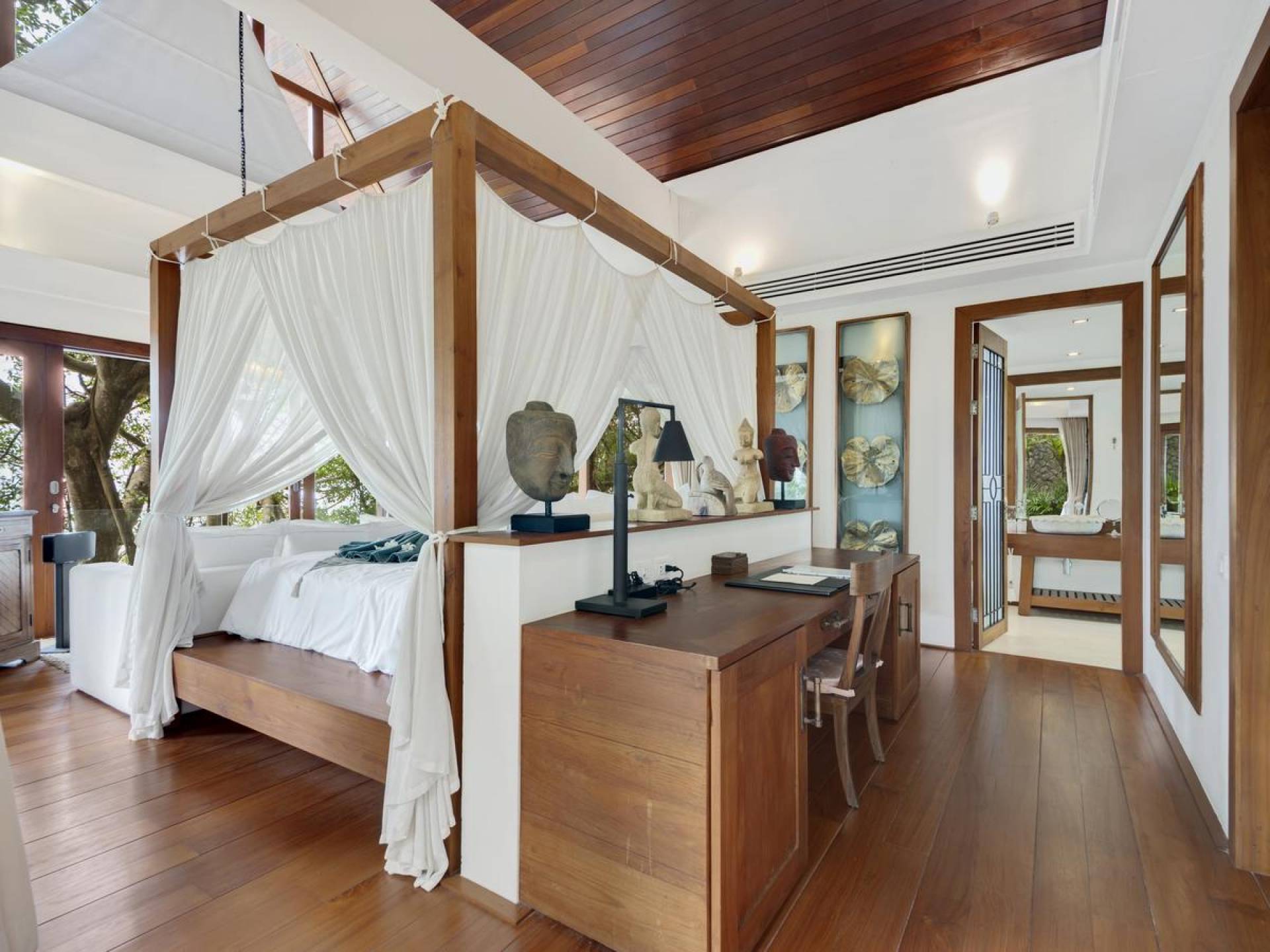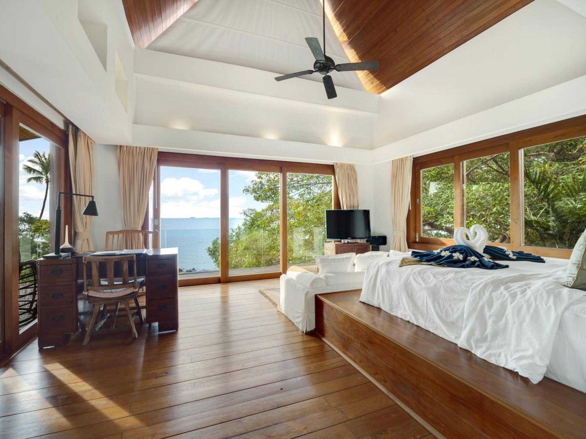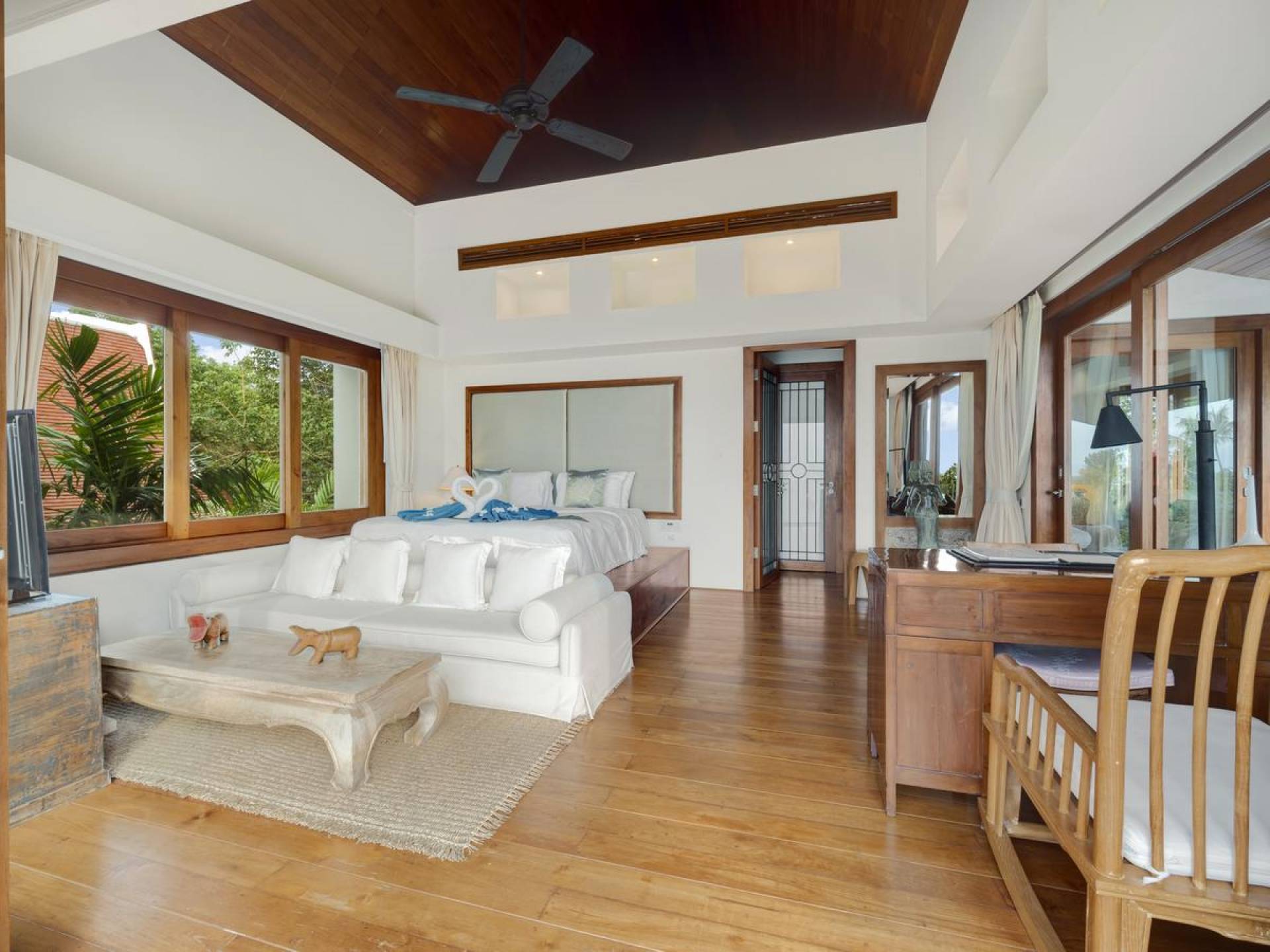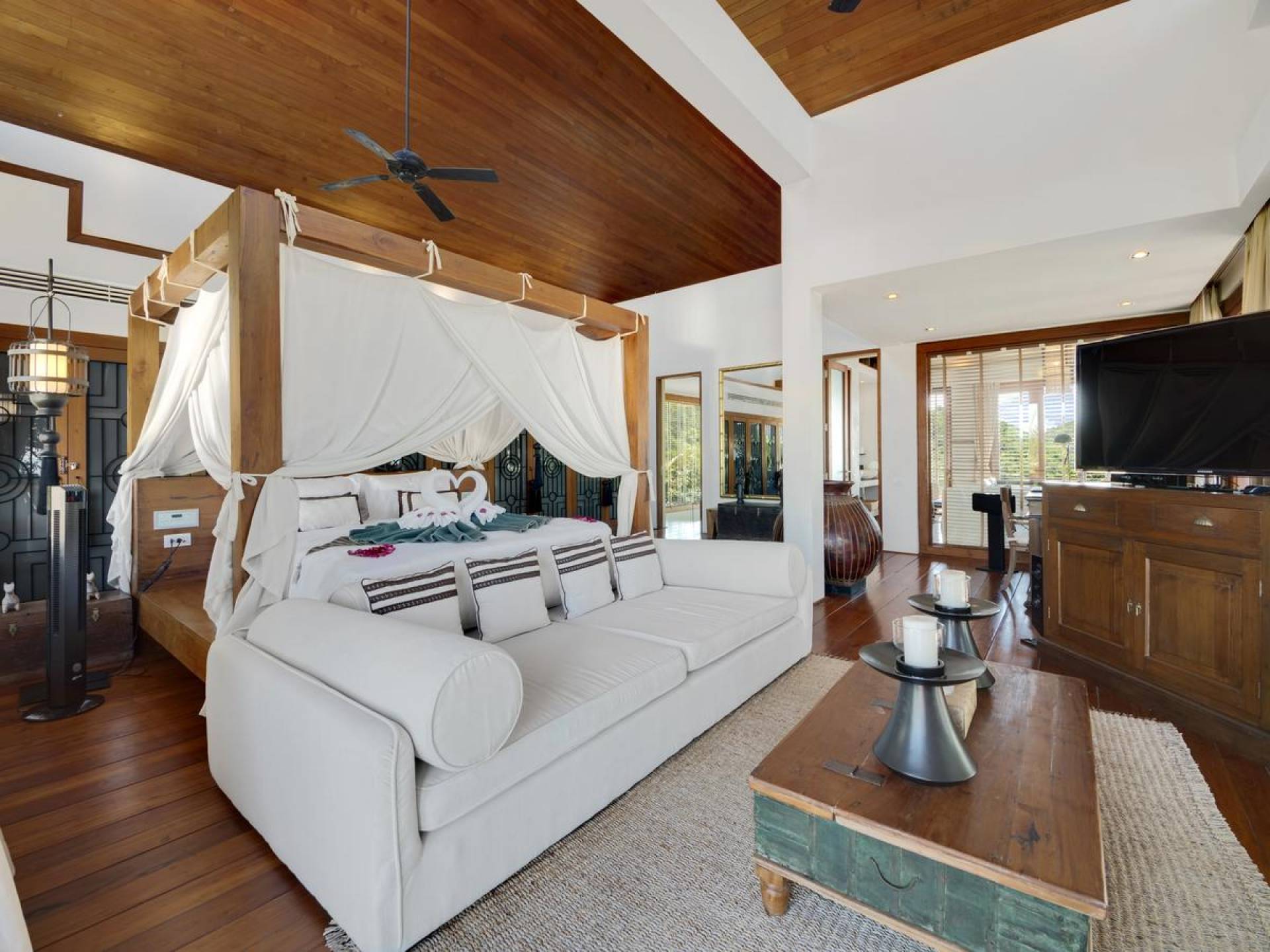 Η Master Villa περιλαμβάνει ένα σαλόνι, μια Grandmaster σουίτα, δύο ευρύχωρες σουίτες επισκεπτών και ένα δωμάτιο για εφήβους ή νταντάδες με δύο μονά κρεβάτια και μπάνιο - Οι τρεις κομψές σουίτες που καταλαμβάνουν τη Master Villa είναι όλες ευρύχωρες, πολυτελείς και διακοσμημένο με εντυπωσιακή σύγχρονη ασιατική τέχνη και συλλεκτικά αντικείμενα. - Καθώς περνάτε από το σαλόνι, οι δύο σουίτες στον πρώτο όροφο προσφέρουν ένα ευρύχωρο υπνοδωμάτιο και χώρους καθιστικού, καθώς και απολαυστικά μπάνια με μεγάλες μπανιέρες. Μία από αυτές τις σουίτες και το δικό της μπάνιο έχει σχεδιαστεί ειδικά με πρόσβαση σε αναπηρικό καροτσάκι για άτομα με μειωμένη κινητικότητα - Η Grand Master σουίτα, που βρίσκεται στο επάνω επίπεδο του περιπτέρου, είναι ακόμη πιο γενναιόδωρη από άποψη χώρου και διαθέτει επίσης ντους μέσα και εξωτερικό. , το τελευταίο με εντυπωσιακή θέα στον αστραφτερό κόλπο από κάτω, το θαλάσσιο πάρκο και τα εκπληκτικά ηλιοβασιλέματα Samui. Το κεντρικό στοιχείο του μπάνιου είναι ένα μεγάλο τζακούζι με υδρομασάζ για να απολαύσετε ένα χαλαρωτικό μπάνιο μετά από μια μέρα έξω. Η σουίτα διαθέτει ευρύχωρη βεράντα με ξαπλώστρες και καναπέ-ξαπλώστρα.