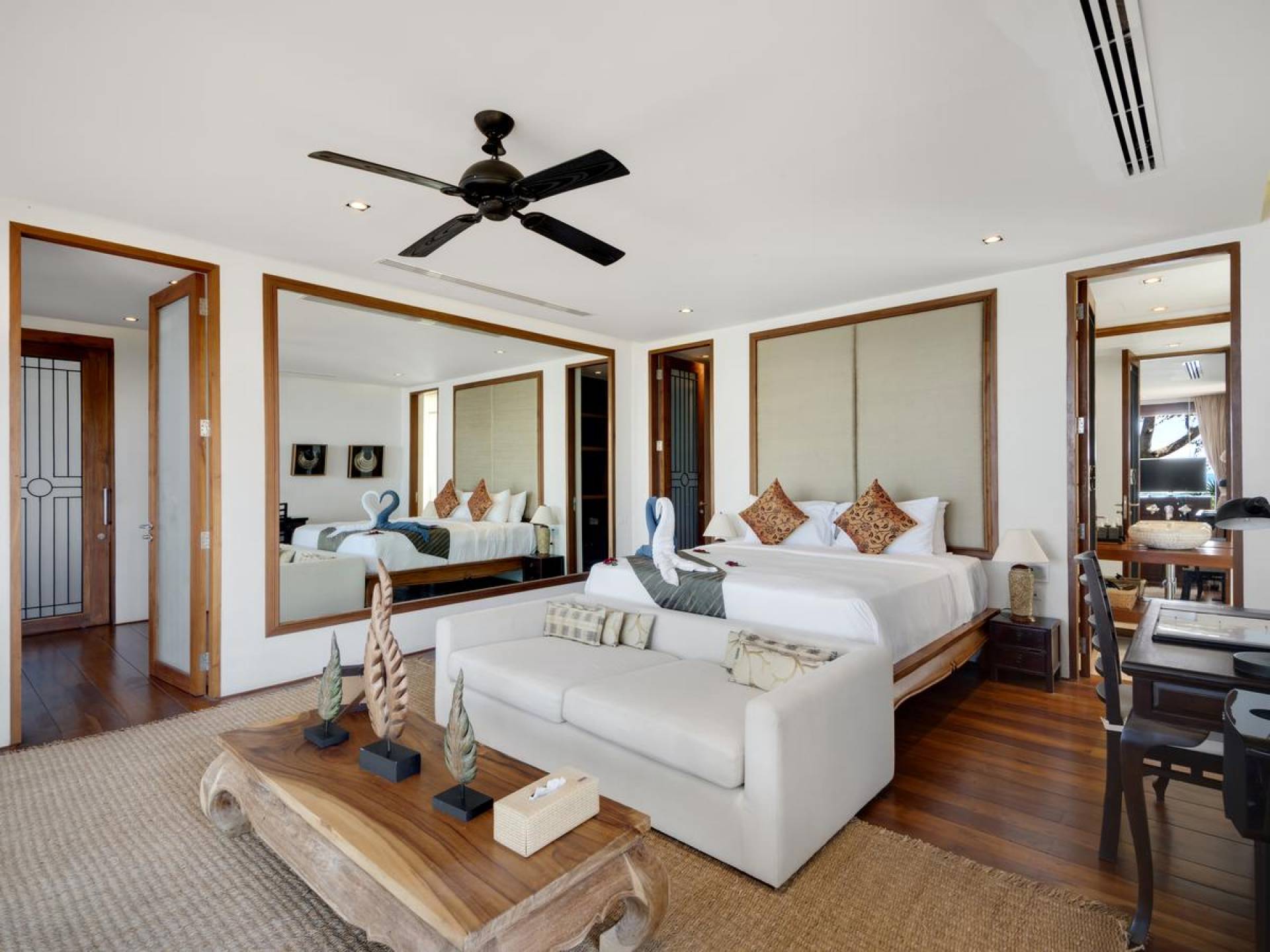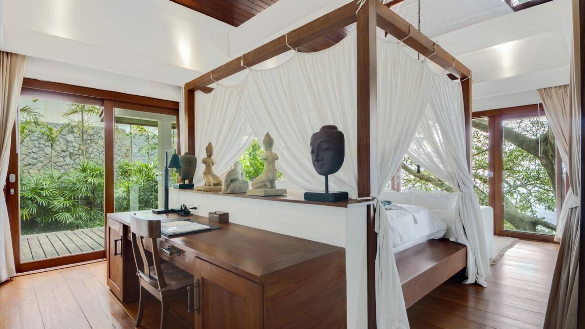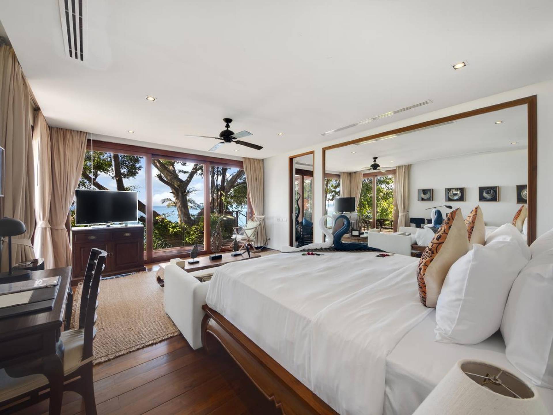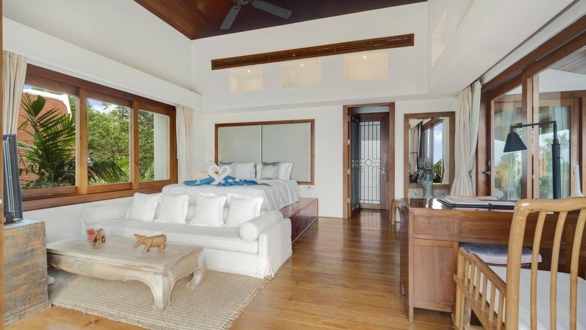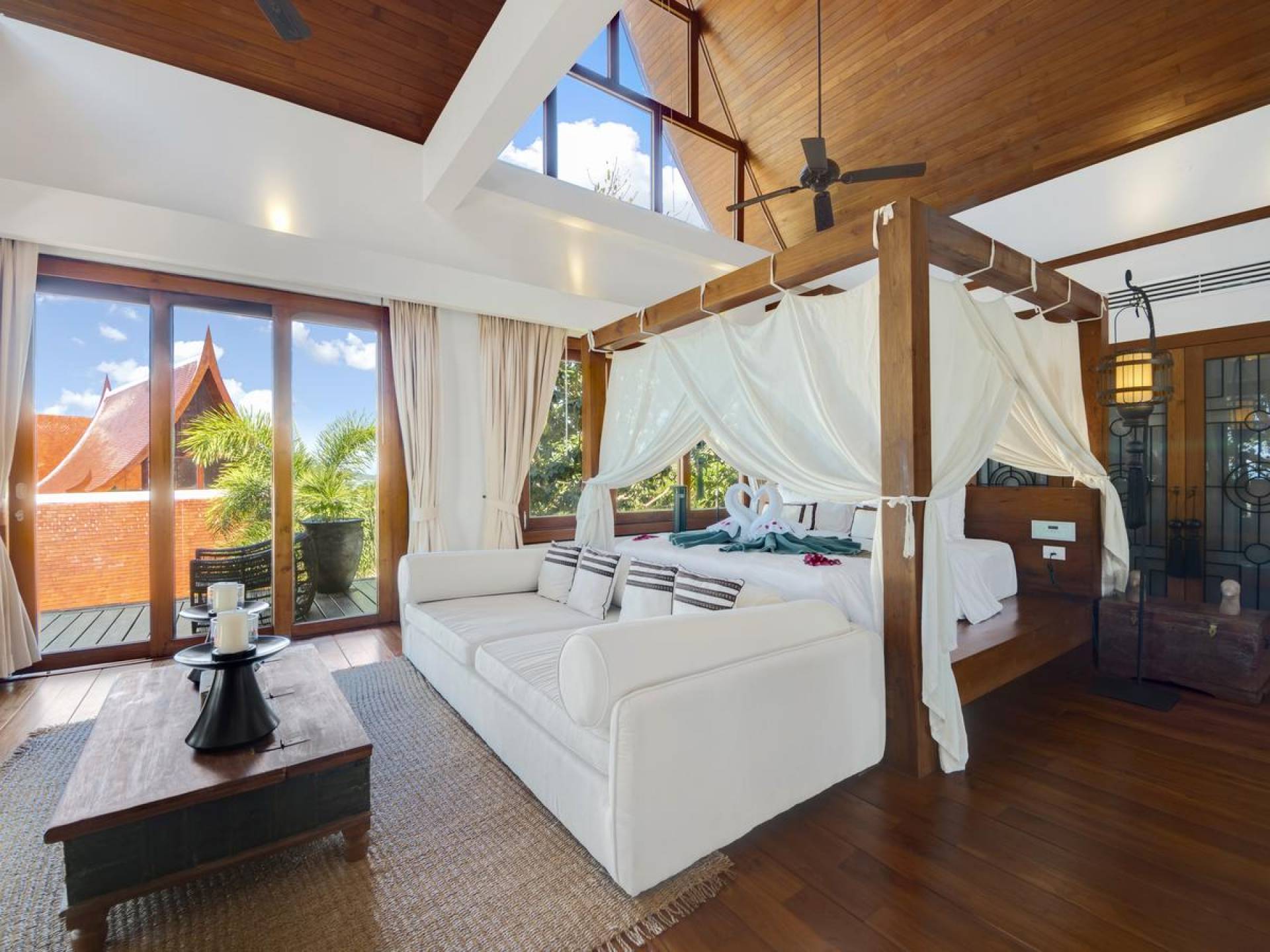 Η Master Villa περιλαμβάνει ένα σαλόνι, μια Grandmaster σουίτα, δύο ευρύχωρες σουίτες επισκεπτών και ένα δωμάτιο για εφήβους ή νταντάδες με δύο μονά κρεβάτια και μπάνιο - Οι τρεις κομψές σουίτες που καταλαμβάνουν τη Master Villa είναι όλες ευρύχωρες, πολυτελείς και διακοσμημένο με εντυπωσιακή σύγχρονη ασιατική τέχνη και συλλεκτικά αντικείμενα. - Καθώς περνάτε από το σαλόνι, οι δύο σουίτες στον πρώτο όροφο προσφέρουν ένα ευρύχωρο υπνοδωμάτιο και χώρους καθιστικού, καθώς και απολαυστικά μπάνια με μεγάλες μπανιέρες. Μία από αυτές τις σουίτες και το δικό της μπάνιο έχει σχεδιαστεί ειδικά με πρόσβαση σε αναπηρικό καροτσάκι για άτομα με μειωμένη κινητικότητα - Η Grand Master σουίτα, που βρίσκεται στο επάνω επίπεδο του περιπτέρου, είναι ακόμη πιο γενναιόδωρη από άποψη χώρου και διαθέτει επίσης ντους μέσα και εξωτερικό. , το τελευταίο με εντυπωσιακή θέα στον αστραφτερό κόλπο από κάτω, το θαλάσσιο πάρκο και τα εκπληκτικά ηλιοβασιλέματα Samui. Το κεντρικό στοιχείο του μπάνιου είναι ένα μεγάλο τζακούζι με υδρομασάζ για να απολαύσετε ένα χαλαρωτικό μπάνιο μετά από μια μέρα έξω. Η σουίτα διαθέτει ευρύχωρη βεράντα με ξαπλώστρες και καναπέ-ξαπλώστρα.