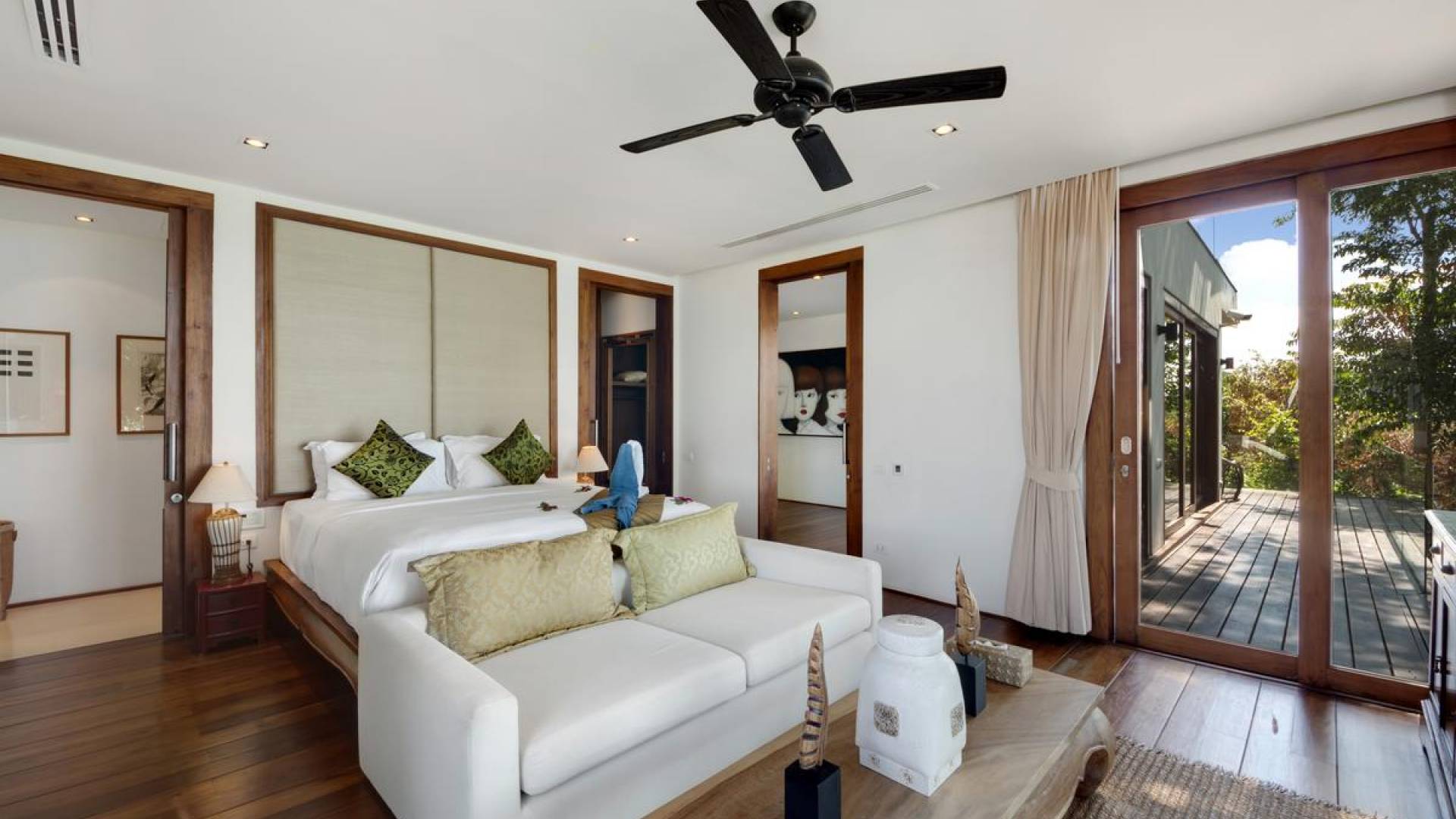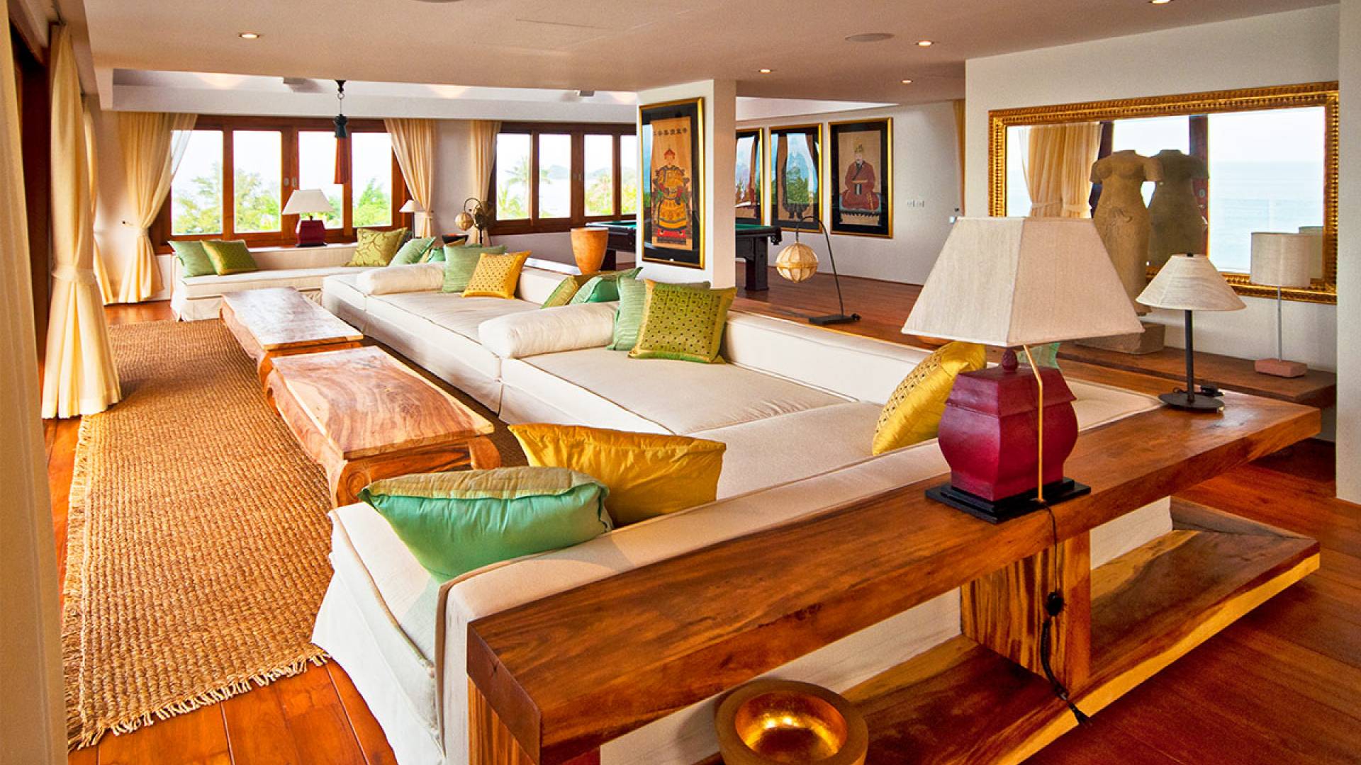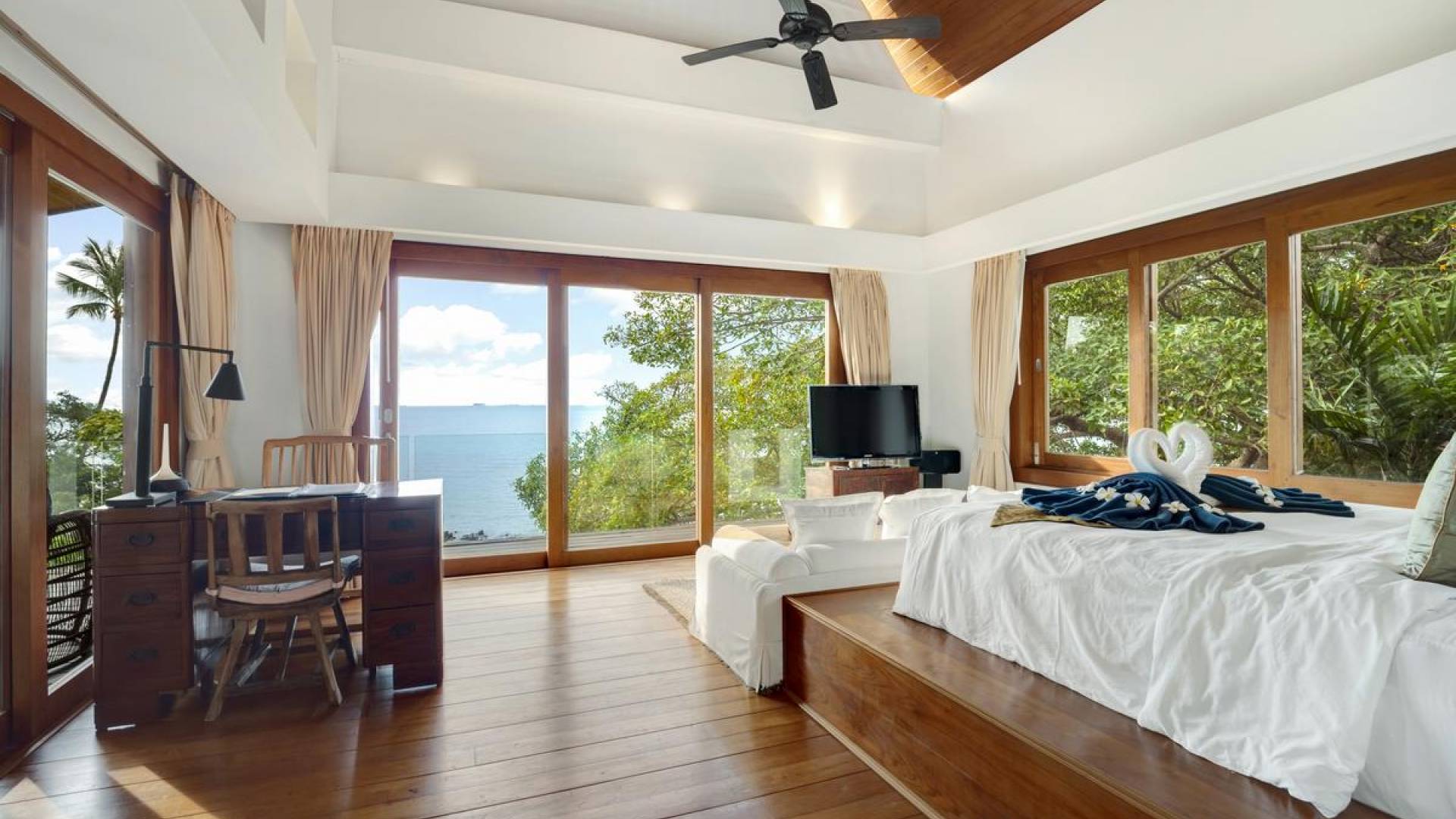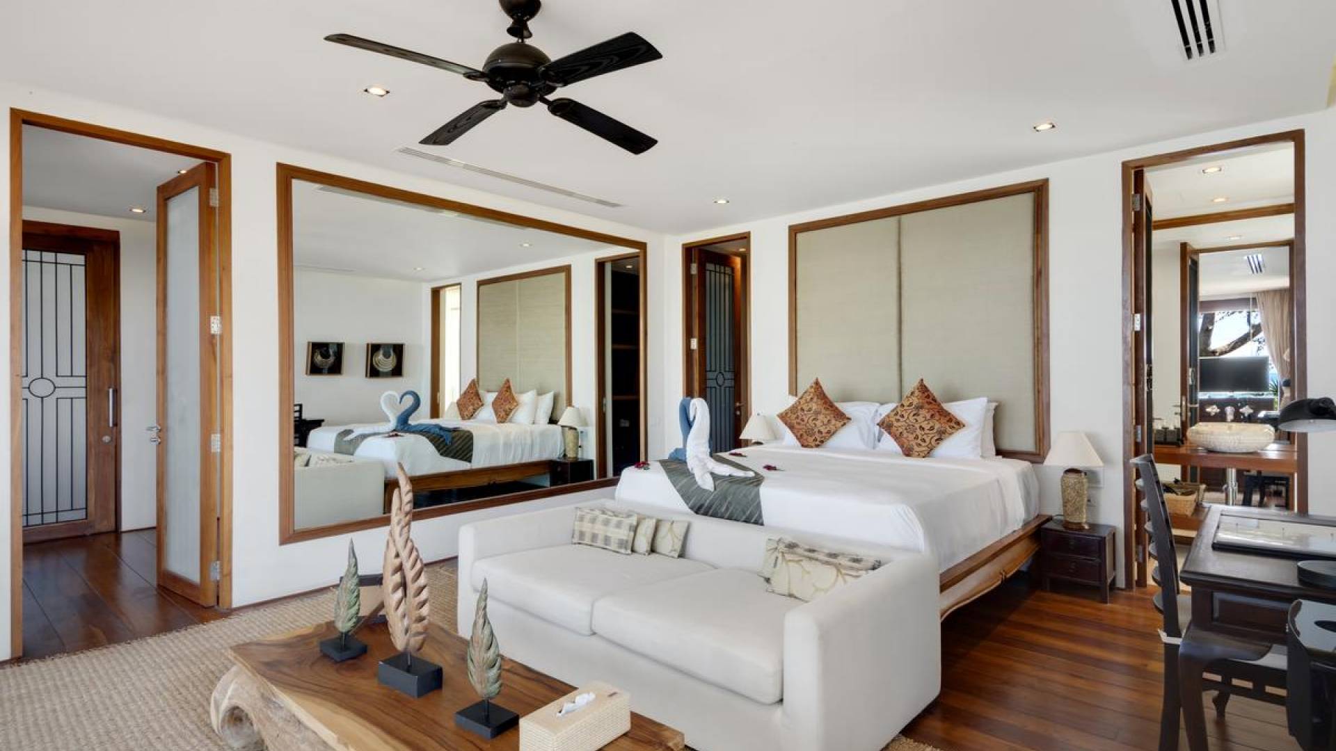Η Master Villa περιλαμβάνει ένα σαλόνι, μια Grandmaster σουίτα, δύο ευρύχωρες σουίτες επισκεπτών και ένα δωμάτιο για εφήβους ή νταντάδες με δύο μονά κρεβάτια και μπάνιο - Οι τρεις κομψές σουίτες που καταλαμβάνουν τη Master Villa είναι όλες ευρύχωρες, πολυτελείς και διακοσμημένο με εντυπωσιακή σύγχρονη ασιατική τέχνη και συλλεκτικά αντικείμενα. - Καθώς περνάτε από το σαλόνι, οι δύο σουίτες στον πρώτο όροφο προσφέρουν ένα ευρύχωρο υπνοδωμάτιο και χώρους καθιστικού, καθώς και απολαυστικά μπάνια με μεγάλες μπανιέρες. Μία από αυτές τις σουίτες και το δικό της μπάνιο έχει σχεδιαστεί ειδικά με πρόσβαση σε αναπηρικό καροτσάκι για άτομα με μειωμένη κινητικότητα - Η Grand Master σουίτα, που βρίσκεται στο επάνω επίπεδο του περιπτέρου, είναι ακόμη πιο γενναιόδωρη από άποψη χώρου και διαθέτει επίσης ντους μέσα και εξωτερικό. , το τελευταίο με εντυπωσιακή θέα στον αστραφτερό κόλπο από κάτω, το θαλάσσιο πάρκο και τα εκπληκτικά ηλιοβασιλέματα Samui. Το κεντρικό στοιχείο του μπάνιου είναι ένα μεγάλο τζακούζι με υδρομασάζ για να απολαύσετε ένα χαλαρωτικό μπάνιο μετά από μια μέρα έξω. Η σουίτα διαθέτει ευρύχωρη βεράντα με ξαπλώστρες και καναπέ-ξαπλώστρα.