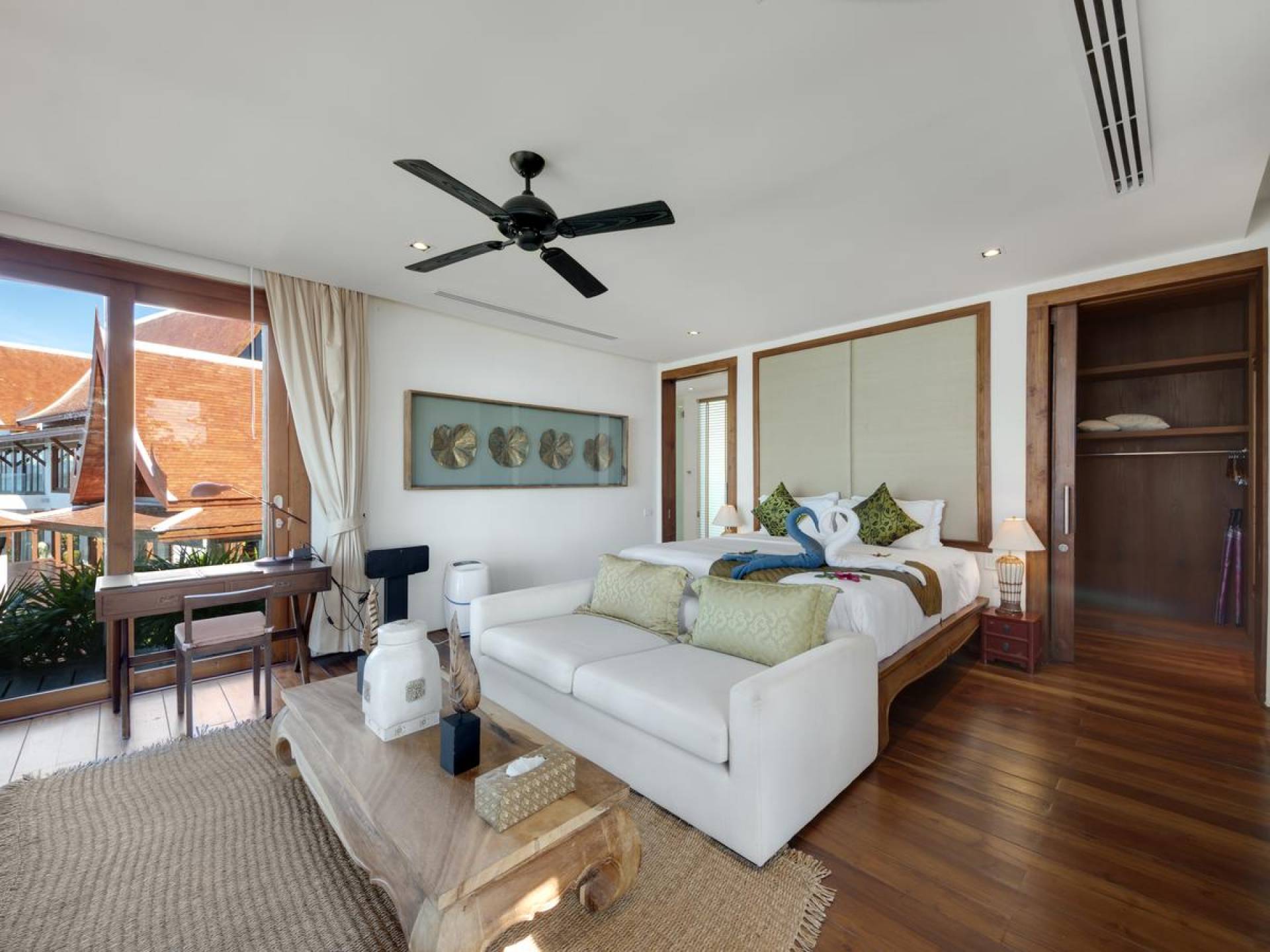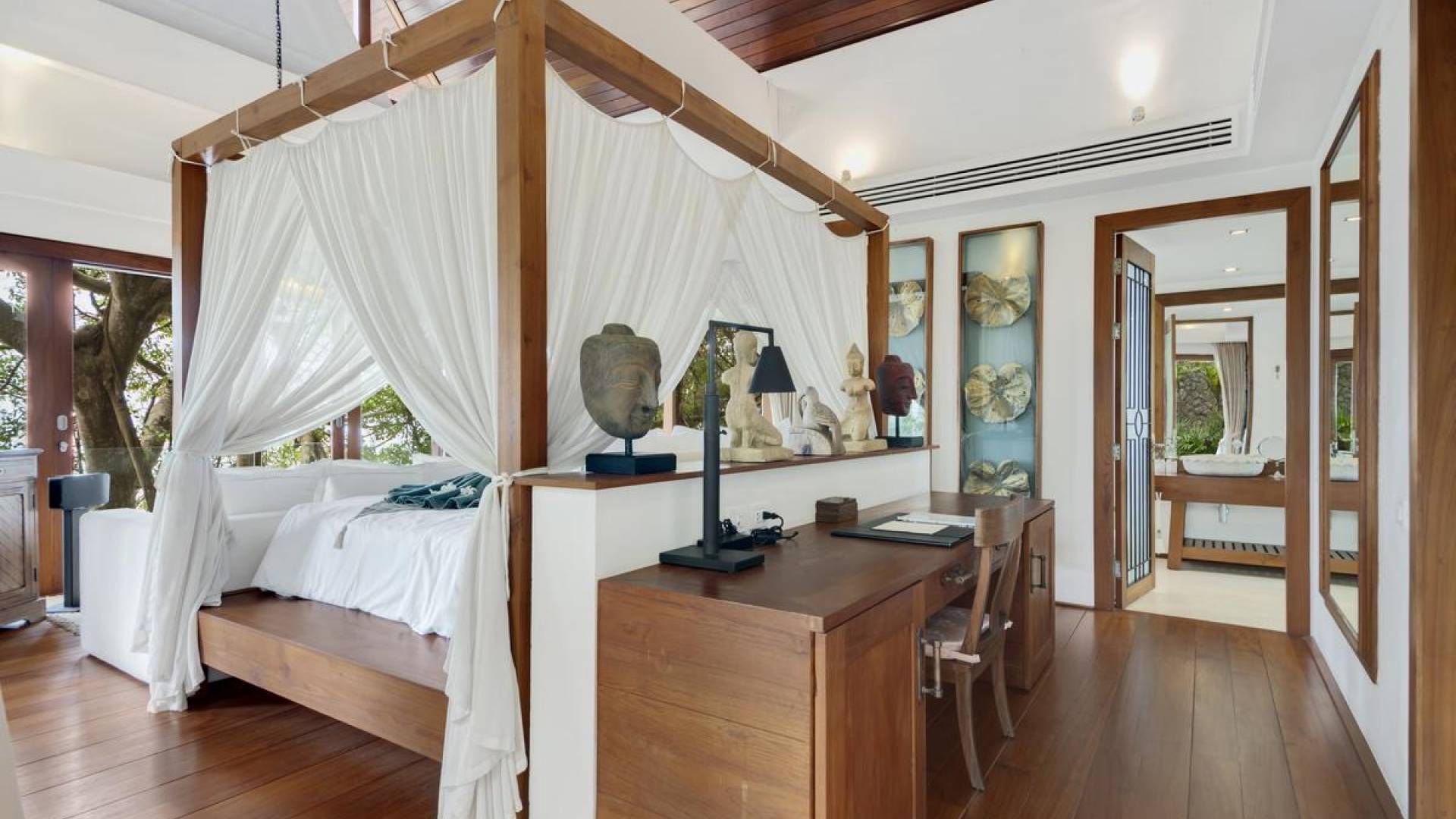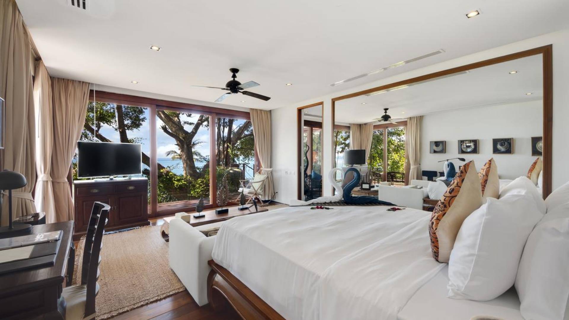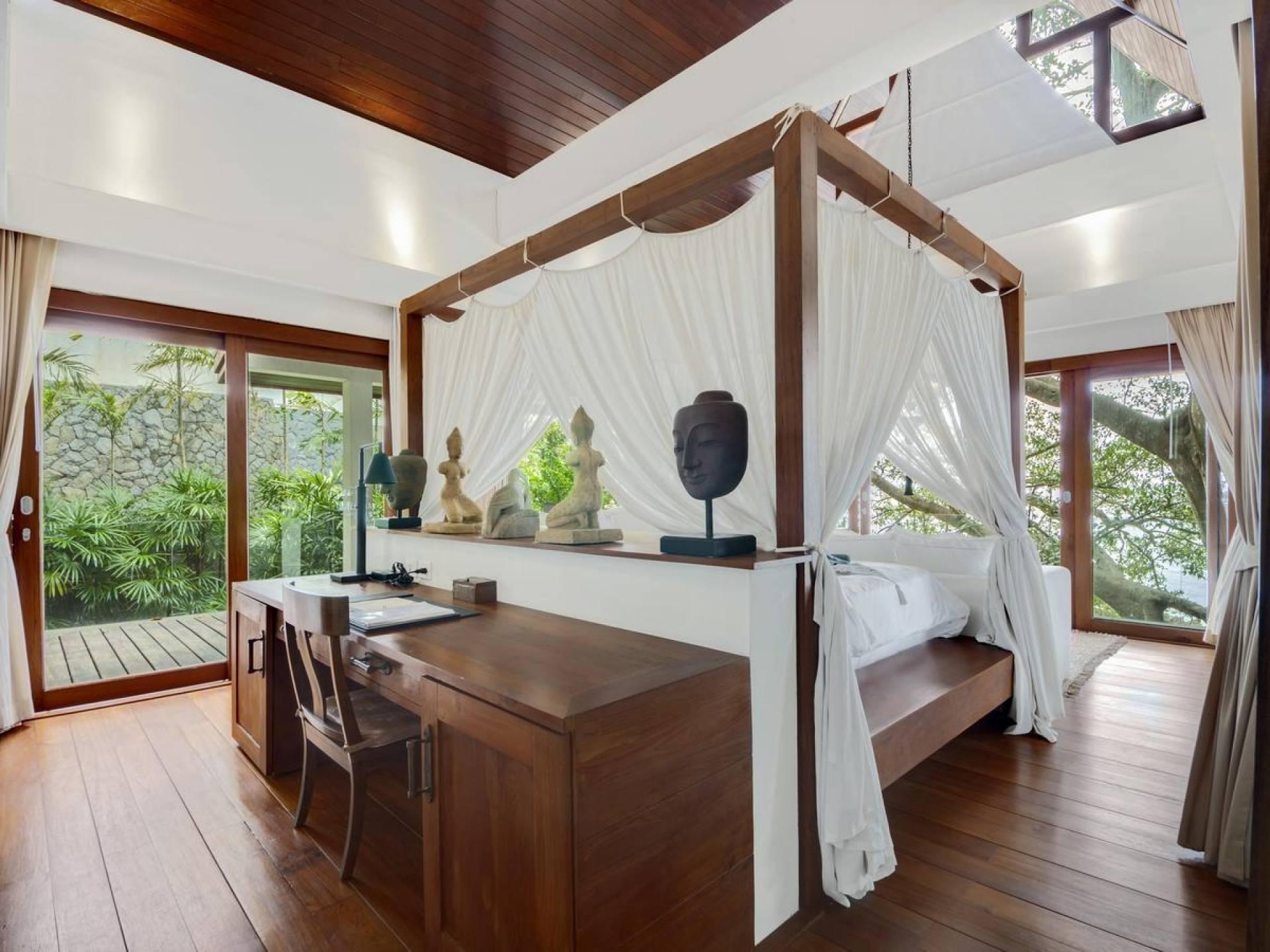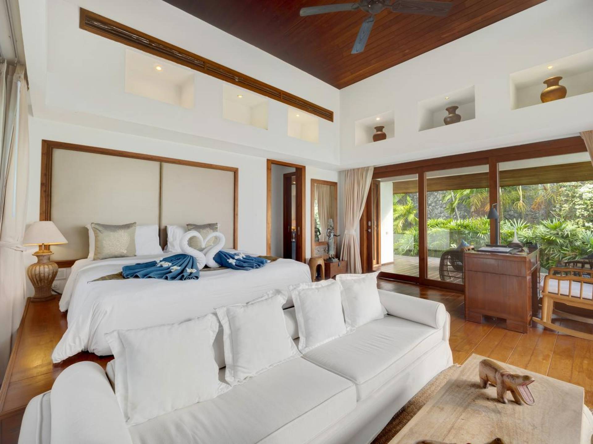 Η Master Villa περιλαμβάνει ένα σαλόνι, μια Grandmaster σουίτα, δύο ευρύχωρες σουίτες επισκεπτών και ένα δωμάτιο για εφήβους ή νταντάδες με δύο μονά κρεβάτια και μπάνιο - Οι τρεις κομψές σουίτες που καταλαμβάνουν τη Master Villa είναι όλες ευρύχωρες, πολυτελείς και διακοσμημένο με εντυπωσιακή σύγχρονη ασιατική τέχνη και συλλεκτικά αντικείμενα. - Καθώς περνάτε από το σαλόνι, οι δύο σουίτες στον πρώτο όροφο προσφέρουν ένα ευρύχωρο υπνοδωμάτιο και χώρους καθιστικού, καθώς και απολαυστικά μπάνια με μεγάλες μπανιέρες. Μία από αυτές τις σουίτες και το δικό της μπάνιο έχει σχεδιαστεί ειδικά με πρόσβαση σε αναπηρικό καροτσάκι για άτομα με μειωμένη κινητικότητα - Η Grand Master σουίτα, που βρίσκεται στο επάνω επίπεδο του περιπτέρου, είναι ακόμη πιο γενναιόδωρη από άποψη χώρου και διαθέτει επίσης ντους μέσα και εξωτερικό. , το τελευταίο με εντυπωσιακή θέα στον αστραφτερό κόλπο από κάτω, το θαλάσσιο πάρκο και τα εκπληκτικά ηλιοβασιλέματα Samui. Το κεντρικό στοιχείο του μπάνιου είναι ένα μεγάλο τζακούζι με υδρομασάζ για να απολαύσετε ένα χαλαρωτικό μπάνιο μετά από μια μέρα έξω. Η σουίτα διαθέτει ευρύχωρη βεράντα με ξαπλώστρες και καναπέ-ξαπλώστρα.