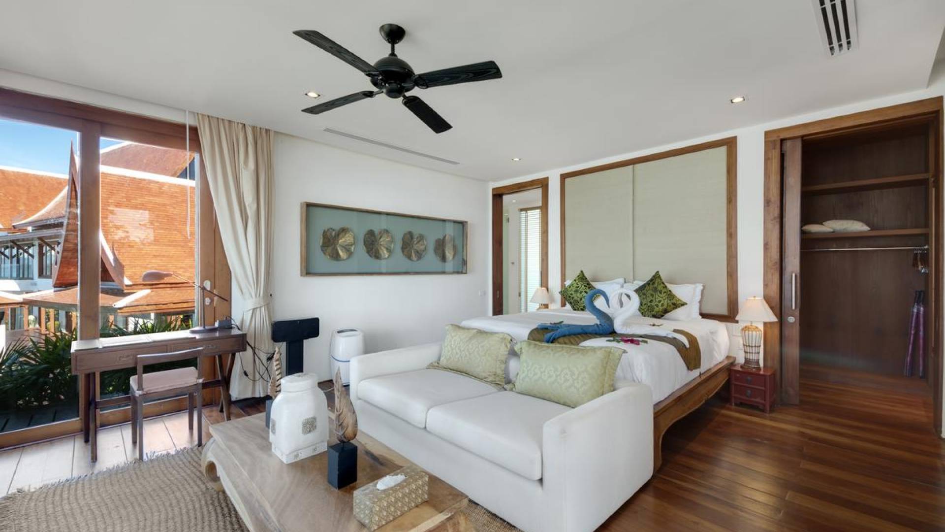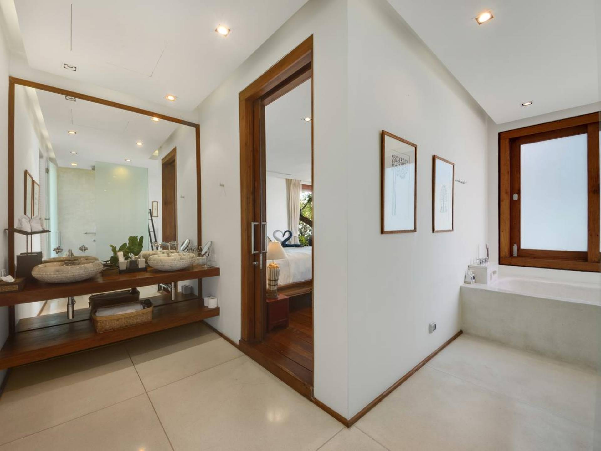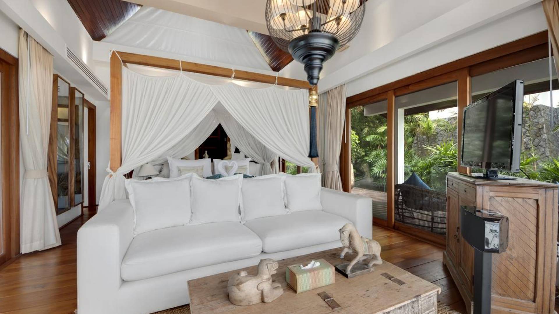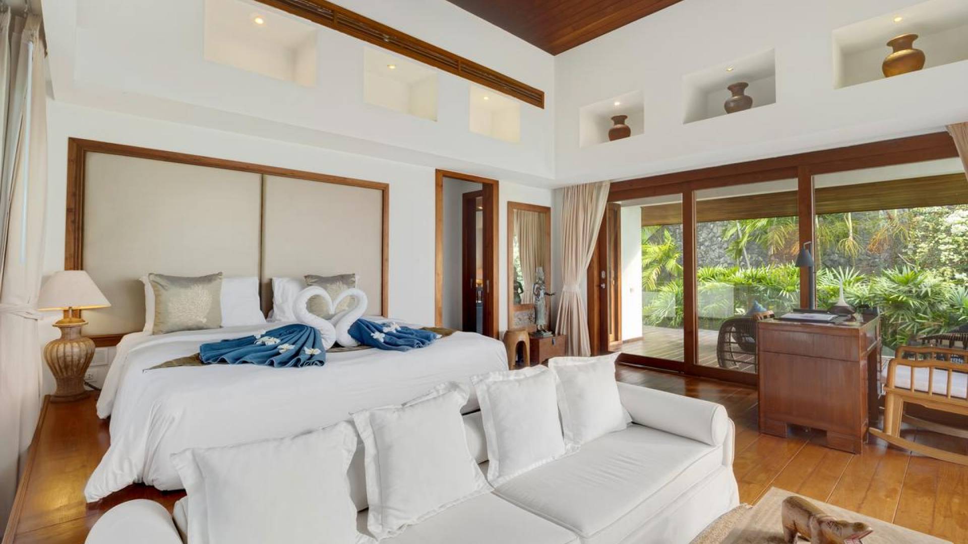 Η Master Villa περιλαμβάνει ένα σαλόνι, μια Grandmaster σουίτα, δύο ευρύχωρες σουίτες επισκεπτών και ένα δωμάτιο για εφήβους ή νταντάδες με δύο μονά κρεβάτια και μπάνιο - Οι τρεις κομψές σουίτες που καταλαμβάνουν τη Master Villa είναι όλες ευρύχωρες, πολυτελείς και διακοσμημένο με εντυπωσιακή σύγχρονη ασιατική τέχνη και συλλεκτικά αντικείμενα. - Καθώς περνάτε από το σαλόνι, οι δύο σουίτες στον πρώτο όροφο προσφέρουν ένα ευρύχωρο υπνοδωμάτιο και χώρους καθιστικού, καθώς και απολαυστικά μπάνια με μεγάλες μπανιέρες. Μία από αυτές τις σουίτες και το δικό της μπάνιο έχει σχεδιαστεί ειδικά με πρόσβαση σε αναπηρικό καροτσάκι για άτομα με μειωμένη κινητικότητα - Η Grand Master σουίτα, που βρίσκεται στο επάνω επίπεδο του περιπτέρου, είναι ακόμη πιο γενναιόδωρη από άποψη χώρου και διαθέτει επίσης ντους μέσα και εξωτερικό. , το τελευταίο με εντυπωσιακή θέα στον αστραφτερό κόλπο από κάτω, το θαλάσσιο πάρκο και τα εκπληκτικά ηλιοβασιλέματα Samui. Το κεντρικό στοιχείο του μπάνιου είναι ένα μεγάλο τζακούζι με υδρομασάζ για να απολαύσετε ένα χαλαρωτικό μπάνιο μετά από μια μέρα έξω. Η σουίτα διαθέτει ευρύχωρη βεράντα με ξαπλώστρες και καναπέ-ξαπλώστρα.
