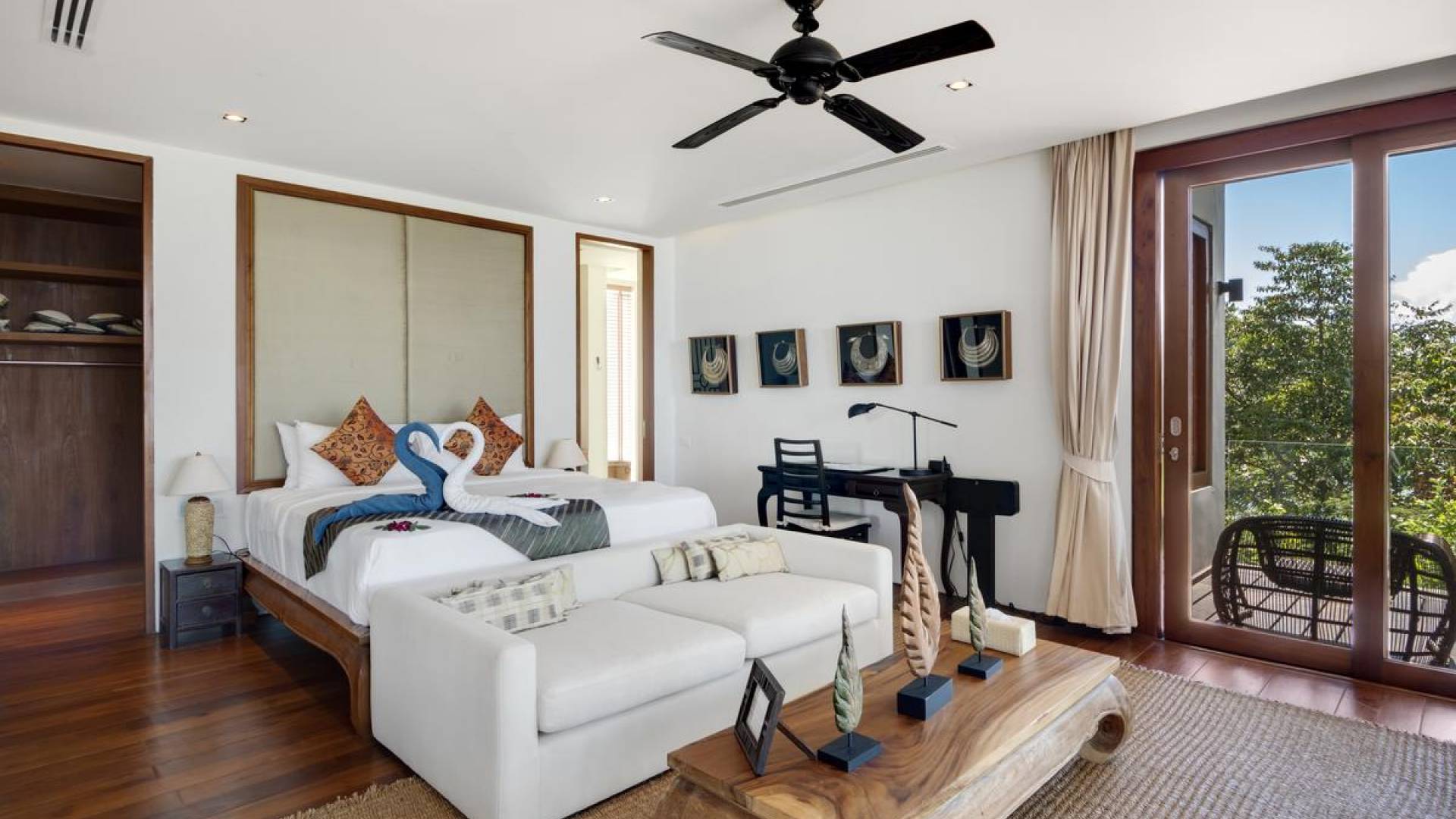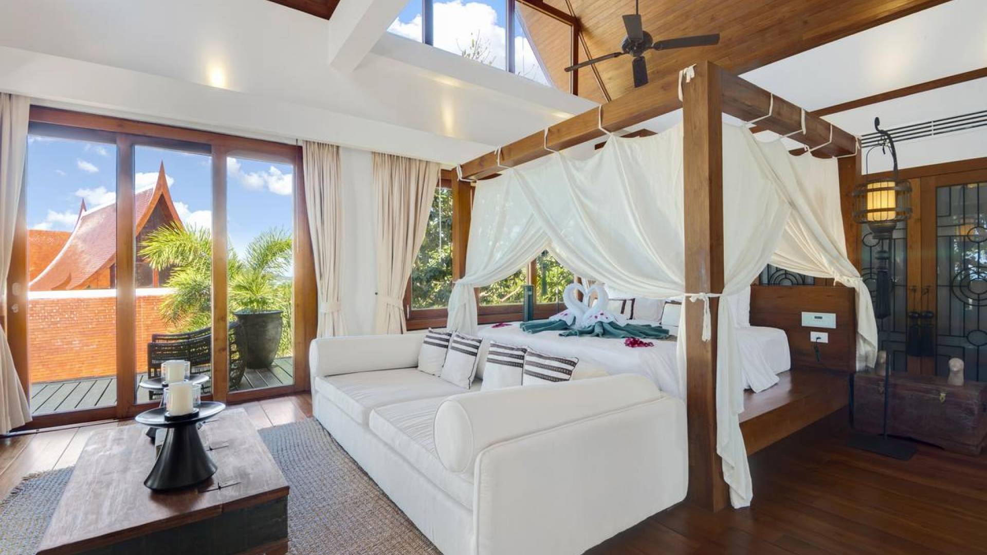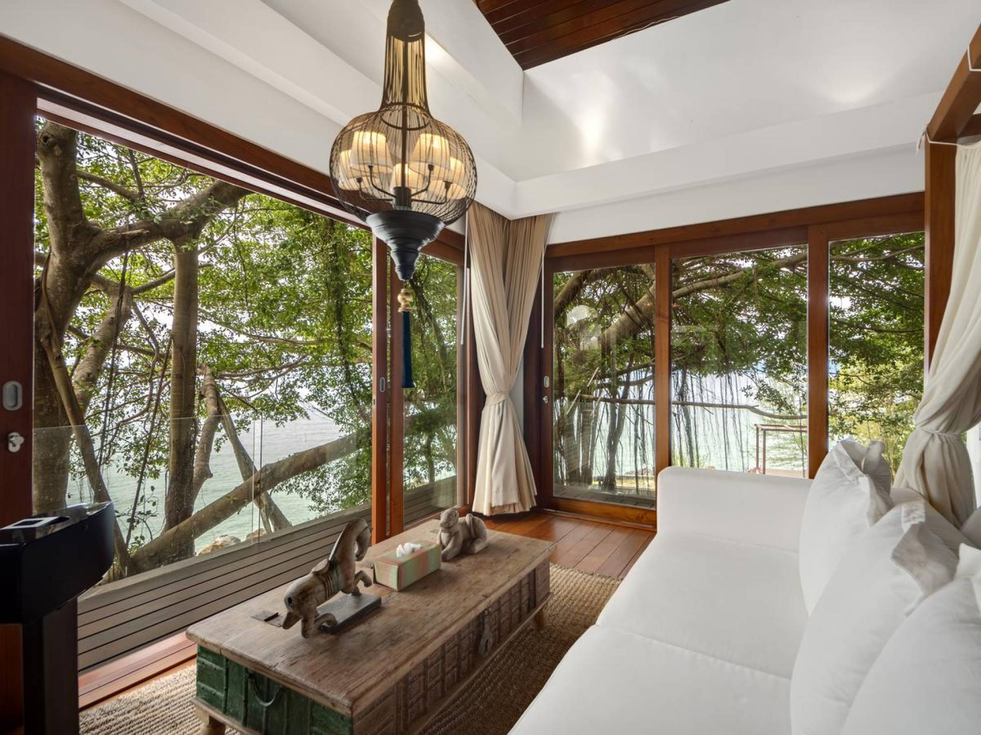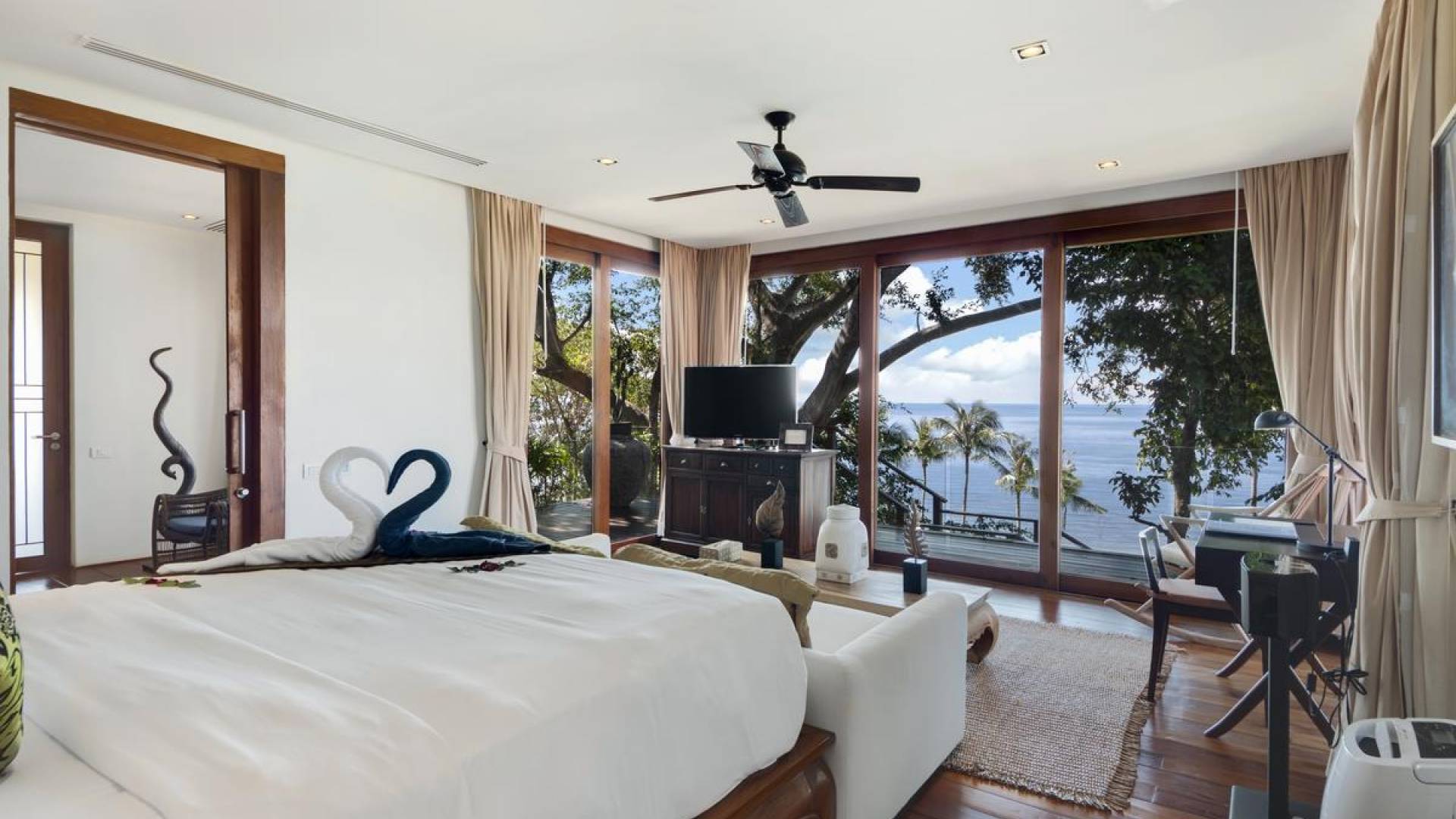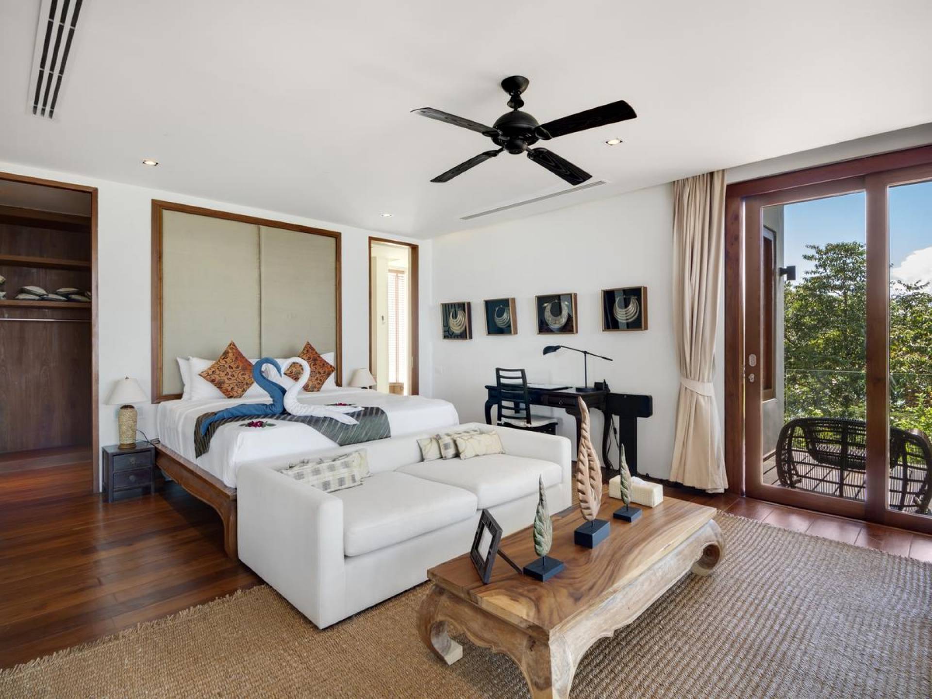 Η Master Villa περιλαμβάνει ένα σαλόνι, μια Grandmaster σουίτα, δύο ευρύχωρες σουίτες επισκεπτών και ένα δωμάτιο για εφήβους ή νταντάδες με δύο μονά κρεβάτια και μπάνιο - Οι τρεις κομψές σουίτες που καταλαμβάνουν τη Master Villa είναι όλες ευρύχωρες, πολυτελείς και διακοσμημένο με εντυπωσιακή σύγχρονη ασιατική τέχνη και συλλεκτικά αντικείμενα. - Καθώς περνάτε από το σαλόνι, οι δύο σουίτες στον πρώτο όροφο προσφέρουν ένα ευρύχωρο υπνοδωμάτιο και χώρους καθιστικού, καθώς και απολαυστικά μπάνια με μεγάλες μπανιέρες. Μία από αυτές τις σουίτες και το δικό της μπάνιο έχει σχεδιαστεί ειδικά με πρόσβαση σε αναπηρικό καροτσάκι για άτομα με μειωμένη κινητικότητα - Η Grand Master σουίτα, που βρίσκεται στο επάνω επίπεδο του περιπτέρου, είναι ακόμη πιο γενναιόδωρη από άποψη χώρου και διαθέτει επίσης ντους μέσα και εξωτερικό. , το τελευταίο με εντυπωσιακή θέα στον αστραφτερό κόλπο από κάτω, το θαλάσσιο πάρκο και τα εκπληκτικά ηλιοβασιλέματα Samui. Το κεντρικό στοιχείο του μπάνιου είναι ένα μεγάλο τζακούζι με υδρομασάζ για να απολαύσετε ένα χαλαρωτικό μπάνιο μετά από μια μέρα έξω. Η σουίτα διαθέτει ευρύχωρη βεράντα με ξαπλώστρες και καναπέ-ξαπλώστρα.