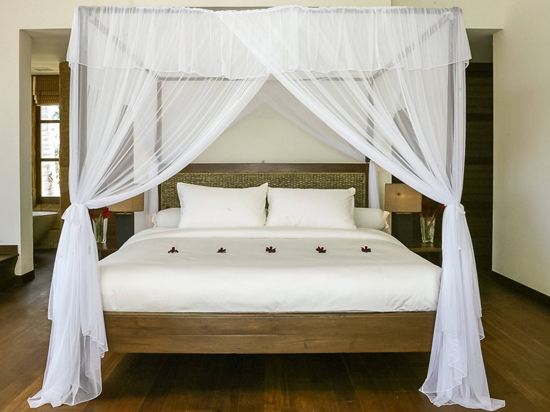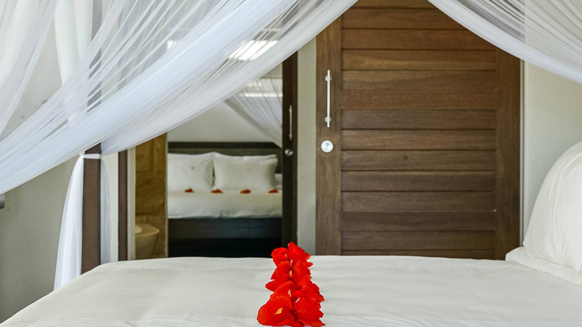 Μπαίνοντας στον πρώτο από τους δύο κύριους διαδρόμους που ρέουν εκατέρωθεν της βίλας, μπορείτε να βρείτε το πρώτο υπνοδωμάτιο με 2 μονά κρεβάτια, επιφάνεια εργασίας, ιδιωτικό μπάνιο με ντους και τουαλέτα και συρόμενες πόρτες προς το μπάνιο πισίνα και το κατάστρωμα της. Πιο κάτω βρίσκεται το υπνοδωμάτιο με την κύρια σουίτα. Στο διάδρομο, βρίσκετε μεγάλες ντουλάπες και το μπάνιο σχεδιασμένο με δύο μοντέρνους νιπτήρες, μια οβάλ μπανιέρα με θέα στη θάλασσα και ένα ξεχωριστό ντους και τουαλέτα. Από τη σουίτα, απολαμβάνετε τη θέα στη θάλασσα και τις συρόμενες πόρτες στη βεράντα και την πισίνα.