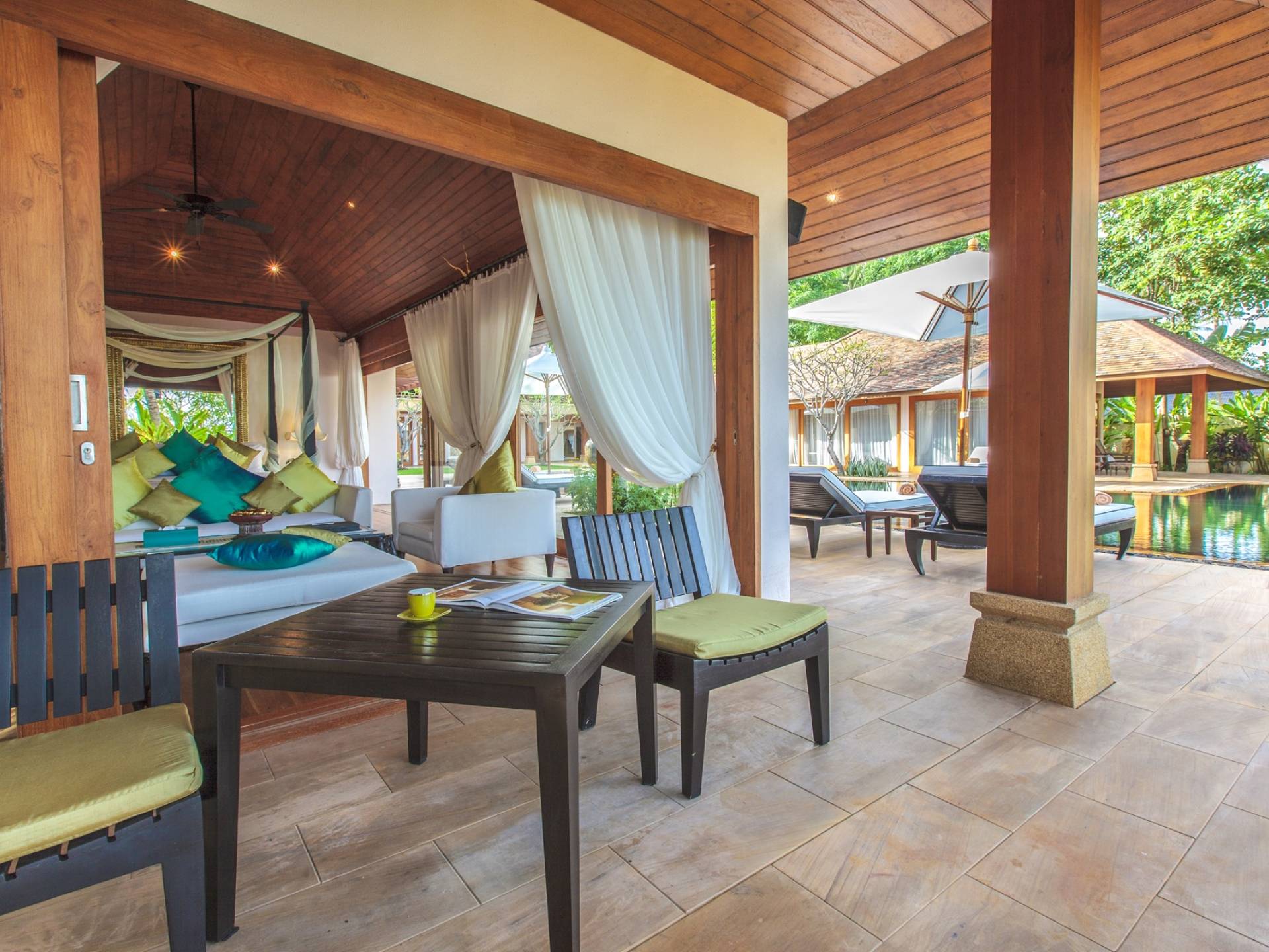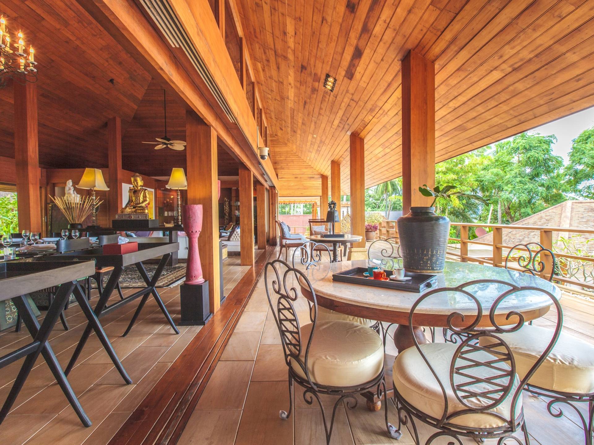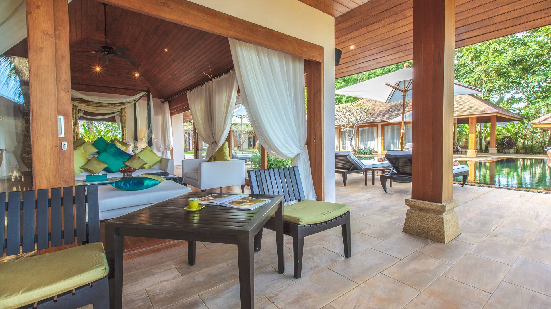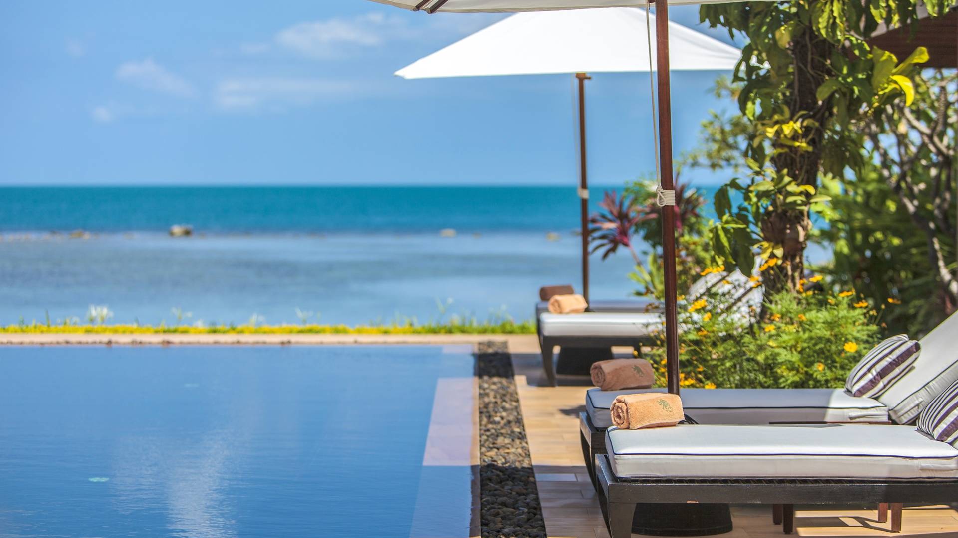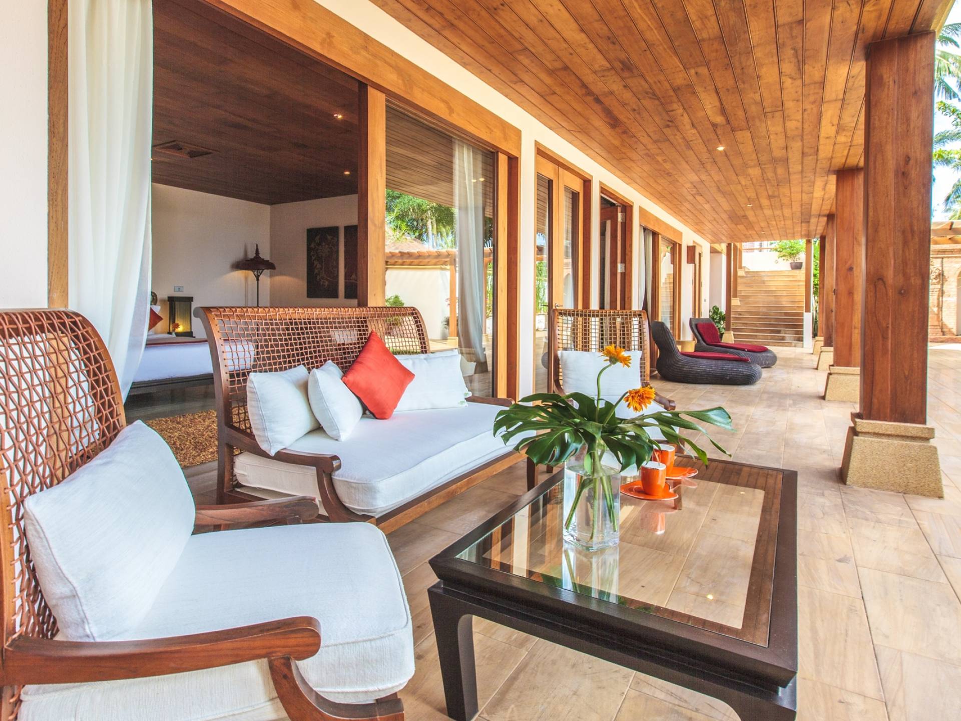 Οι μεγάλες σκεπαστές γύρω βεράντες προσφέρουν χαλαρούς χώρους χαλάρωσης έξω από τη ζέστη της ημέρας, ενώ οι λάτρεις του μπρονζέ σωματότυπου μπορούν να απολαύσουν την πλήρη δόξα του ήλιου στις βεράντες της πισίνας ή την άχνη άμμο της παραλίας Laem Sor. Ο κήπος αστράφτει με την απλή κομψότητα της εξωτικής παραθαλάσσιας ζωής. Ζωντανές ορχιδέες προσκολλώνται σε κάθε φοίνικα καθώς οι αυτόχθονες φυτεύσεις ευδοκιμούν σε αυτό το καταπράσινο τροπικό καταφύγιο.