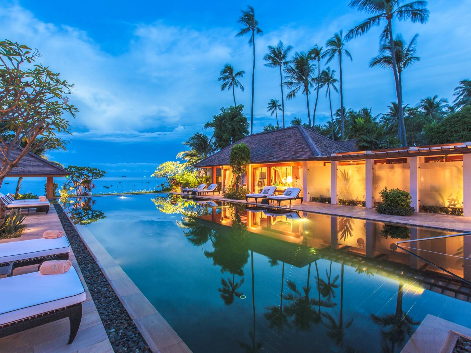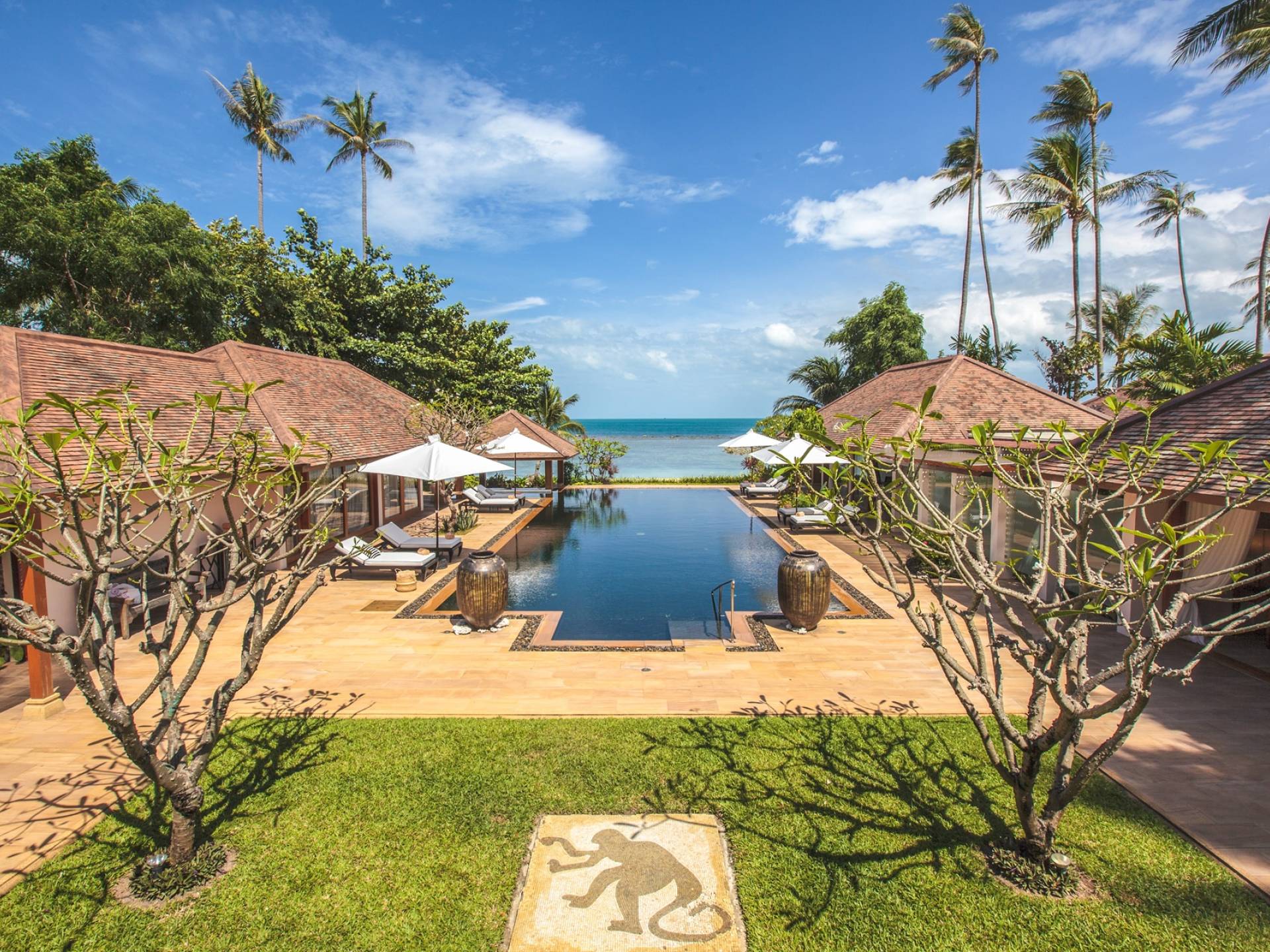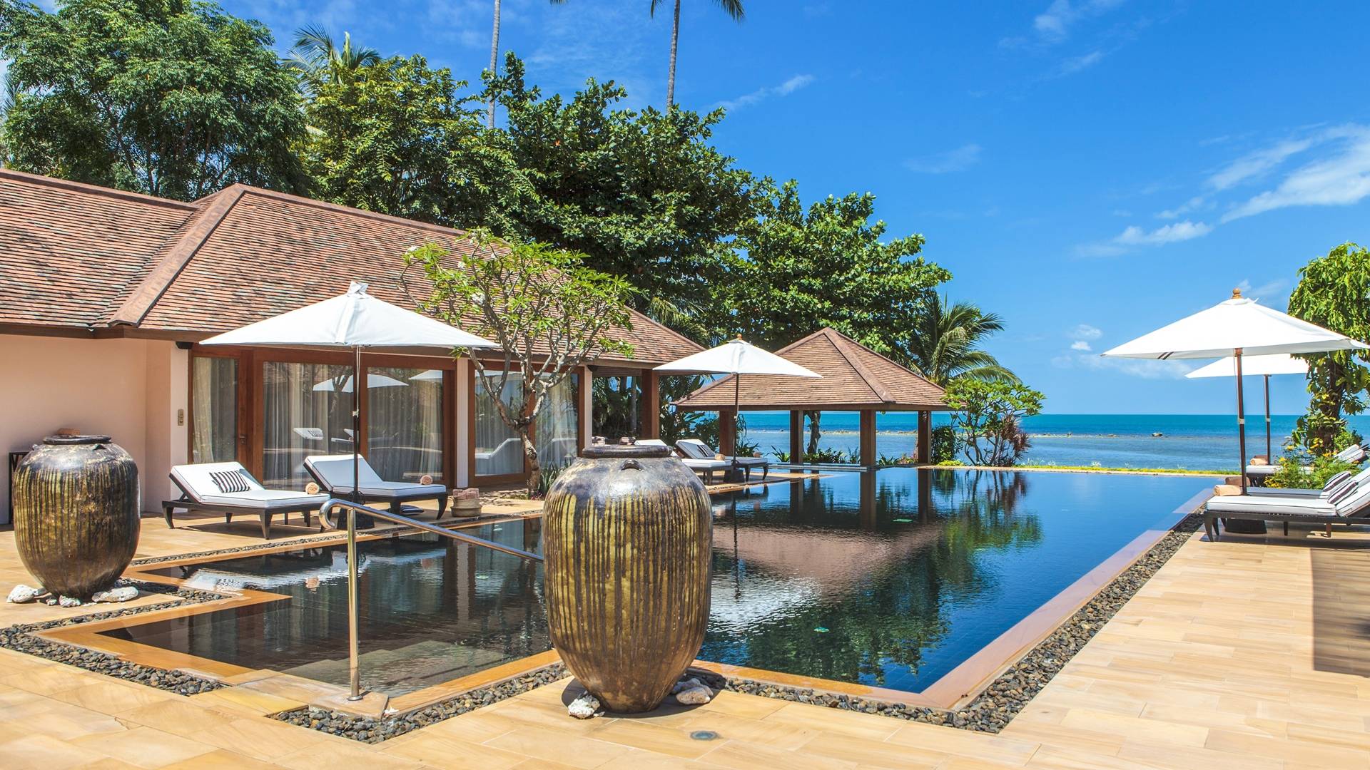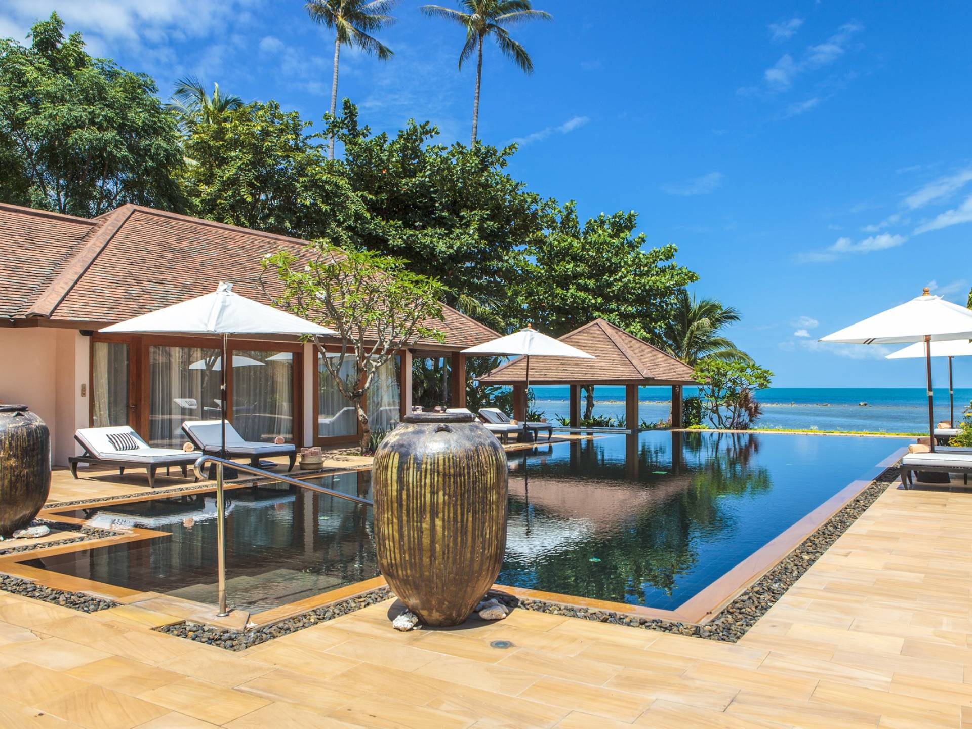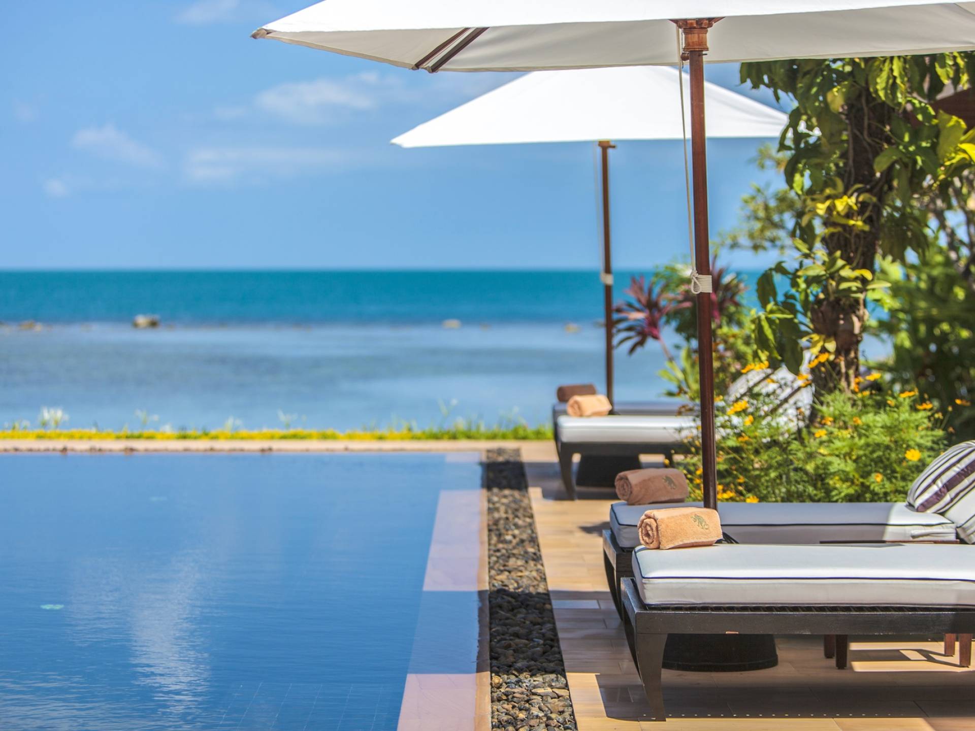 Η γραφική παραθαλάσσια βεράντα της πισίνας με τους φοίνικες που πλαισιώνουν την τέλεια θέα της άμμου και της θάλασσας ακολουθεί τις εντυπωσιακές γραμμές θέασης της εικονικής πισίνας υπερχείλισης μήκους 20 μέτρων με πλακάκια από έβενο. Η εντυπωσιακή πισίνα με θαλασσινό νερό είναι επιβλητικά τοποθετημένη δημιουργώντας ένα κομψό κεντρικό κομμάτι σε αυτόν τον καλοσχεδιασμένο χώρο. Το μπαρ δίπλα στην πισίνα προσθέτει μια ενδιαφέρουσα ανατροπή στον κομψό σχεδιασμό αυτής της χαρισματικής πισίνας.