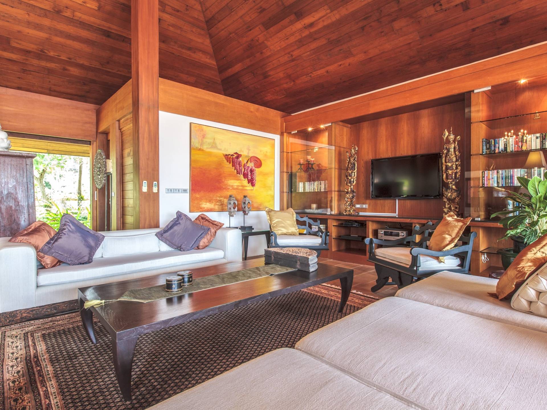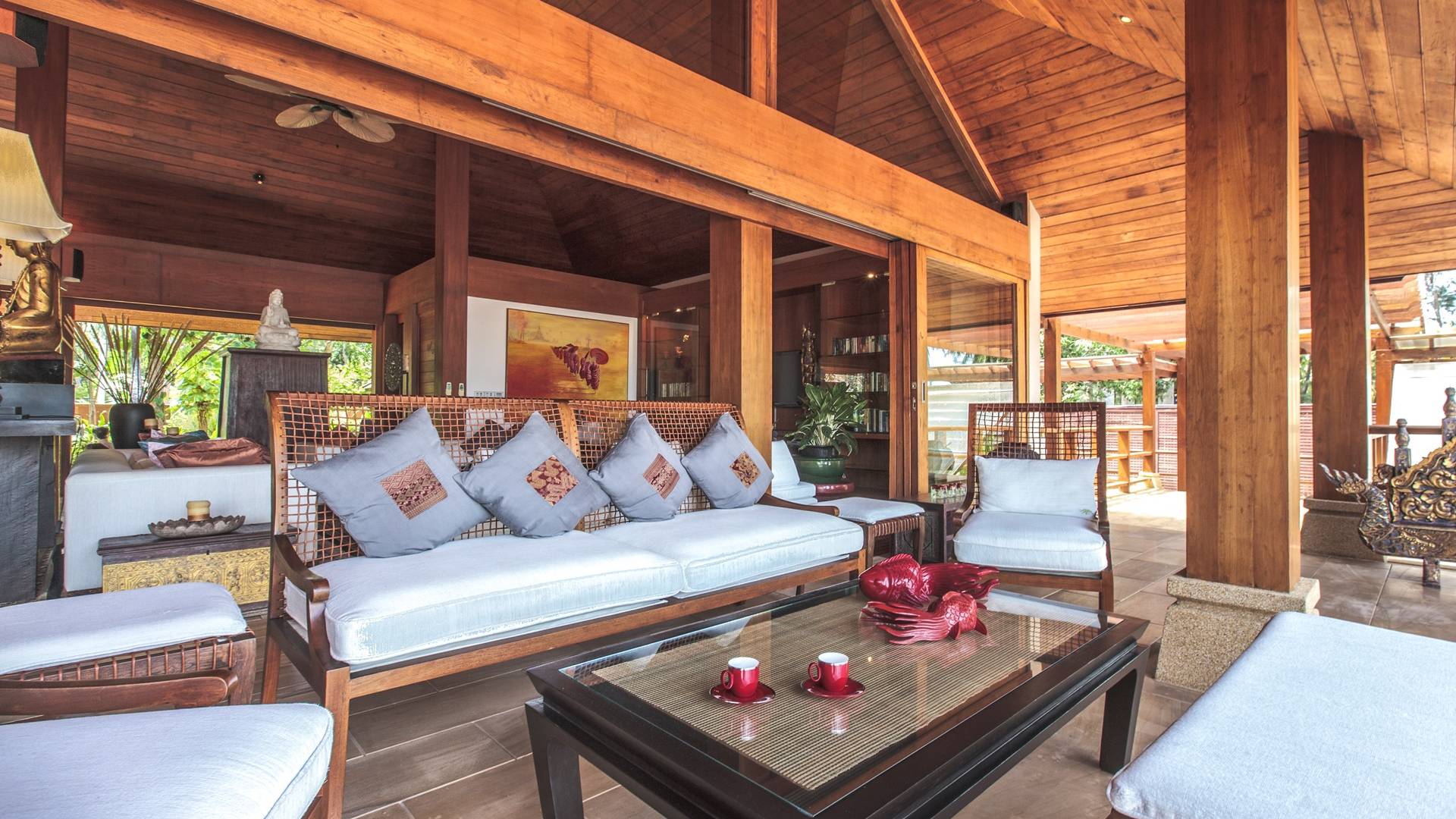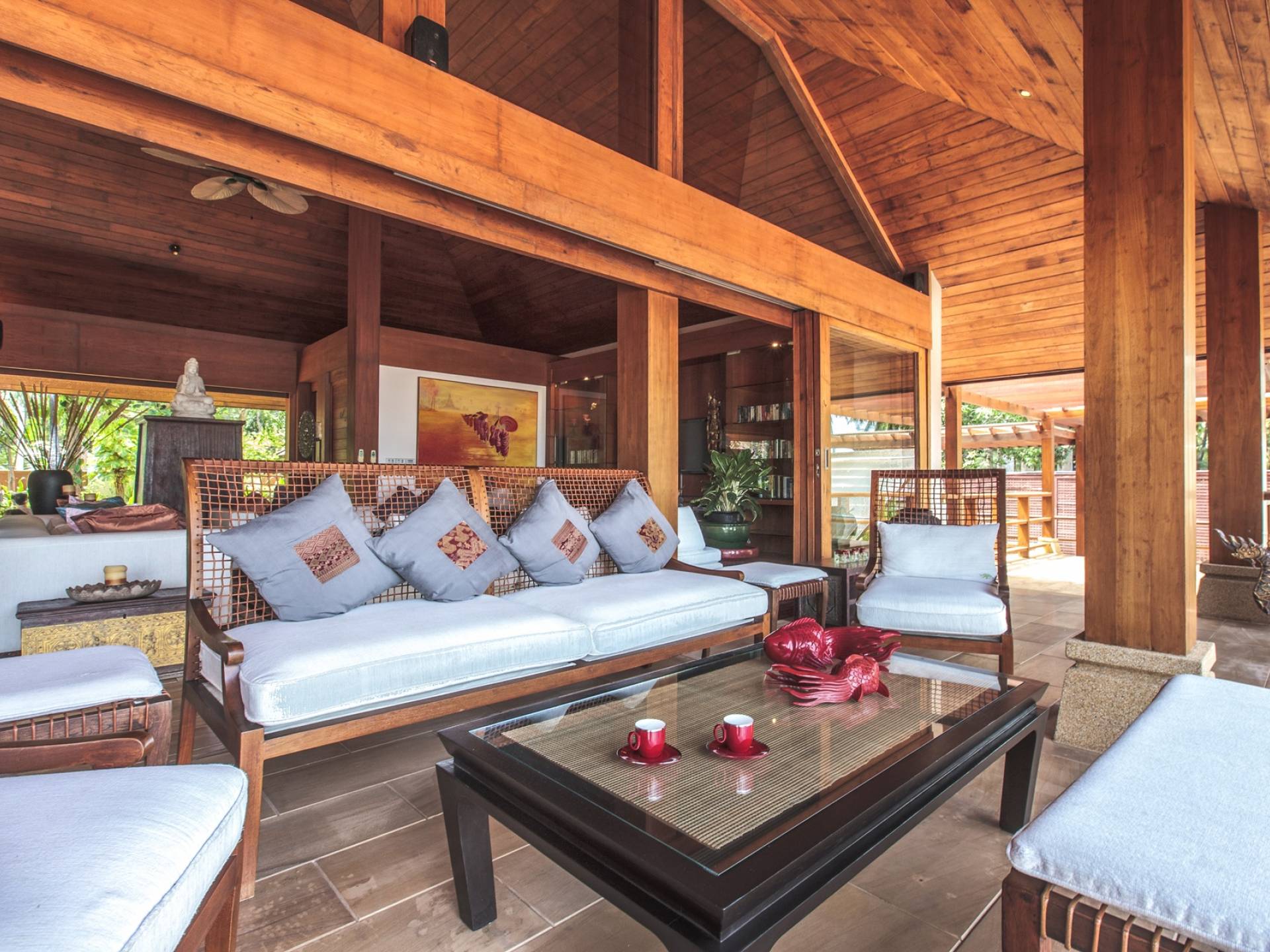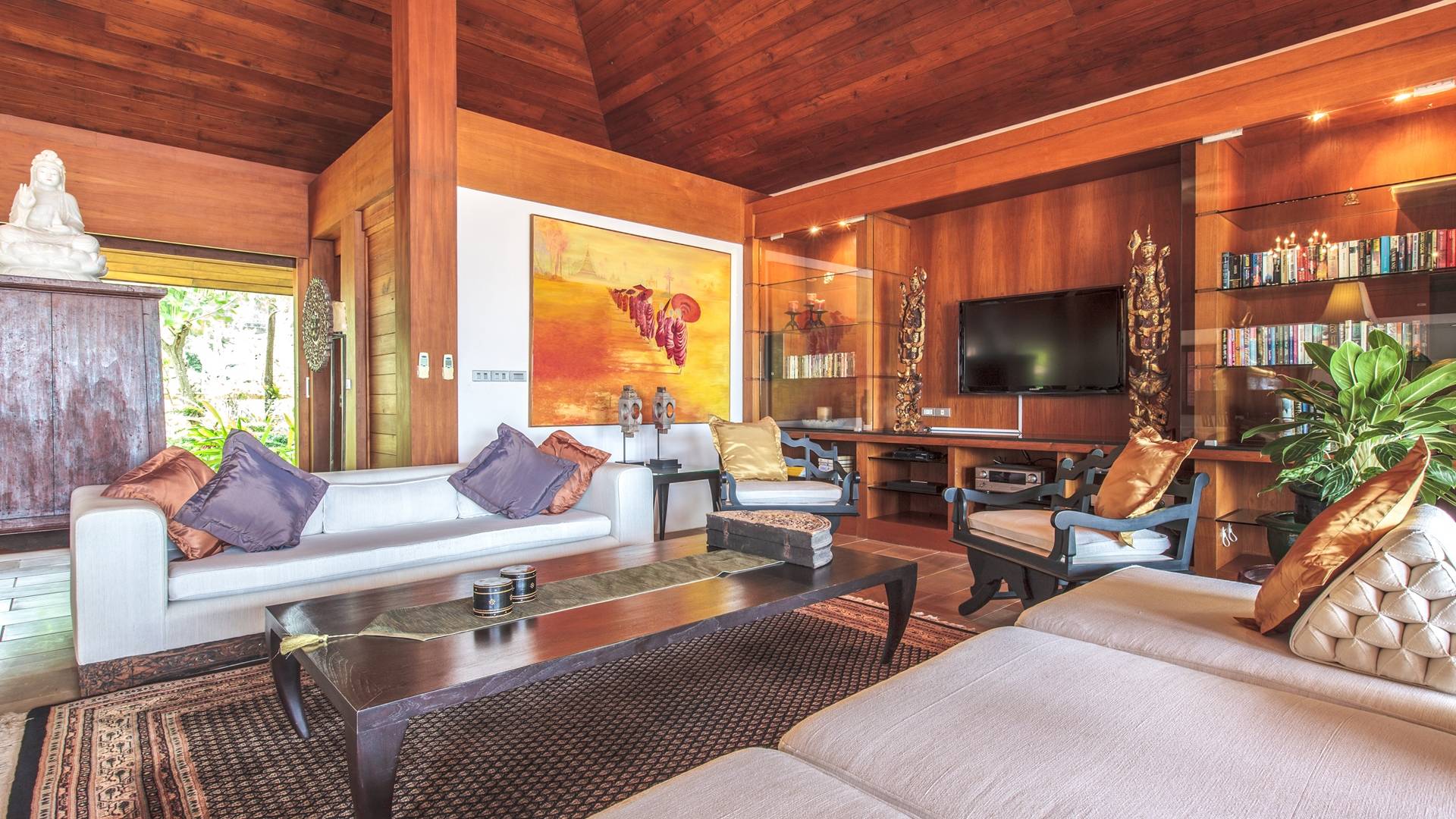 Οι λιμνούλες με πεταλούδες άφθονες με λουλούδια λωτού και βάτες, ανοίγουν το δρόμο για τον θολωτό χώρο διαβίωσης, στο κέντρο της βίλας. Μεγάλες συρόμενες πόρτες κονσέρτινα πίσω σε μοναδικό σχεδιασμό που διαλύει κάθε διάκριση μεταξύ εσωτερικού και εξωτερικού χώρου. Το πολυτελές σαλόνι με ψηλή οροφή με ανεμιστήρες διαθέτει μεγάλα καθίσματα καναπέ για έως και 25 άτομα, LCD 48 ιντσών, με εκτενή DVD και βιβλιοθήκη βιβλίων.
