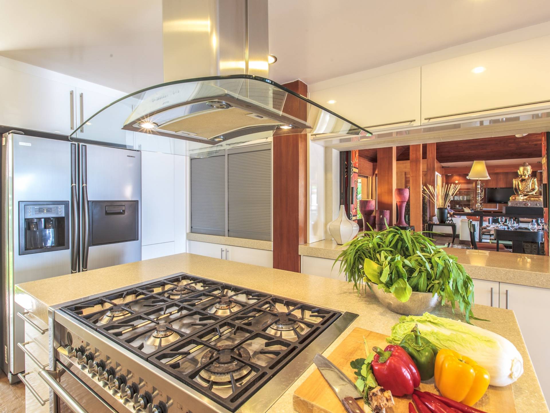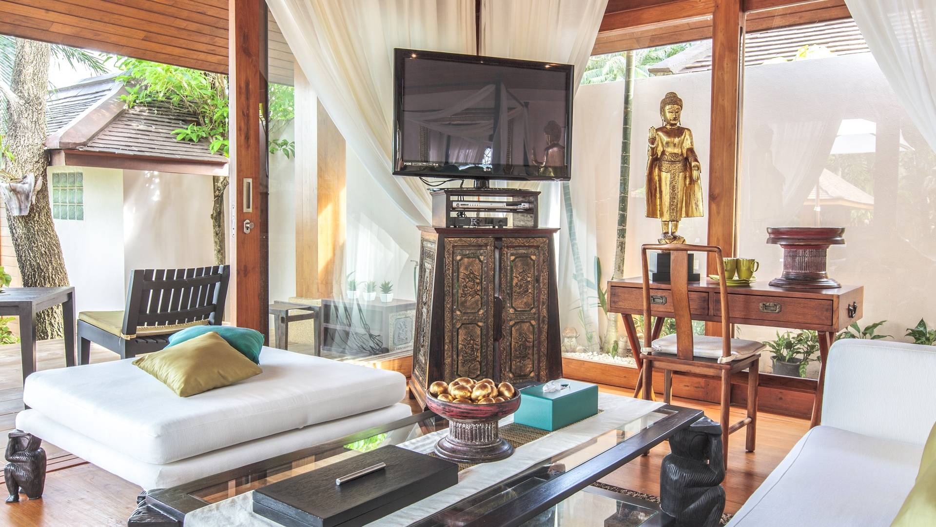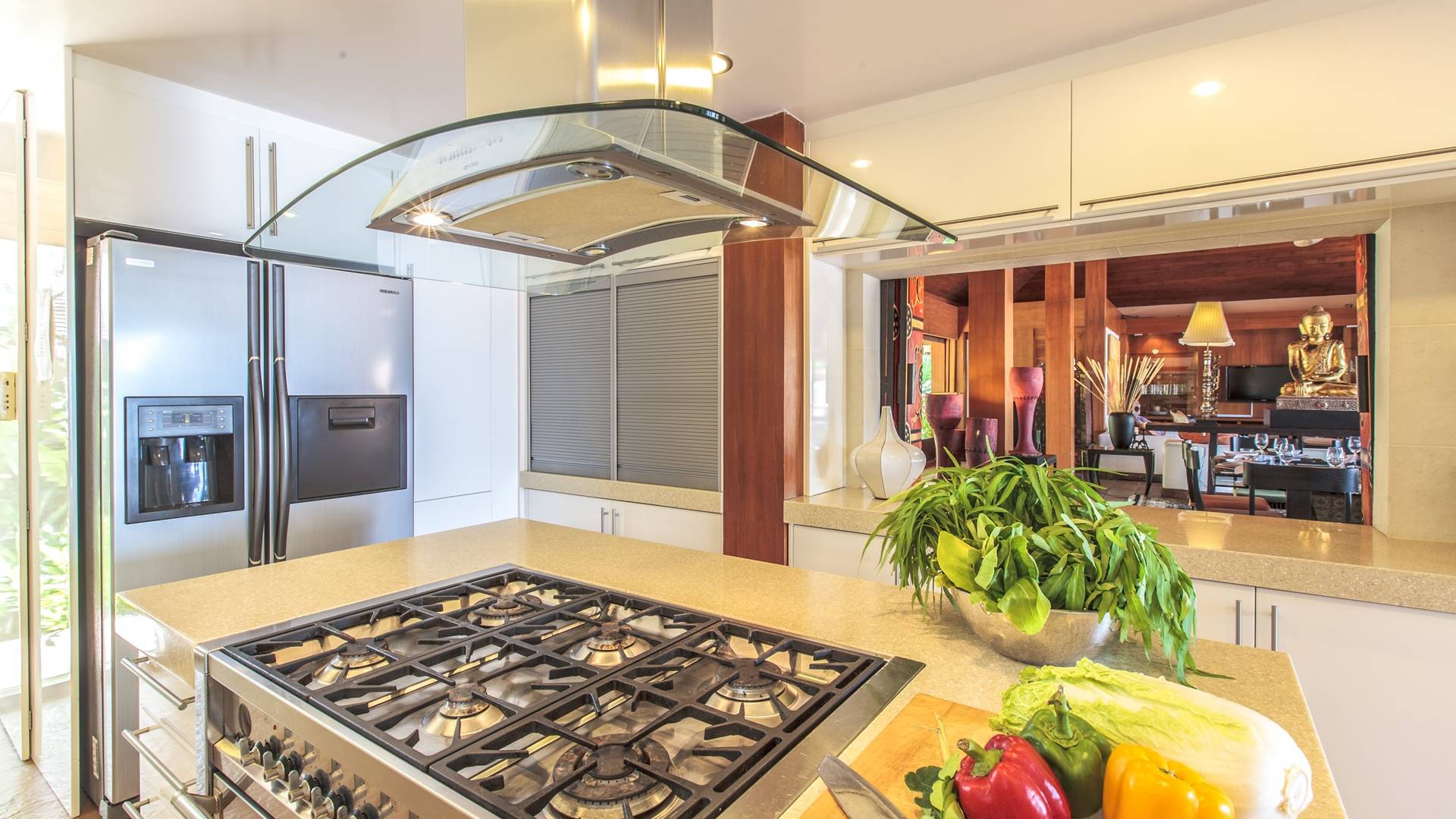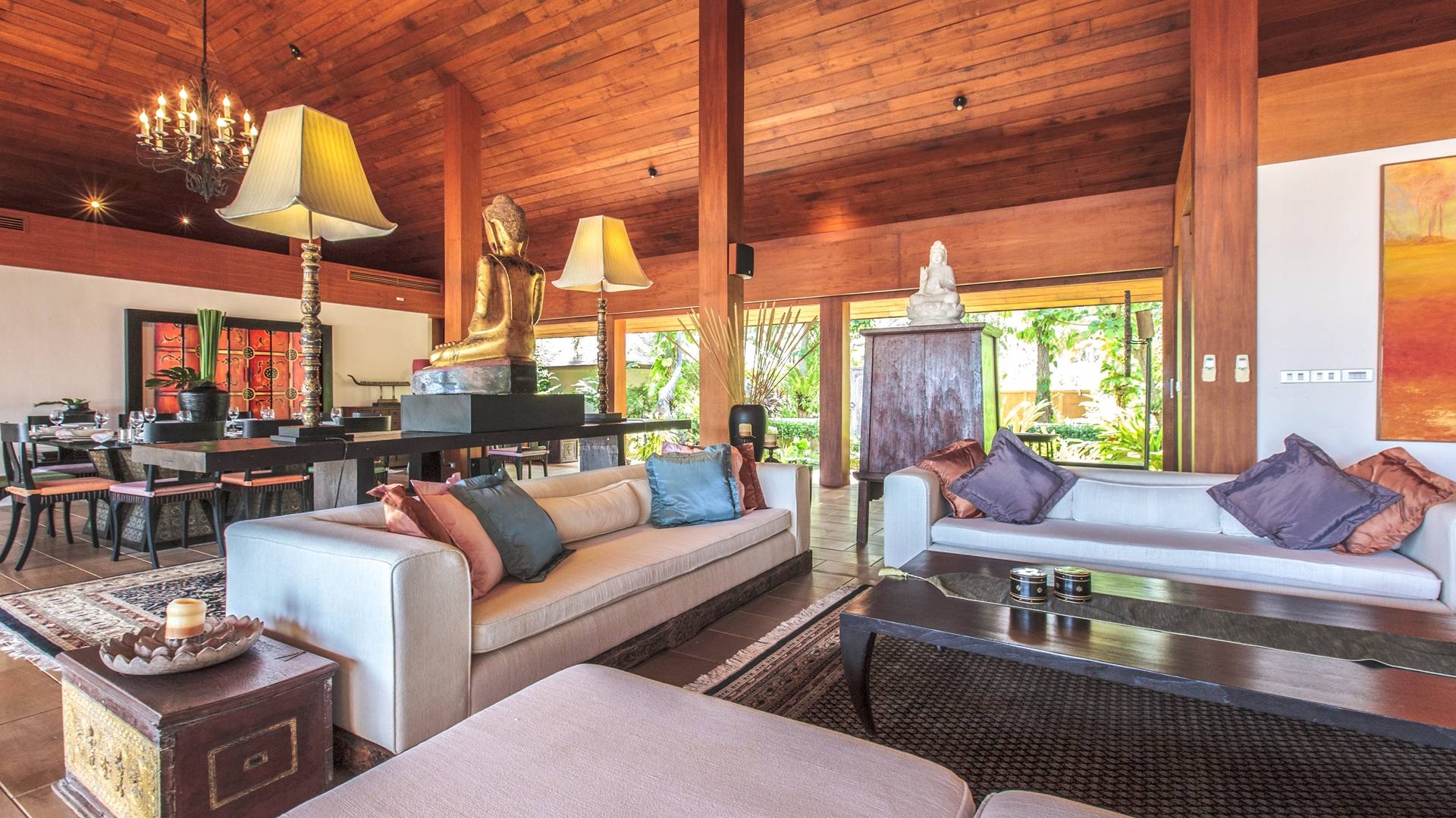 Οι λιμνούλες με πεταλούδες άφθονες με λουλούδια λωτού και βάτες, ανοίγουν το δρόμο για τον θολωτό χώρο διαβίωσης, στο κέντρο της βίλας. Μεγάλες συρόμενες πόρτες κονσέρτινα πίσω σε μοναδικό σχεδιασμό που διαλύει κάθε διάκριση μεταξύ εσωτερικού και εξωτερικού χώρου. Το πολυτελές σαλόνι με ψηλή οροφή με ανεμιστήρες διαθέτει μεγάλα καθίσματα καναπέ για έως και 25 άτομα, LCD 48 ιντσών, με εκτενή DVD και βιβλιοθήκη βιβλίων.