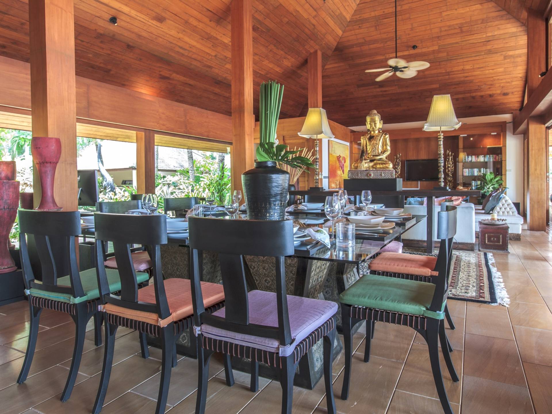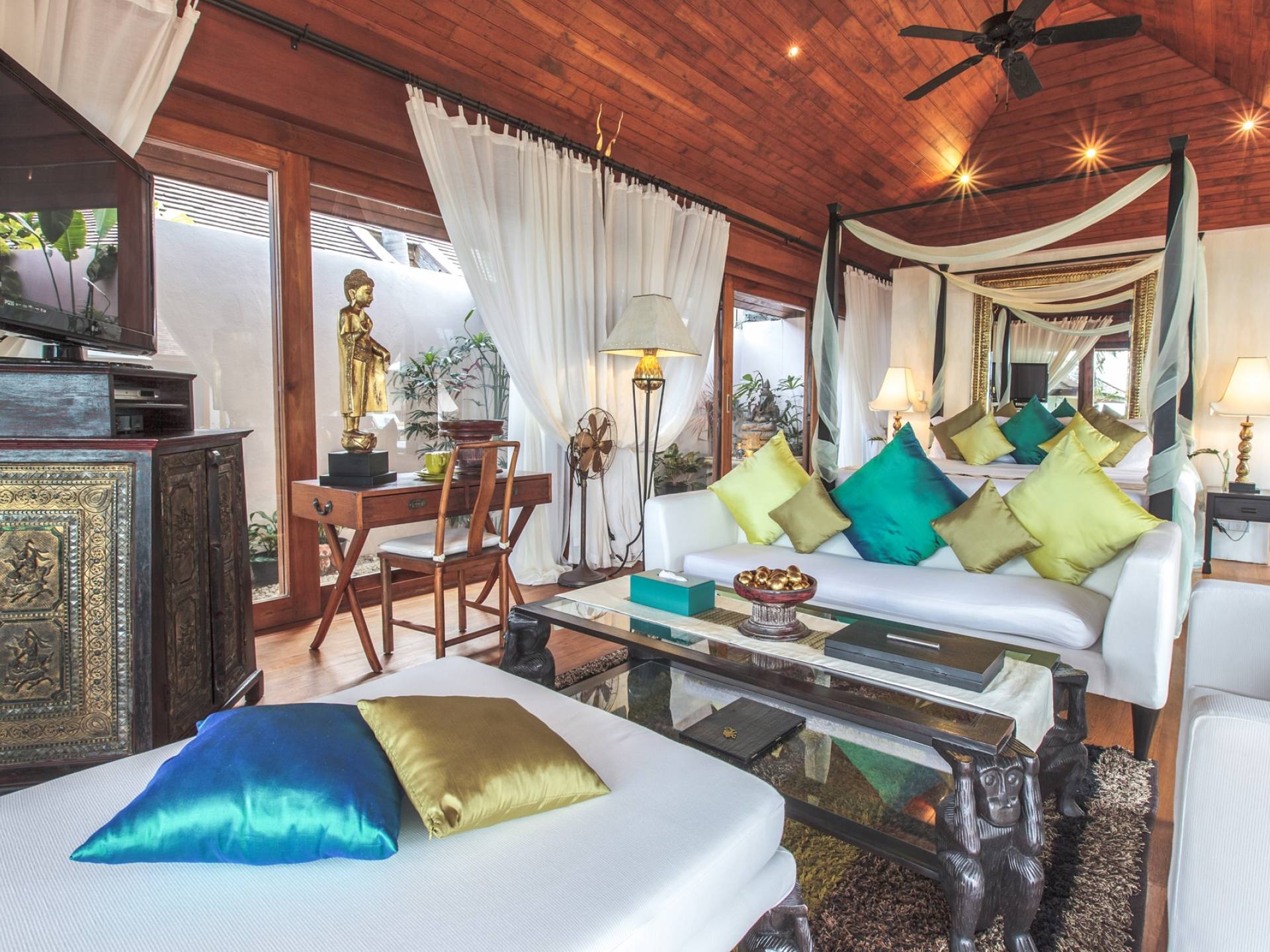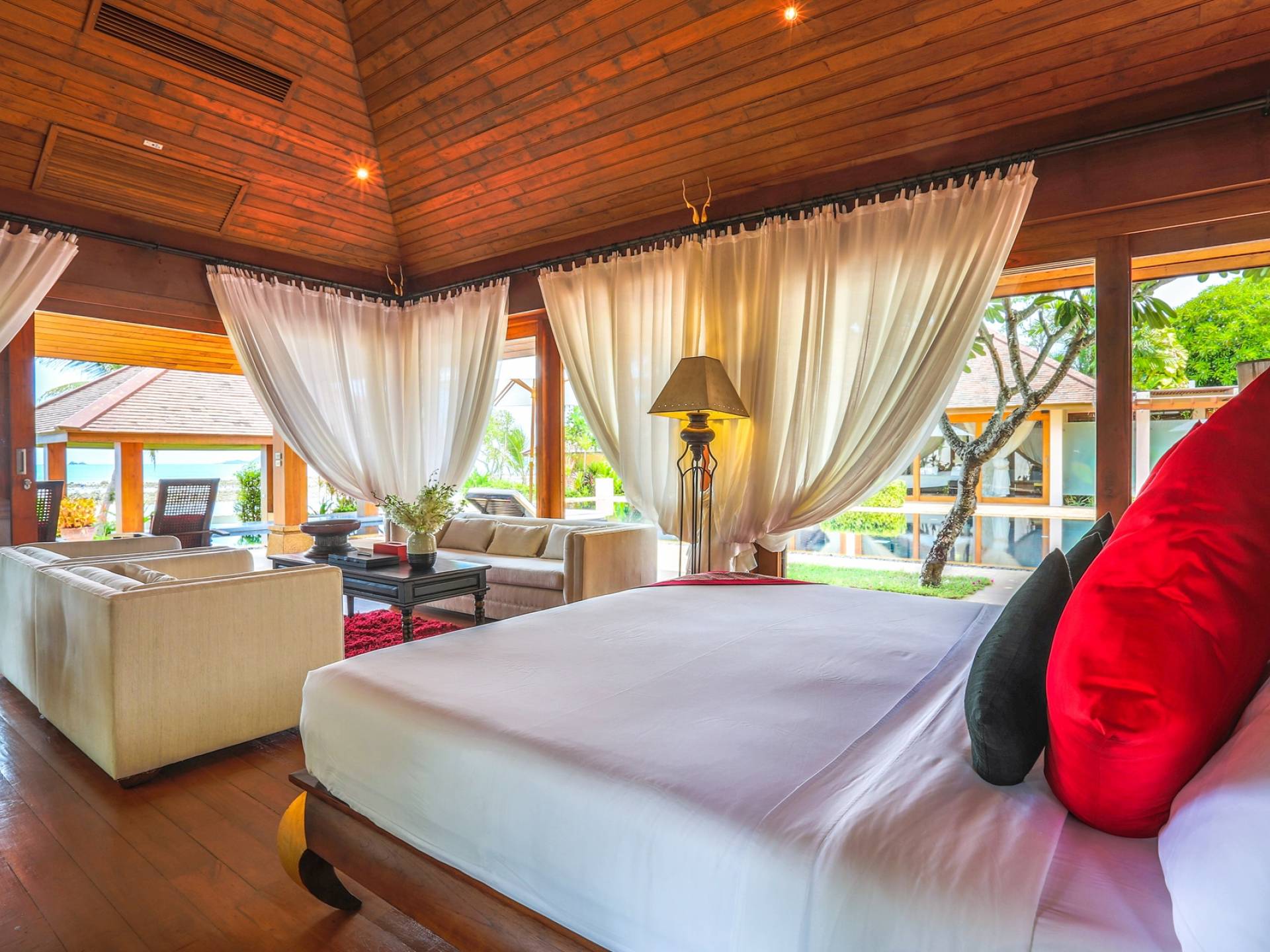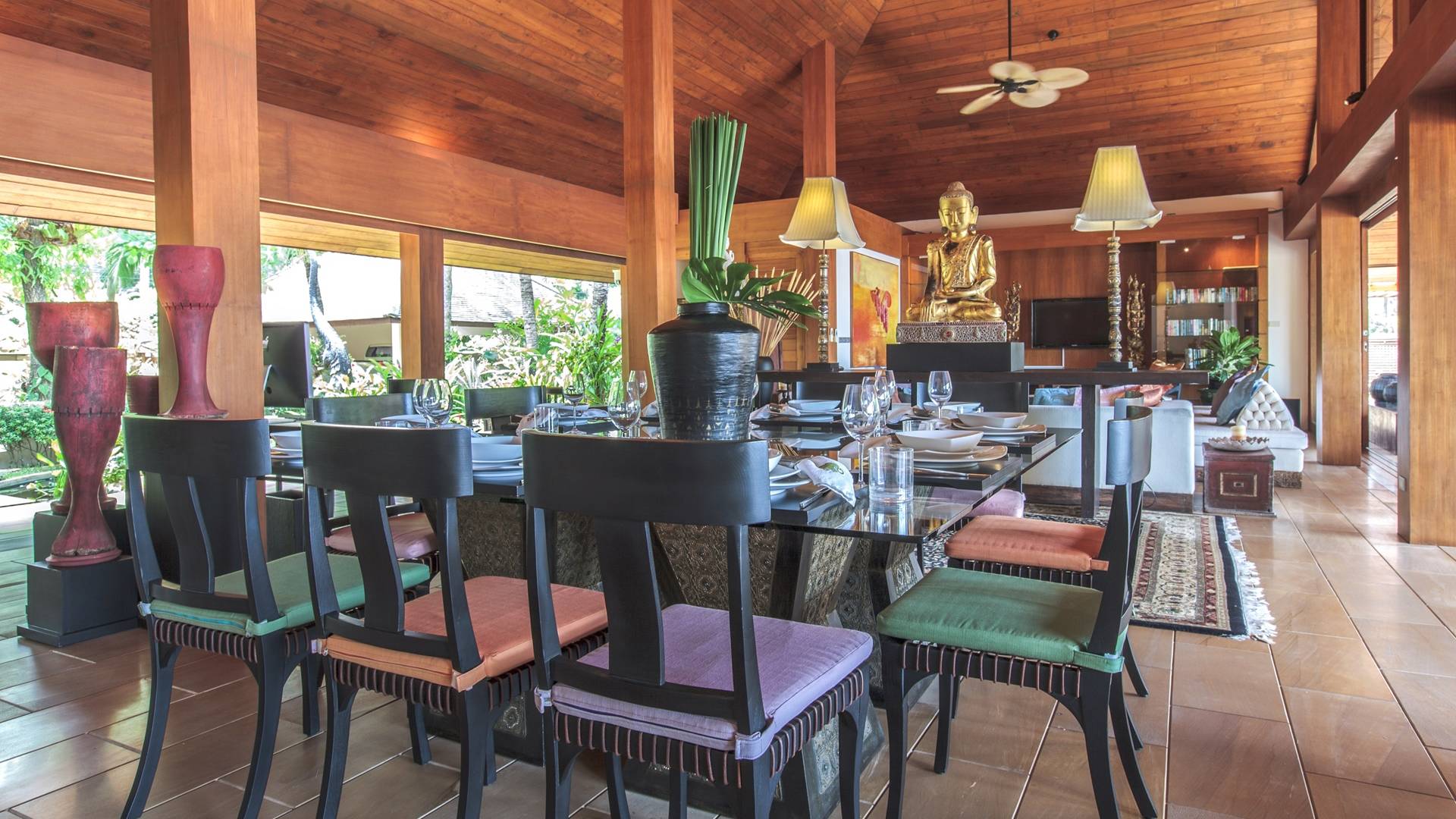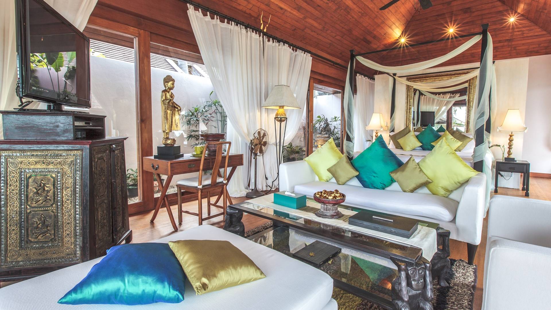 Οι λιμνούλες με πεταλούδες άφθονες με λουλούδια λωτού και βάτες, ανοίγουν το δρόμο για τον θολωτό χώρο διαβίωσης, στο κέντρο της βίλας. Μεγάλες συρόμενες πόρτες κονσέρτινα πίσω σε μοναδικό σχεδιασμό που διαλύει κάθε διάκριση μεταξύ εσωτερικού και εξωτερικού χώρου. Το πολυτελές σαλόνι με ψηλή οροφή με ανεμιστήρες διαθέτει μεγάλα καθίσματα καναπέ για έως και 25 άτομα, LCD 48 ιντσών, με εκτενή DVD και βιβλιοθήκη βιβλίων.