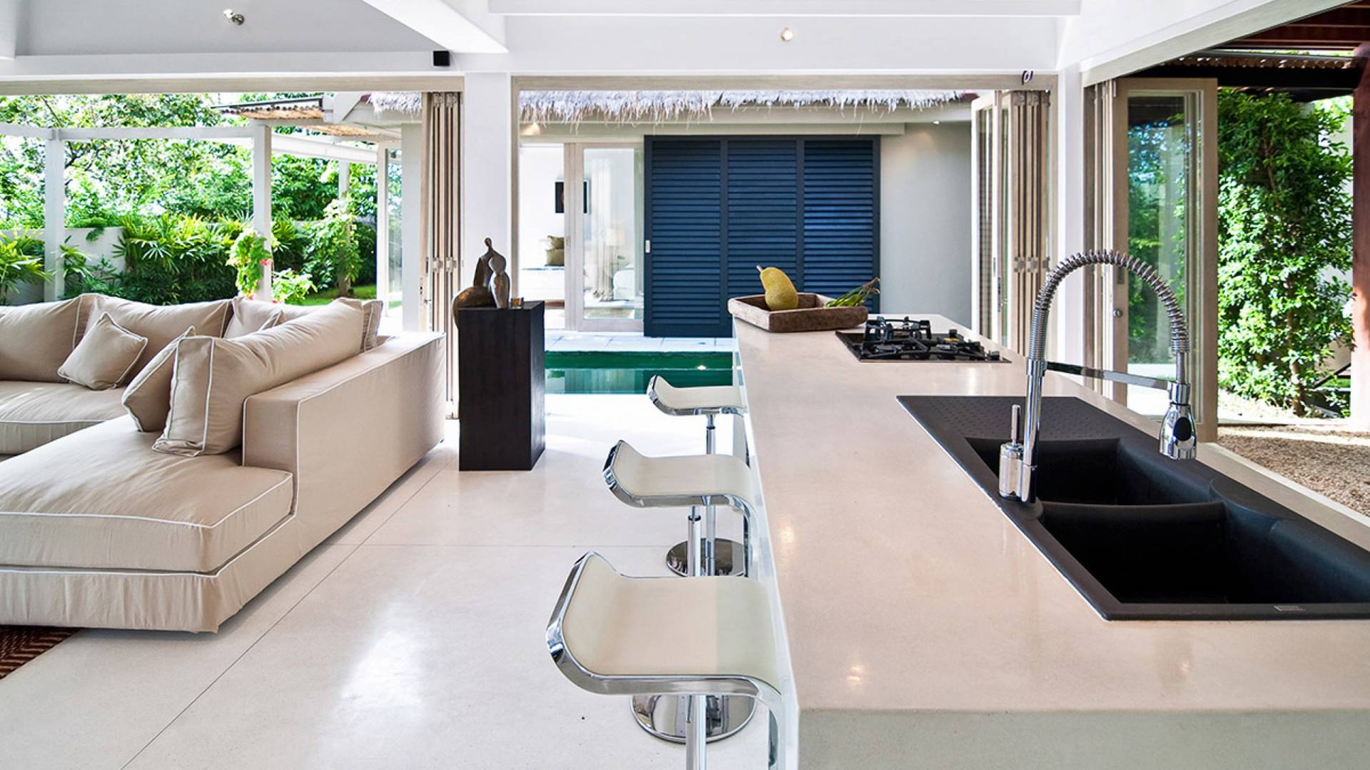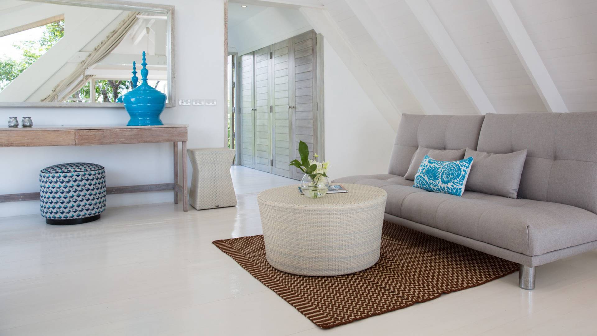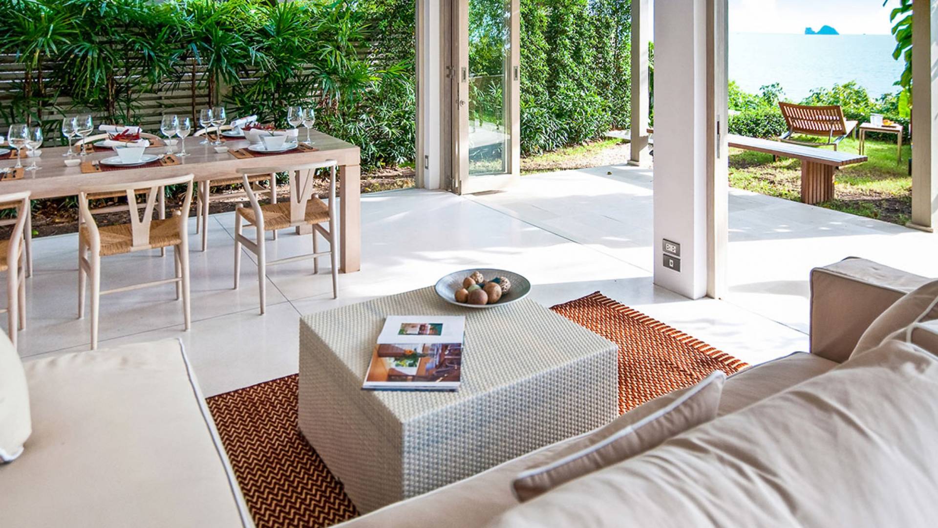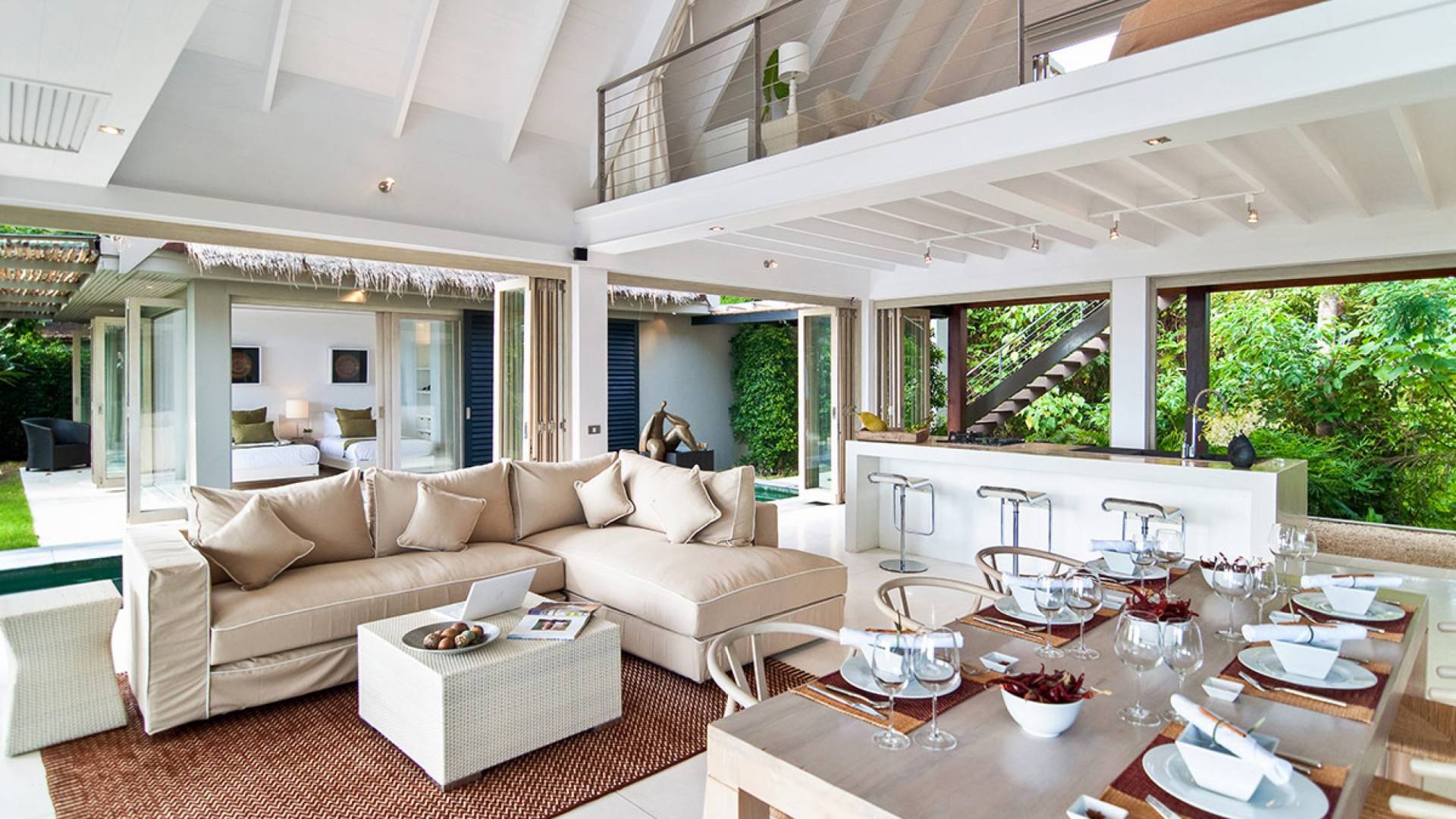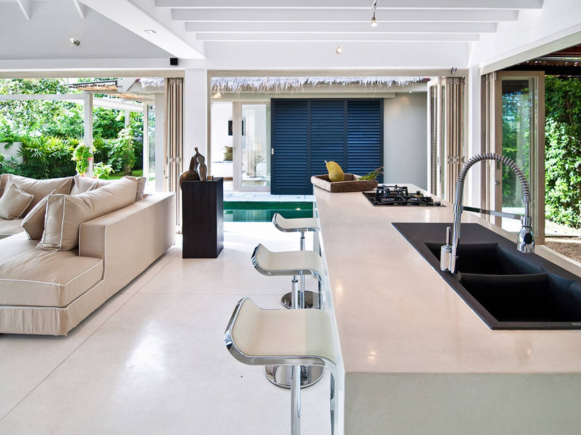 Αυτό το ακίνητο επωφελείται από μια εξαιρετικά ιδιωτική θέση που είναι υπερυψωμένη και διαθέτει εξαιρετικούς κήπους. Αμέσως στα αριστερά σας καθώς μπαίνετε είναι ένας χώρος κήπου με ξαπλώστρες που δείχνουν απευθείας την εκπληκτική θέα μπροστά. Μπροστά από αυτό βρίσκεται το πρώτο κιόσκι με αχυρένια σαλόνι, κουζίνα και τραπεζαρία ενιαίας διαρρύθμισης. Υπάρχει μια σκεπαστή βεράντα μπροστά με εξωτερική τραπεζαρία. Διαμορφωμένοι χλοοτάπητες και καλά φυτεμένοι κήποι βρίσκονται ακριβώς μπροστά από το κατάλυμα. Στο εσωτερικό, το λευκό δωμάτιο είναι επιδέξια ντυμένο με φυσικές ίνες, στολίδια και έπιπλα, όπως μπεζ καναπέ σε σχήμα L, ξύλινο τραπέζι και καρέκλες, και υφαντό πατάκι. Η κουζίνα έχει ένα χαρακτηριστικό λευκό νησί που στεγάζει το νεροχύτη, την εστία και τις ενσωματωμένες συσκευές ενώ παράλληλα διπλασιάζεται ως μπαρ για πρωινό. Όλος ο χώρος αποθήκευσης βρίσκεται πίσω από λεπτές λευκές πόρτες και, με εξαίρεση αυτόν τον τοίχο της κουζίνας, και οι τέσσερις πλευρές του δωματίου είναι επενδεδυμένες με διπλά πτυσσόμενες γυάλινες πόρτες που ανοίγουν την ιδιοκτησία για τη θέα και το φυσικό αεράκι. Στο πίσω μέρος της κουζίνας υπάρχει ένας σκεπαστός κήπος που μοιάζει με Ζεν.