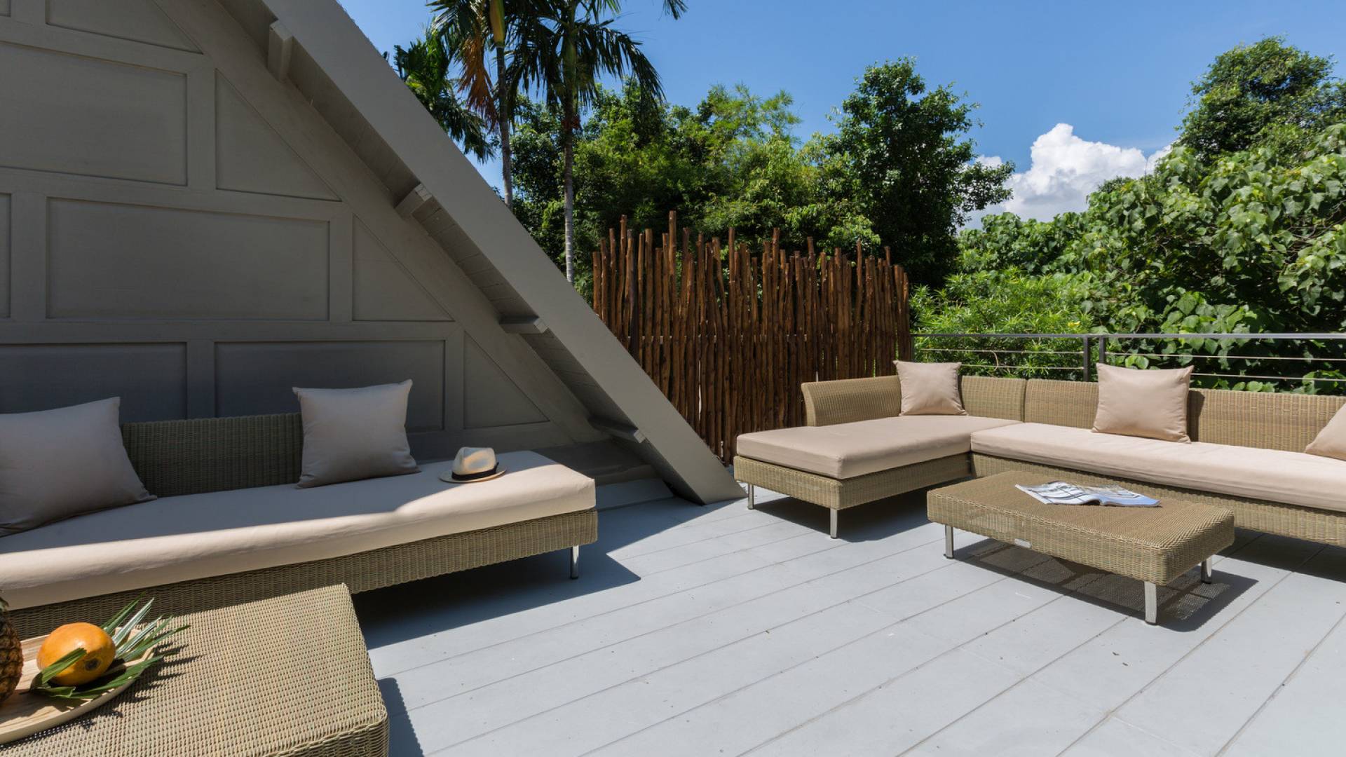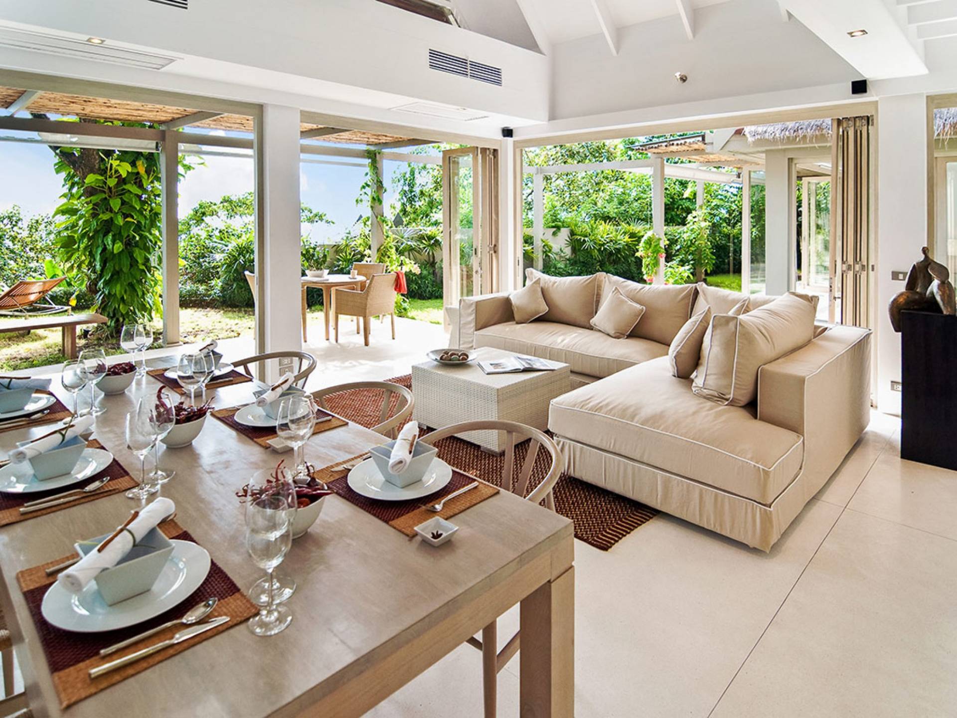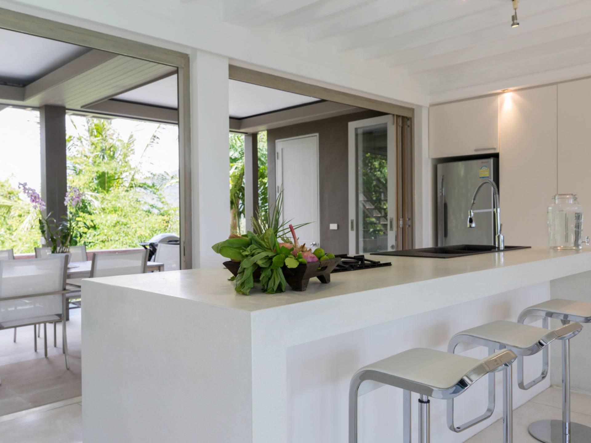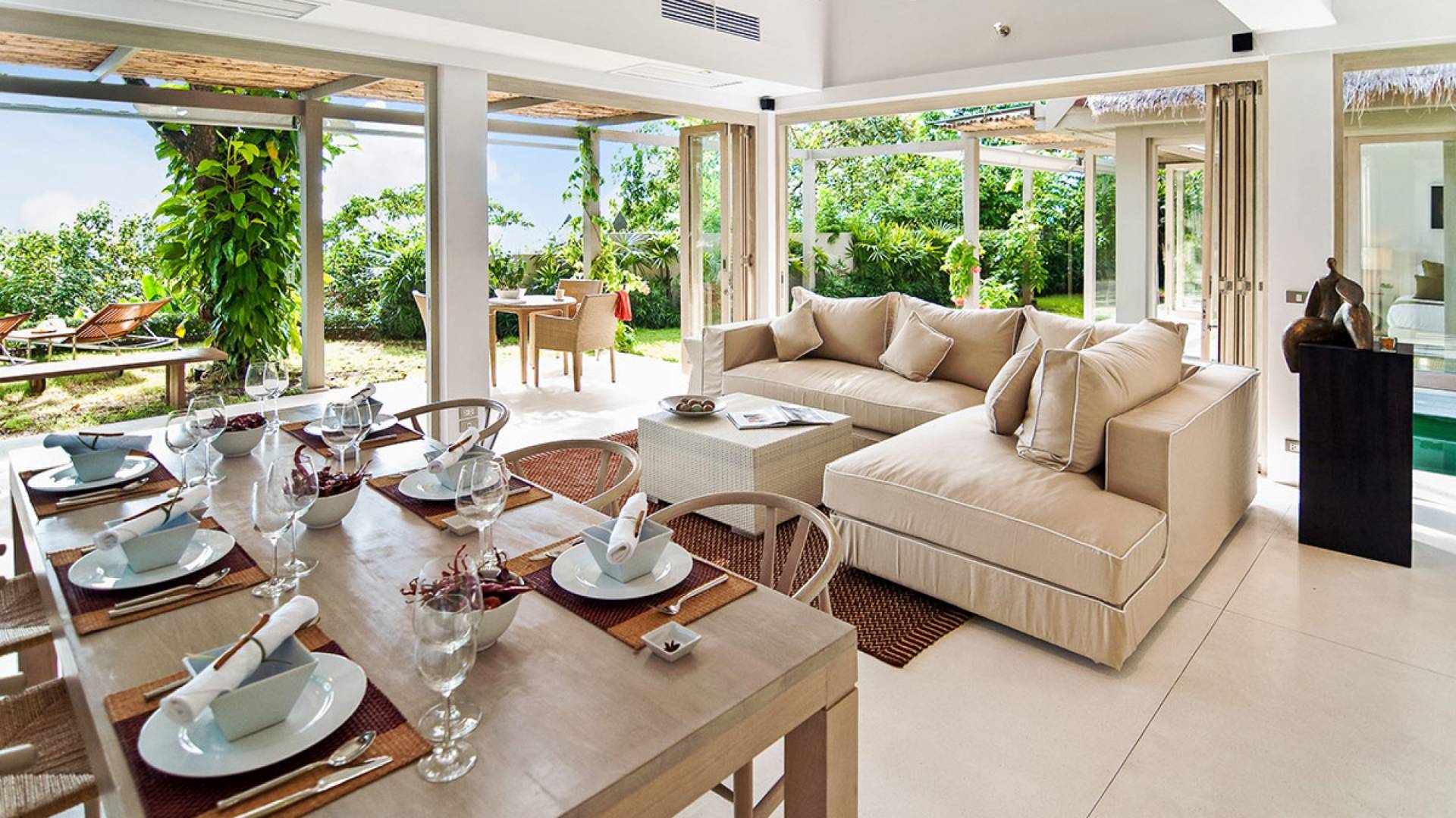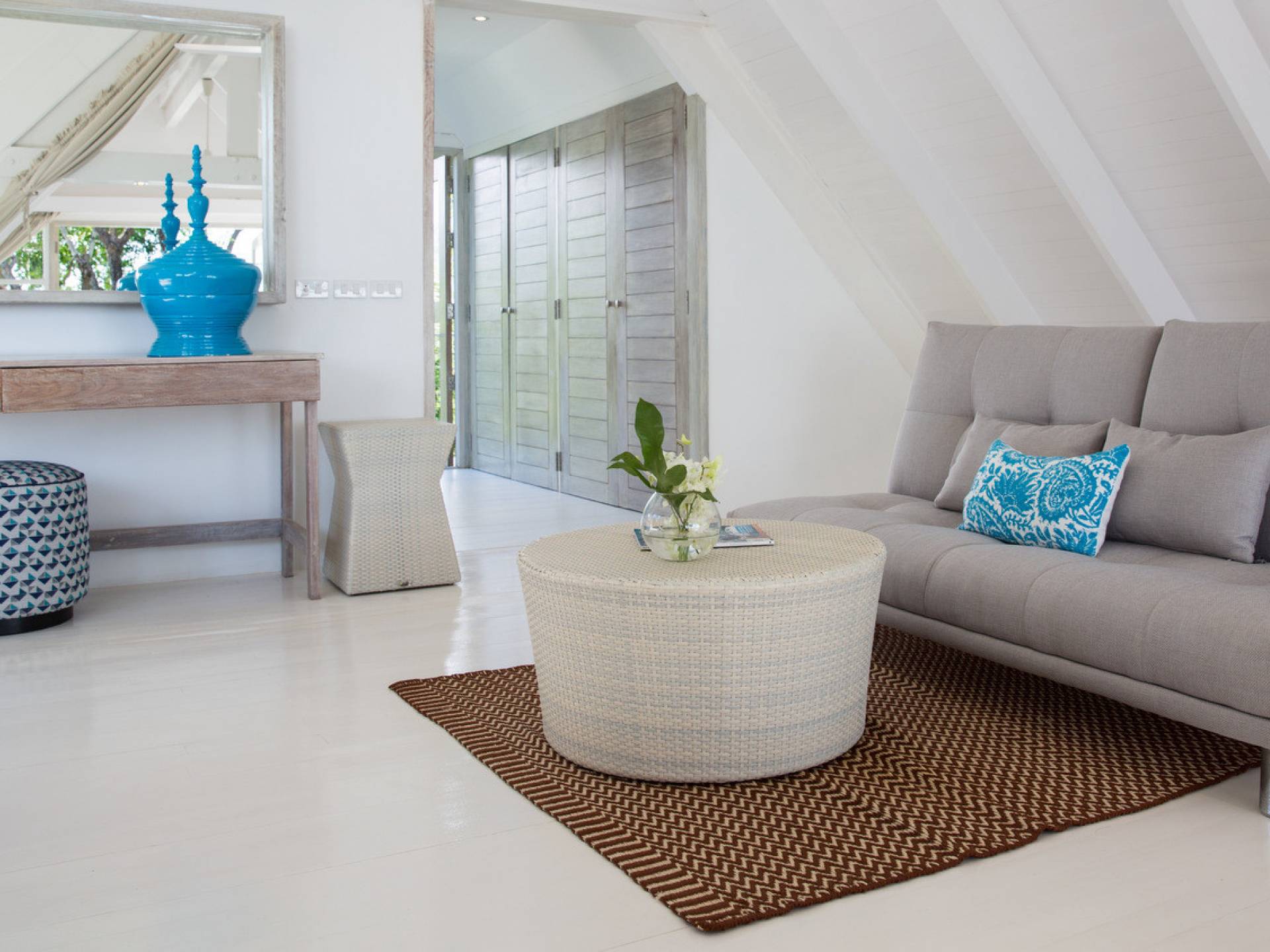 Αυτό το ακίνητο επωφελείται από μια εξαιρετικά ιδιωτική θέση που είναι υπερυψωμένη και διαθέτει εξαιρετικούς κήπους. Αμέσως στα αριστερά σας καθώς μπαίνετε είναι ένας χώρος κήπου με ξαπλώστρες που δείχνουν απευθείας την εκπληκτική θέα μπροστά. Μπροστά από αυτό βρίσκεται το πρώτο κιόσκι με αχυρένια σαλόνι, κουζίνα και τραπεζαρία ενιαίας διαρρύθμισης. Υπάρχει μια σκεπαστή βεράντα μπροστά με εξωτερική τραπεζαρία. Διαμορφωμένοι χλοοτάπητες και καλά φυτεμένοι κήποι βρίσκονται ακριβώς μπροστά από το κατάλυμα. Στο εσωτερικό, το λευκό δωμάτιο είναι επιδέξια ντυμένο με φυσικές ίνες, στολίδια και έπιπλα, όπως μπεζ καναπέ σε σχήμα L, ξύλινο τραπέζι και καρέκλες, και υφαντό πατάκι. Η κουζίνα έχει ένα χαρακτηριστικό λευκό νησί που στεγάζει το νεροχύτη, την εστία και τις ενσωματωμένες συσκευές ενώ παράλληλα διπλασιάζεται ως μπαρ για πρωινό. Όλος ο χώρος αποθήκευσης βρίσκεται πίσω από λεπτές λευκές πόρτες και, με εξαίρεση αυτόν τον τοίχο της κουζίνας, και οι τέσσερις πλευρές του δωματίου είναι επενδεδυμένες με διπλά πτυσσόμενες γυάλινες πόρτες που ανοίγουν την ιδιοκτησία για τη θέα και το φυσικό αεράκι. Στο πίσω μέρος της κουζίνας υπάρχει ένας σκεπαστός κήπος που μοιάζει με Ζεν.