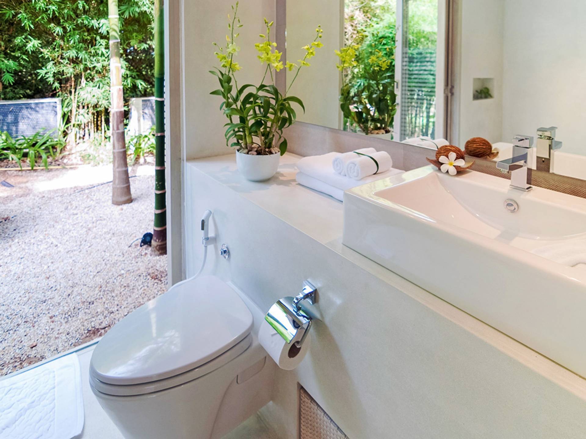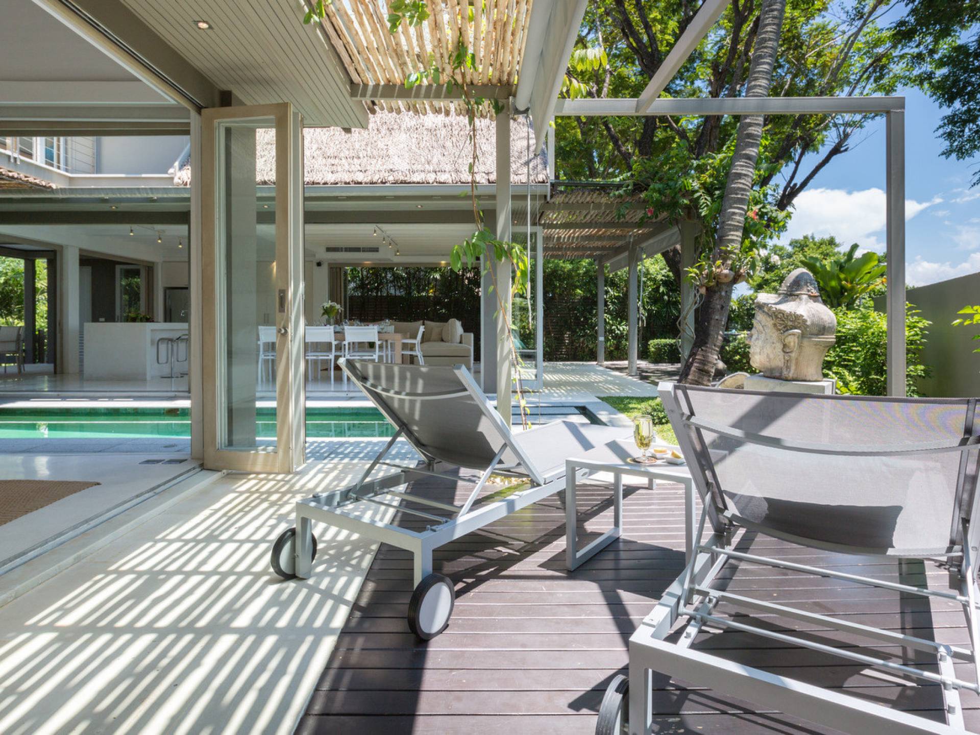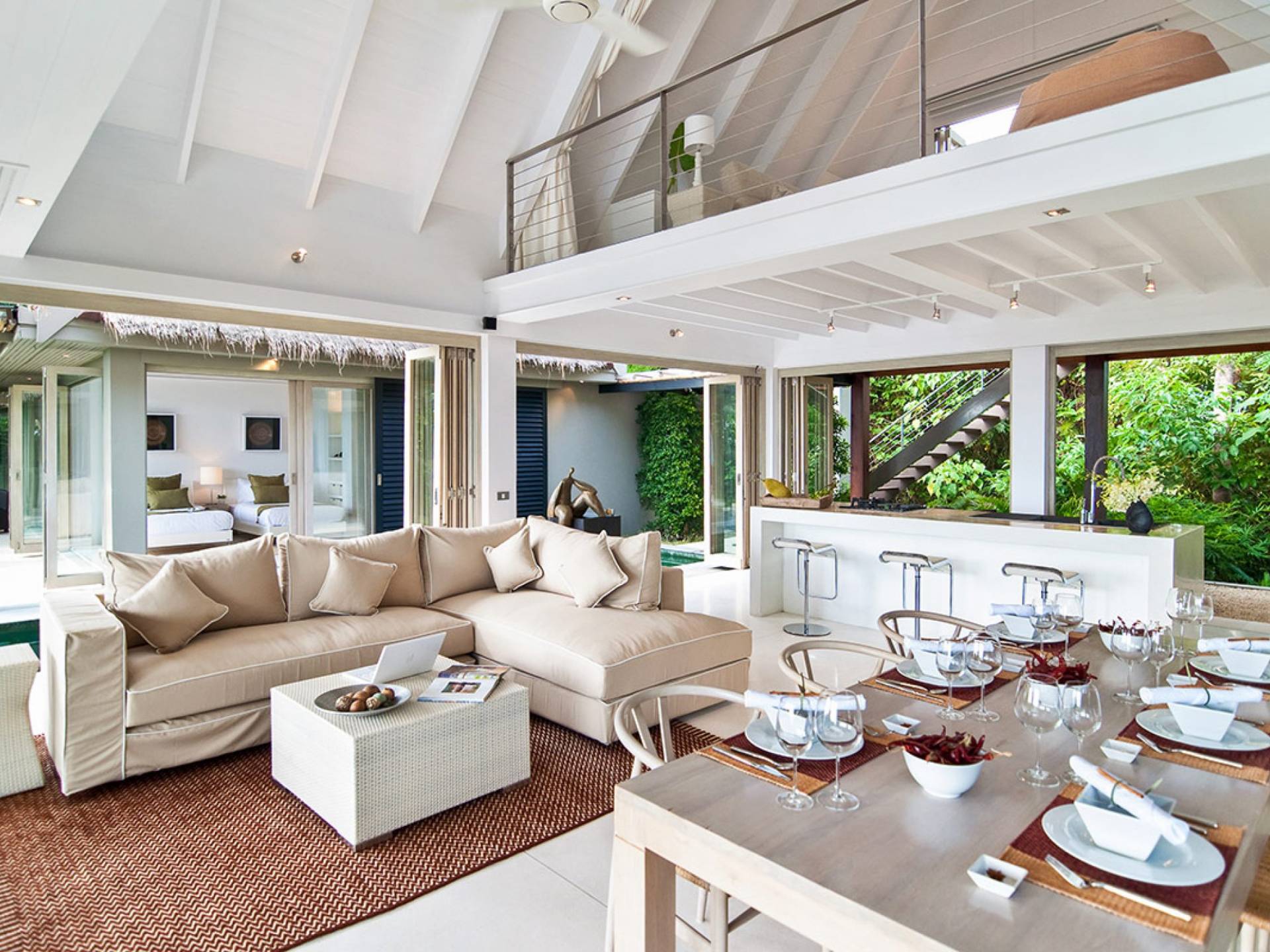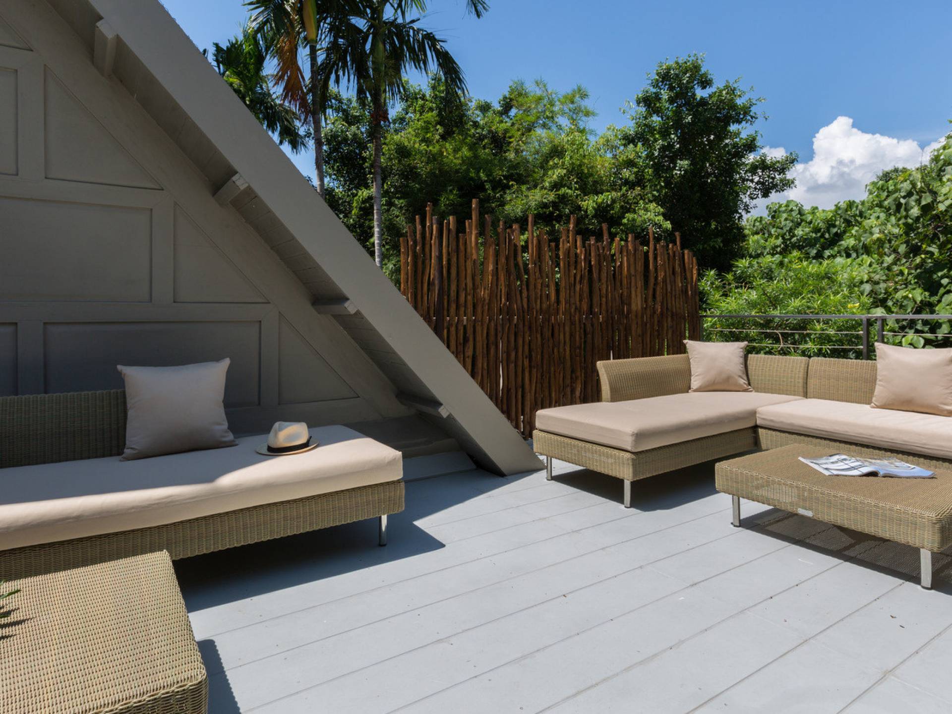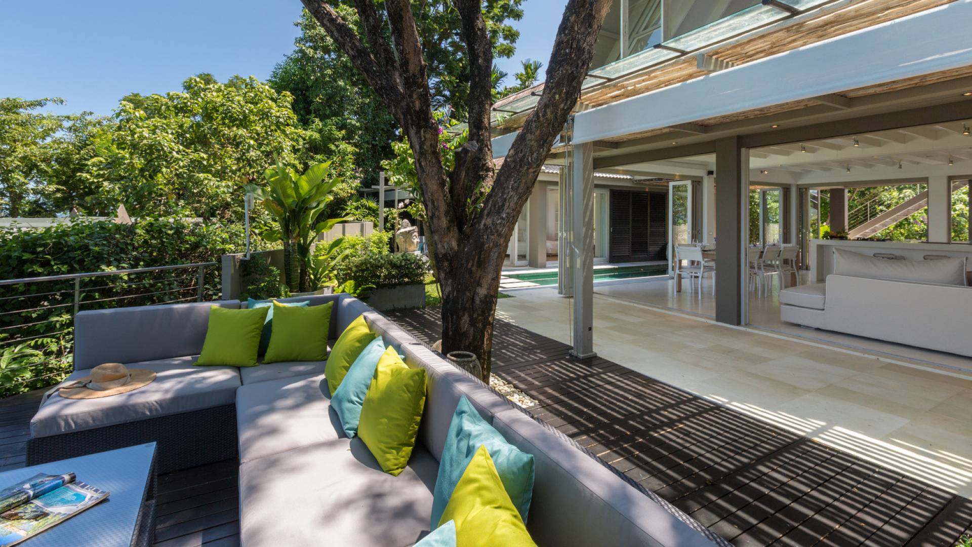 Αυτό το ακίνητο επωφελείται από μια εξαιρετικά ιδιωτική θέση που είναι υπερυψωμένη και διαθέτει εξαιρετικούς κήπους. Αμέσως στα αριστερά σας καθώς μπαίνετε είναι ένας χώρος κήπου με ξαπλώστρες που δείχνουν απευθείας την εκπληκτική θέα μπροστά. Μπροστά από αυτό βρίσκεται το πρώτο κιόσκι με αχυρένια σαλόνι, κουζίνα και τραπεζαρία ενιαίας διαρρύθμισης. Υπάρχει μια σκεπαστή βεράντα μπροστά με εξωτερική τραπεζαρία. Διαμορφωμένοι χλοοτάπητες και καλά φυτεμένοι κήποι βρίσκονται ακριβώς μπροστά από το κατάλυμα. Στο εσωτερικό, το λευκό δωμάτιο είναι επιδέξια ντυμένο με φυσικές ίνες, στολίδια και έπιπλα, όπως μπεζ καναπέ σε σχήμα L, ξύλινο τραπέζι και καρέκλες, και υφαντό πατάκι. Η κουζίνα έχει ένα χαρακτηριστικό λευκό νησί που στεγάζει το νεροχύτη, την εστία και τις ενσωματωμένες συσκευές ενώ παράλληλα διπλασιάζεται ως μπαρ για πρωινό. Όλος ο χώρος αποθήκευσης βρίσκεται πίσω από λεπτές λευκές πόρτες και, με εξαίρεση αυτόν τον τοίχο της κουζίνας, και οι τέσσερις πλευρές του δωματίου είναι επενδεδυμένες με διπλά πτυσσόμενες γυάλινες πόρτες που ανοίγουν την ιδιοκτησία για τη θέα και το φυσικό αεράκι. Στο πίσω μέρος της κουζίνας υπάρχει ένας σκεπαστός κήπος που μοιάζει με Ζεν.