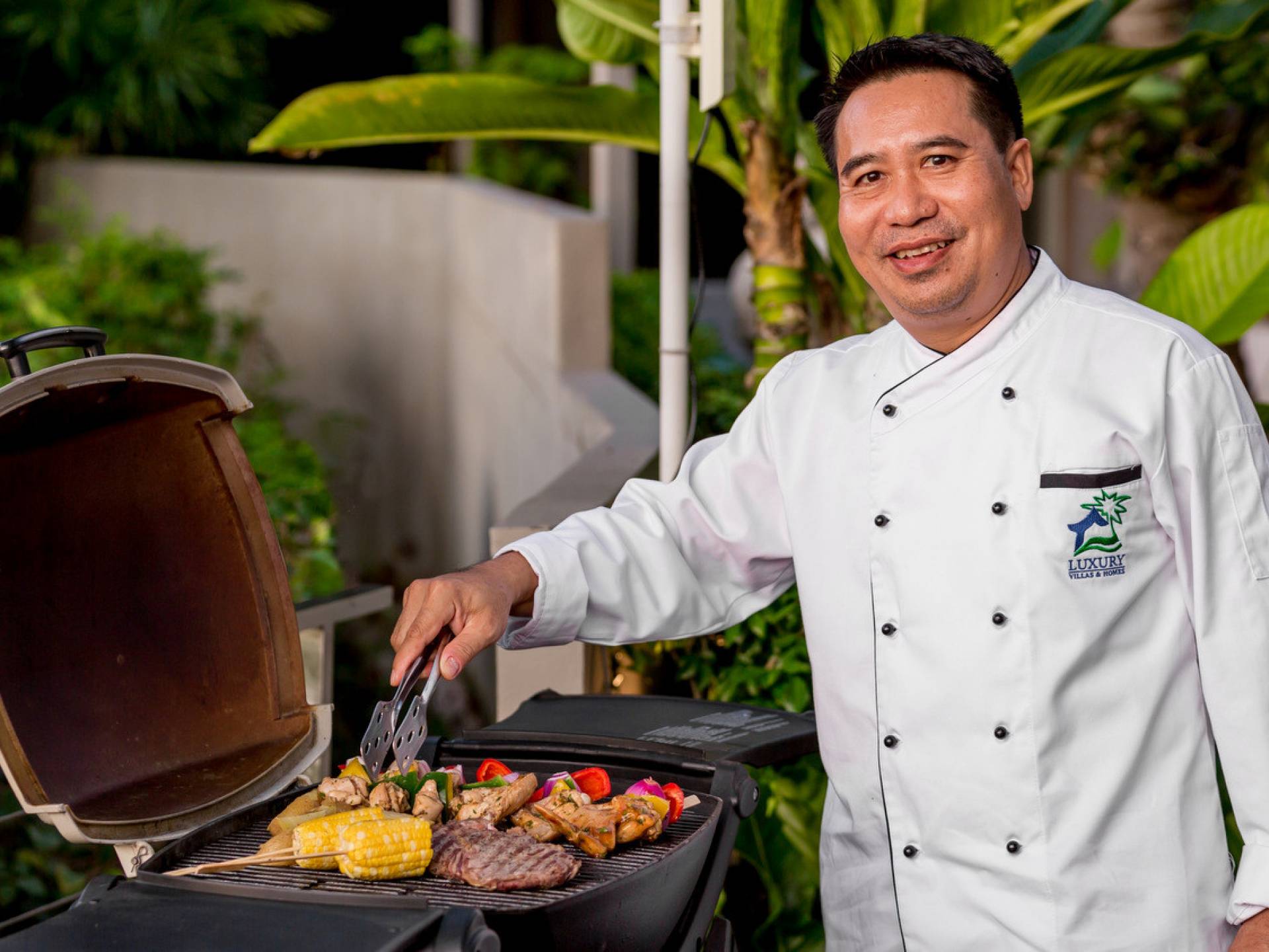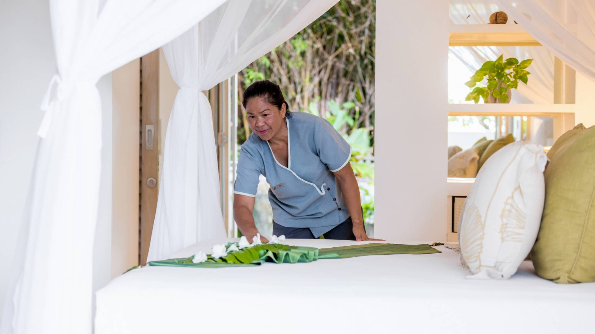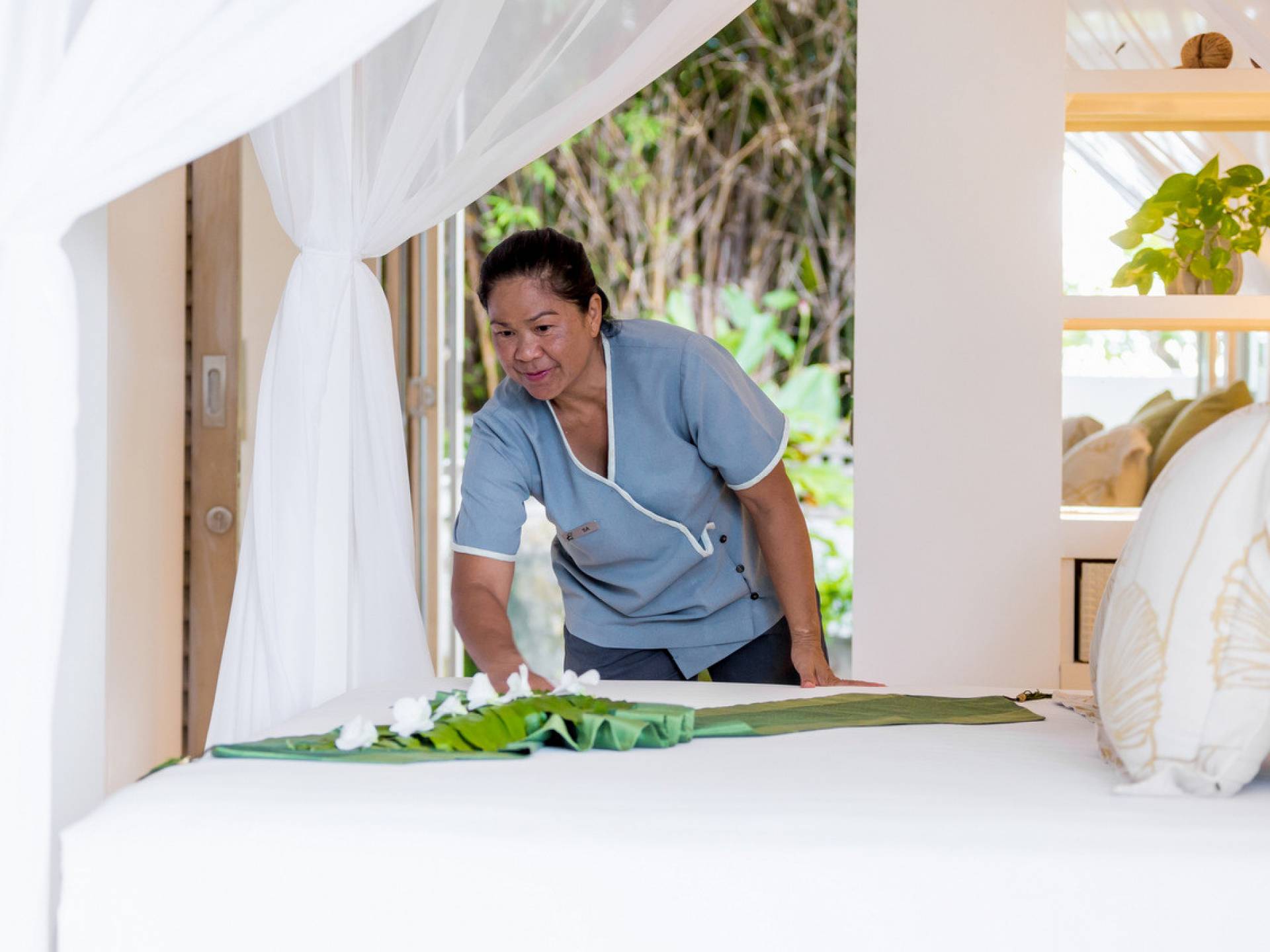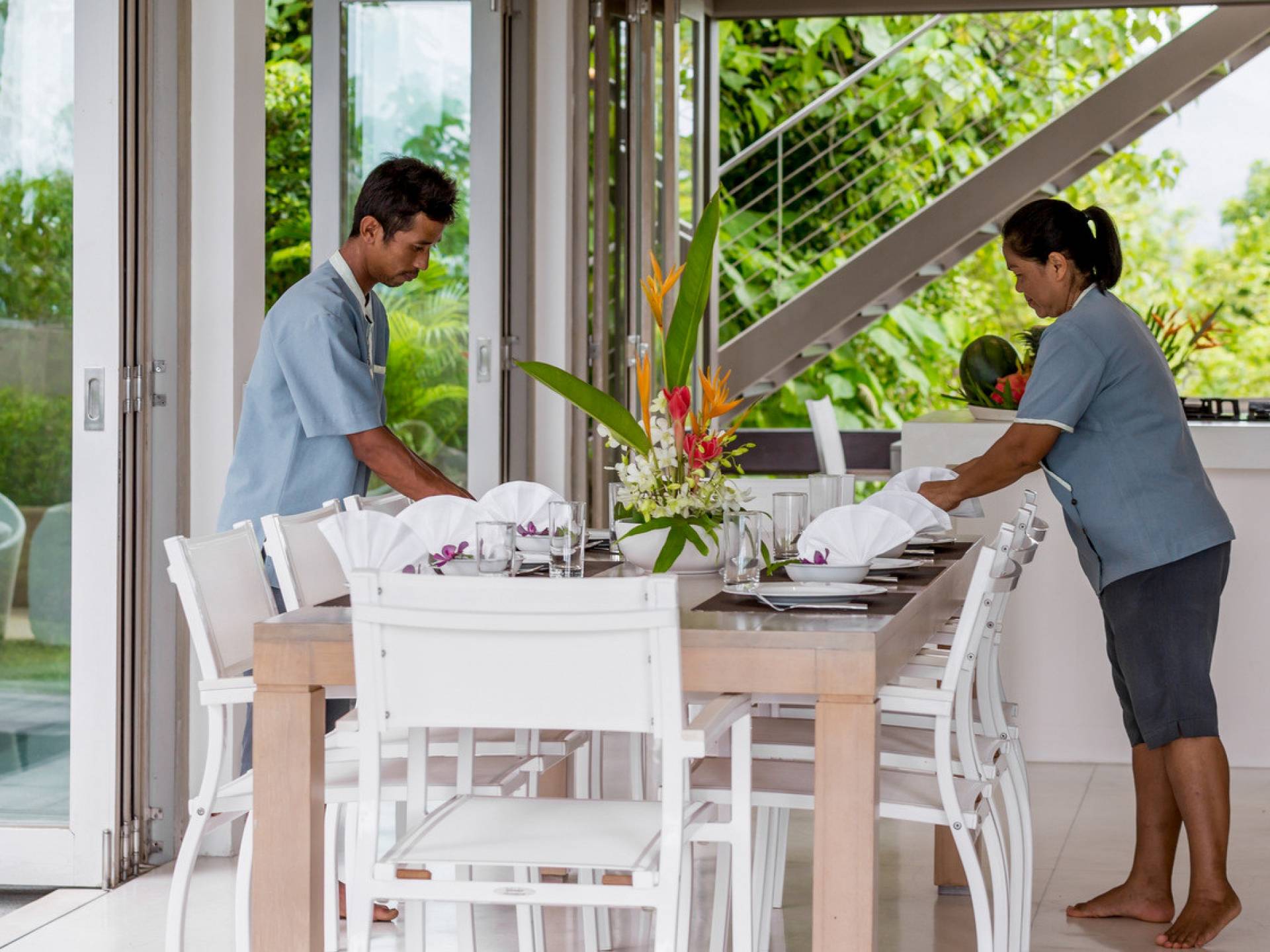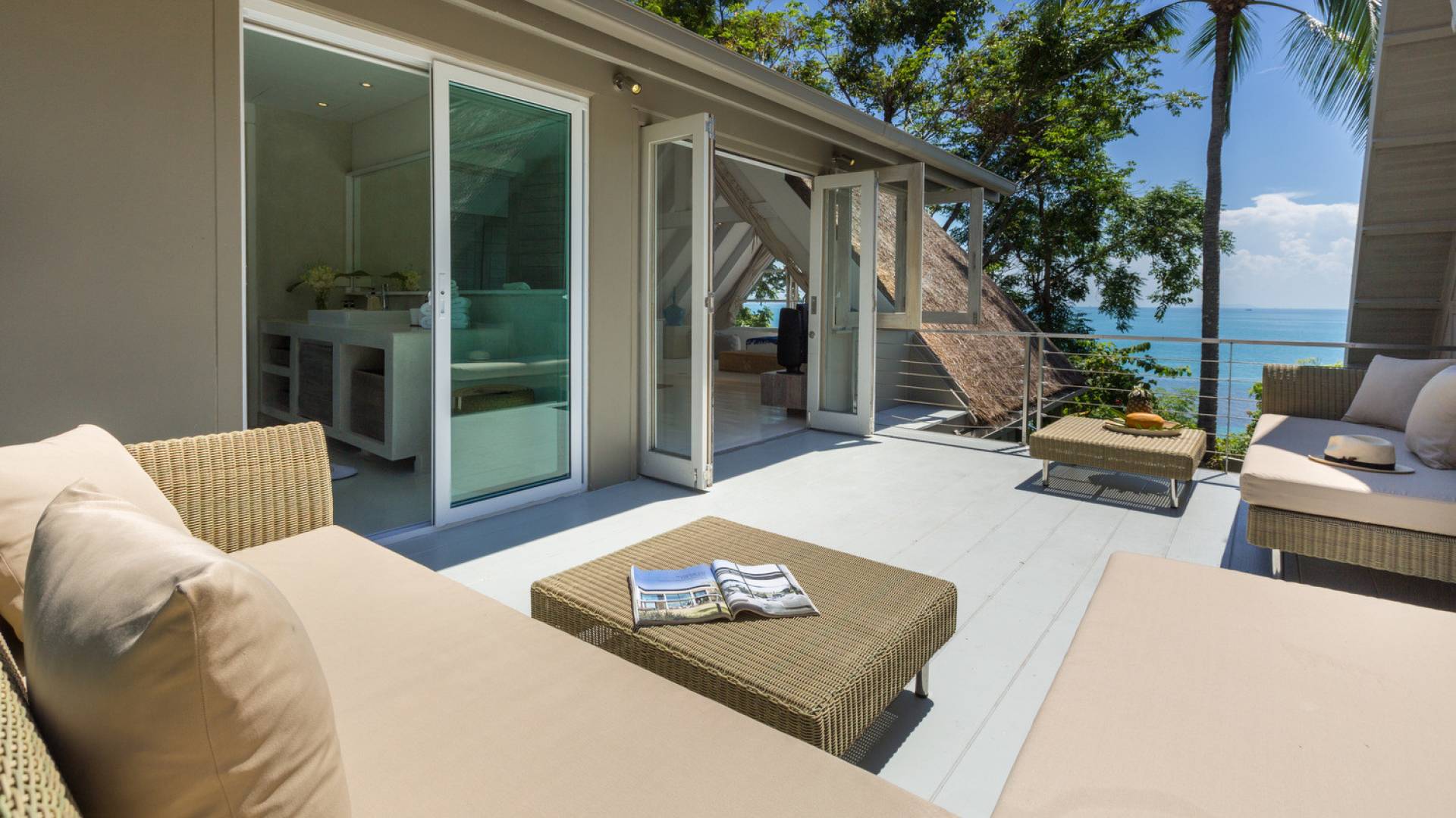 Αυτό το ακίνητο επωφελείται από μια εξαιρετικά ιδιωτική θέση που είναι υπερυψωμένη και διαθέτει εξαιρετικούς κήπους. Αμέσως στα αριστερά σας καθώς μπαίνετε είναι ένας χώρος κήπου με ξαπλώστρες που δείχνουν απευθείας την εκπληκτική θέα μπροστά. Μπροστά από αυτό βρίσκεται το πρώτο κιόσκι με αχυρένια σαλόνι, κουζίνα και τραπεζαρία ενιαίας διαρρύθμισης. Υπάρχει μια σκεπαστή βεράντα μπροστά με εξωτερική τραπεζαρία. Διαμορφωμένοι χλοοτάπητες και καλά φυτεμένοι κήποι βρίσκονται ακριβώς μπροστά από το κατάλυμα. Στο εσωτερικό, το λευκό δωμάτιο είναι επιδέξια ντυμένο με φυσικές ίνες, στολίδια και έπιπλα, όπως μπεζ καναπέ σε σχήμα L, ξύλινο τραπέζι και καρέκλες, και υφαντό πατάκι. Η κουζίνα έχει ένα χαρακτηριστικό λευκό νησί που στεγάζει το νεροχύτη, την εστία και τις ενσωματωμένες συσκευές ενώ παράλληλα διπλασιάζεται ως μπαρ για πρωινό. Όλος ο χώρος αποθήκευσης βρίσκεται πίσω από λεπτές λευκές πόρτες και, με εξαίρεση αυτόν τον τοίχο της κουζίνας, και οι τέσσερις πλευρές του δωματίου είναι επενδεδυμένες με διπλά πτυσσόμενες γυάλινες πόρτες που ανοίγουν την ιδιοκτησία για τη θέα και το φυσικό αεράκι. Στο πίσω μέρος της κουζίνας υπάρχει ένας σκεπαστός κήπος που μοιάζει με Ζεν.