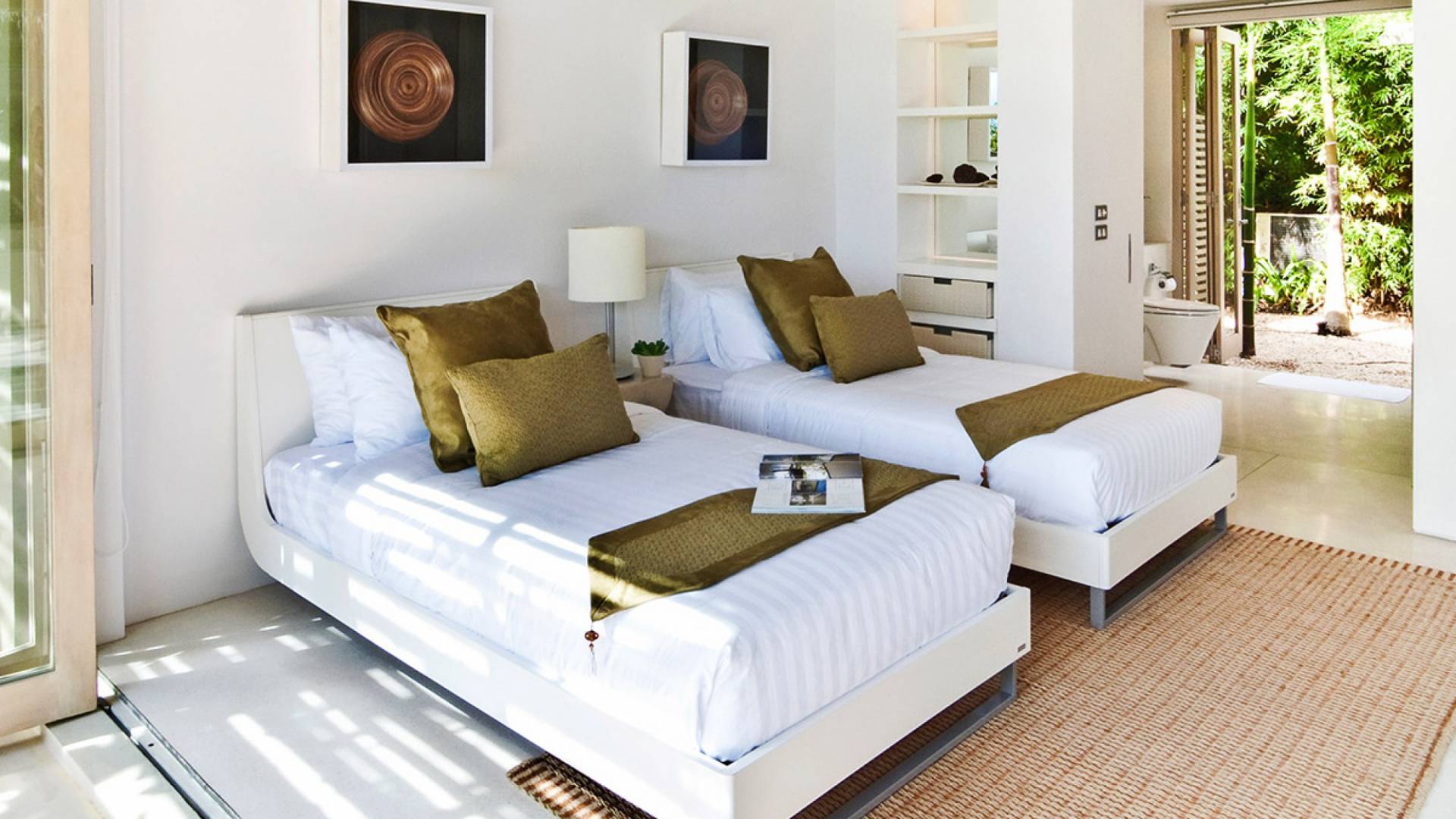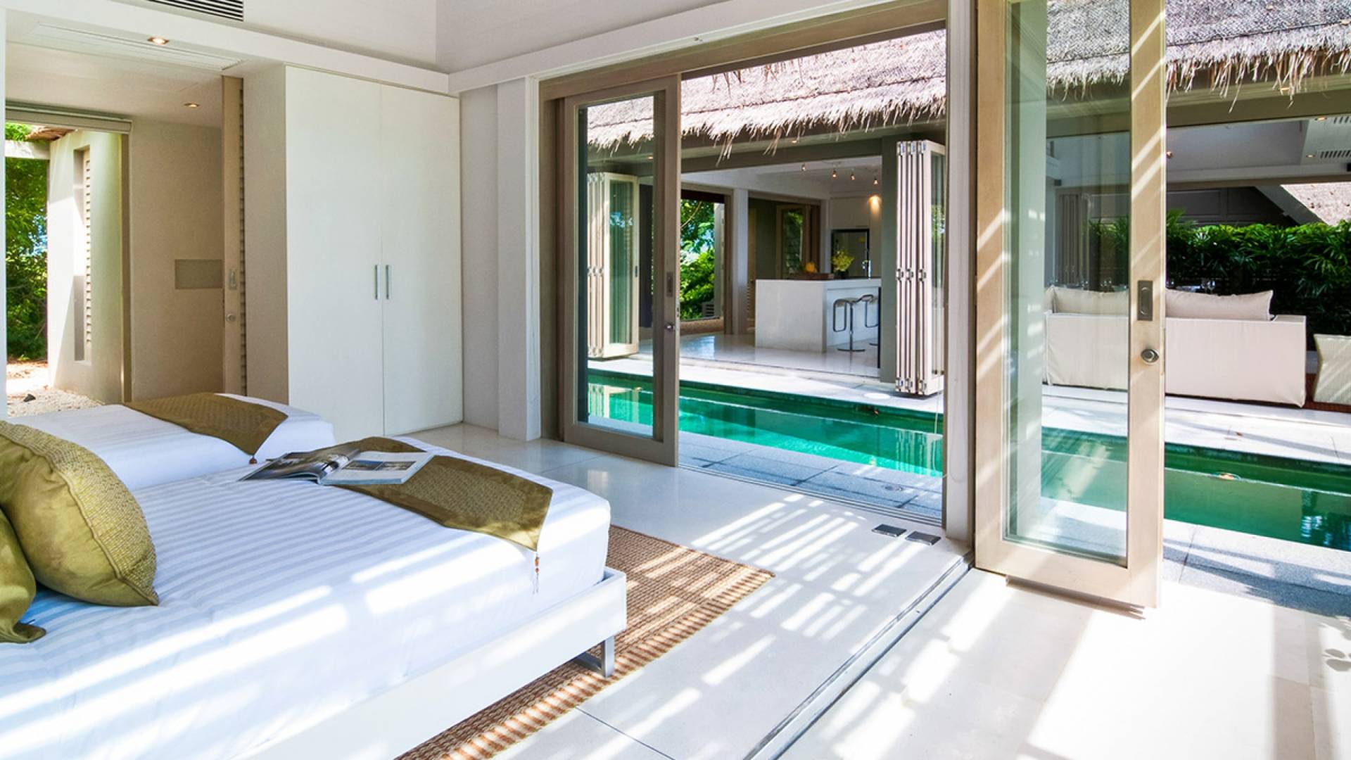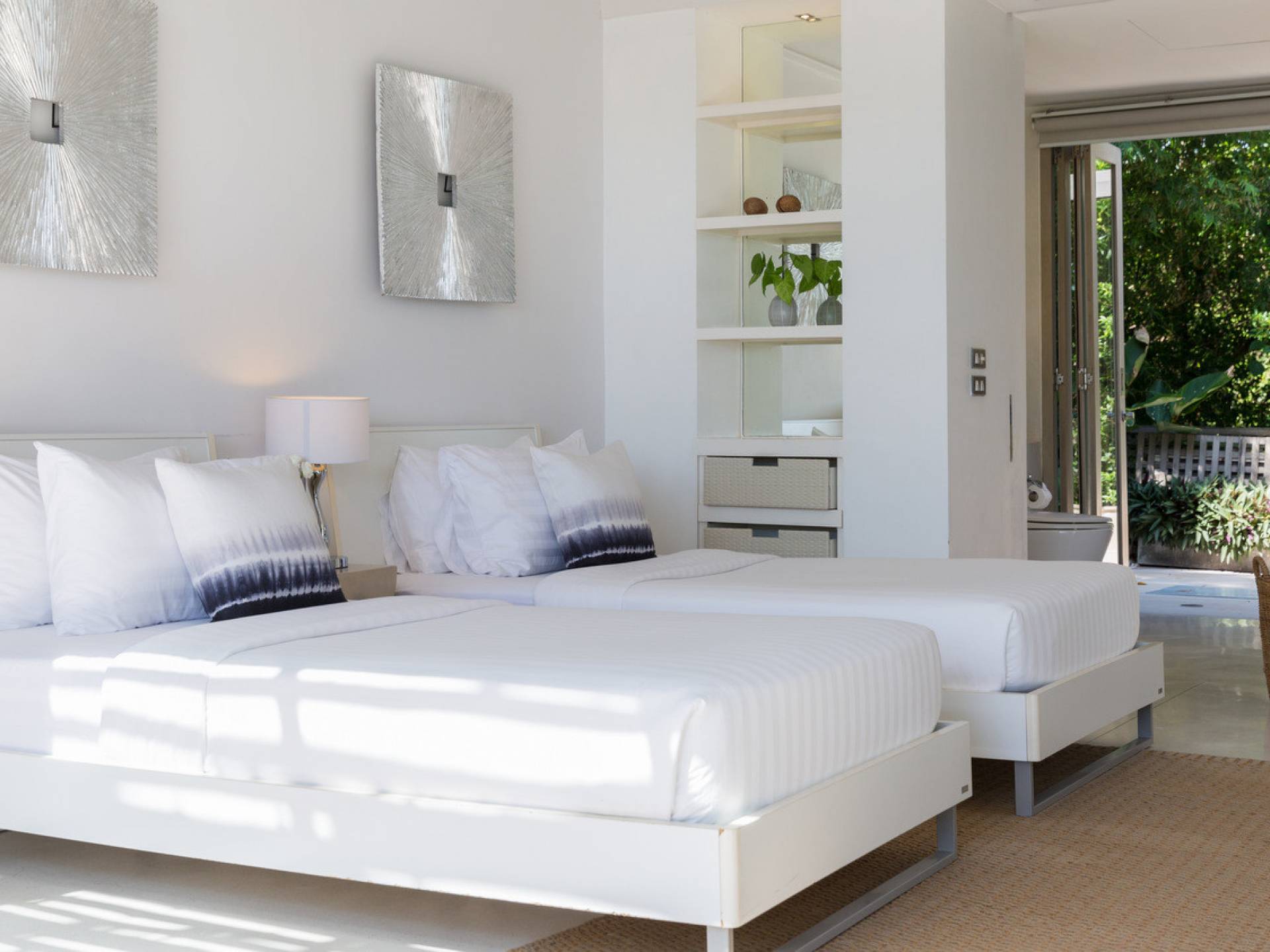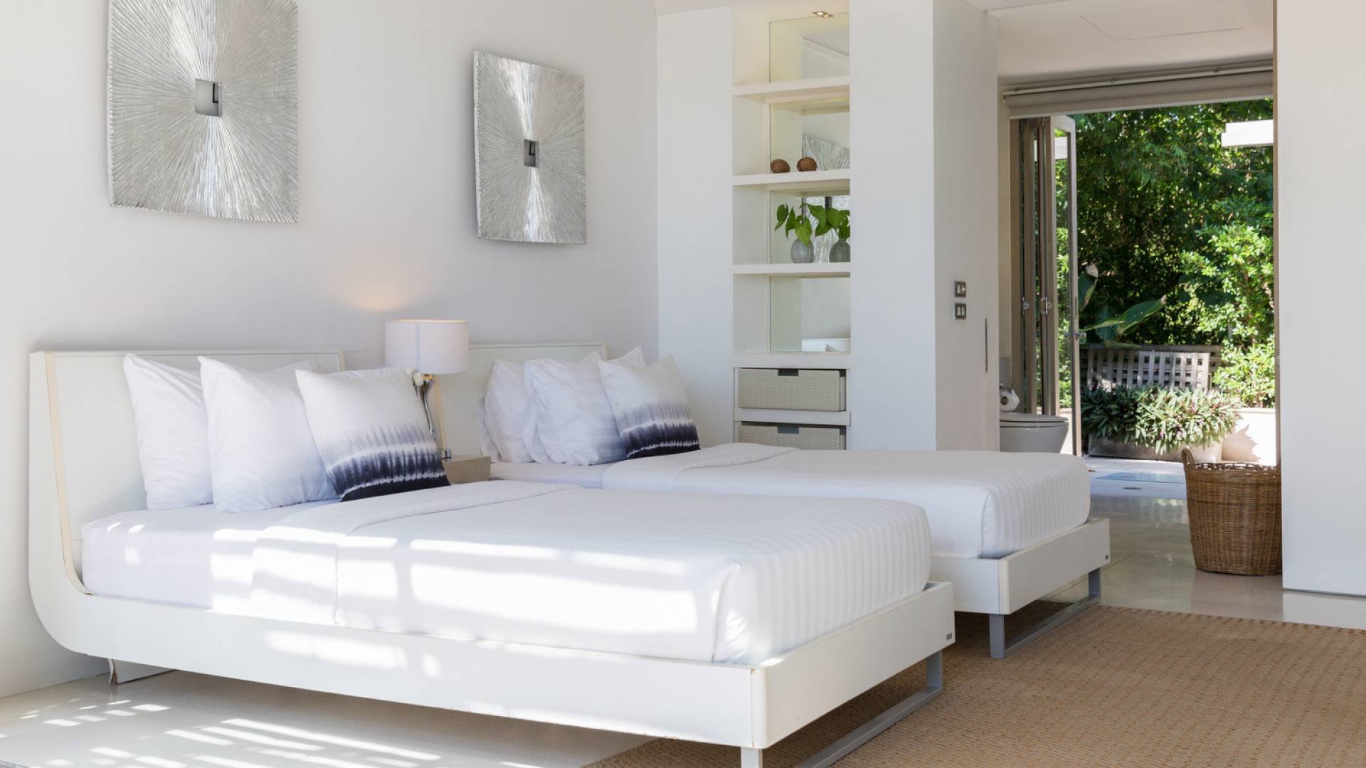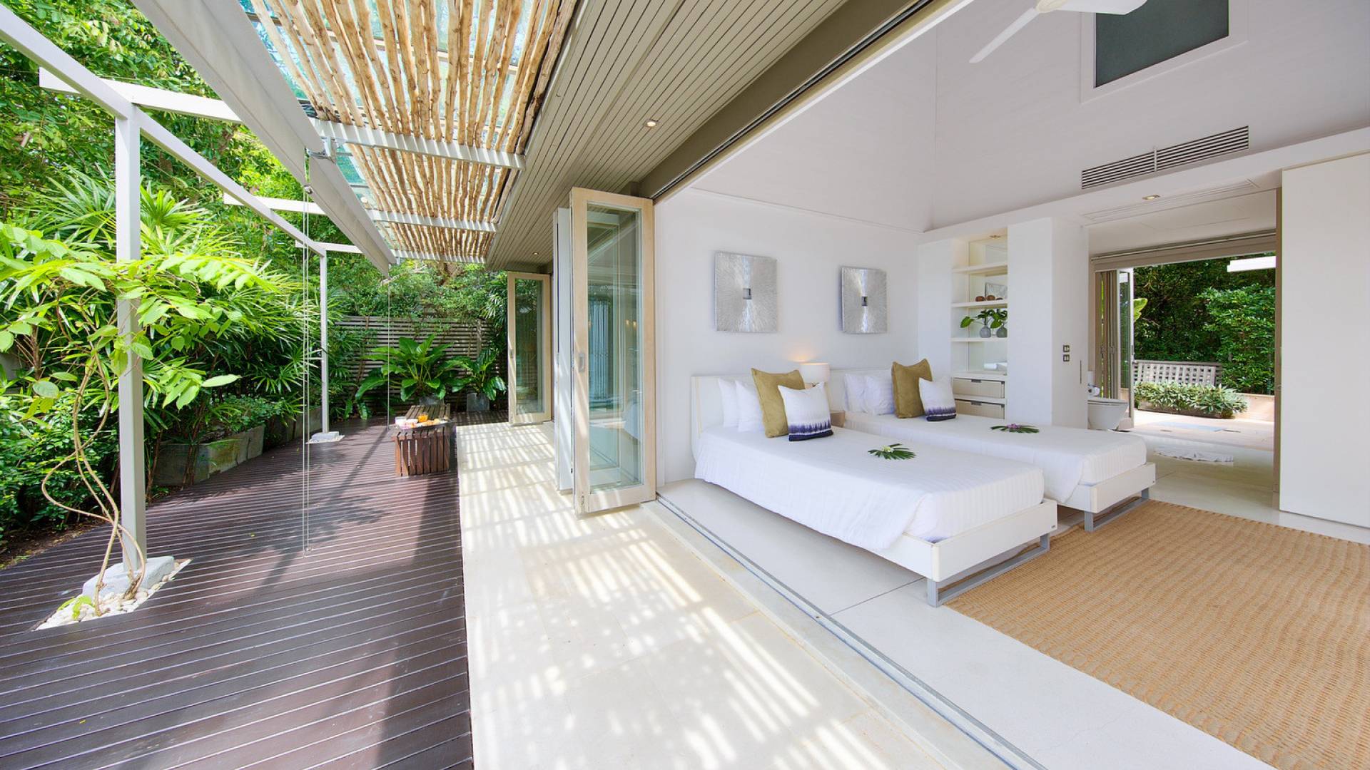 Ο διαχωρισμός των δύο περιπτέρων είναι μια κεντρική πισίνα με γκρι πέτρα με ένα σκαλοπάτι στο ένα άκρο. Στο άλλο άκρο είναι ένας διάδρομος που οδηγεί μέσα από μια φυτεμένη αψίδα που οδηγεί σε ένα κεραμικό δοχείο τοποθετημένο σε βάθρο και τοποθετημένο μπροστά από έναν μεγάλο καθρέφτη. Αυτό το εντυπωσιακό σχεδιαστικό χαρακτηριστικό όχι μόνο φαίνεται φανταστικό αλλά δημιουργεί και την εντύπωση χώρου. Στα αριστερά της πισίνας βρίσκεται το περίπτερο που στεγάζει δύο από τα τρία υπνοδωμάτια. Το πρώτο έχει δύο μονά κρεβάτια το καθένα με αξεσουάρ με απαλό πράσινο και χακί μαξιλάρια και ριχτάρια. Το ιδιωτικό μπάνιο διαθέτει καμπίνα ντους και πόρτα που οδηγεί σε ιδιωτικό κήπο στην αυλή. Το επόμενο υπνοδωμάτιο έχει ένα λευκό κρεβάτι με ουρανό με λευκές κουρτίνες και είναι και πάλι ενισχυμένο με πράσινα αξεσουάρ. Αυτό το δωμάτιο διαθέτει κήπους μπροστά, στο πλάι και στο πίσω μέρος μέσω του ιδιωτικού ντους. Όταν περπατάτε μέσα από την αψίδα στο τέλος της πισίνας, ένα μονοπάτι προς τα αριστερά οδηγεί στο μπάνιο των επισκεπτών, ενώ στα δεξιά μια ξύλινη σκάλα σας μεταφέρει στο πρόσφατα προστιθέμενο τρίτο σούπερ μεγάλο υπνοδωμάτιο μαζί με ένα ιδιωτικό μπάνιο. Αυτός ο χώρος διαθέτει επίσης ένα γραφείο και ένα μεγάλο σαλόνι με τηλεόραση που μπορεί να χρησιμοποιηθεί ως τέταρτο υπνοδωμάτιο. Το κυρίως υπνοδωμάτιο έχει εξαιρετική άμεση θέα στα πέντε νησιά. Στο νέο κύριο υπνοδωμάτιο υπάρχει ένα μπαλκόνι που μπορεί να φιλοξενήσει πολύ άνετα 8-10 άτομα για ποτό καθώς βλέπεις τον ήλιο να δύει και να απολαμβάνεις το δροσερό αεράκι που βγαίνει από το βουνό.