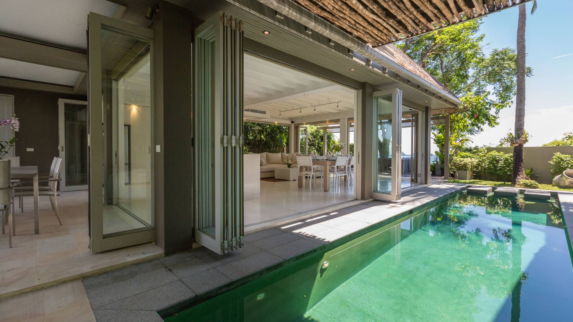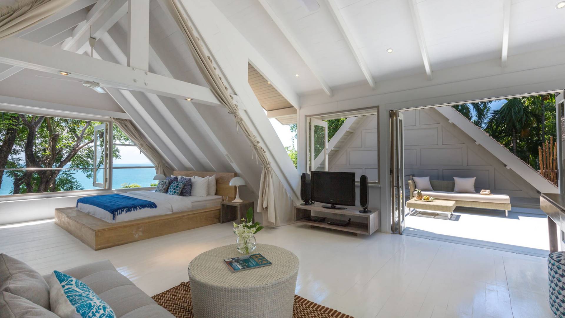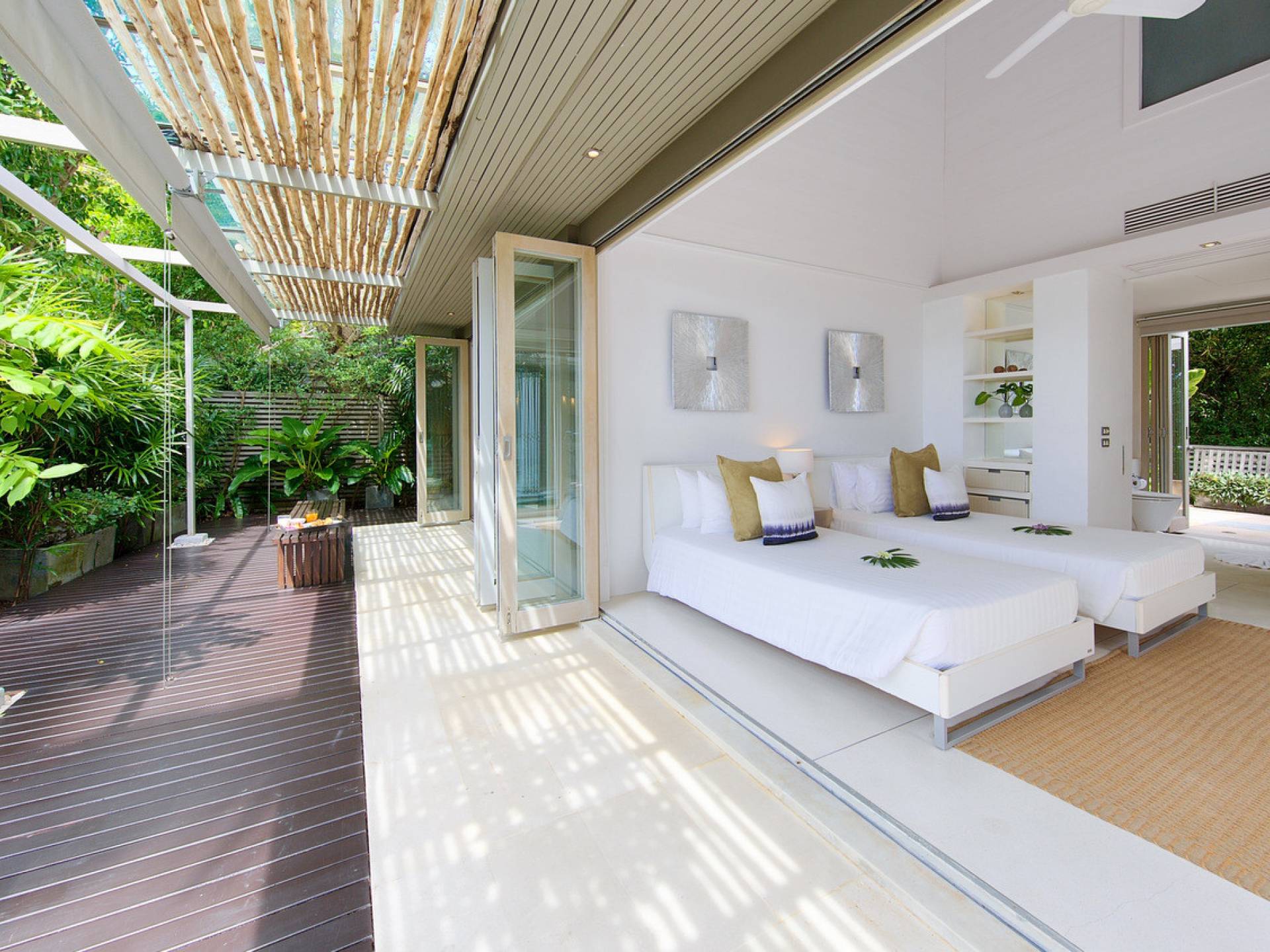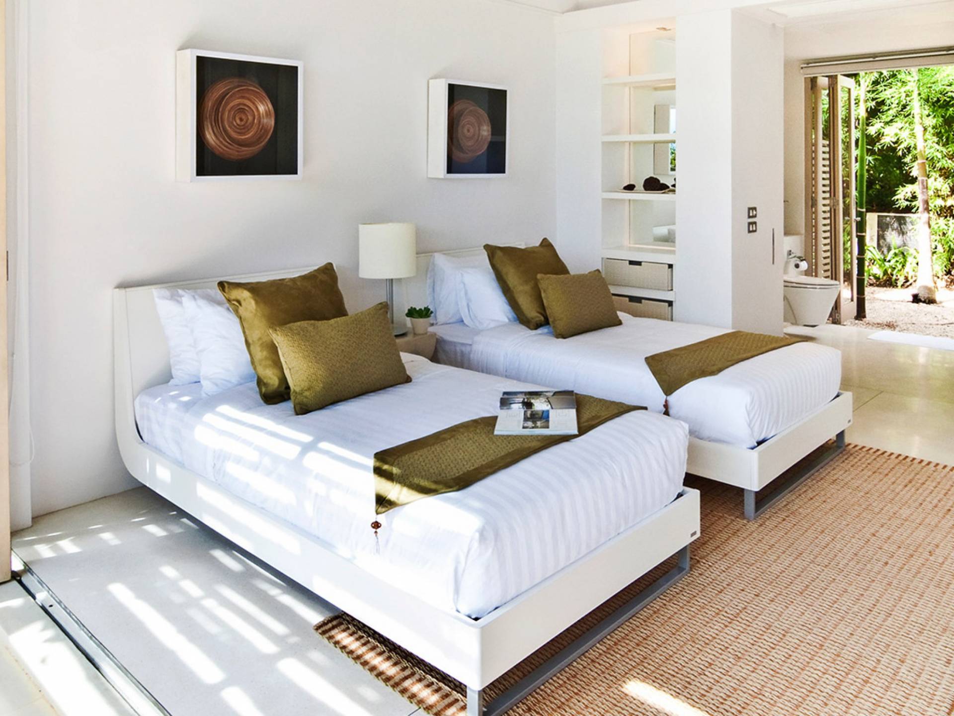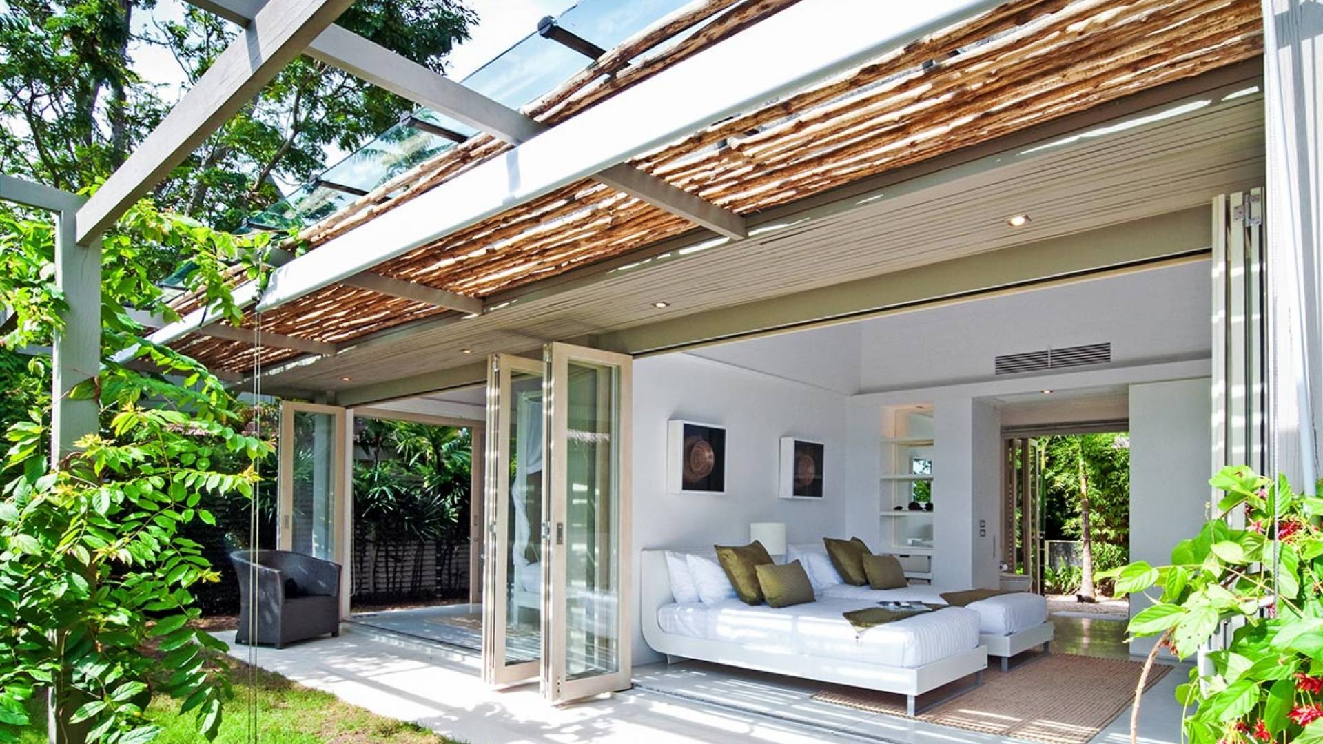 Ο διαχωρισμός των δύο περιπτέρων είναι μια κεντρική πισίνα με γκρι πέτρα με ένα σκαλοπάτι στο ένα άκρο. Στο άλλο άκρο είναι ένας διάδρομος που οδηγεί μέσα από μια φυτεμένη αψίδα που οδηγεί σε ένα κεραμικό δοχείο τοποθετημένο σε βάθρο και τοποθετημένο μπροστά από έναν μεγάλο καθρέφτη. Αυτό το εντυπωσιακό σχεδιαστικό χαρακτηριστικό όχι μόνο φαίνεται φανταστικό αλλά δημιουργεί και την εντύπωση χώρου. Στα αριστερά της πισίνας βρίσκεται το περίπτερο που στεγάζει δύο από τα τρία υπνοδωμάτια. Το πρώτο έχει δύο μονά κρεβάτια το καθένα με αξεσουάρ με απαλό πράσινο και χακί μαξιλάρια και ριχτάρια. Το ιδιωτικό μπάνιο διαθέτει καμπίνα ντους και πόρτα που οδηγεί σε ιδιωτικό κήπο στην αυλή. Το επόμενο υπνοδωμάτιο έχει ένα λευκό κρεβάτι με ουρανό με λευκές κουρτίνες και είναι και πάλι ενισχυμένο με πράσινα αξεσουάρ. Αυτό το δωμάτιο διαθέτει κήπους μπροστά, στο πλάι και στο πίσω μέρος μέσω του ιδιωτικού ντους. Όταν περπατάτε μέσα από την αψίδα στο τέλος της πισίνας, ένα μονοπάτι προς τα αριστερά οδηγεί στο μπάνιο των επισκεπτών, ενώ στα δεξιά μια ξύλινη σκάλα σας μεταφέρει στο πρόσφατα προστιθέμενο τρίτο σούπερ μεγάλο υπνοδωμάτιο μαζί με ένα ιδιωτικό μπάνιο. Αυτός ο χώρος διαθέτει επίσης ένα γραφείο και ένα μεγάλο σαλόνι με τηλεόραση που μπορεί να χρησιμοποιηθεί ως τέταρτο υπνοδωμάτιο. Το κυρίως υπνοδωμάτιο έχει εξαιρετική άμεση θέα στα πέντε νησιά. Στο νέο κύριο υπνοδωμάτιο υπάρχει ένα μπαλκόνι που μπορεί να φιλοξενήσει πολύ άνετα 8-10 άτομα για ποτό καθώς βλέπεις τον ήλιο να δύει και να απολαμβάνεις το δροσερό αεράκι που βγαίνει από το βουνό.