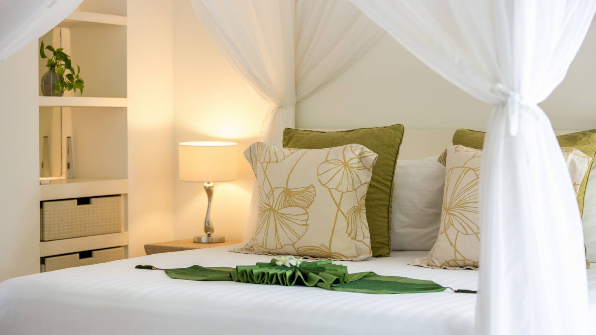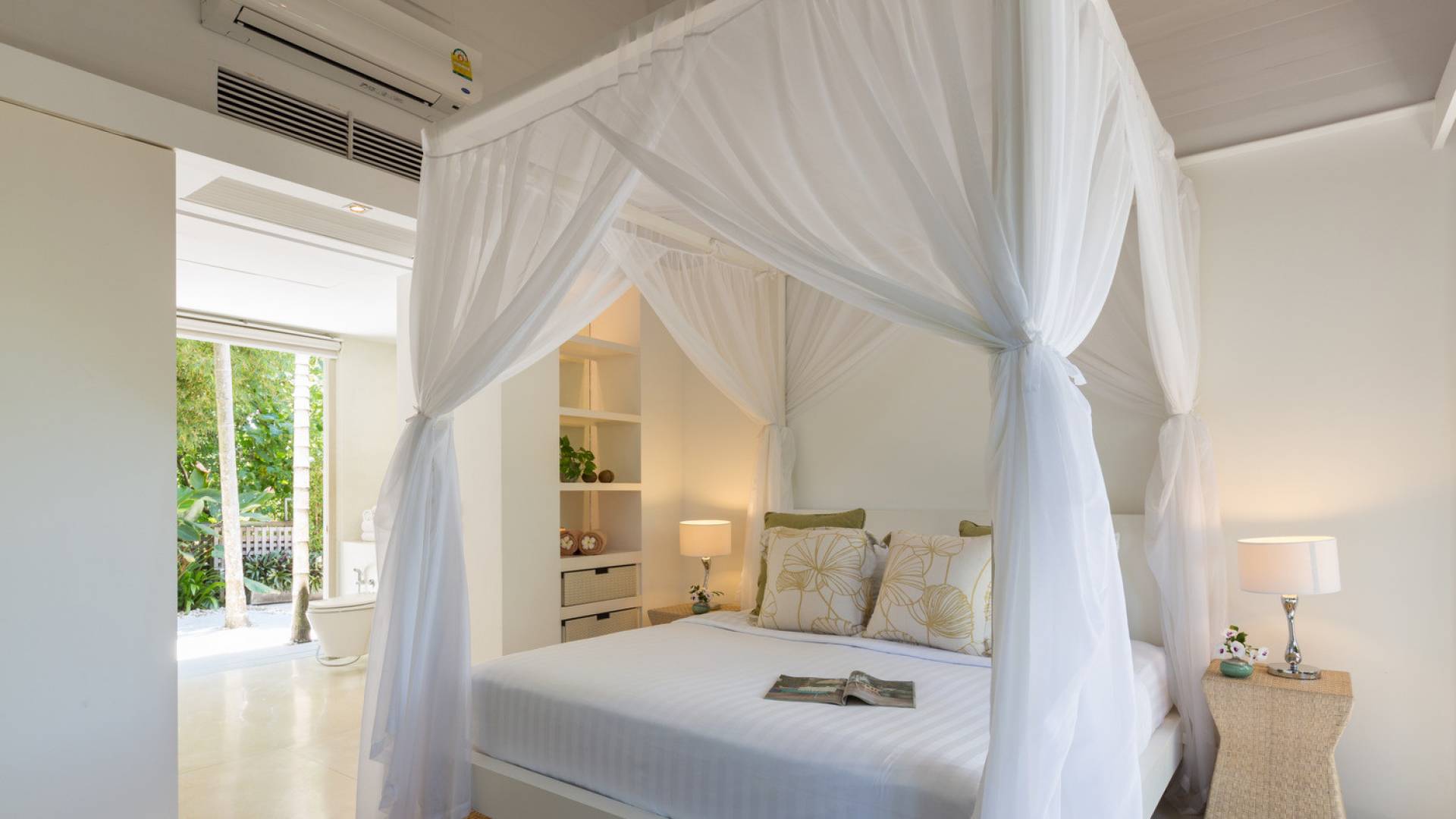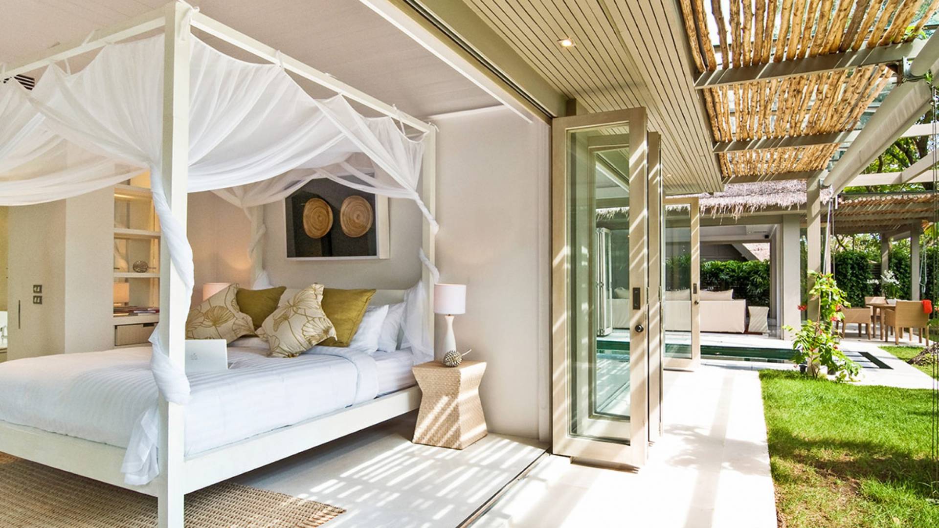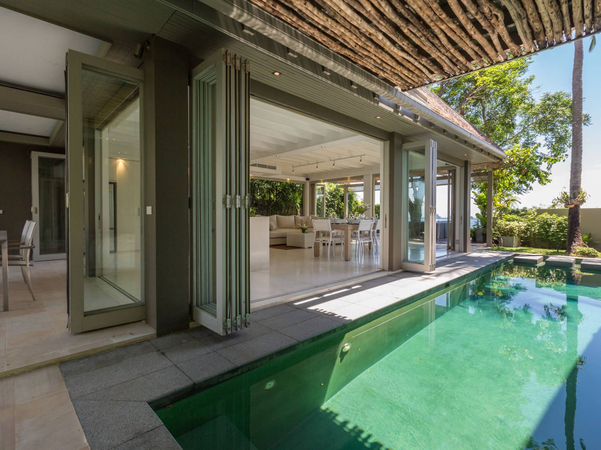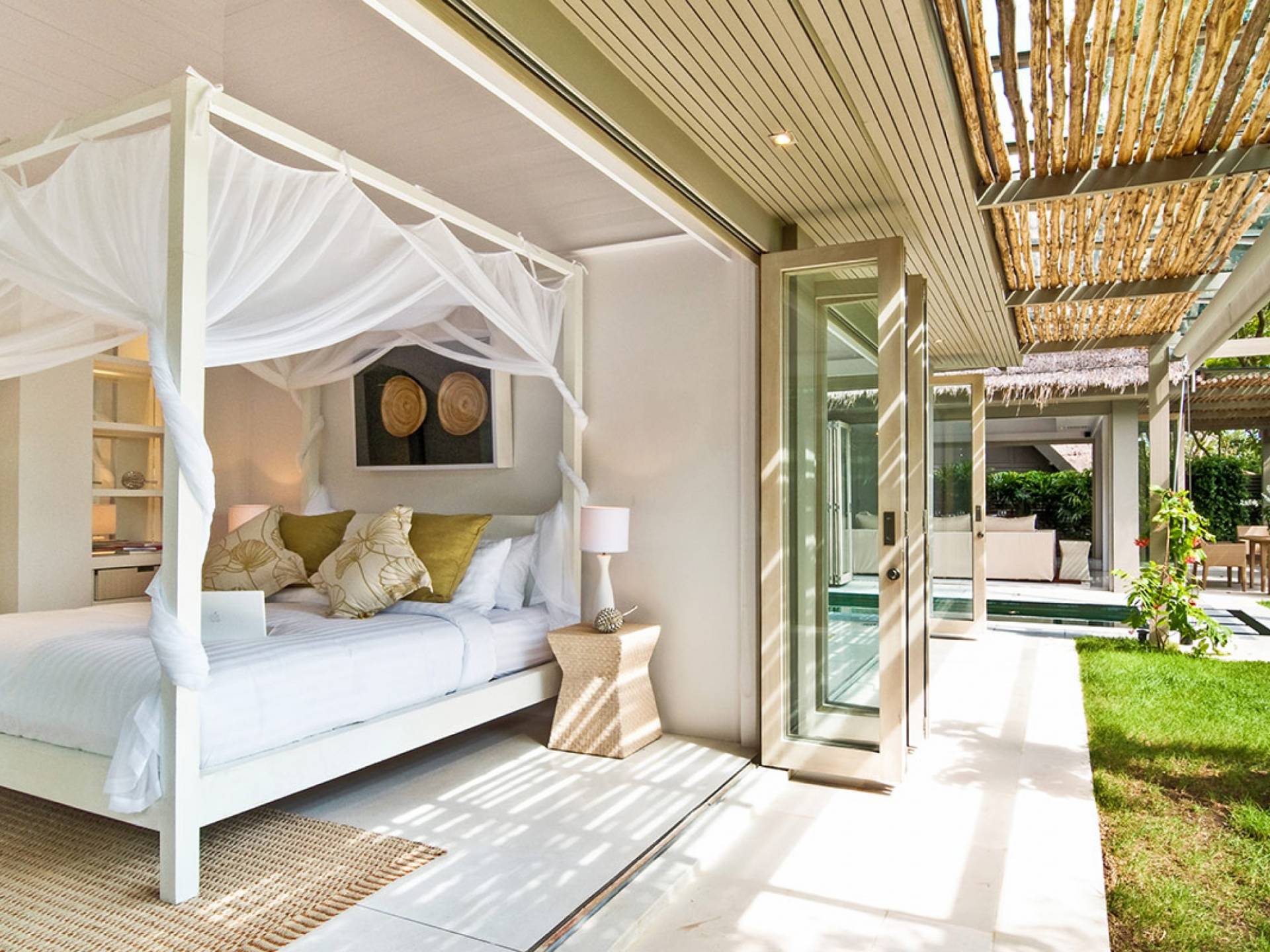 Ο διαχωρισμός των δύο περιπτέρων είναι μια κεντρική πισίνα με γκρι πέτρα με ένα σκαλοπάτι στο ένα άκρο. Στο άλλο άκρο είναι ένας διάδρομος που οδηγεί μέσα από μια φυτεμένη αψίδα που οδηγεί σε ένα κεραμικό δοχείο τοποθετημένο σε βάθρο και τοποθετημένο μπροστά από έναν μεγάλο καθρέφτη. Αυτό το εντυπωσιακό σχεδιαστικό χαρακτηριστικό όχι μόνο φαίνεται φανταστικό αλλά δημιουργεί και την εντύπωση χώρου. Στα αριστερά της πισίνας βρίσκεται το περίπτερο που στεγάζει δύο από τα τρία υπνοδωμάτια. Το πρώτο έχει δύο μονά κρεβάτια το καθένα με αξεσουάρ με απαλό πράσινο και χακί μαξιλάρια και ριχτάρια. Το ιδιωτικό μπάνιο διαθέτει καμπίνα ντους και πόρτα που οδηγεί σε ιδιωτικό κήπο στην αυλή. Το επόμενο υπνοδωμάτιο έχει ένα λευκό κρεβάτι με ουρανό με λευκές κουρτίνες και είναι και πάλι ενισχυμένο με πράσινα αξεσουάρ. Αυτό το δωμάτιο διαθέτει κήπους μπροστά, στο πλάι και στο πίσω μέρος μέσω του ιδιωτικού ντους. Όταν περπατάτε μέσα από την αψίδα στο τέλος της πισίνας, ένα μονοπάτι προς τα αριστερά οδηγεί στο μπάνιο των επισκεπτών, ενώ στα δεξιά μια ξύλινη σκάλα σας μεταφέρει στο πρόσφατα προστιθέμενο τρίτο σούπερ μεγάλο υπνοδωμάτιο μαζί με ένα ιδιωτικό μπάνιο. Αυτός ο χώρος διαθέτει επίσης ένα γραφείο και ένα μεγάλο σαλόνι με τηλεόραση που μπορεί να χρησιμοποιηθεί ως τέταρτο υπνοδωμάτιο. Το κυρίως υπνοδωμάτιο έχει εξαιρετική άμεση θέα στα πέντε νησιά. Στο νέο κύριο υπνοδωμάτιο υπάρχει ένα μπαλκόνι που μπορεί να φιλοξενήσει πολύ άνετα 8-10 άτομα για ποτό καθώς βλέπεις τον ήλιο να δύει και να απολαμβάνεις το δροσερό αεράκι που βγαίνει από το βουνό.