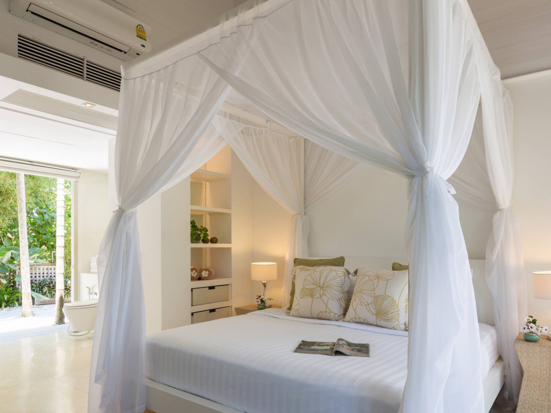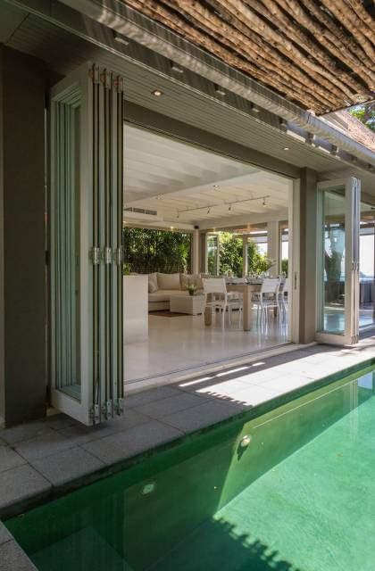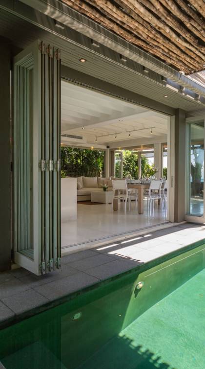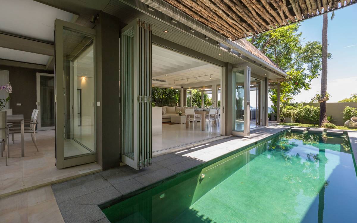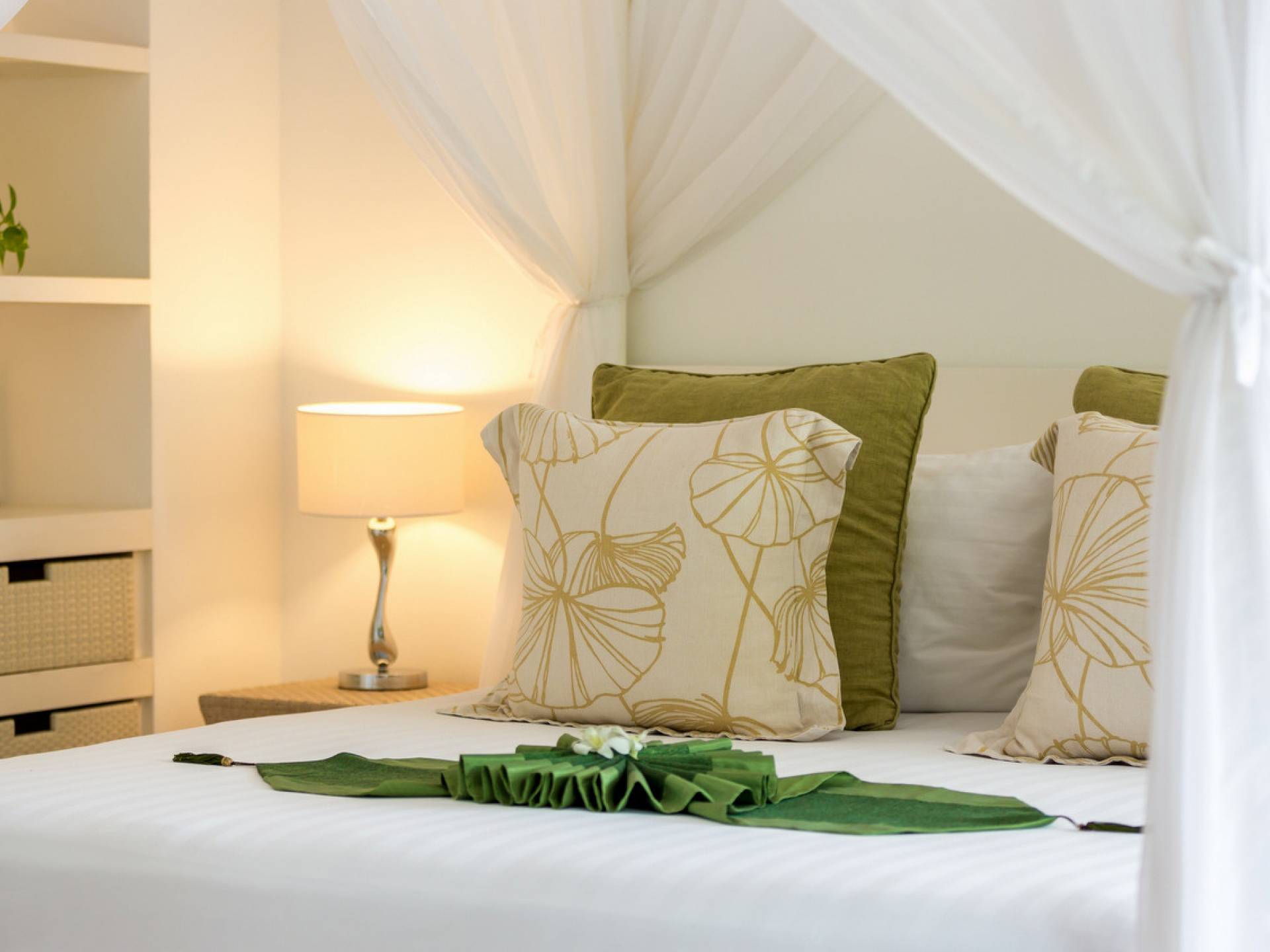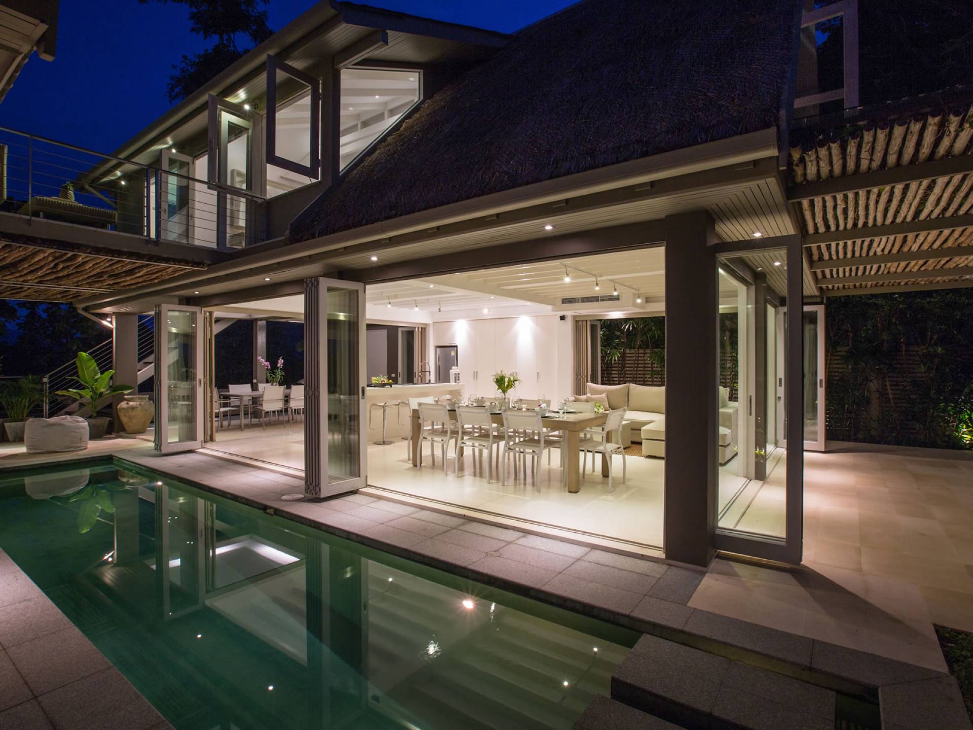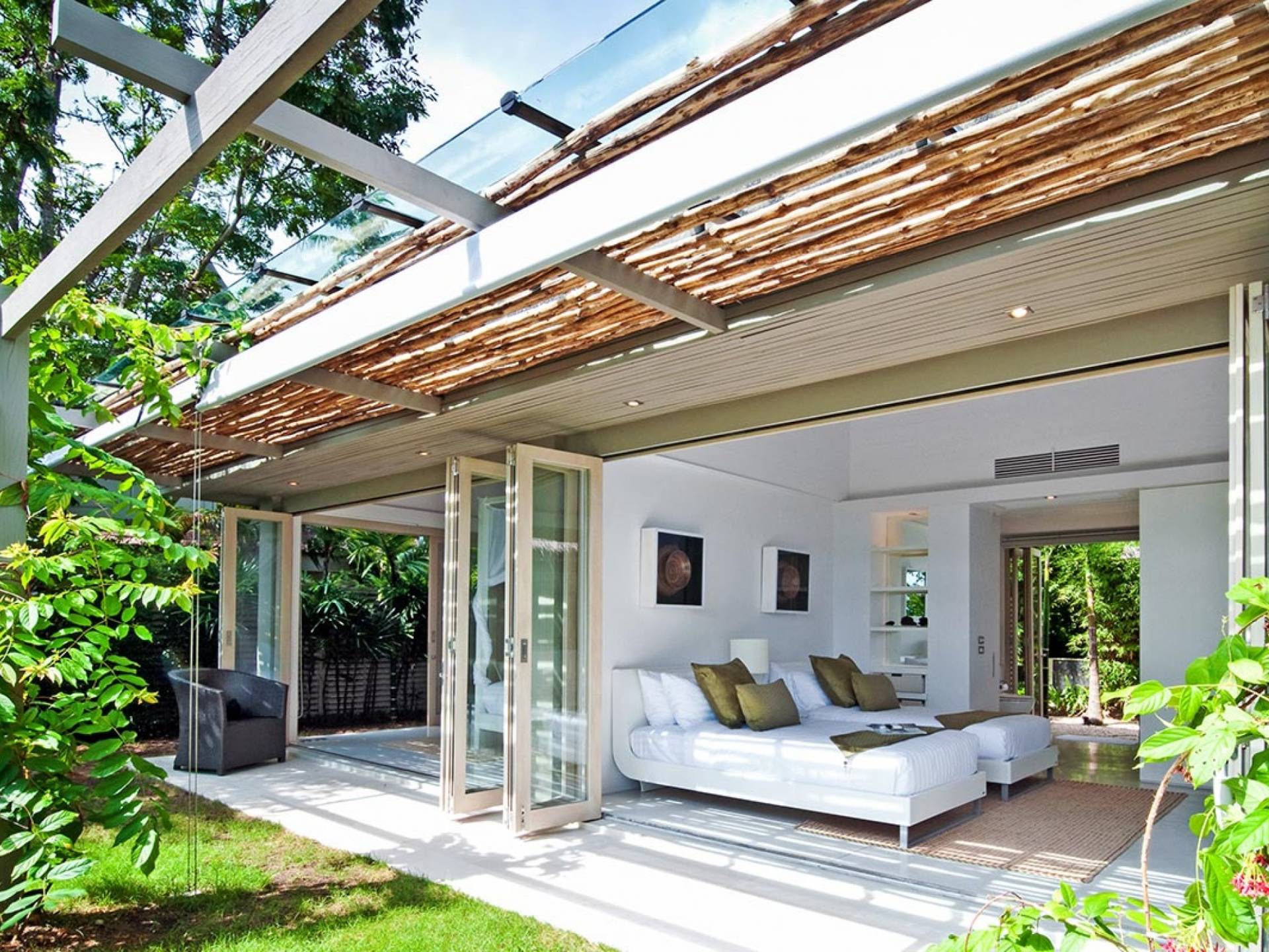 Ο διαχωρισμός των δύο περιπτέρων είναι μια κεντρική πισίνα με γκρι πέτρα με ένα σκαλοπάτι στο ένα άκρο. Στο άλλο άκρο είναι ένας διάδρομος που οδηγεί μέσα από μια φυτεμένη αψίδα που οδηγεί σε ένα κεραμικό δοχείο τοποθετημένο σε βάθρο και τοποθετημένο μπροστά από έναν μεγάλο καθρέφτη. Αυτό το εντυπωσιακό σχεδιαστικό χαρακτηριστικό όχι μόνο φαίνεται φανταστικό αλλά δημιουργεί και την εντύπωση χώρου. Στα αριστερά της πισίνας βρίσκεται το περίπτερο που στεγάζει δύο από τα τρία υπνοδωμάτια. Το πρώτο έχει δύο μονά κρεβάτια το καθένα με αξεσουάρ με απαλό πράσινο και χακί μαξιλάρια και ριχτάρια. Το ιδιωτικό μπάνιο διαθέτει καμπίνα ντους και πόρτα που οδηγεί σε ιδιωτικό κήπο στην αυλή. Το επόμενο υπνοδωμάτιο έχει ένα λευκό κρεβάτι με ουρανό με λευκές κουρτίνες και είναι και πάλι ενισχυμένο με πράσινα αξεσουάρ. Αυτό το δωμάτιο διαθέτει κήπους μπροστά, στο πλάι και στο πίσω μέρος μέσω του ιδιωτικού ντους. Όταν περπατάτε μέσα από την αψίδα στο τέλος της πισίνας, ένα μονοπάτι προς τα αριστερά οδηγεί στο μπάνιο των επισκεπτών, ενώ στα δεξιά μια ξύλινη σκάλα σας μεταφέρει στο πρόσφατα προστιθέμενο τρίτο σούπερ μεγάλο υπνοδωμάτιο μαζί με ένα ιδιωτικό μπάνιο. Αυτός ο χώρος διαθέτει επίσης ένα γραφείο και ένα μεγάλο σαλόνι με τηλεόραση που μπορεί να χρησιμοποιηθεί ως τέταρτο υπνοδωμάτιο. Το κυρίως υπνοδωμάτιο έχει εξαιρετική άμεση θέα στα πέντε νησιά. Στο νέο κύριο υπνοδωμάτιο υπάρχει ένα μπαλκόνι που μπορεί να φιλοξενήσει πολύ άνετα 8-10 άτομα για ποτό καθώς βλέπεις τον ήλιο να δύει και να απολαμβάνεις το δροσερό αεράκι που βγαίνει από το βουνό.