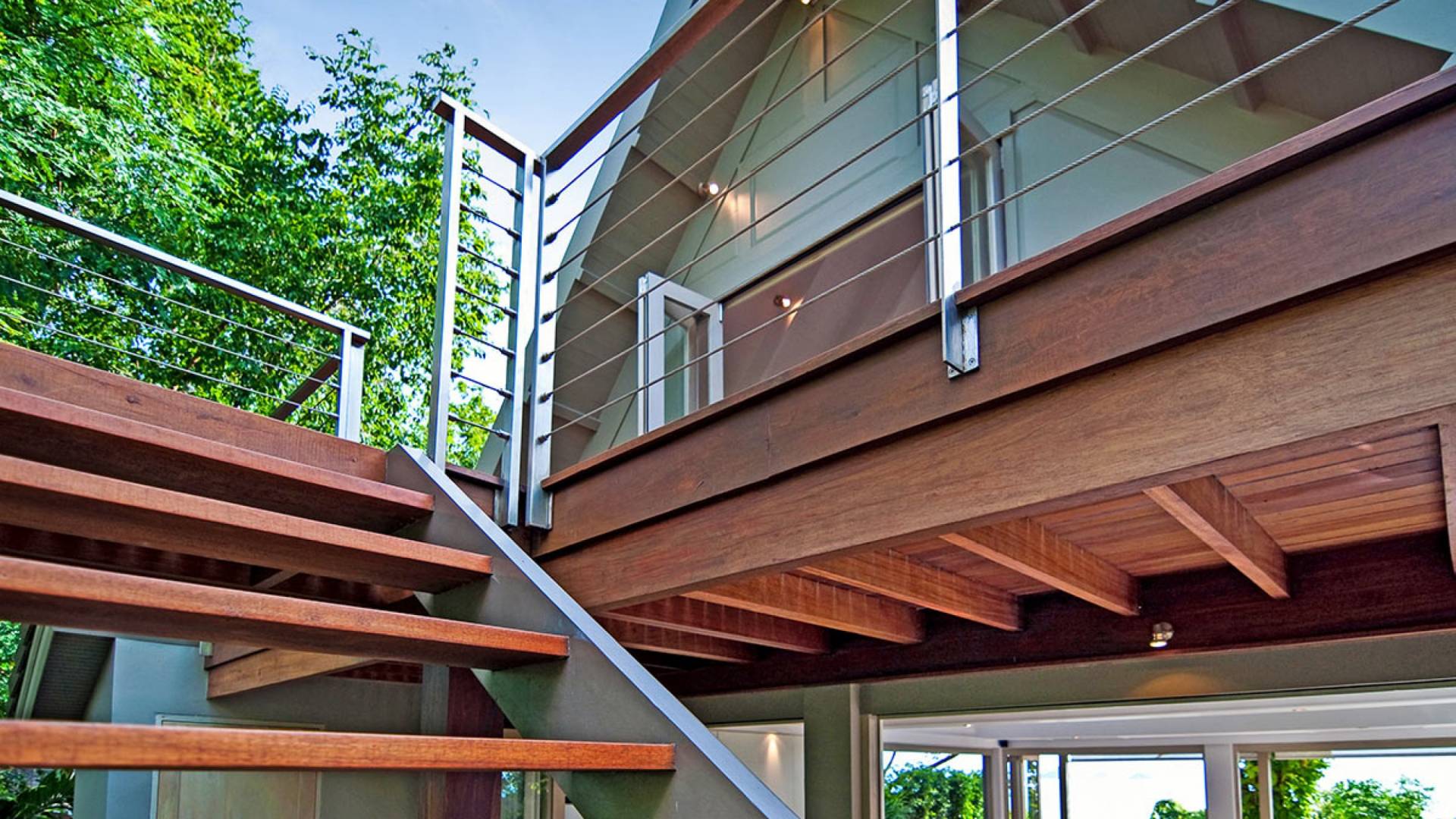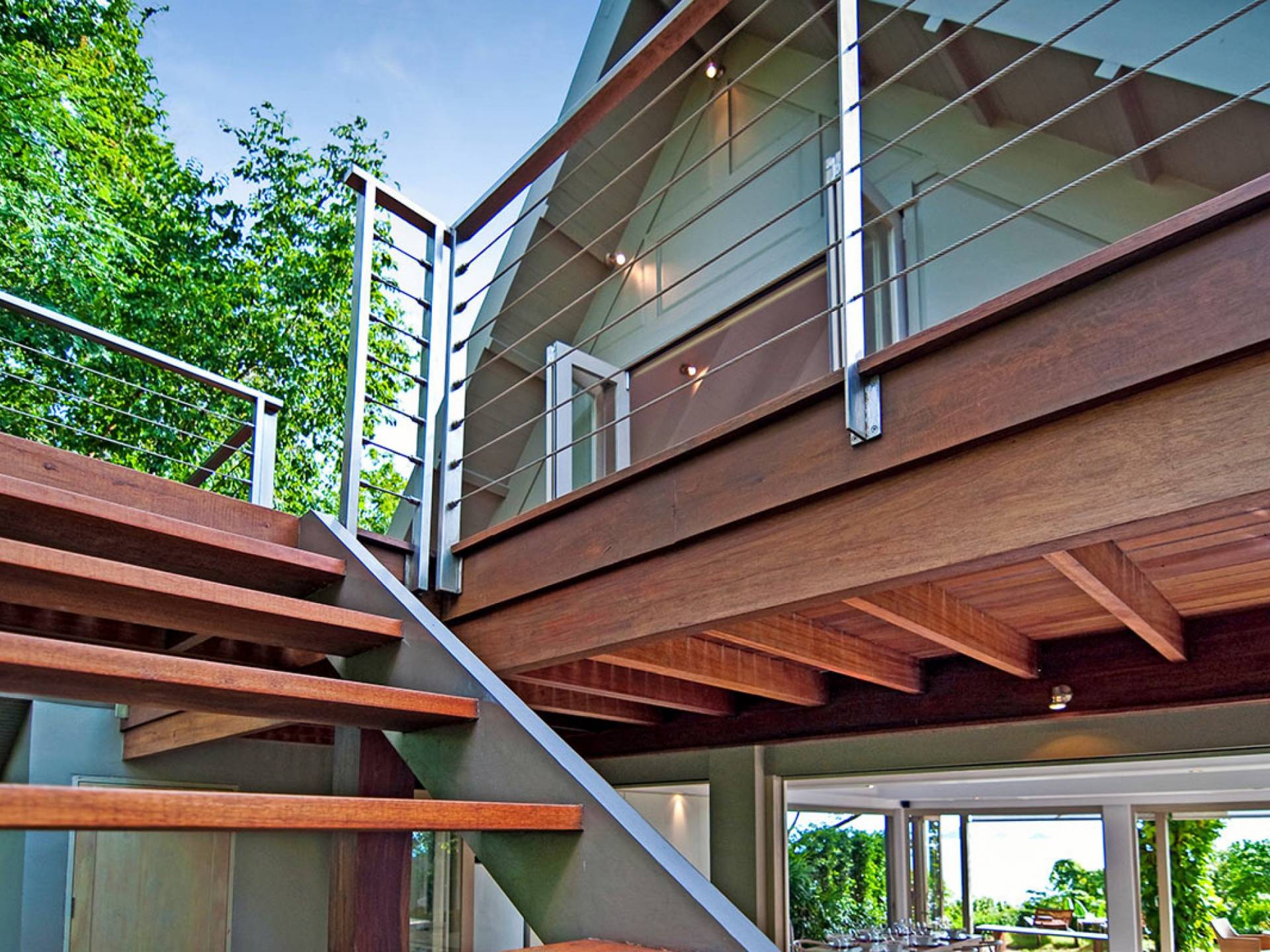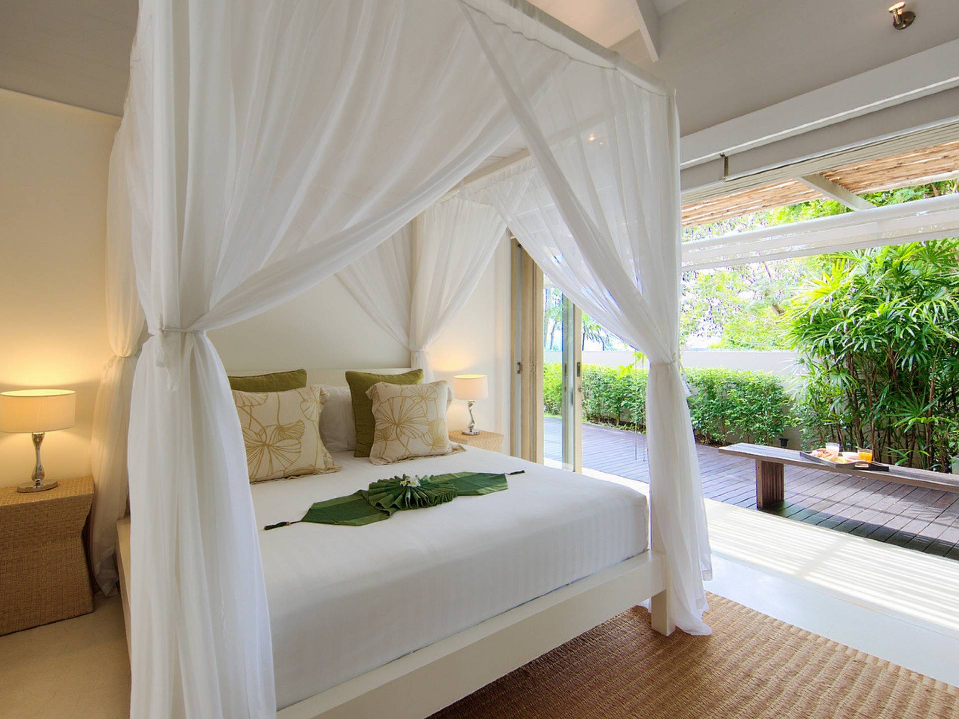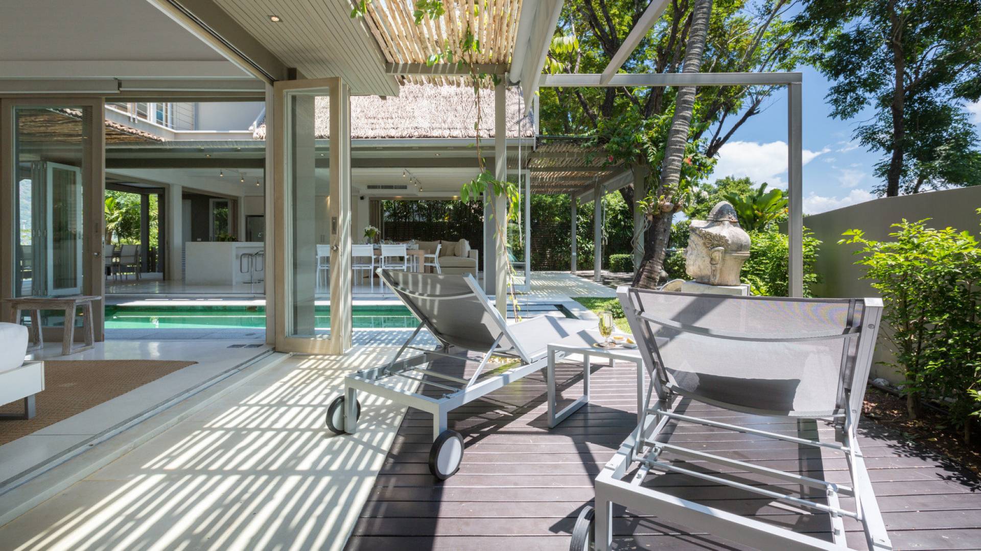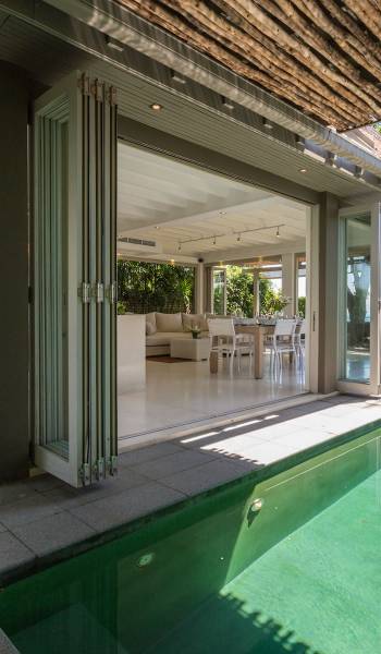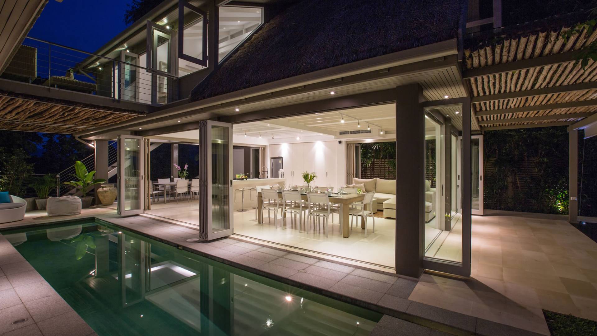 Ο διαχωρισμός των δύο περιπτέρων είναι μια κεντρική πισίνα με γκρι πέτρα με ένα σκαλοπάτι στο ένα άκρο. Στο άλλο άκρο είναι ένας διάδρομος που οδηγεί μέσα από μια φυτεμένη αψίδα που οδηγεί σε ένα κεραμικό δοχείο τοποθετημένο σε βάθρο και τοποθετημένο μπροστά από έναν μεγάλο καθρέφτη. Αυτό το εντυπωσιακό σχεδιαστικό χαρακτηριστικό όχι μόνο φαίνεται φανταστικό αλλά δημιουργεί και την εντύπωση χώρου. Στα αριστερά της πισίνας βρίσκεται το περίπτερο που στεγάζει δύο από τα τρία υπνοδωμάτια. Το πρώτο έχει δύο μονά κρεβάτια το καθένα με αξεσουάρ με απαλό πράσινο και χακί μαξιλάρια και ριχτάρια. Το ιδιωτικό μπάνιο διαθέτει καμπίνα ντους και πόρτα που οδηγεί σε ιδιωτικό κήπο στην αυλή. Το επόμενο υπνοδωμάτιο έχει ένα λευκό κρεβάτι με ουρανό με λευκές κουρτίνες και είναι και πάλι ενισχυμένο με πράσινα αξεσουάρ. Αυτό το δωμάτιο διαθέτει κήπους μπροστά, στο πλάι και στο πίσω μέρος μέσω του ιδιωτικού ντους. Όταν περπατάτε μέσα από την αψίδα στο τέλος της πισίνας, ένα μονοπάτι προς τα αριστερά οδηγεί στο μπάνιο των επισκεπτών, ενώ στα δεξιά μια ξύλινη σκάλα σας μεταφέρει στο πρόσφατα προστιθέμενο τρίτο σούπερ μεγάλο υπνοδωμάτιο μαζί με ένα ιδιωτικό μπάνιο. Αυτός ο χώρος διαθέτει επίσης ένα γραφείο και ένα μεγάλο σαλόνι με τηλεόραση που μπορεί να χρησιμοποιηθεί ως τέταρτο υπνοδωμάτιο. Το κυρίως υπνοδωμάτιο έχει εξαιρετική άμεση θέα στα πέντε νησιά. Στο νέο κύριο υπνοδωμάτιο υπάρχει ένα μπαλκόνι που μπορεί να φιλοξενήσει πολύ άνετα 8-10 άτομα για ποτό καθώς βλέπεις τον ήλιο να δύει και να απολαμβάνεις το δροσερό αεράκι που βγαίνει από το βουνό.